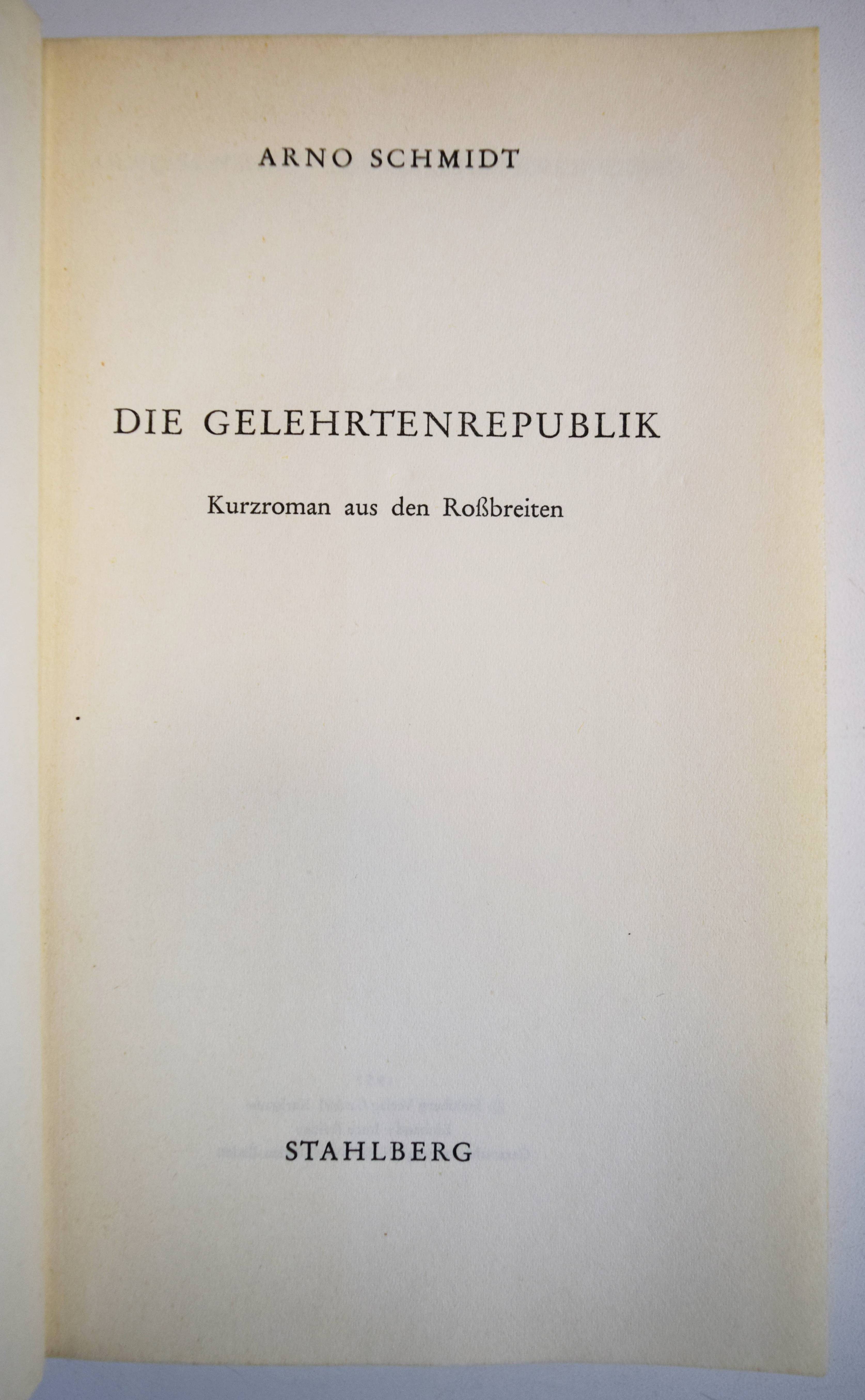 Schmidt, Arno. Die Gelehrtenrepublik. Kurzroman aus den Rossbreiten. Karlsruhe, Stahlberg Verlag (1957). 8°. 225 S., [1] Bl. Orig.-Leinenband mit farbig illustr. Schutzumschlag (Entwurf: Imre Reimer). Bock 1.1.7. W.-G.² 12. – Erste Ausgabe. Mit eigenhändiger Widmung von Arno Schmidt „Gruß! Arno Schmidt“. – „Der von Witz und grotesken Situationen strotzende Roman enthält viele Anspielungen auf die Darmstädter Künstlerkolonie, die Schmidt in den Jahren 1955-1958 kennenlernte.“ (KLL 3832). – Sehr gutes Exemplar.