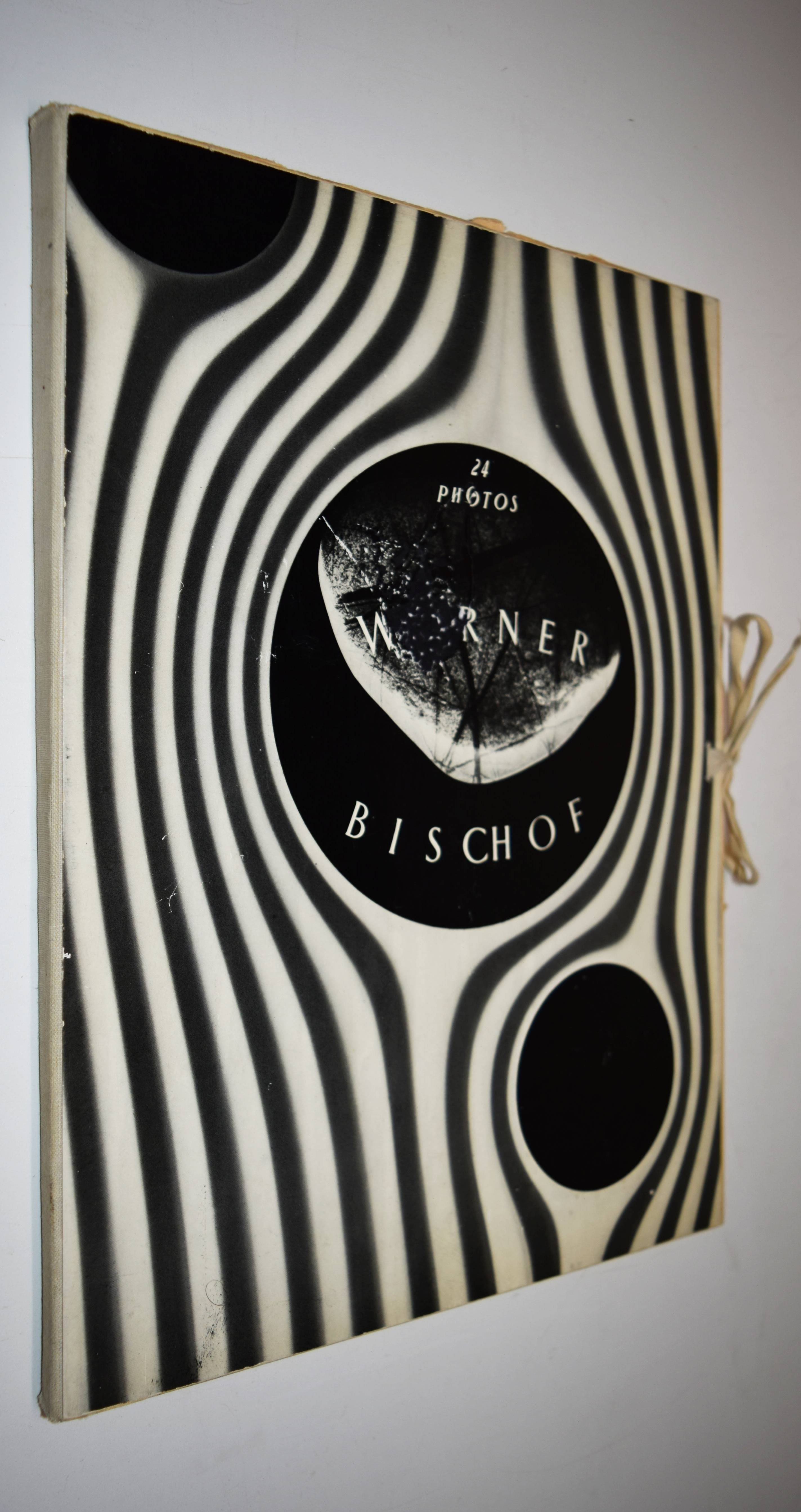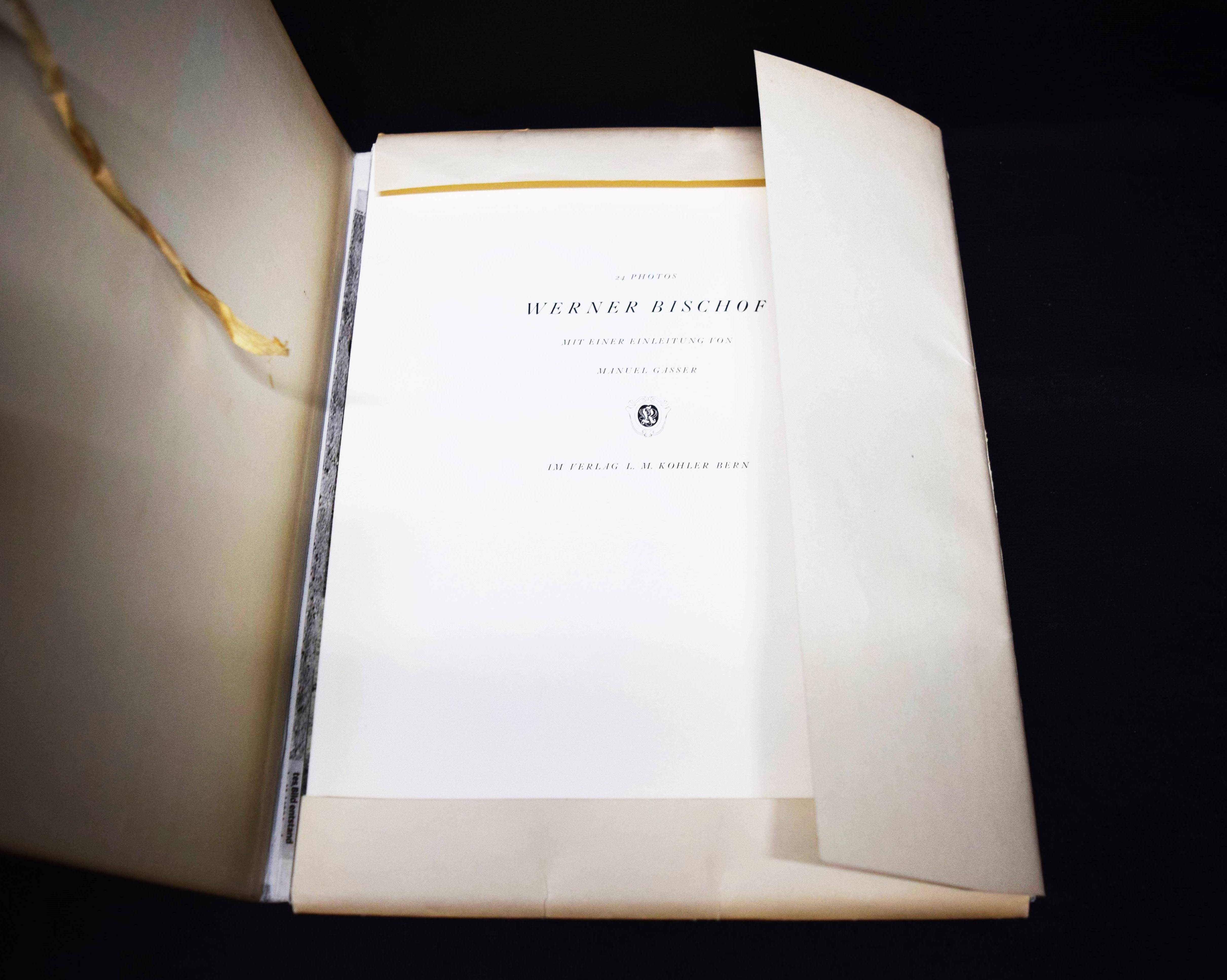 Bischof, Werner. 24 Photos. Mit einer Einleitung von Manuel Gasser. Bern, Kohler (1946). 4° (31,5 x 23,5 cm.). Portfolio, [2] Bl. und 24 (statt 23) Duotone-Tafeln auf Karton. Illustr. Orig.-Halbleinen-Flügelmappe. Auer 315. Heidtmann 5349. Koetzle 51 f. Schweizer Fotobücher S. 127. – Seltene erste Veröffentlichung des bedeutenden Schweizer Photographen, der besonders durch seine Arbeit für die Agentur „Magnum“ bekannt wurde. – Die Aufnahmen entstanden zwischen 1939 und 1945. Die erste Aufnahme „Abstraktion“ auf den Vorderdeckel montiert. – „Das schöne Bild von Bischof … war nicht pures ästhetisches Anliegen, sondern entsprach seinem Credo an eine heile Welt. Doch was er zu zeigen hatte, das vom Krieg zerstörte Europa, der Hunger in Indien, die Kriege in Indochina und Korea, zeugten für eine Welt des Unheils. So gehört zu Bischof gleicherweise die Entschlossenheit, sich mit dem Unheil der Welt mit der Kamera zu stellen, wie die Absatzbewegung“ (H. Loetscher in Koetzle). – Die Flügelmappe am Vorderdeckel mit übermalter Abriebstelle (Buchstabenverlust beim Vornamen des Fotografen), die letzte Tafel „Flüchtlingskind“ doppelt vorhanden, gutes Exemplar.