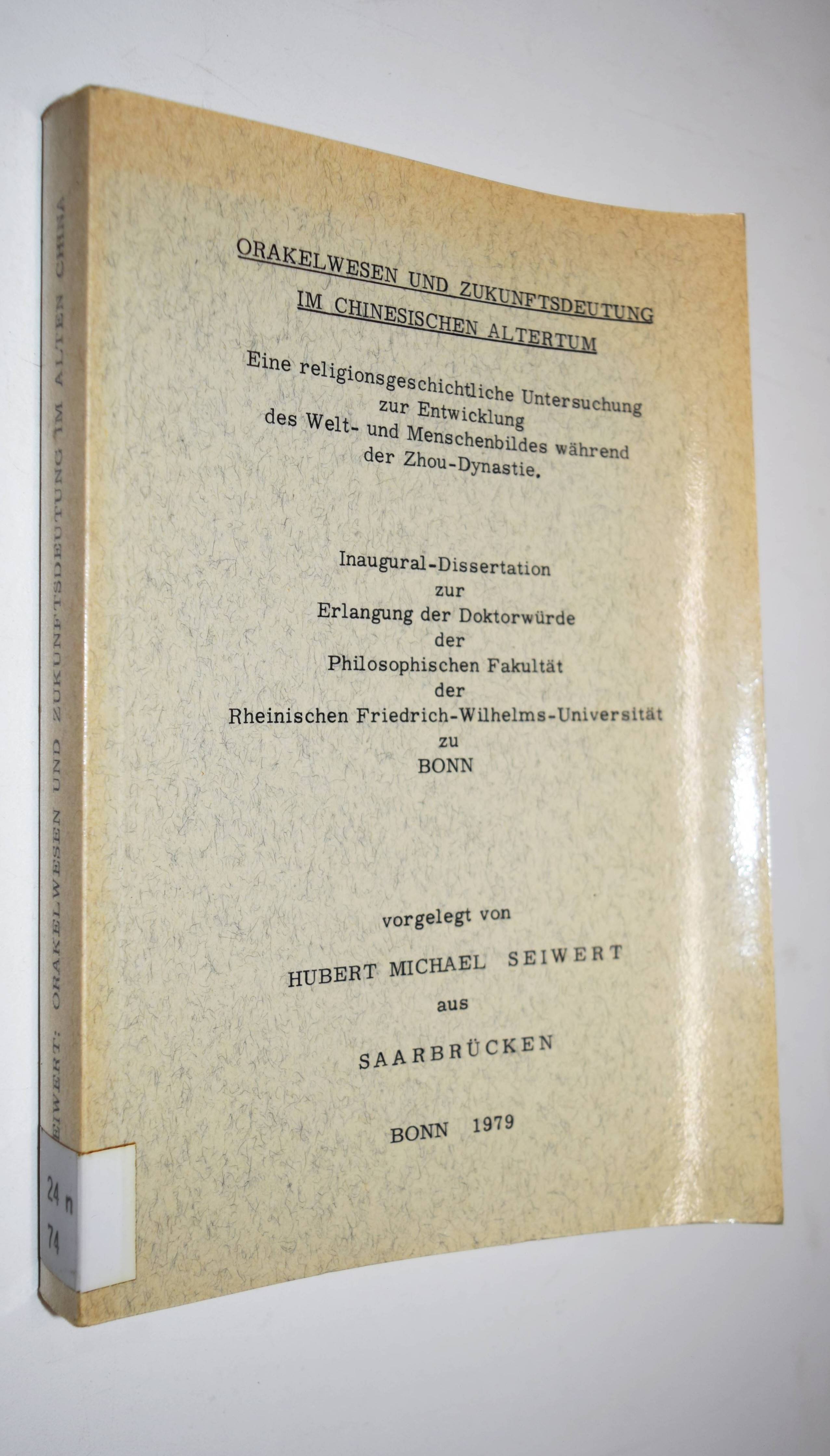 Seiwert, Hubert Michael. Orakelwesen und Zukunftsdeutung im chinesischen Altertum. Eine religionsgeschichtliche Untersuchung zur Entwicklung des Welt- und Menschenbildes während der Zhou-Dynastie. Inaugural-Dissertation… der Rheinischen Friedrich-Wilhelms-Universität zu Bonn. Bonn 1979. 8°. 352 S. Orig.-Kartonumschlag. Seltene Dissertation des saarländischen Religionswissenschaftlers H. M. Seiwert (geb. 1949). – Umschlag mit Klebefolie kaschiert und Bibliotheks-Signatur am Fuß, gutes Exemplar.