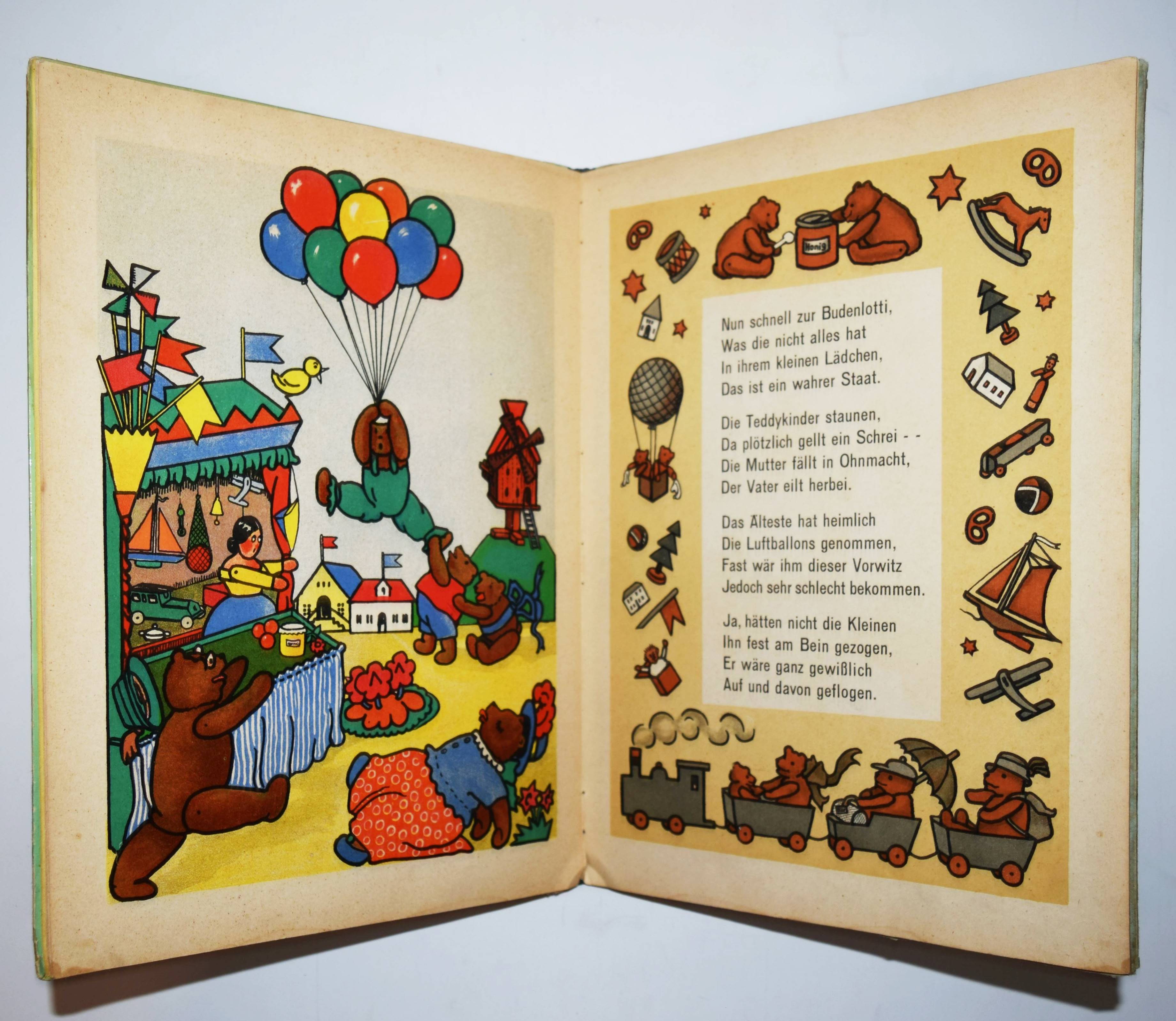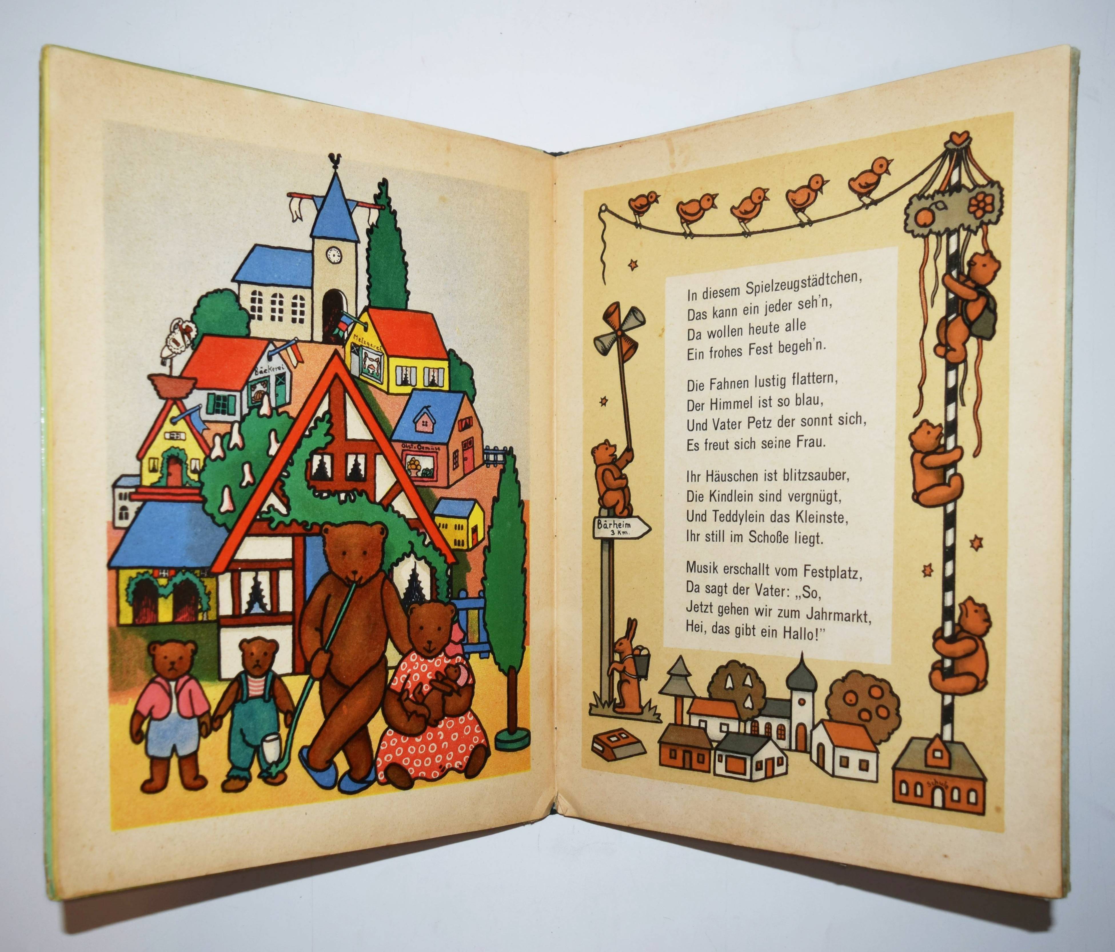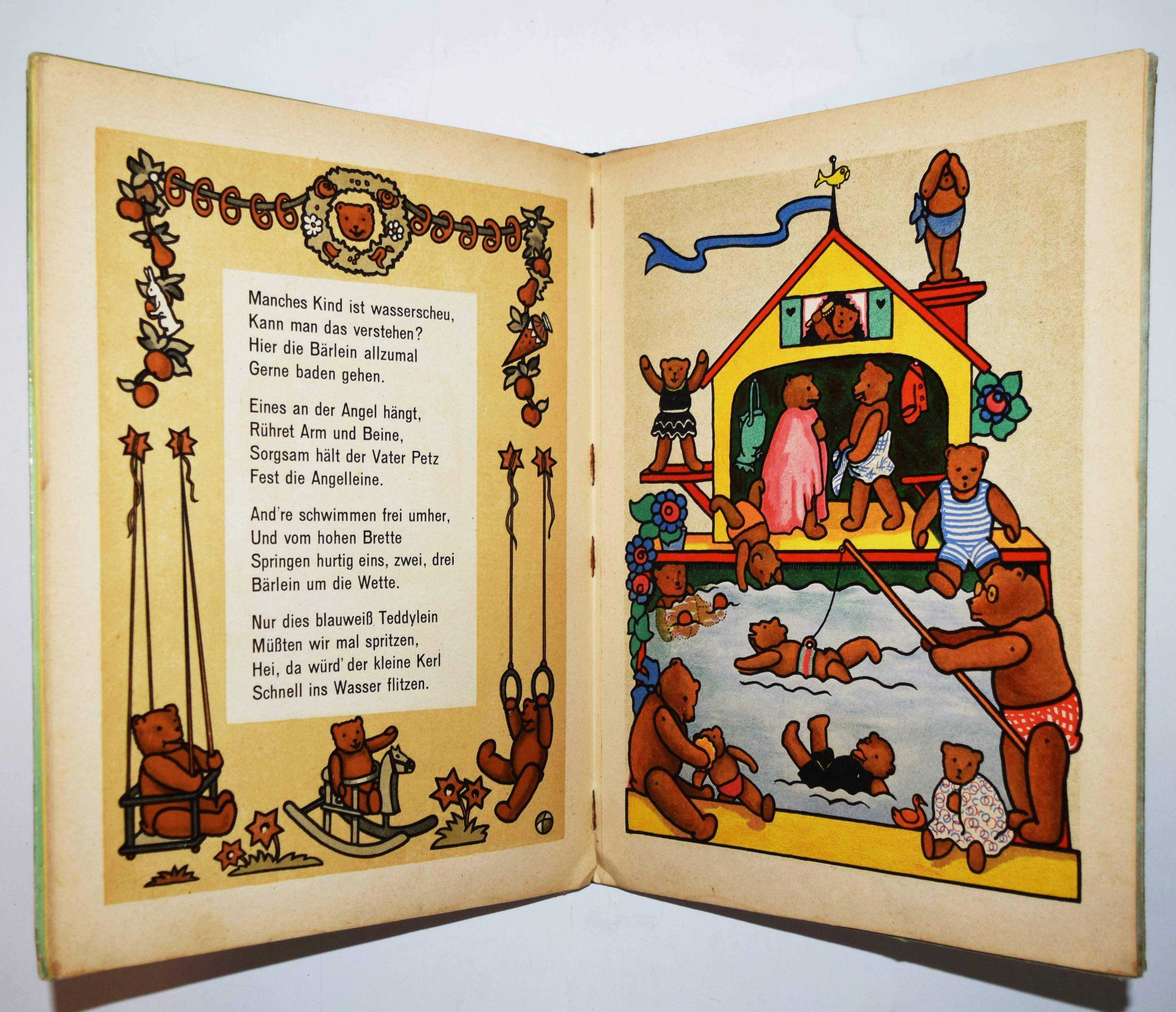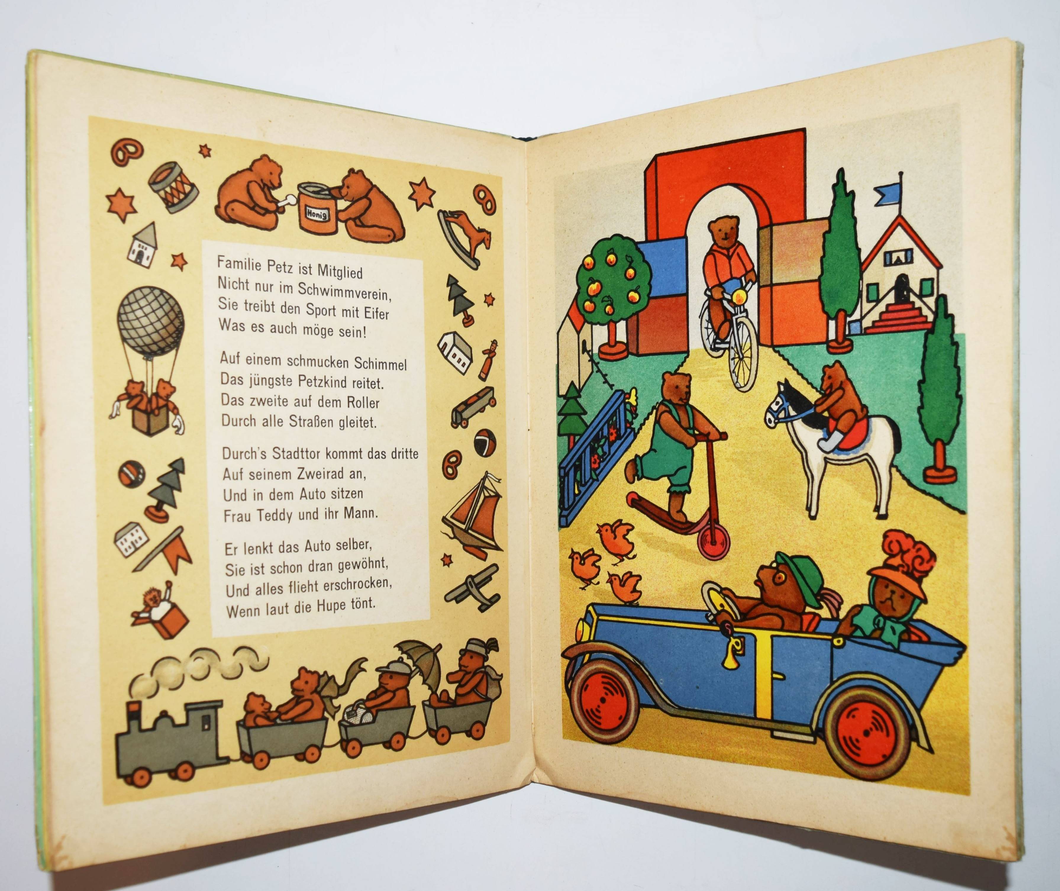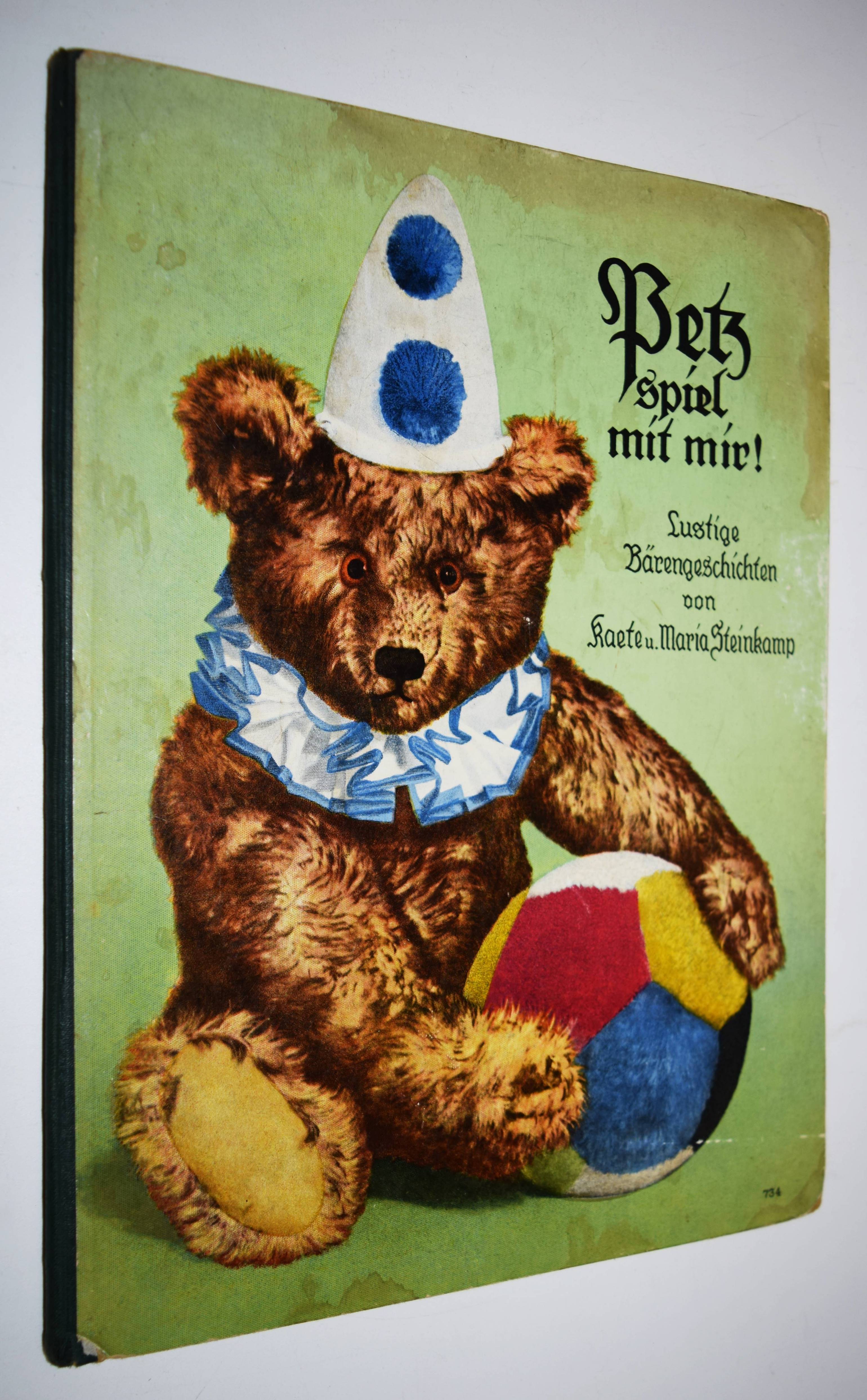 Steinkamp, Maria. Petz spiel mit mir! Lustige Bärengeschichten. Bilder von Kaete Steinkamp. Duisburg, Steinkamp o. J. (um 1920). 4°. [9] Bl. mit illustr. Titel, 8 ganzs. farblithogr. Illustrationen, illustr. Textbordüren und Schlußvignette. Farbig illustr. Orig.-Halbleinenband. (Verlags-Nr. 734). Bunk, Steinkamp-Verlag S. 67 (mit Abb.). – Seltenes Bilderbuch mit farbenfrohen Spielzeugdarstellungen. Titelblatt in Sütterlin-Schrift. Im Buch „Petz, spiel mit mir! Lustige Barengeschichten” wird laut Verlagswerbung „des Kindes Lieblingsspielzeug, der Teddybär in lustigen, farbenfrohen Bildern von Kaete Steinkamp dargestellt. Unerschöpfliche Freude gibt gerade dieses Buch den 2-4 jährigen, die in allem, was sie hier sehen, ihre Spielsachen und ihre eigene Umgebung erkennen. Maria Steinkamps Verse, umrahmt von munteren Zeichnungen, sowie farbige Vorsatzblatter ergänzen die Bilder in fröhlicher, den Kindern so leicht verständlicher Weise“.“ (Dieter Bunk). – Kaete Steinkamp, die 1895 geborene Tochter von Otto Steinkamp, hat nach Studien an den Kunstgewerbeschulen in Düsseldorf und München bei Emil Orlik in Berlin studiert. – „Nach den Arbeiten im väterlichen Verlag hat sie Wettbewerbe für Kunst am Bau gewonnen und besonders gerne Aquarelle, Monotypien und Collagen erstellt. Zwei Jahre nach ihrem Tod organisierte das Duisburger Lehmbruck Museum 1974 eine Gedächtnisausstellung mit über 40 Collagen, Aquarellen und Scherenschnitten“ (H.-D. Bunk in „Zur Geschichte des Steinkamp Verlags“, anlässlich der Ausstellung zur Ruhr Antiquaria 2010). – Deckel im Rand etwas fleckig, Innengelenke stellenweise angeplatzt, sonst gut erhalten.