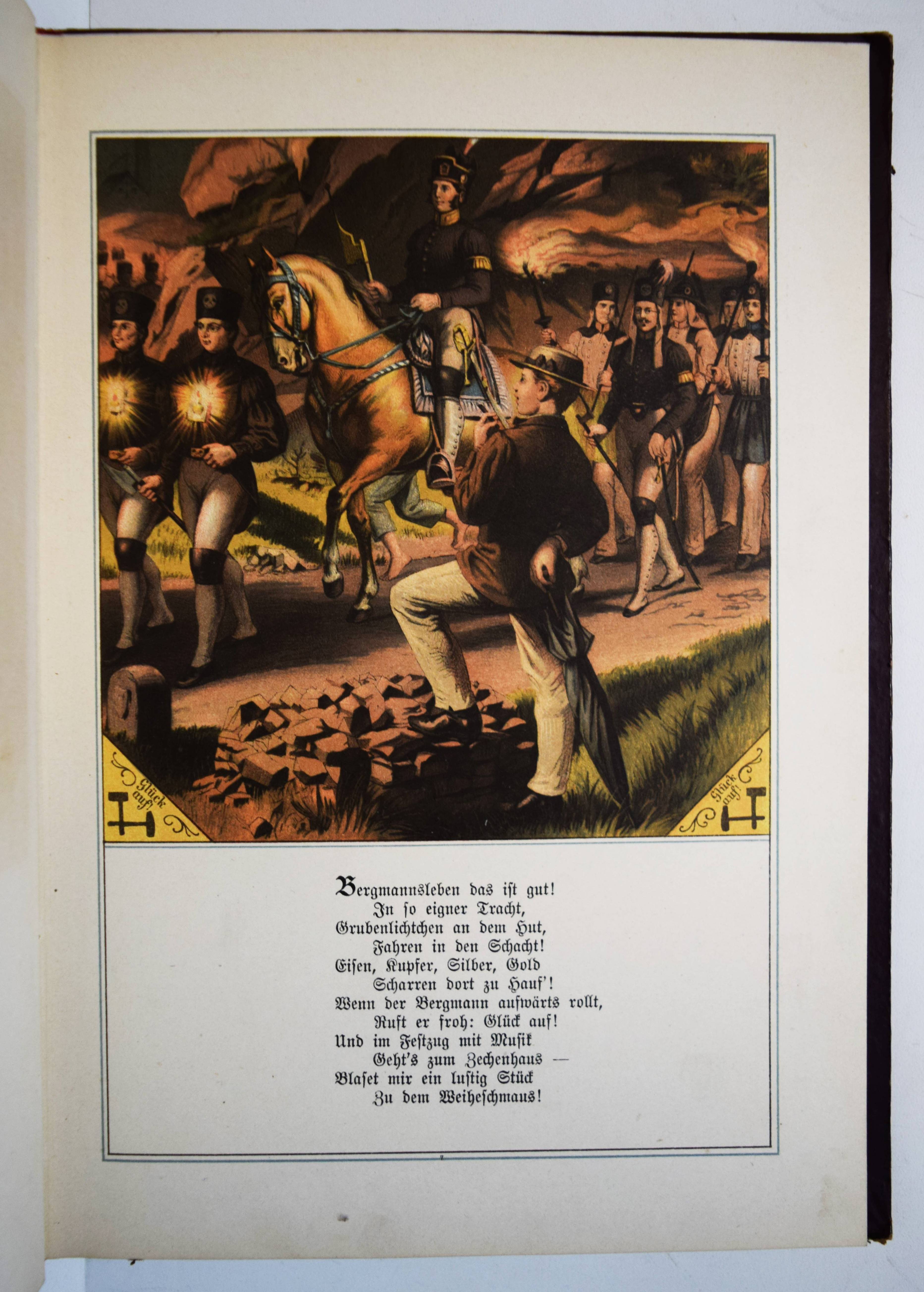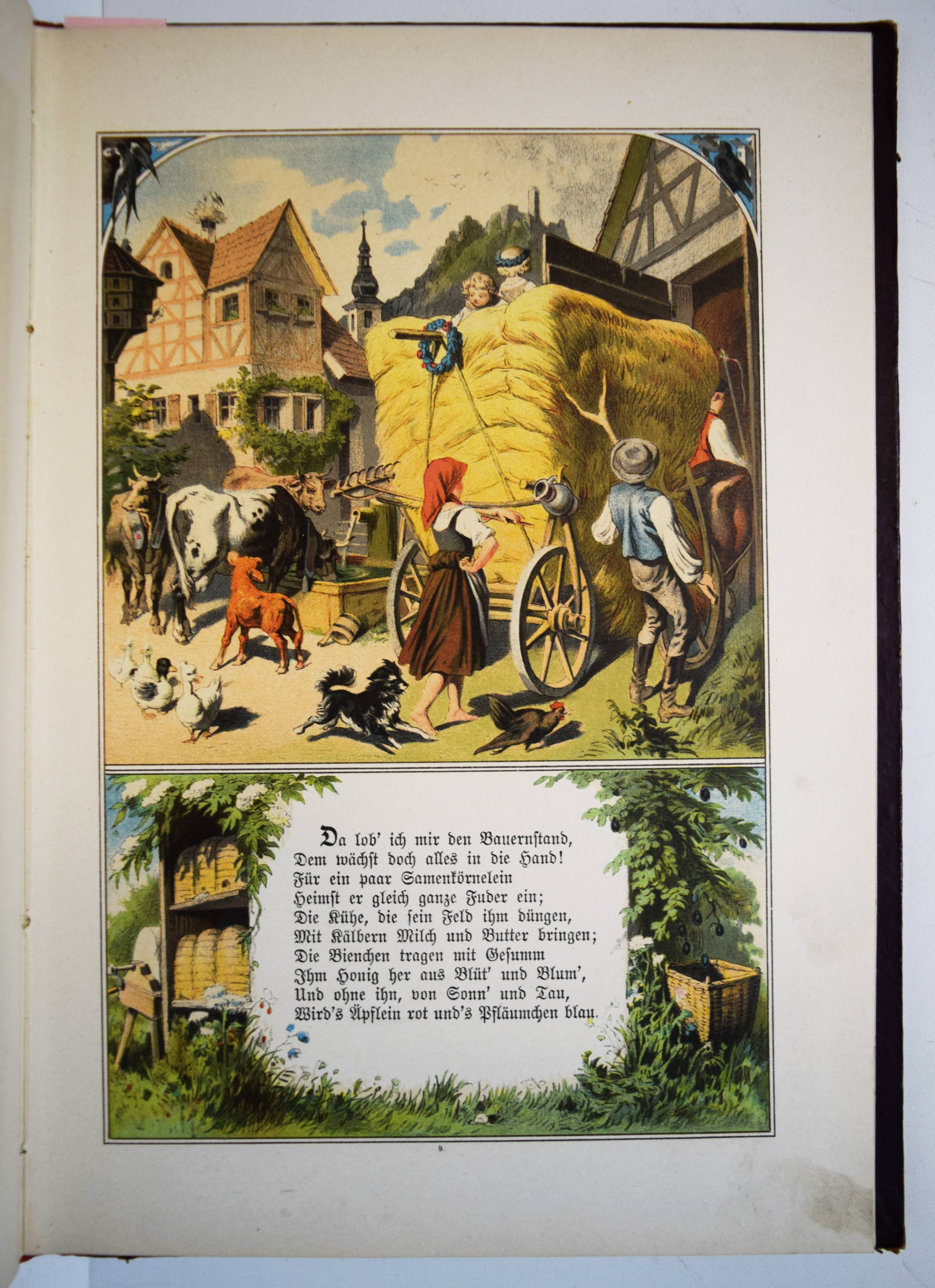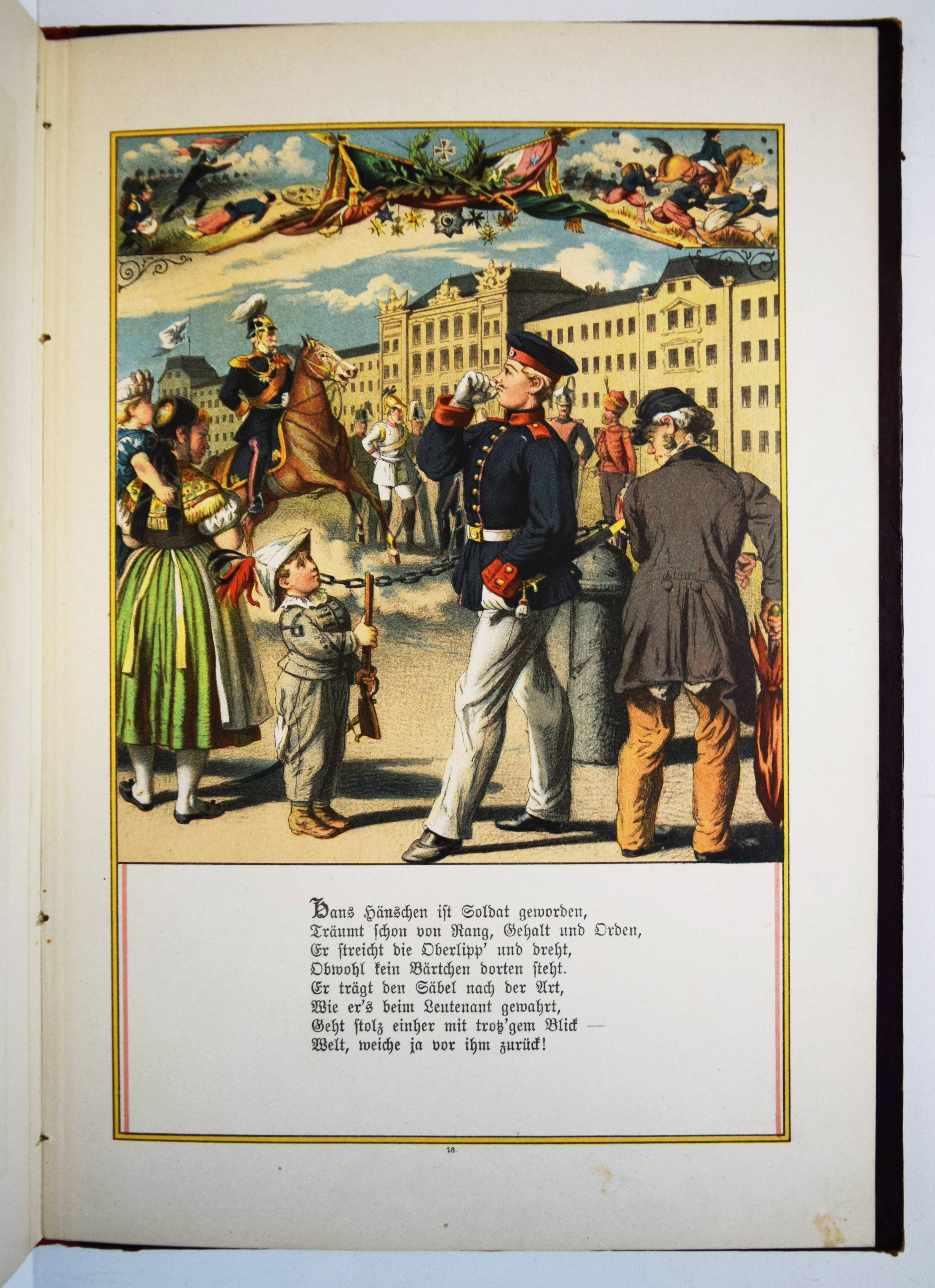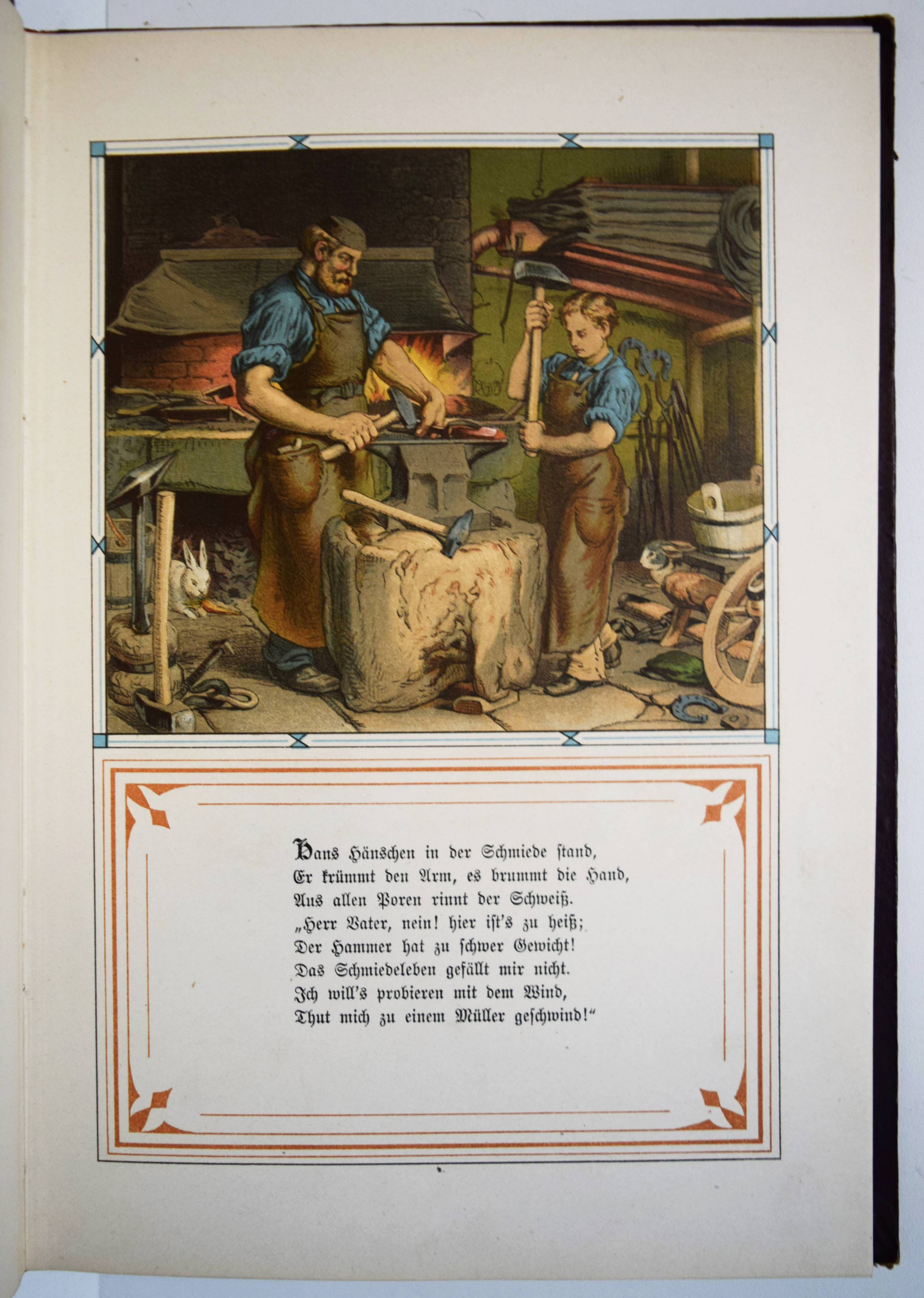 Jäde, Heinrich. Hans Hänschen, das etwas werden wollte. Ein Büchlein für kleine Kinder. Mit Bildern von Leopold Venus und Rudolf Geißler. 4. Auflage. Glogau, Carl Flemming o. J. (1886). Gr.-8° (25 x 17,5 cm.). Titelblatt, 20 chromolithogr. Tafeln mit eingedruckten Versen, [2] Bl. Orig.-Halbleinenband mit farb. Deckelbild. Ries 940, 14. Wegehaupt II, 1697 (3. Auflage von 1880) . – Zuerst 1853 erschienenes Bilderbuch mit dekorativen Berufs-Darstellungen (Fischer, Hufschmied, Schmied, Müller, Bergmann, Bauer, Bäcker, Metzger, Zimmermann, Schneider, Soldat etc.). – Sehr gutes sauberes Exemplar.