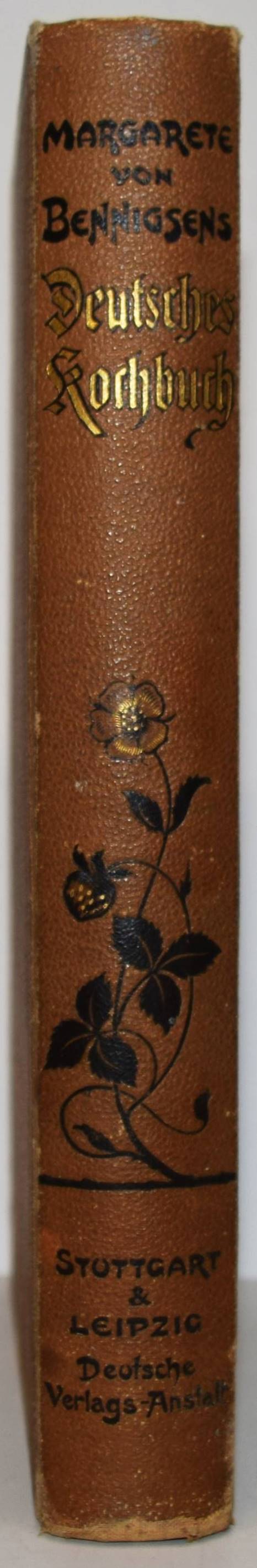 Bennigsen, Margarete v. Deutsches Kochbuch. Stuttgart/Leipzig, Dteutsche Verlags-Anstalt o. J. (1897). Gr.-8° (23,5 x 16 cm.). XXIV, 383, (8) S. mit einigen Vignetten. Farbig illustr. Orig.-Leinenband. Weiss 299. – Erste und einzige Ausgabe, selten. Mit 1328 Rezepten. – Einband etwas berieben und stellenweise fleckig, gutes sauberes Exemplar.