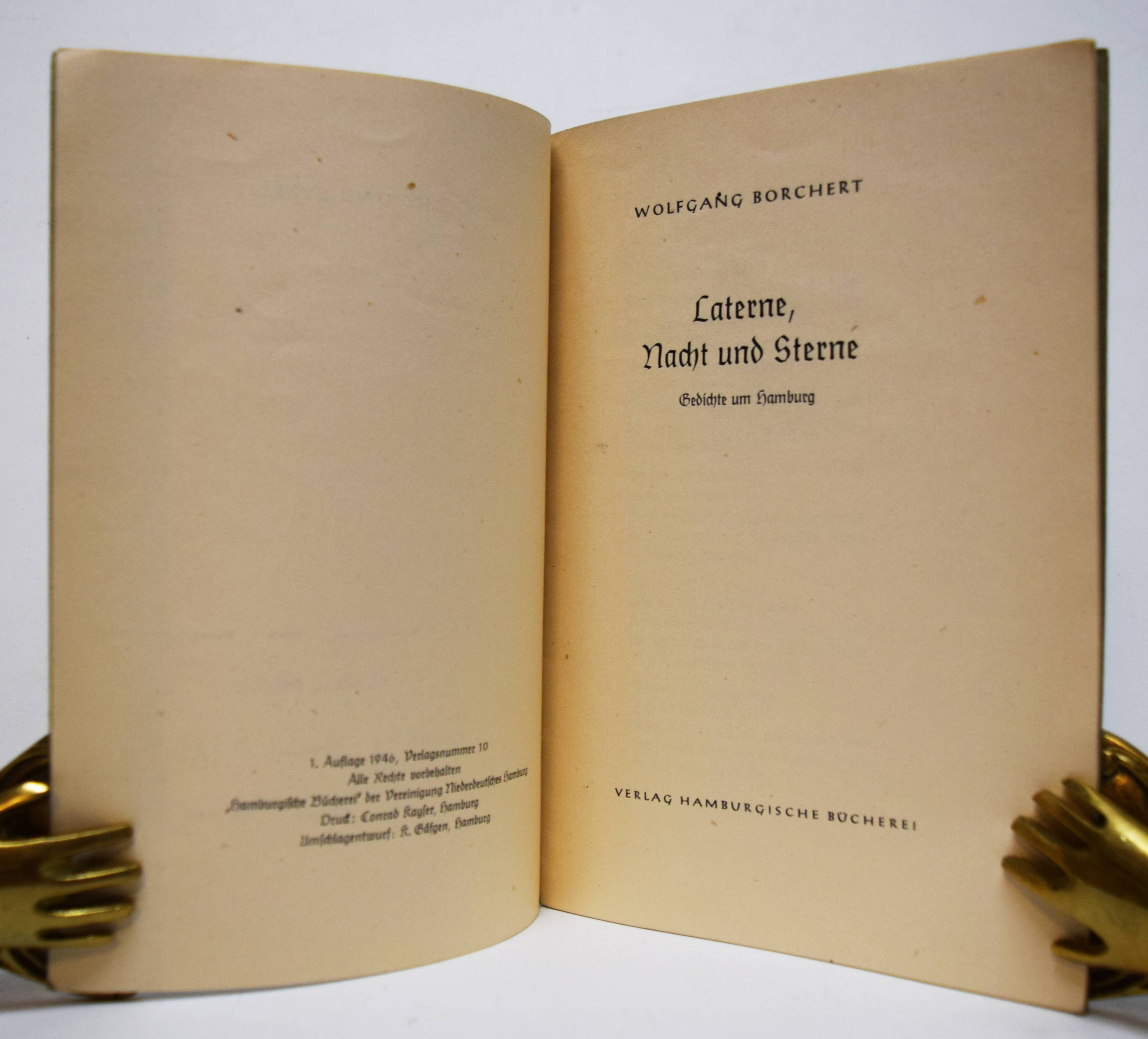 Borchert, Wolfgang. Laterne, Nacht und Sterne. Gedichte um Hamburg. Hamburg, Hamburgische Bücherei (1946). Kl.-8° (17,5 x 12,5 cm.). 19 S. Illustr. Orig.-Kartonumschlag. Kosch I, 791. – Erste Ausgabe der ersten Veröffentlichung. – Rücken etwas berieben, Umschlag im Rand etwas gebräunt, zeitgenössische Widmung auf dem Vortitel, gutes Exemplar.