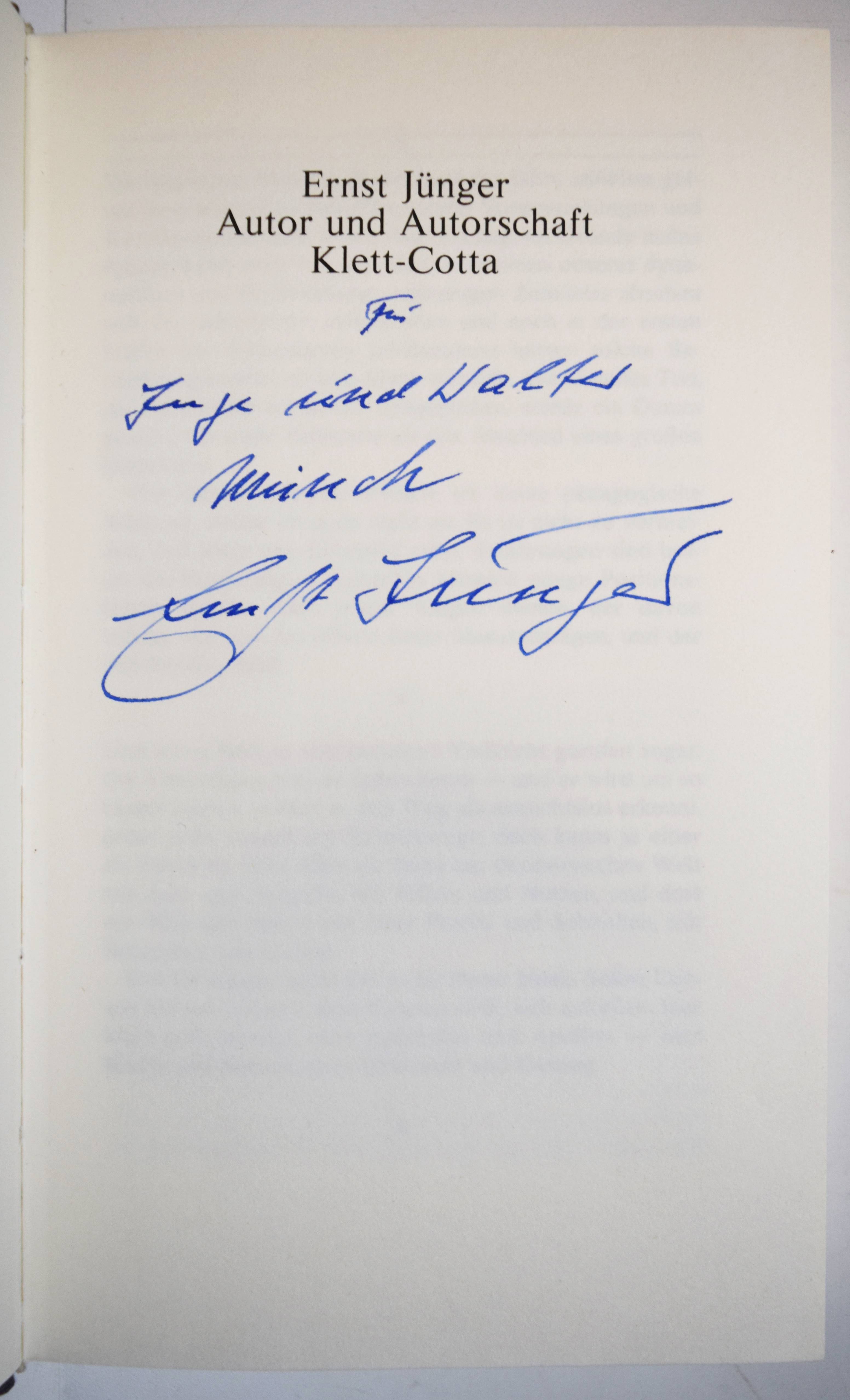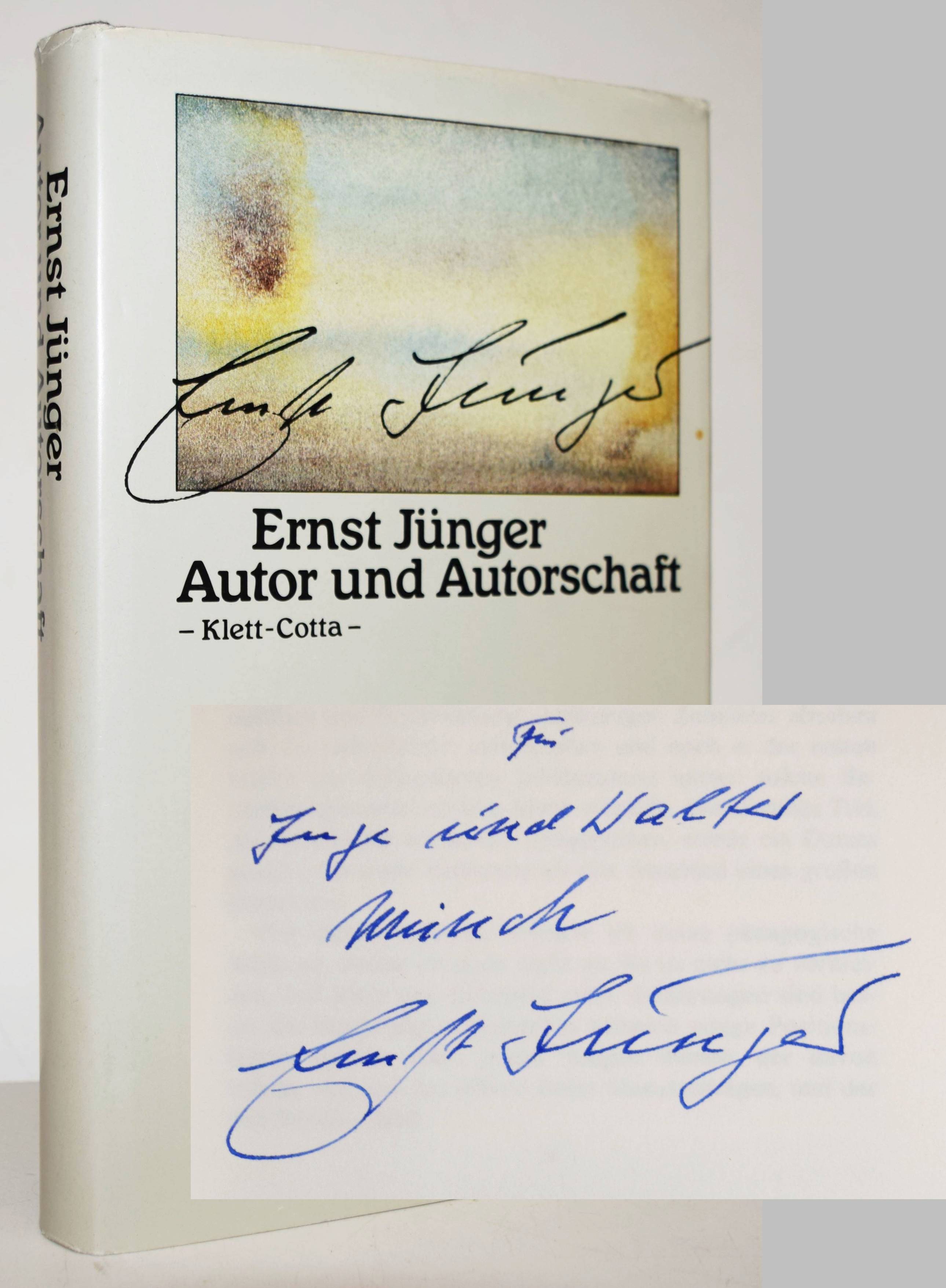 Jünger, Ernst. Autor und Autorschaft. Stuttgart, Klett-Cotta (1984). 8°. 277 S. OLn. mit OU. Des Coudres / Mühleisen B 85. W.-G.² 142. – Erste Ausgabe. – Mit eigenhändiger Widmung von E. Jünger „Für Inge und Walter Münch Ernst Jünger“. – W. Münch (1911-1992) war von 1955 bis 1988 Richter am Verfassungsgerichtshof für das Land Baden-Württemberg in Stuttgart. – Schutzumschlag am Rückendeckel mit geklebtem Einriss, sonst gut erhalten.