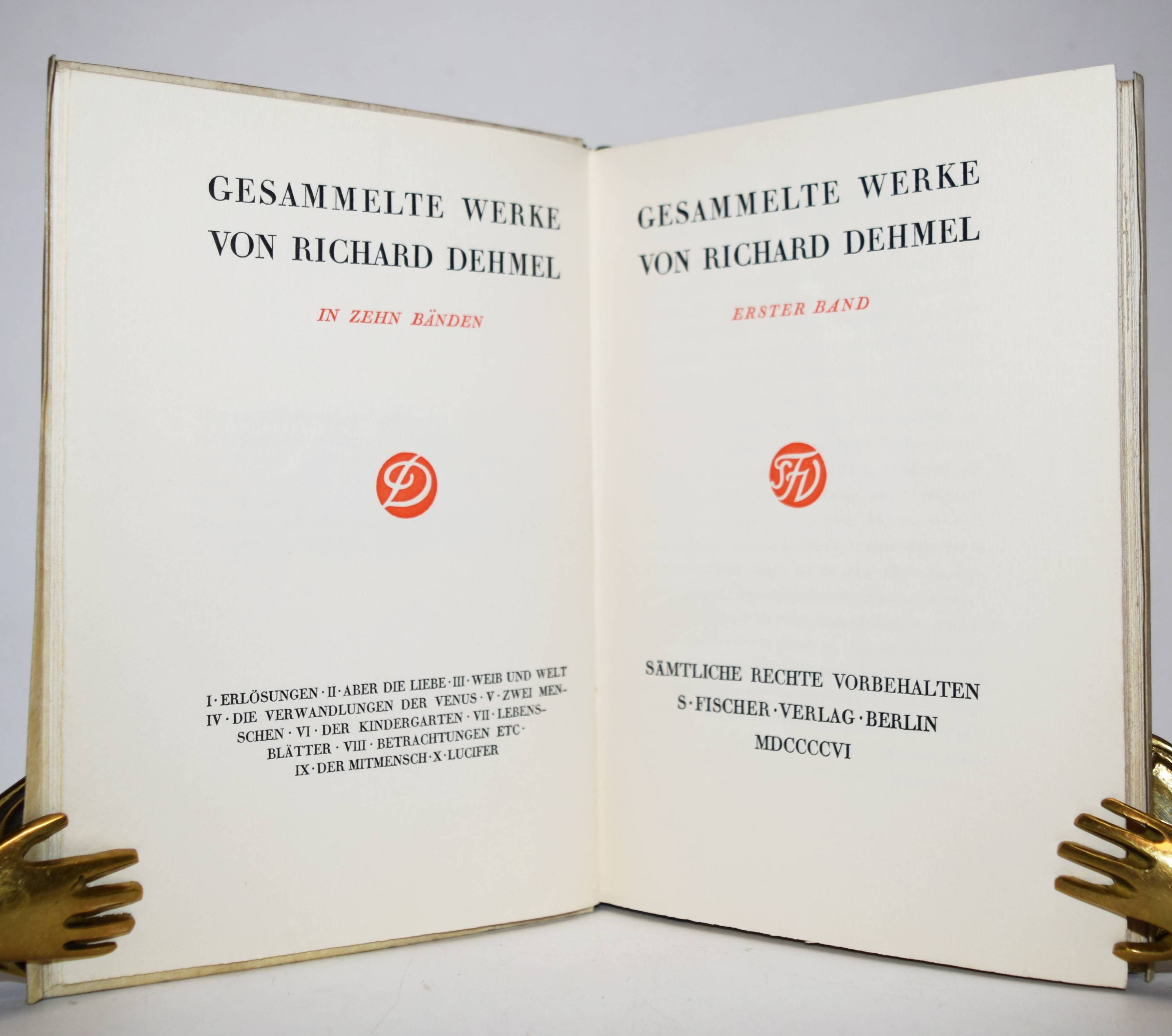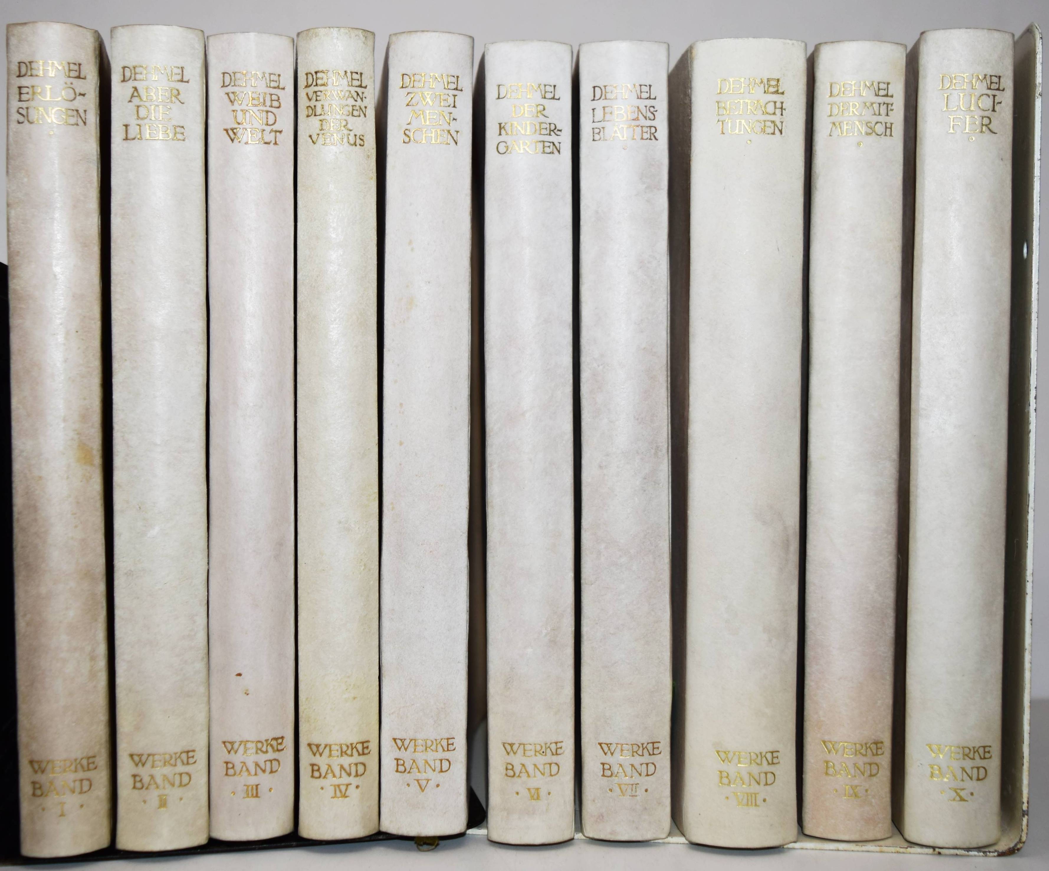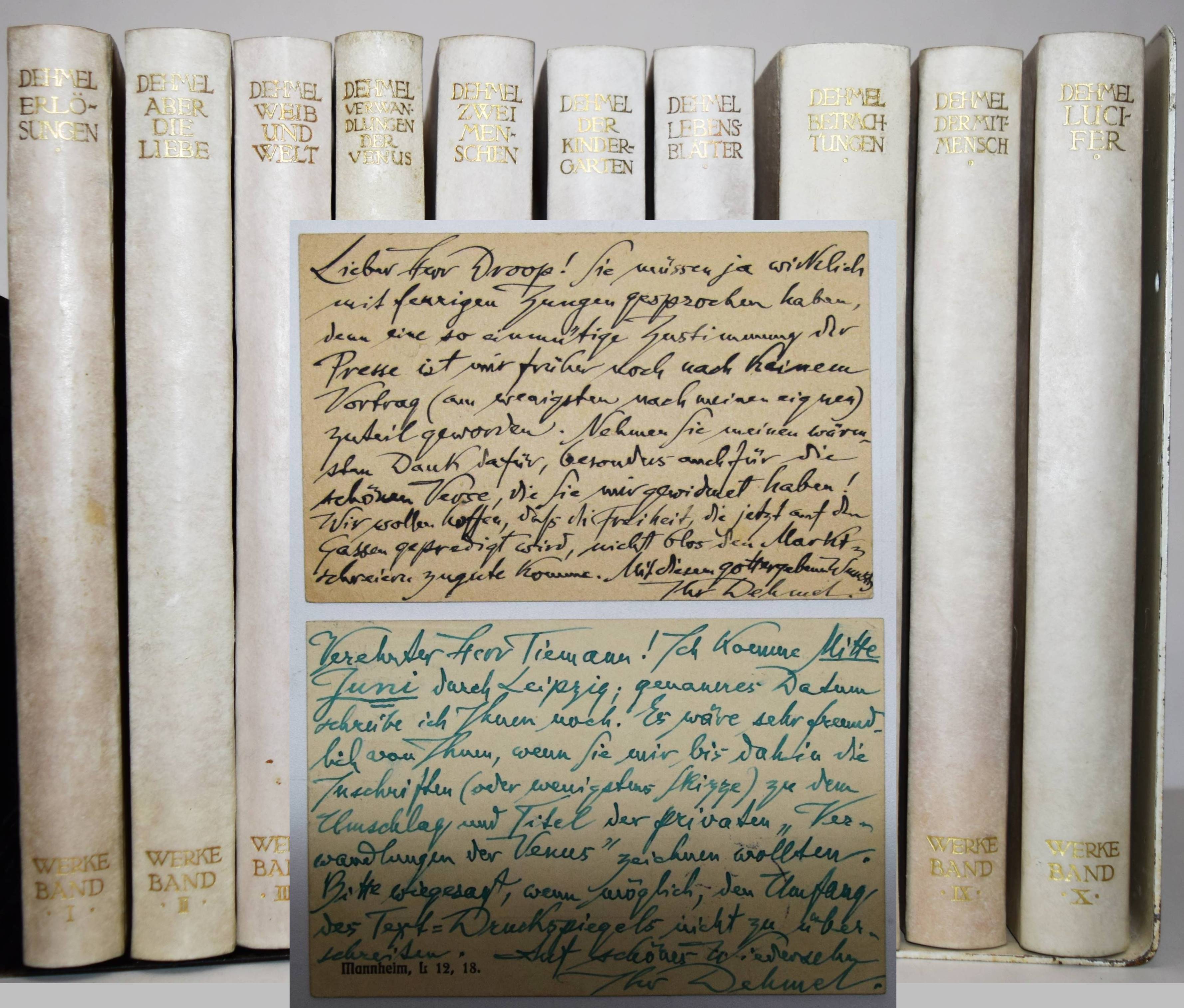 Dehmel, Richard (Fedor Leopold). Gesammelte Werke. 10 Bände. Berlin, S. Fischer 1906-1909. 8°. Orig.-Pergamentbände mit goldgepr. Rückentiteln und Deckelvignetten und Kopfgoldschnitt. Hagen, Handbuch der Editionen 117. – Erste und einzige von Dehmel selbst zusammengestellte Werkausgabe. – Exemplar der Vorzugsausgabe auf Van-Geldern-Bütten in Pergamenteinbänden. – I. Erlösungen. – II. Aber die Liebe. – III. Weib und Welt. – IV. Die Verwandlungen der Venus. – V. Zwei Menschen. – VI. Der Kindergarten. – VII. Lebensblätter. – VIII. Betrachtungen. – IX. Der Mitmensch. – X. Lucifer. – Mit 2 eigenhändigen Postkarten von Richard Dehmel an den Journalisten Fritz Droop (1875-1938) vom 30. 11. 1918 und an den Buchkünstler Walter Tiemann (1876-1951) vom 30. 5. 1907. – I. Bedankt sich für einen Vortrag und den ihm gewidmeten Versen, ferner: „Wir wollen hoffen, daß die Freiheit, die jetzt auf den Gassen gepredigt wird, nicht bloß den Marktschreiern zugute komme.“ (Bezieht sich wohl auf die Novemberrevolution in Kiel am 3. 11. 1918). – II. „Verehrter Herr Tiemann! Ich komme Mitte Juni durch Leipzig; genaues Datum schreibe ich Ihnen noch. Es wäre sehr freundlich von Ihnen, wenn Sie mir bis dahin die Inschriften (oder wenigstens Skizze) zu dem Umschlag und Titel der privaten „Verwandlungen der Venus“ zeichnen wollten. Bitte wiegesagt, wenn möglich, den Umfang des Text-Druckspiegels nicht zu überschreiben. Auf schönes Wiedersehen Ihr Dehmel“. Die erste Ausgabe von „Die Verwandlungen der Venus. Rhapsodie.“ erschien als Privatdruck in 150 num. Exemplaren Ende 1907 in Leipzig. – Sehr gutes Exemplar mit 2 interessanten Autographen.