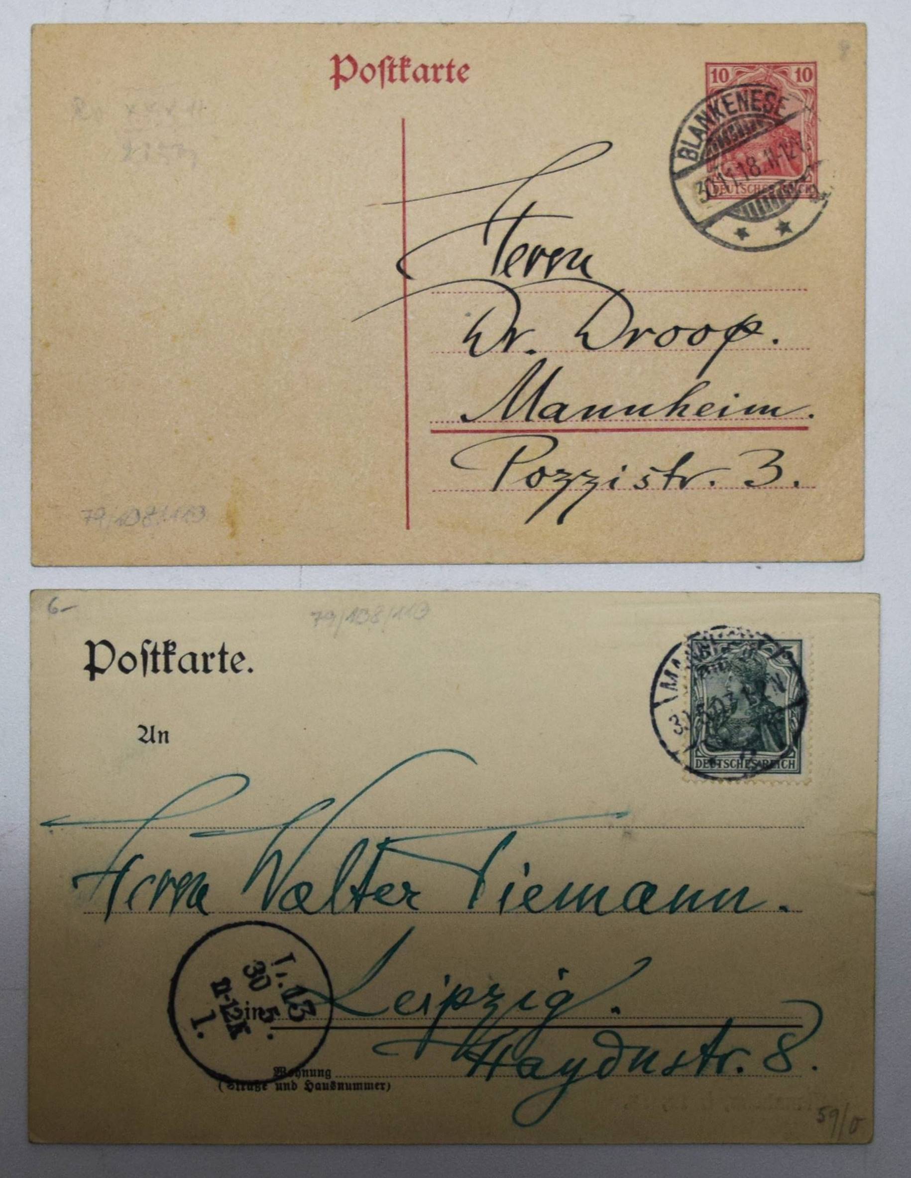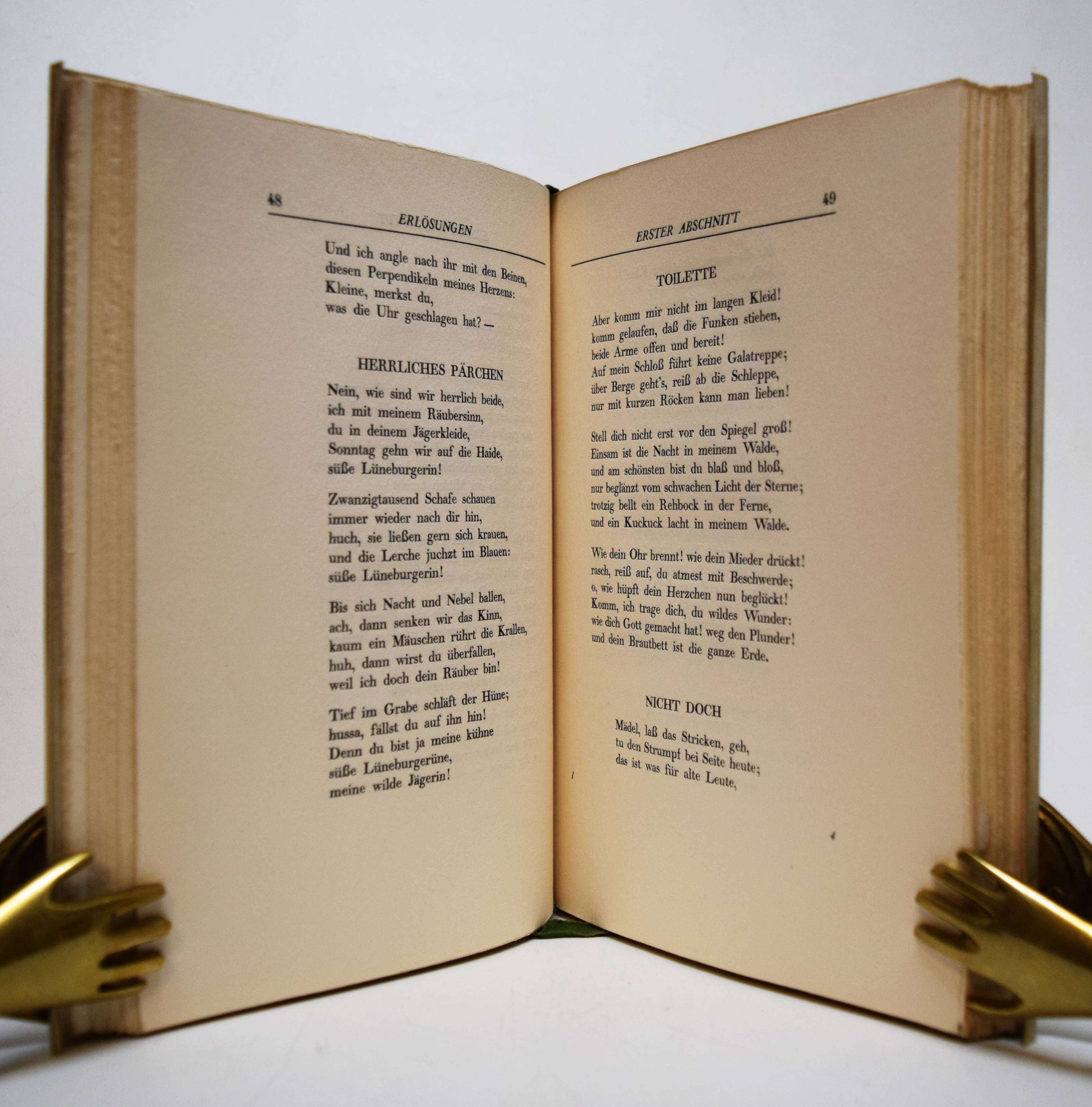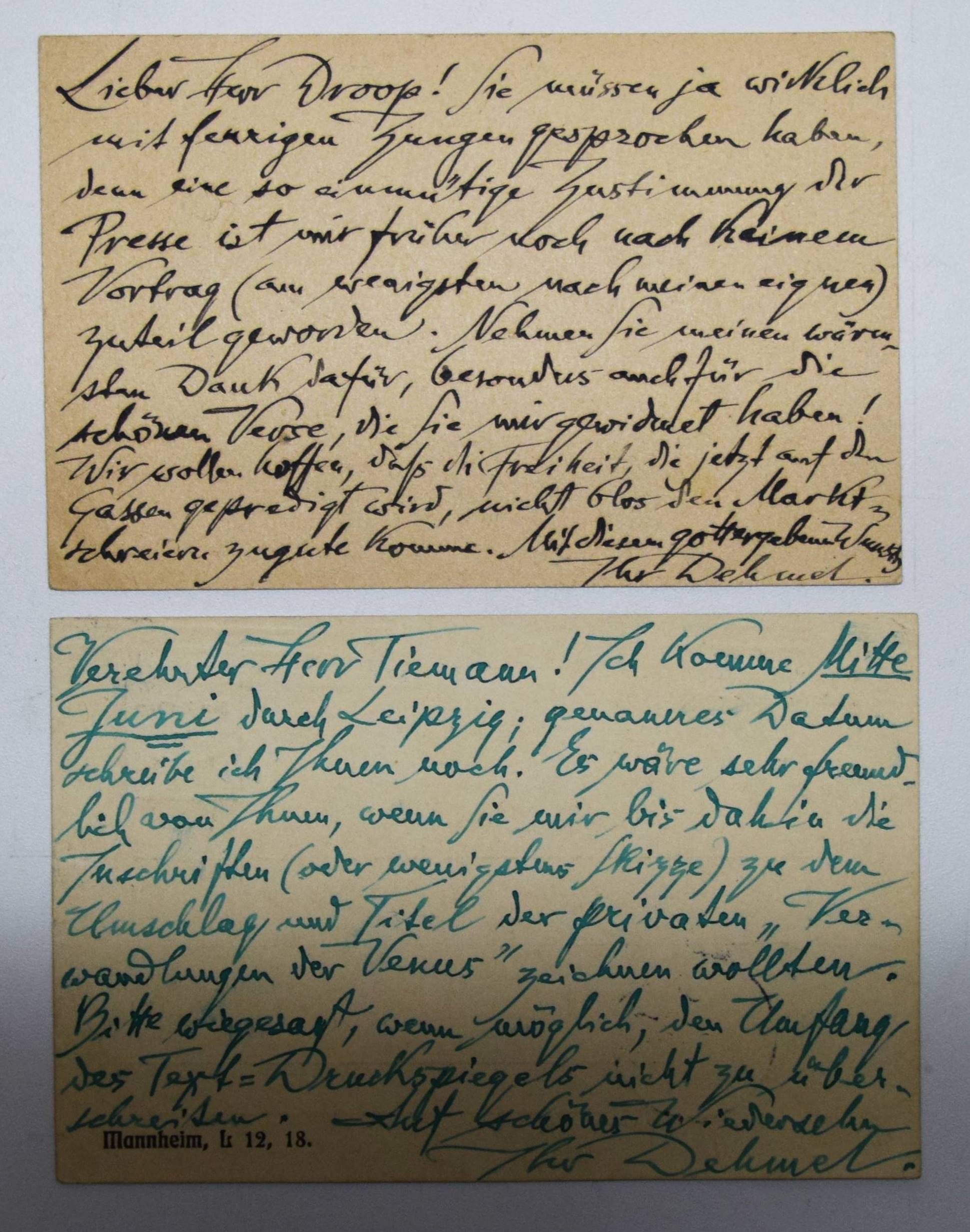 Dehmel, Richard (Fedor Leopold). Gesammelte Werke. 10 Bände. Berlin, S. Fischer 1906-1909. 8°. Orig.-Pergamentbände mit goldgepr. Rückentiteln und Deckelvignetten und Kopfgoldschnitt. Hagen, Handbuch der Editionen 117. – Erste und einzige von Dehmel selbst zusammengestellte Werkausgabe. – Exemplar der Vorzugsausgabe auf Van-Geldern-Bütten in Pergamenteinbänden. – I. Erlösungen. – II. Aber die Liebe. – III. Weib und Welt. – IV. Die Verwandlungen der Venus. – V. Zwei Menschen. – VI. Der Kindergarten. – VII. Lebensblätter. – VIII. Betrachtungen. – IX. Der Mitmensch. – X. Lucifer. – Mit 2 eigenhändigen Postkarten von Richard Dehmel an den Journalisten Fritz Droop (1875-1938) vom 30. 11. 1918 und an den Buchkünstler Walter Tiemann (1876-1951) vom 30. 5. 1907. – I. Bedankt sich für einen Vortrag und den ihm gewidmeten Versen, ferner: „Wir wollen hoffen, daß die Freiheit, die jetzt auf den Gassen gepredigt wird, nicht bloß den Marktschreiern zugute komme.“ (Bezieht sich wohl auf die Novemberrevolution in Kiel am 3. 11. 1918). – II. „Verehrter Herr Tiemann! Ich komme Mitte Juni durch Leipzig; genaues Datum schreibe ich Ihnen noch. Es wäre sehr freundlich von Ihnen, wenn Sie mir bis dahin die Inschriften (oder wenigstens Skizze) zu dem Umschlag und Titel der privaten „Verwandlungen der Venus“ zeichnen wollten. Bitte wiegesagt, wenn möglich, den Umfang des Text-Druckspiegels nicht zu überschreiben. Auf schönes Wiedersehen Ihr Dehmel“. Die erste Ausgabe von „Die Verwandlungen der Venus. Rhapsodie.“ erschien als Privatdruck in 150 num. Exemplaren Ende 1907 in Leipzig. – Sehr gutes Exemplar mit 2 interessanten Autographen.