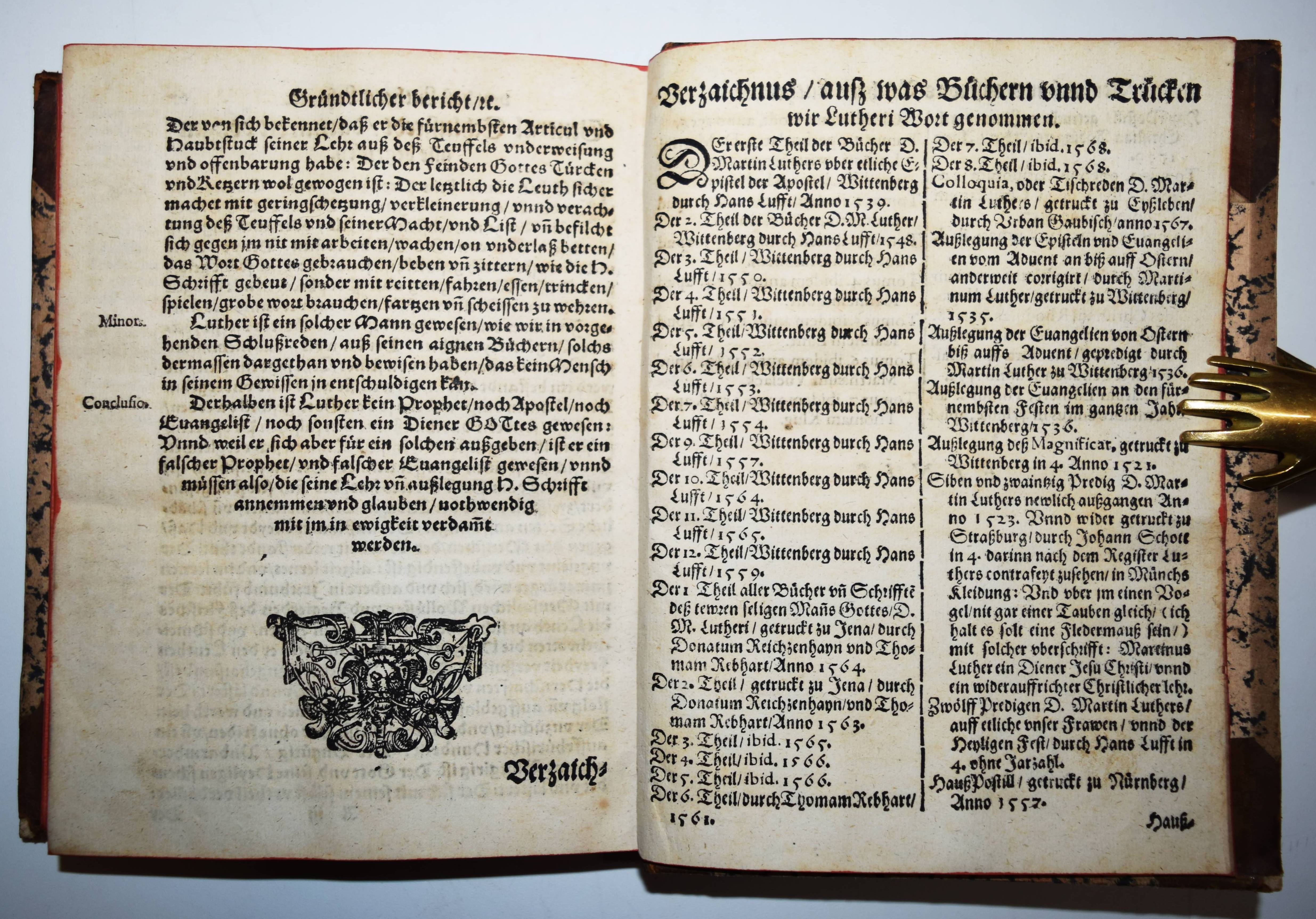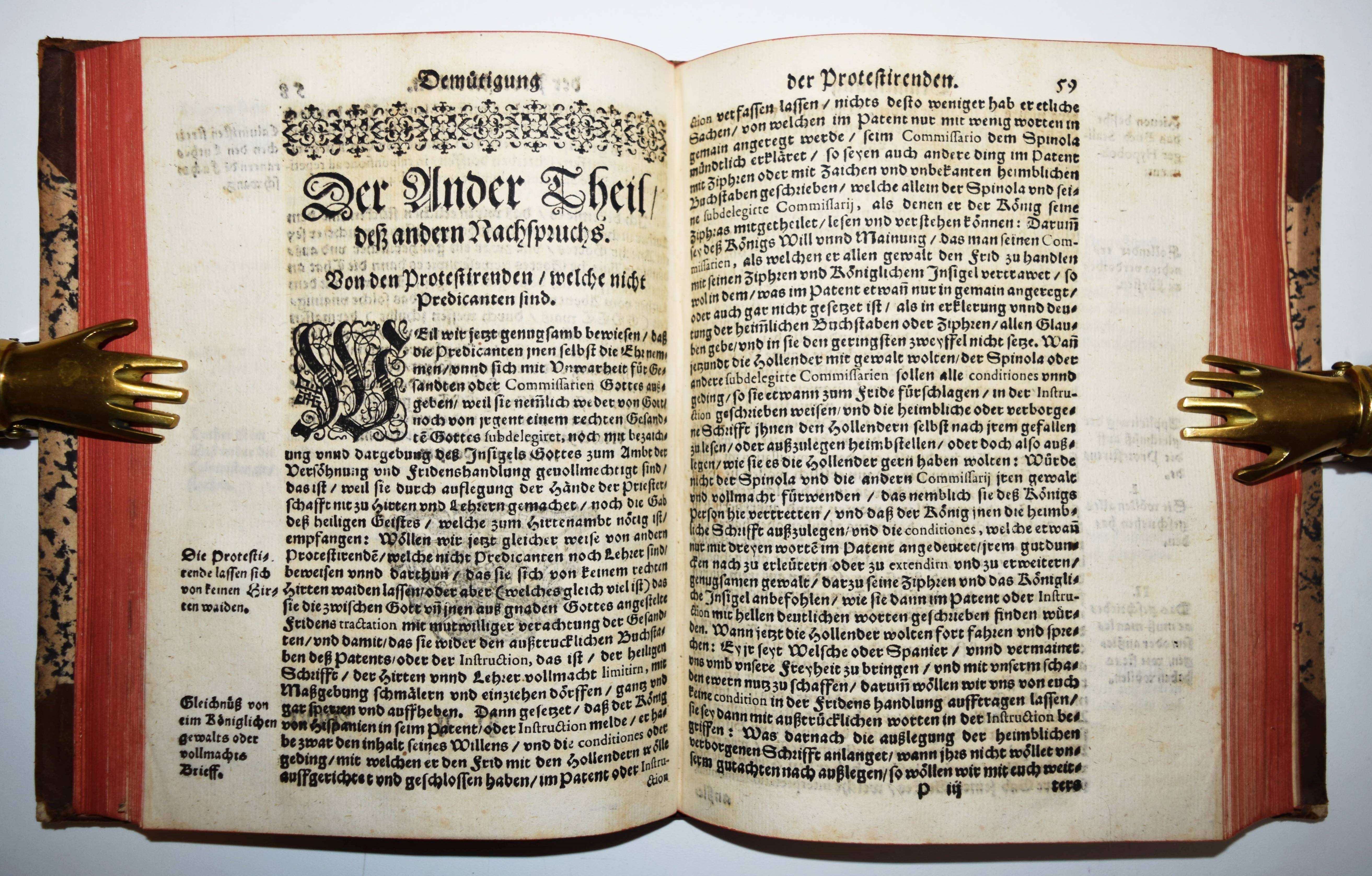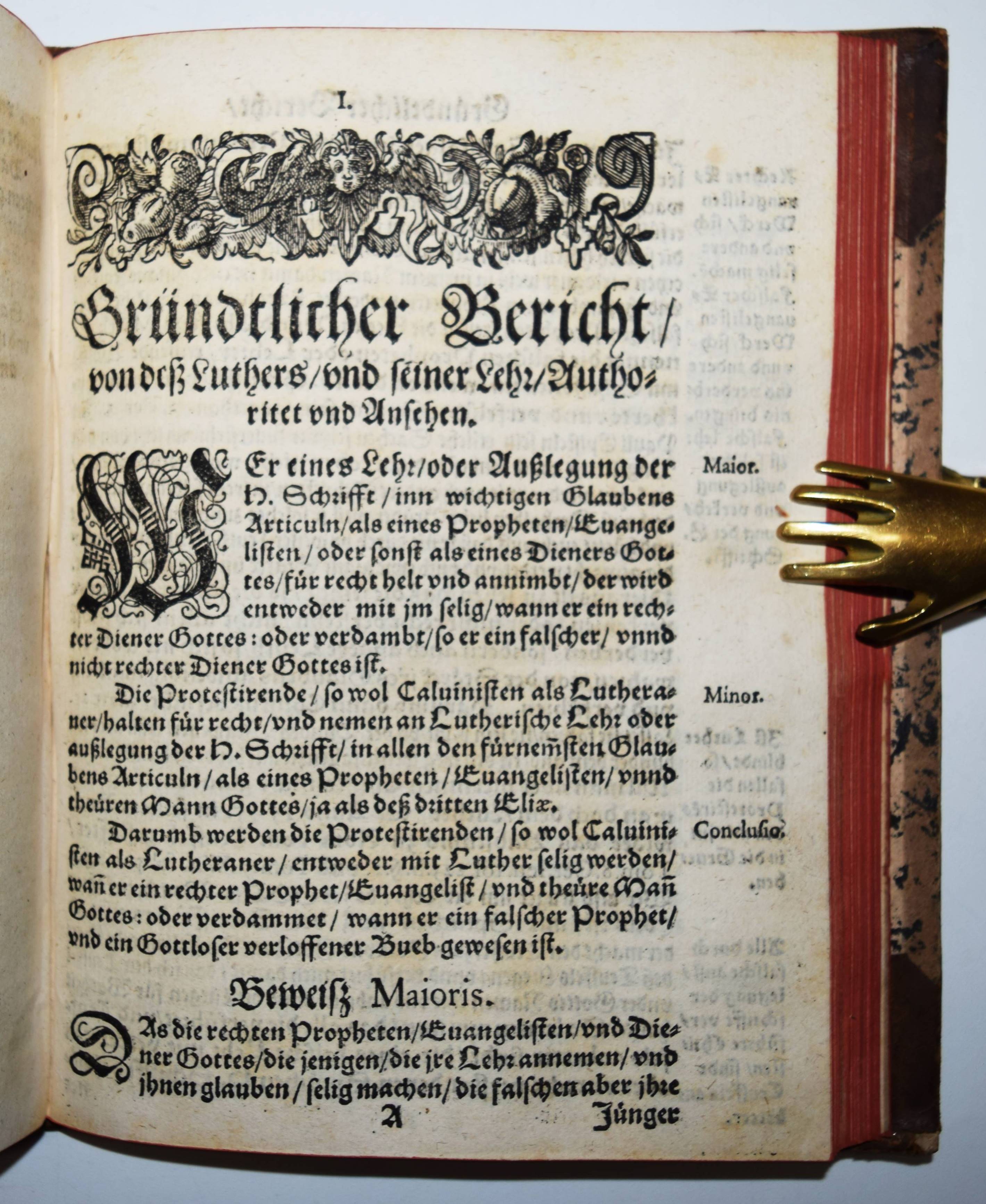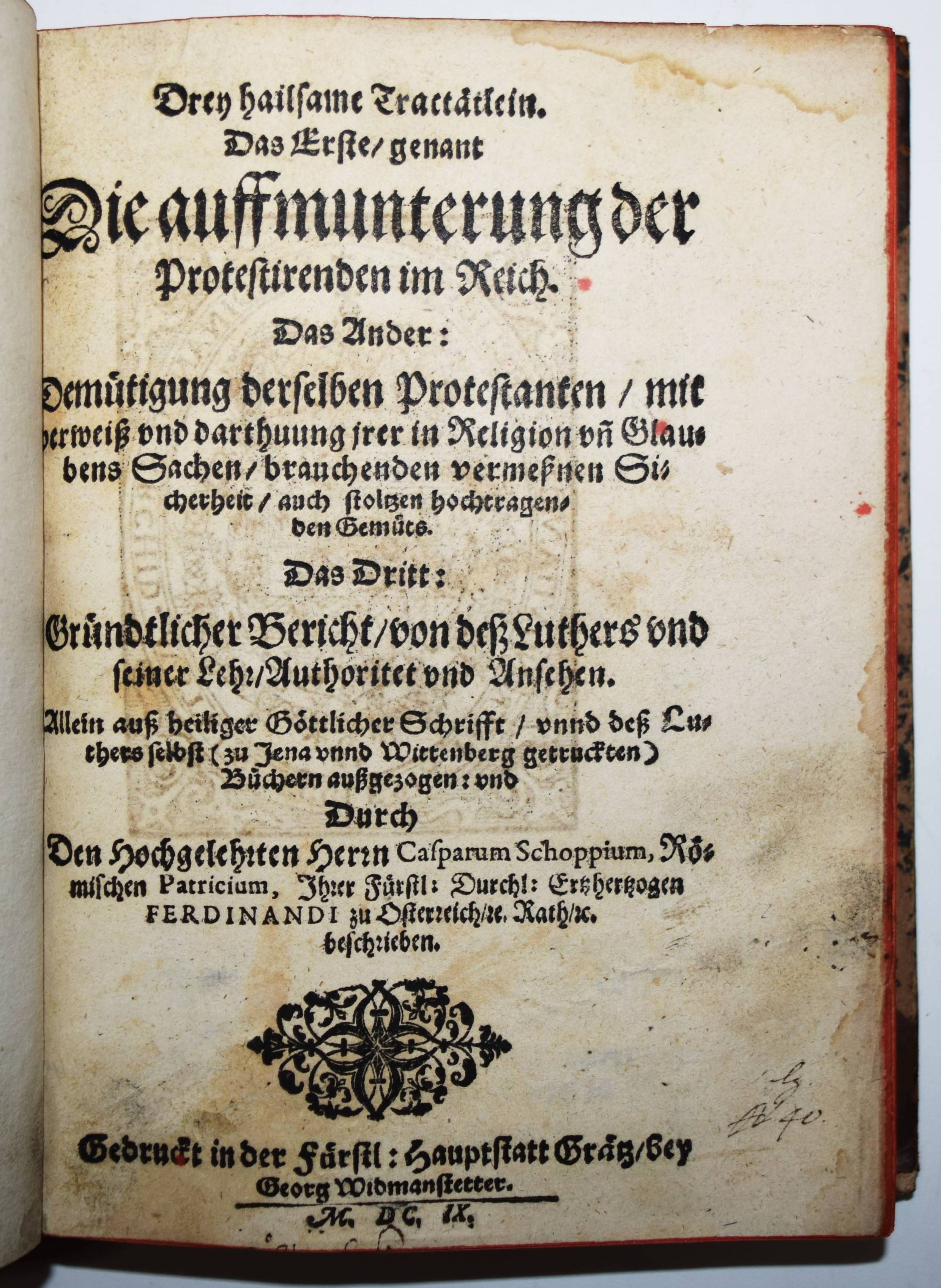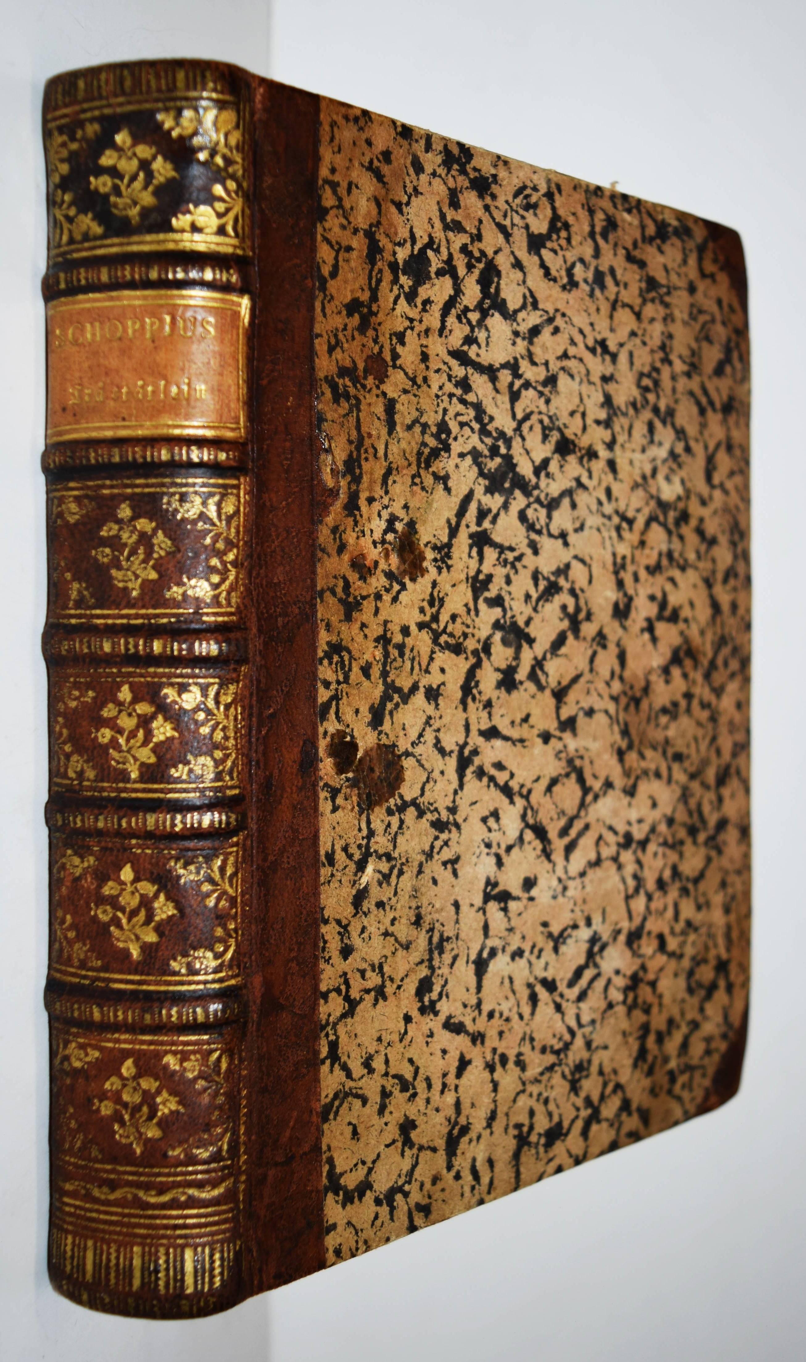 Schoppe (Scioppius, Scioppio), Kaspar. Drey hailsame Tractätlein. Das Erste, genant Die auffmunterung der Protestirenden im Reich. Das Ander: Demütigung derselben Protestanten, mit verweiß und darthuung jrer in Religion un Glaubens Sachen, brauchenden vermeßnen Sicherheit, auch stolzen hochtragenden Gemüts. Das Dritt: Gründtlicher Bericht, von deß Luthers und seiner Lehr Authoritet und Ansehen. 3 Teile in 1 Band. Graz, Georg Widmanstetter 1609. Gr.-8° (20,5 x 15,5 cm.). [6], [19], [122], [67] Bl. mit großem Wappen-Holzschnitt verso Titel. Halblederband des 18. Jahrhunderts mit goldgepr. Rückenschild und floraler Rückenvergoldung. Dünnhaupt 3749, 34. Graff 262. NDB XXIII, 475 ff. VD17 23:280656Y. – Erste Ausgabe dieser seltenen gegenreformatorischen Schriften. Am Schluß eine Bibliographie „Verzaichnus, auß was Büchern unnd Trücken wir Lutheri Wort genommen“. – Der Späthumanist K. Schoppe (1576-1649) „gelangte als Teilnehmer einer ksl. Gesandtschaft … über Ferrara nach Rom, wo er bis 1607 blieb. Er betreute prot. Adelige, traf in Neapel den eingekerkerten Tommaso Campanella und begann eine bis 1619 dauernde Kontroverse gegen seine ehem. Glaubensgenossen. Während er mit Justus Lipsius freundschaftlich korrespondierte, griff er den zuvor von ihm verehrten Leidener Philologen Joseph Justus Scaliger (1540–1609) in polemischer Weise an. 1608 nahm S. am Regensburger Reichstag teil; er engagierte sich für die kath. Liga und wurde von Ehzg. Ferdinand 1609 nach Rom geschickt, um den Papst für das Projekt zu gewinnen. Dieser beauftragte S. mit einer Erwiderung auf die Angriffe Kg. Jakobs I. von England gegen die päpstl. Zweigewaltentheorie“ (K. Jaitner in NDB). – Rücken etwas berieben, Titelblatt im Rand etwas fleckig, sehr gutes dekorativ gebundenes Exemplar.