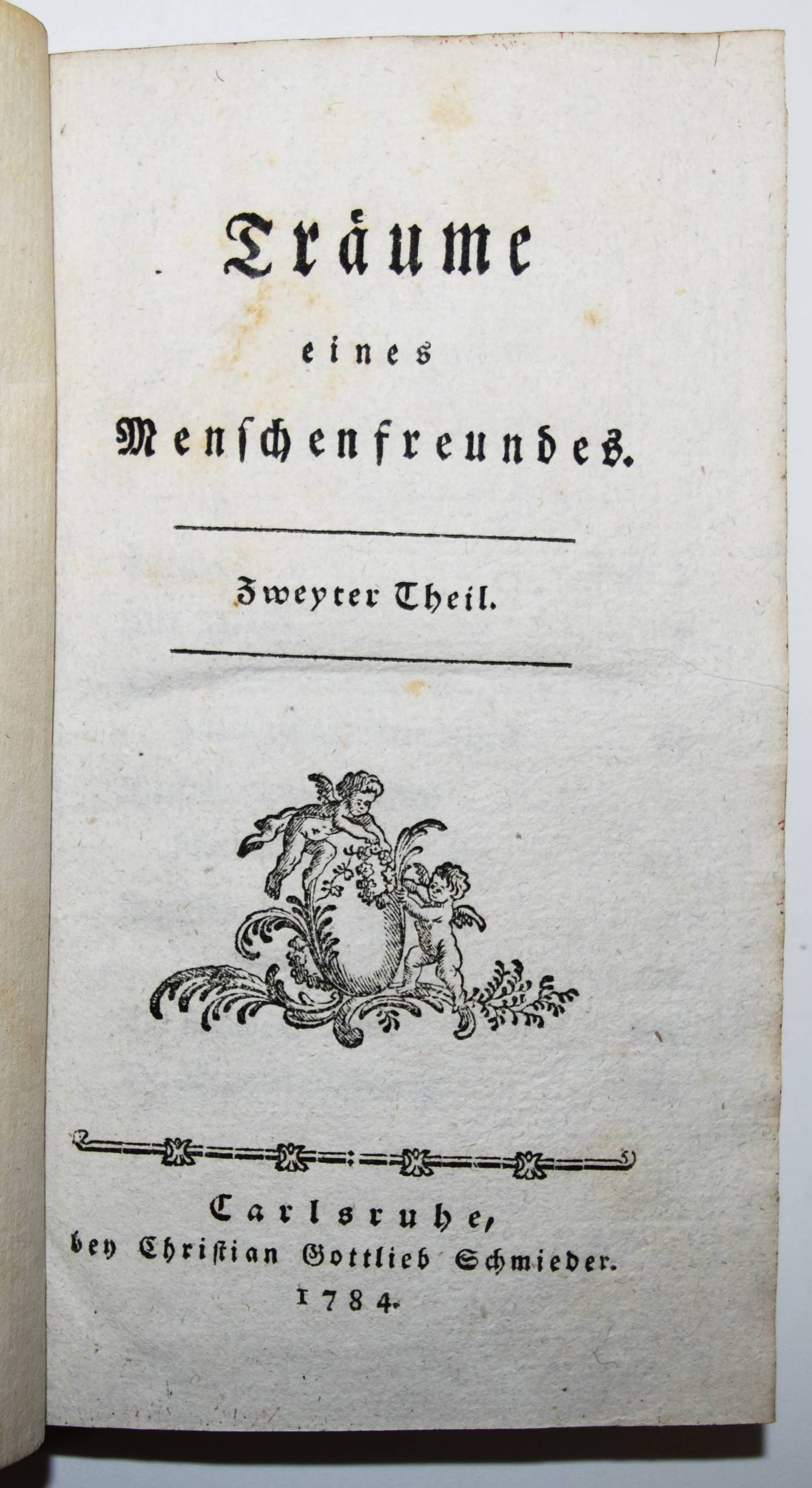 (Iselin, Isaak). Träume eines Menschenfreundes. Erster (und) zweyter Theil 2 Bände. Karlsruhe, Christian Gottlieb Schmieder 1784. 8°. XVI, 288 S.; [2] Bl., 369 S. mit 1 gefalt. Tabelle in Band I. Halblederbände der Zeit mit jeweils 2 goldgepr. Rückenschildern und Rückenvergoldung. (Sammlung der besten deutschen prosaischen Schriftsteller und Dichter, 140. und 141. Theil). Goed. IV, 1, 478, 14. Goldsmith 11382. Humpert 12691. NDB X, 188 f. Palgrave II, 459. VD18 80203159 und 80203167. – Zweite Ausgabe der zuerst 1776 unter diesem Titel erschienenen neuen Ausgabe des 1772 veröffentlichten Werks „Versuch über die gesellige Ordnung“, einer „sozialphilosophisch-ökonomischen Untersuchung über die alles entscheidende Frage des Menschen: die nach seiner Glückseligkeit.“ – Der Schweizer Geschichtsphilosoph und sozialpolitischer Publizist Isaak Iselin (1728-1782) „gehört zu den ersten Theoretikern der Ethnologie – wird die Geschichte als fortschreitende Entwicklung des Menschen zur Humanität dargestellt. Mit Voltaire (1765) und Ferguson (1766) begründet I. damit die geschichtsphilosophische Sicht der späteren Aufklärung. Er galt von nun an als einer der führenden Publizisten im deutschen Sprachbereich. … Zu Beginn der 70er Jahre hatte er im Agroliberalismus der franz. Physiokraten die Bestätigung eigener ökonomischer Überzeugungen gewonnen. Er hoffte, mit dem „Versuch über die gesellige Ordnung“ (1772) diese Lehre im deutschen Sprachraum bekannt machen zu können. Darum zog er auch J. A. Schlettwein 1776/77 nach Basel. Mit Dupont und Le Trosne stand er in persönlicher Verbindung. Um die physiokratischen Ideen und weitere pädagogische, religiöse und sozialpolitische Reformen in ein breiteres Publikum zu tragen, gab er in Anlehnung an das Modell der physiokratischen „Ephémérides du citoyen“ die „Ephemeriden der Menschheit“ (1776-78, 1780-82, weitergef. v. W. G. Becker bis 1786) heraus, welche bald zu den führenden deuschsprachigen Zeitschriften gehörten. Eine Zusammenfassung und Neubearbeitung seiner wichtigsten Publikationen bilden die „Träume eines Menschenfreundes“ (1776, ²1784). Auch wenn I. noch das Scheitern der physiokratischen und der philanthropinischen Bewegungen miterleben mußte, blieben doch seine freiheitlichen Konzeptionen nicht ohne Wirkung auf die vorrevolutionäre Epoche“ (U. Im Hof in NDB). – Stellenweise etwas braunfleckig, schönes dekorativ gebundenes Exemplar.