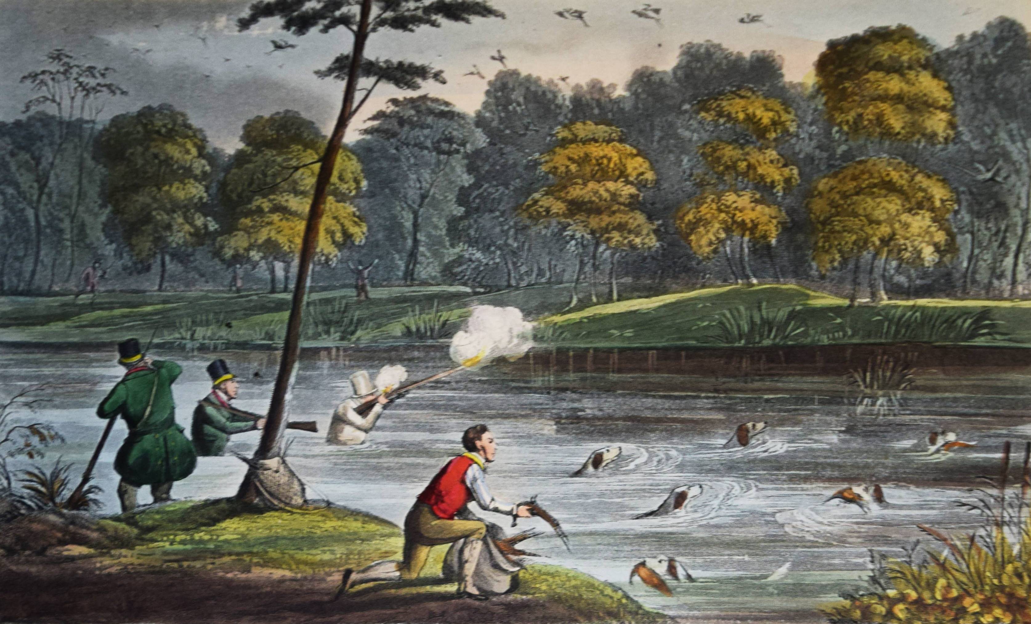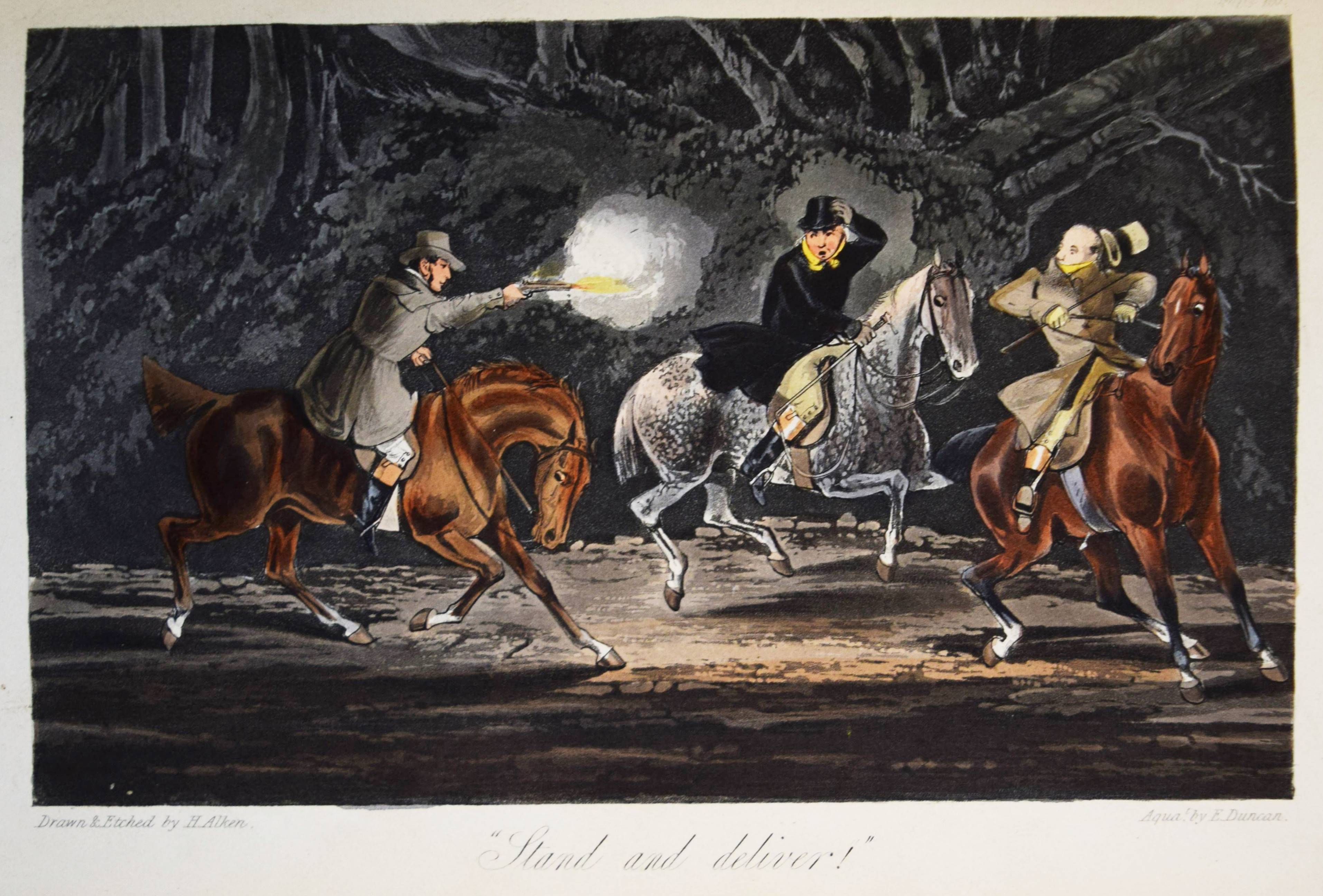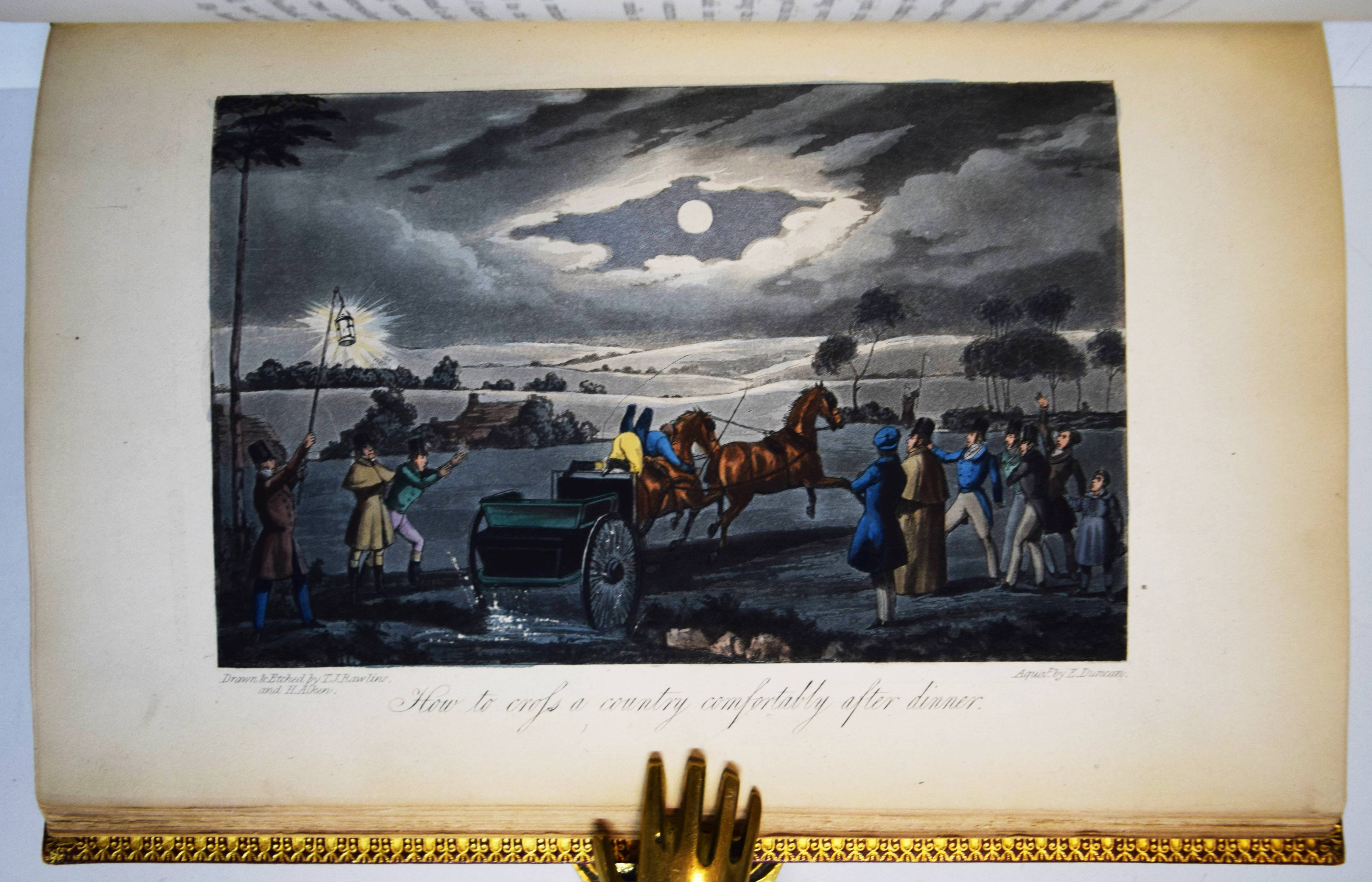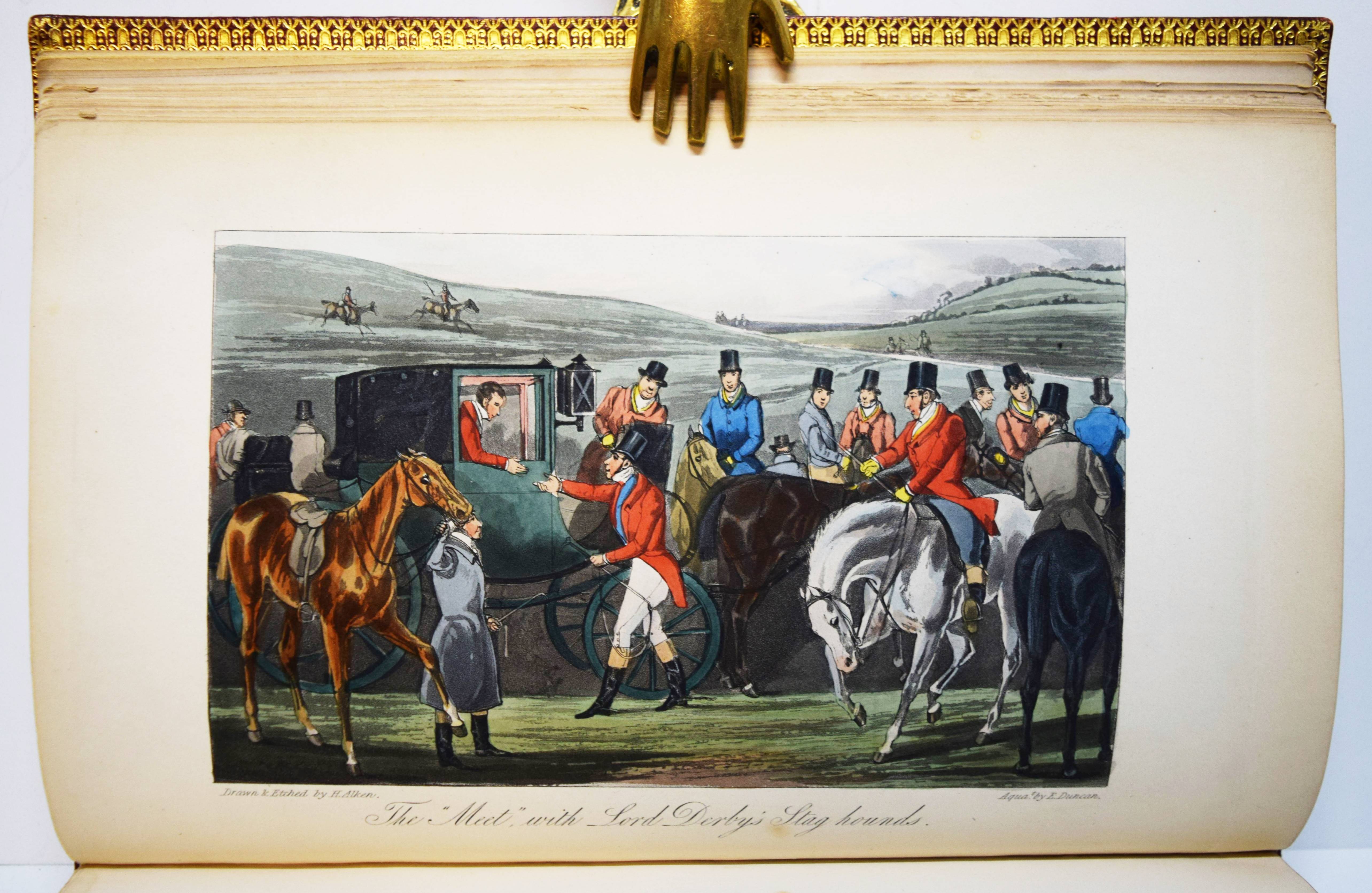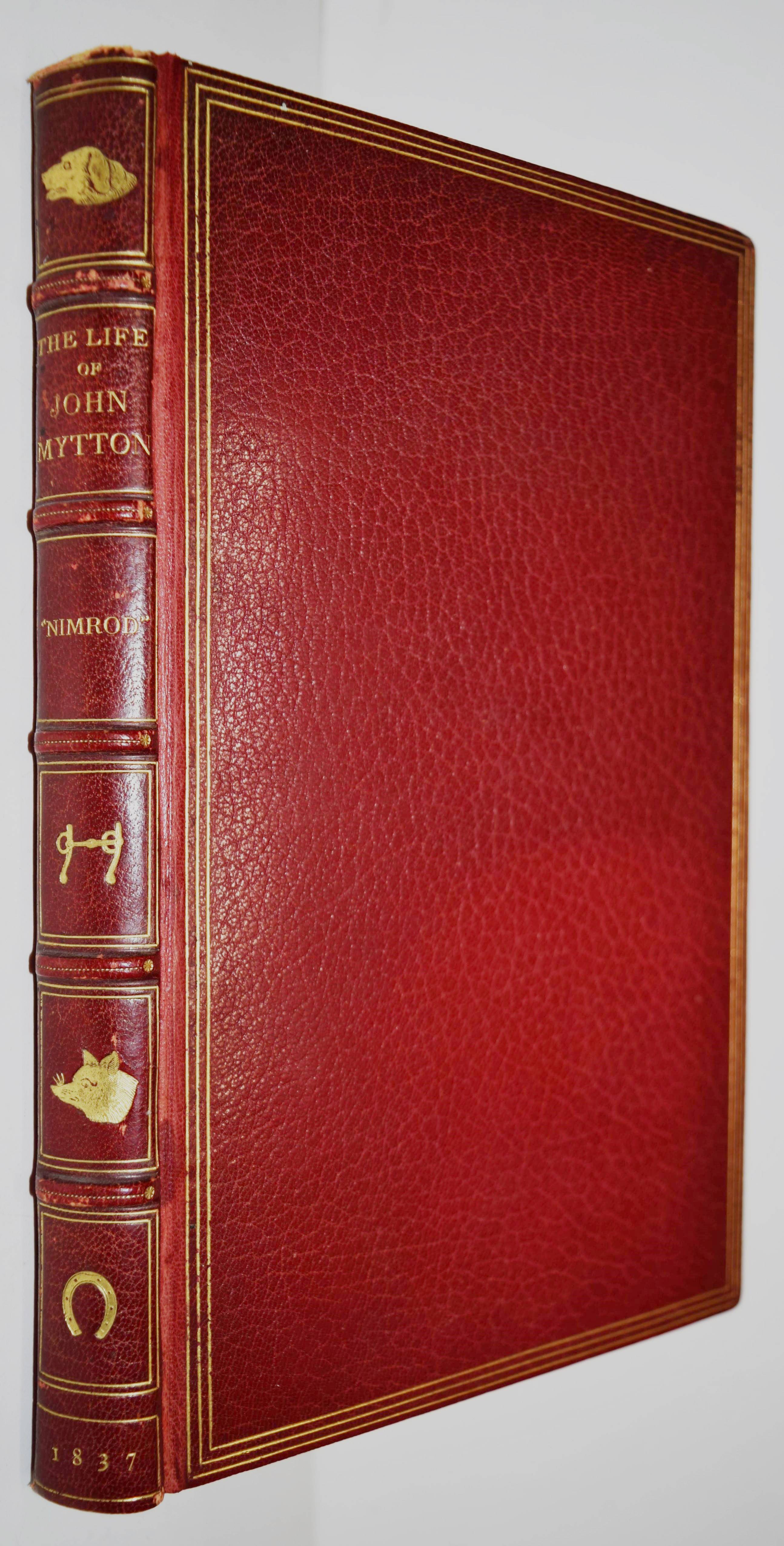 Nimrod (d. i. Charles James Apperley). The life of John Mytton, Esq., of Halston, Shropshire … With notices of his hunting, racing, shooting, driving, and extravagant exploits. Second edition, reprinted with considerable additions from the New Sporting Magazine. London, Rudolph Ackermann 1837. Gr.-8° (24 x 15,5 cm.). IX, (1), 206 S., [1] Bl. mit 18 handkolorierten Aquatinta-Radierungen nach H(enry) Alken und T(homas) J. Rawlins. Weinroter genarbter Maroquin-Lederband der Zeit mit 5 Zierbünden, goldgepr. Rückentitel, figürlicher Rückenvergoldung, dreifachen Deckel-Filetten, Innenkantenvergoldung und Goldschnitt (Orig.-Leinenbezug mit goldgepr. Deckelillustration beigebunden). Abbey, Life 385. Tooley 68. Schwerdt I, 38 f. – Zweite Auflage des zuerst 1835 erschienenen Werks, gegenüber dieser um 6 Tafeln vermehrt. Die schönen Tafeln in prächtigem leuchtenden Kolorit zeigen überwiegend Jagd- und Reitszenen. – „A most valuable and important book for the sporting life of a period, aptly described by Newton as ‚a biography of a real man that reads like a work of fiction“‘ (R. V. Tooley). – Kapital geringfügig berieben, Exlibris, sehr schönes Exemplar in einem prachtvollen Handeinband.