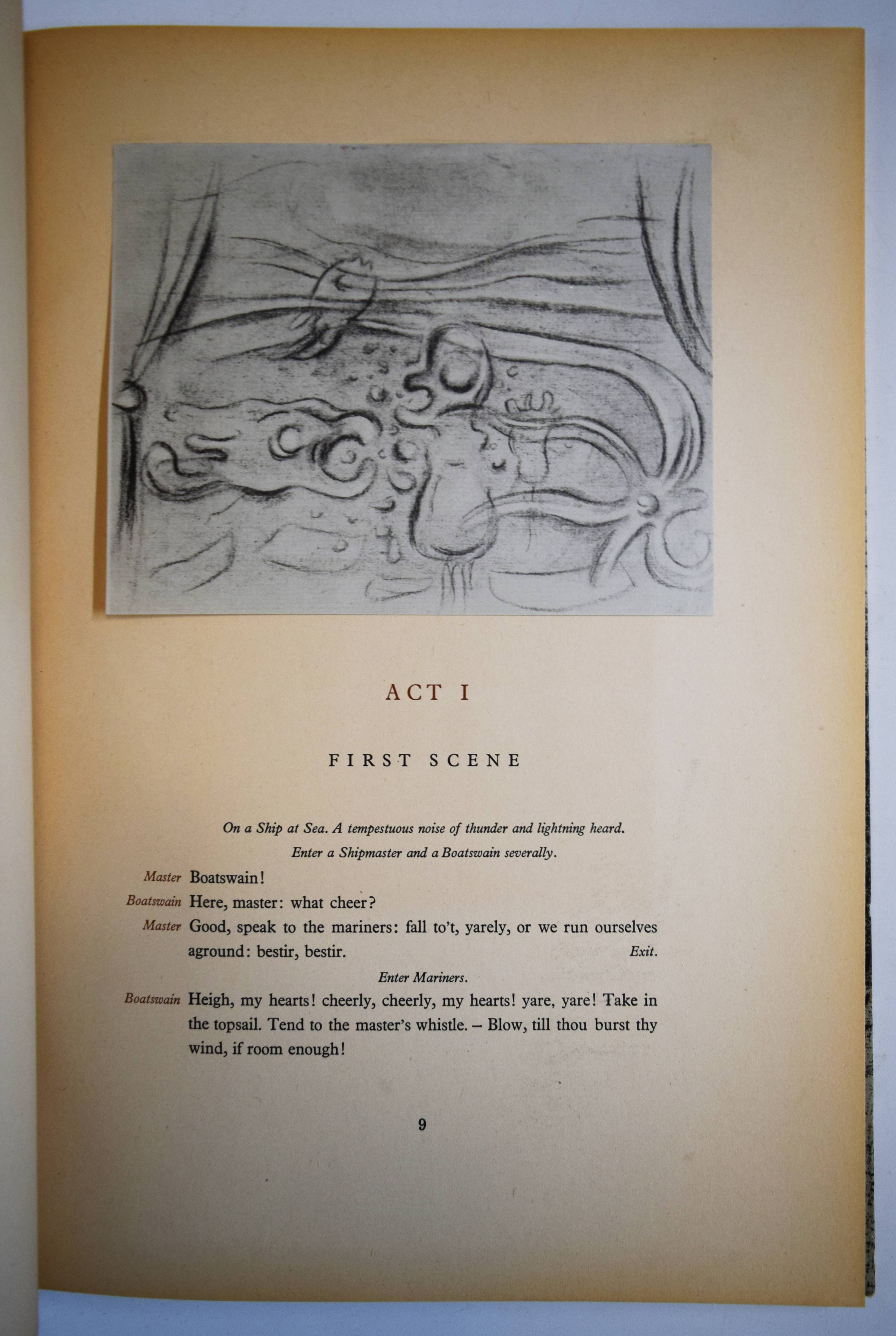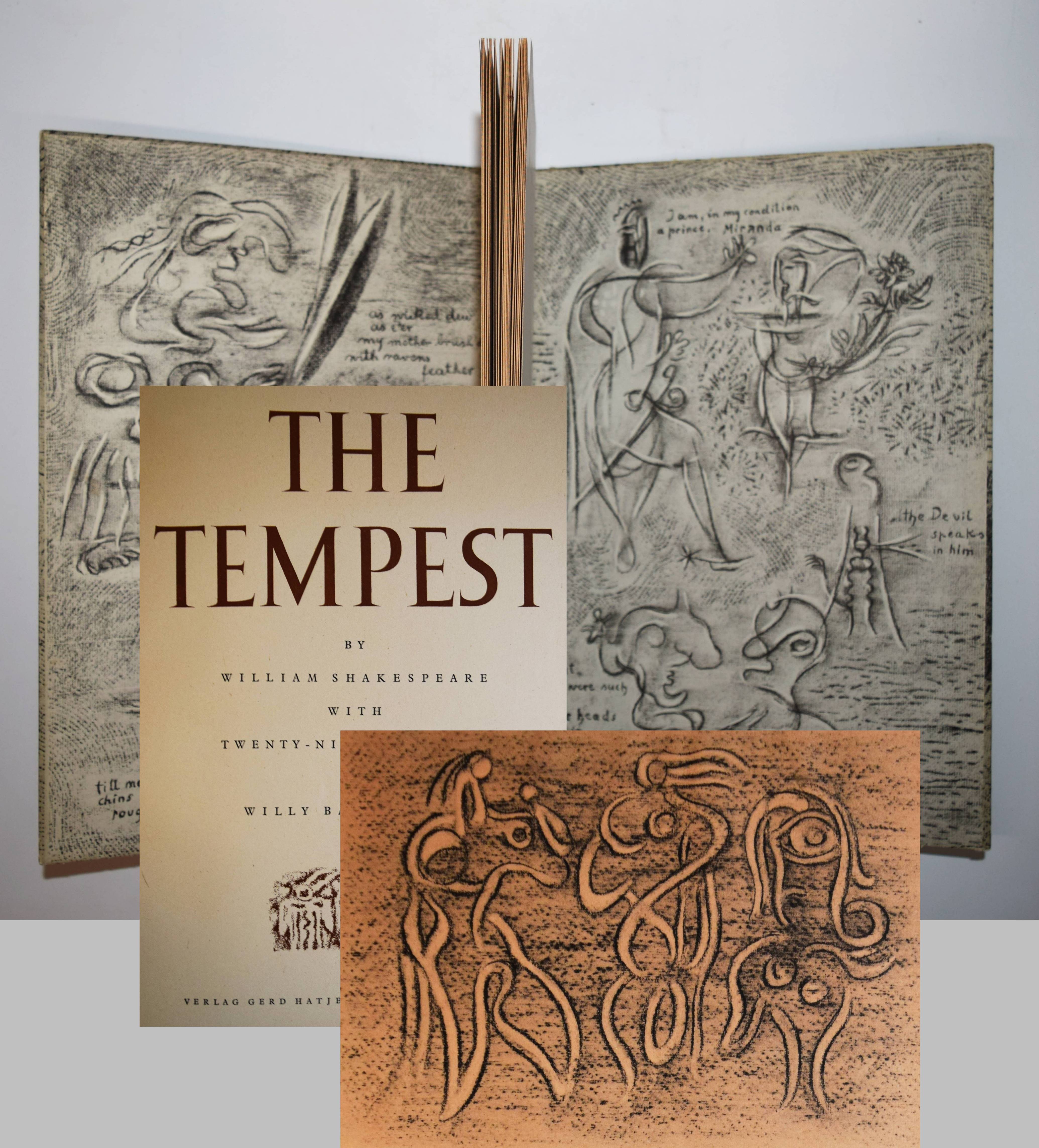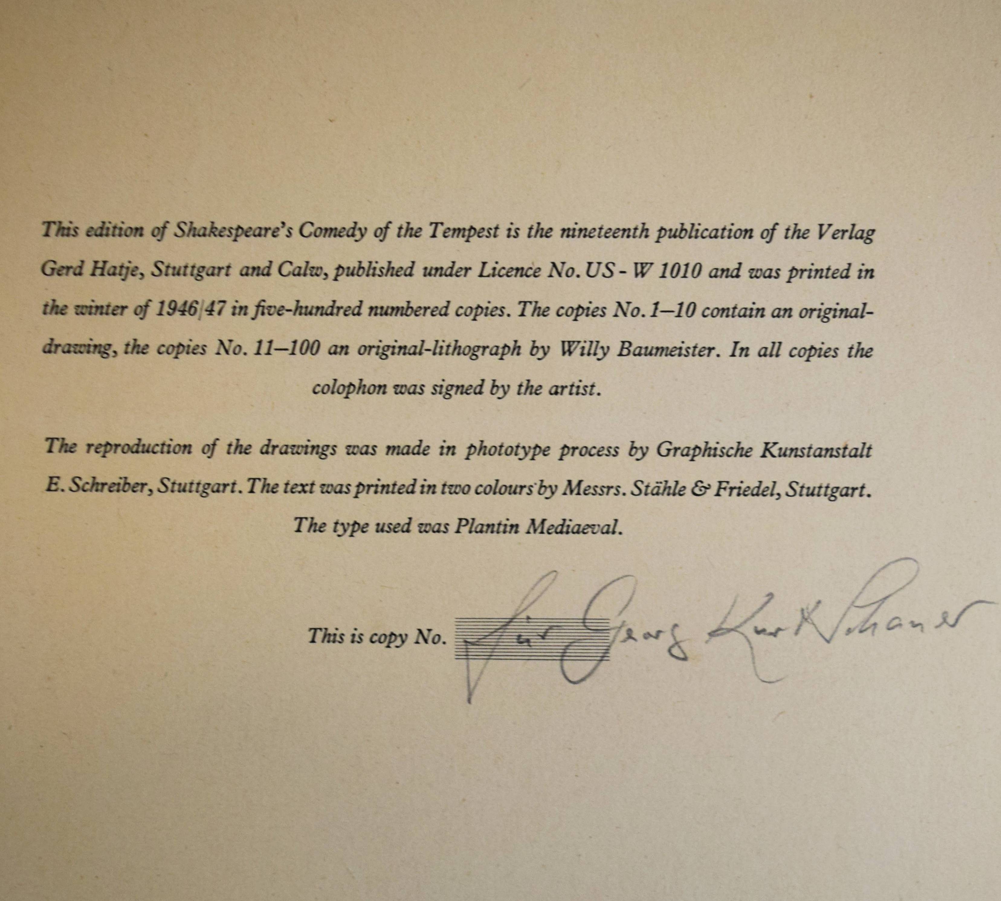 Shakespeare, William. The Tempest. With twenty-nine drawings by Willy Baumeister. Stuttgart, Calw, Gerd Hatje (1946 / 1947). Folio (40 x 28,5 cm.). 85 S., [1] Bl. mit 29 montierten farbigen Abbildungen. Illustr. Orig.-Halbleinenband. Eines von 500 Exemplaren, hier ohne Exemplarnummer und Signatur des Künstlers, aber mit eigenhändiger Zueignung Baumeisters „für Georg Kurt Schauer“. Provenienz: Christian Scheffler, ehemaliger Leiter des Klingspor-Museums, Offenbach, der dieses Buch aus dem Nachlass Schauers erhielt. – „Im März 1946 wurde B. an die Staatliche Akademie der Bildenden Künste Stuttgart berufen. Neben der Professur und zahlreichen Ausstellungen im In- und Ausland (u. a. bei der Biennale in Venedig) entwarf B. auch wieder erfolgreich Bühnenbilder, u. a. für die Stuttgarter Aufführung des Balletts „Liebeszauber“ von Manuel de Falla in Stuttgart (1947), womit er auf dem Cover des Nachrichtenmagazins „Der Spiegel“ abgebildet war“ (C. Mohringer in Frankfurter Personenlexikon). – Der Frankfurter Buchhändler, Verleger, Typograph und Buchhistoriker G. K. Schauer (1899-1984) war zusammen mit Hanns W. Eppelsheimer Gründer der Deutschen Bibliothek in Frankfurt am Main und arbeitete auch beim Aufbau der Frankfurter Zweigstelle des Suhrkamp-Verlags mit, ehe dieser von Berlin nach Frankfurt übersiedelte und sich 1950 vom S. Fischer Verlag abspaltete. – Kanten teils restauriert, gutes sauberes Exemplar mit besonderer Provenienz.