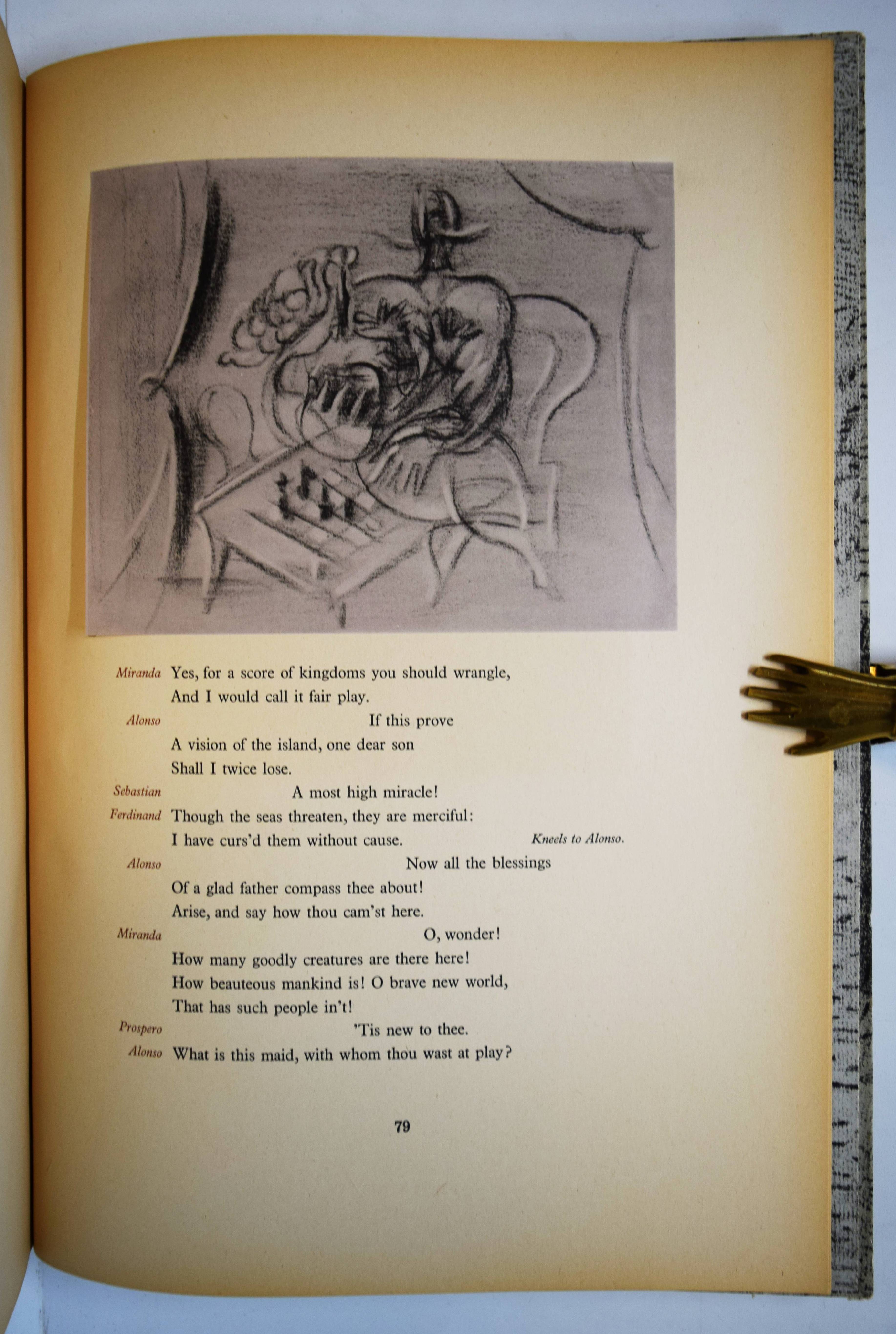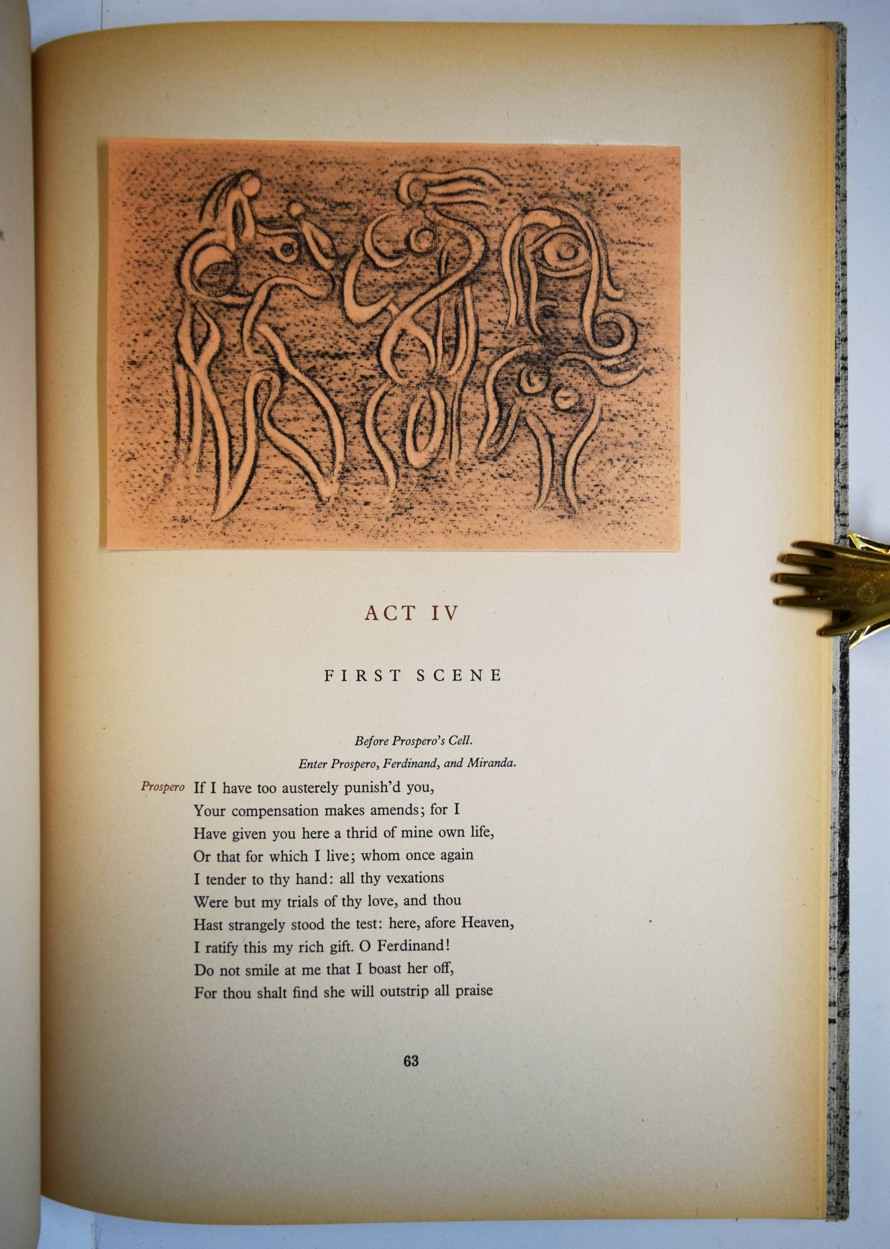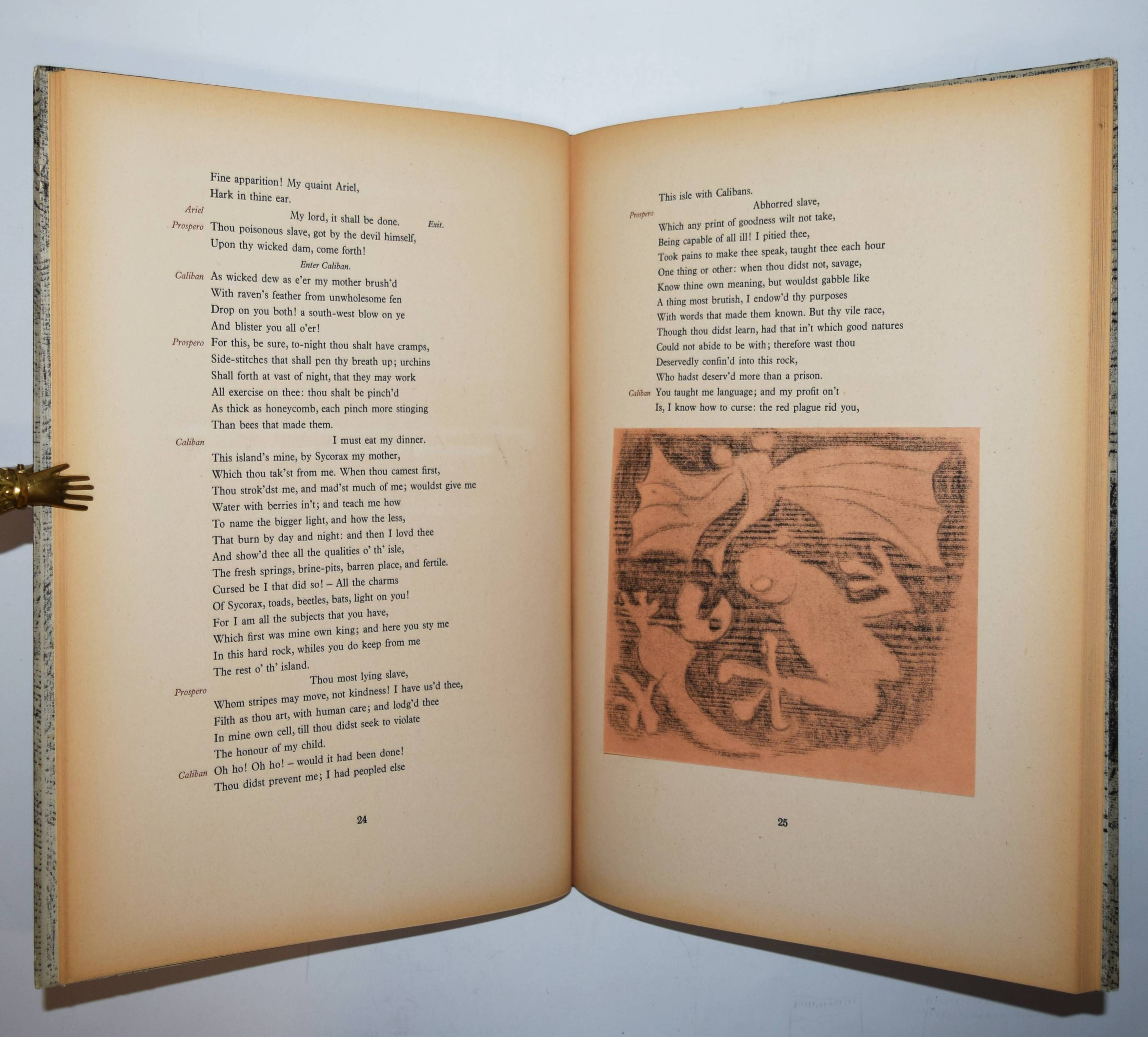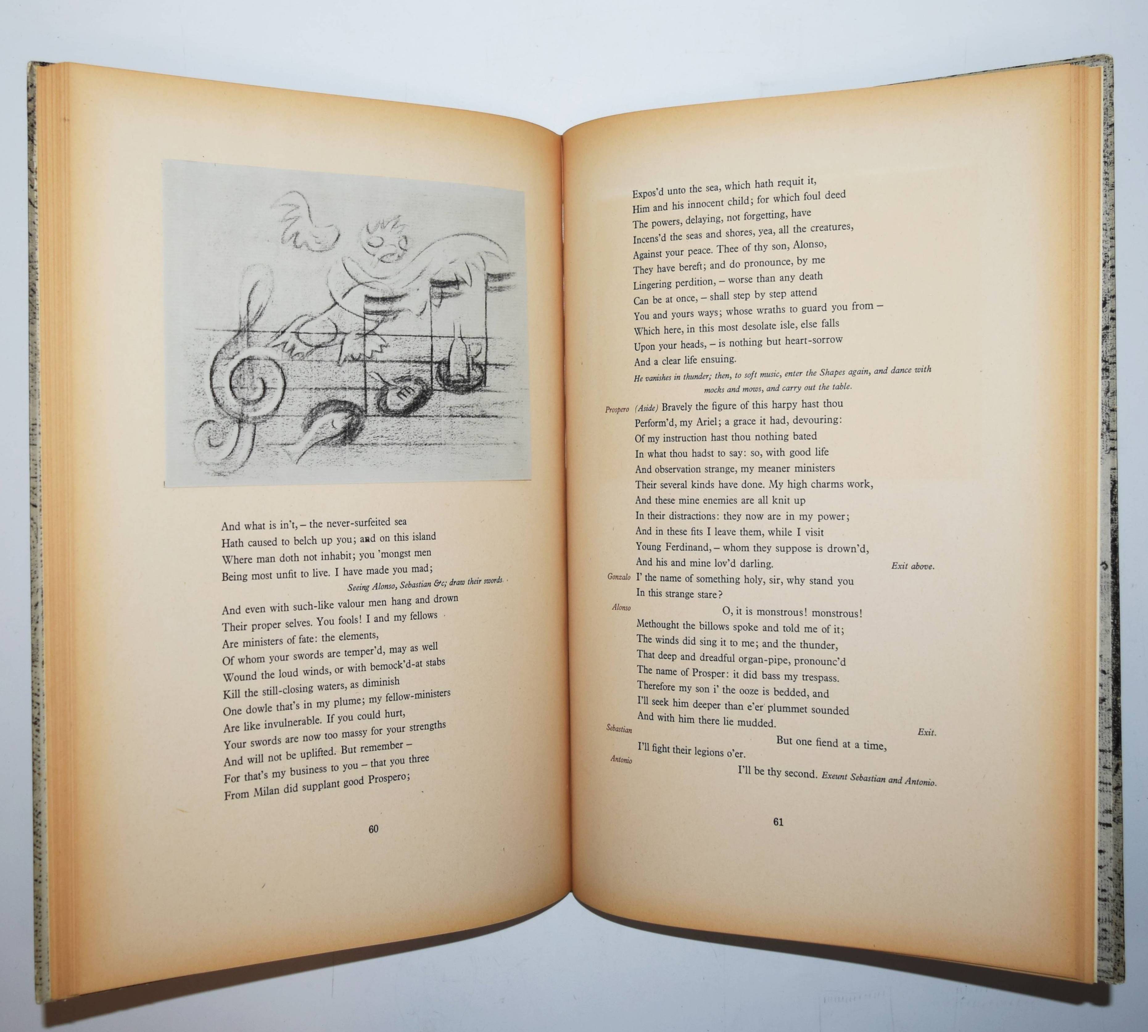 Shakespeare, William. The Tempest. With twenty-nine drawings by Willy Baumeister. Stuttgart, Calw, Gerd Hatje (1946 / 1947). Folio (40 x 28,5 cm.). 85 S., [1] Bl. mit 29 montierten farbigen Abbildungen. Illustr. Orig.-Halbleinenband. Eines von 500 Exemplaren, hier ohne Exemplarnummer und Signatur des Künstlers, aber mit eigenhändiger Zueignung Baumeisters „für Georg Kurt Schauer“. Provenienz: Christian Scheffler, ehemaliger Leiter des Klingspor-Museums, Offenbach, der dieses Buch aus dem Nachlass Schauers erhielt. – „Im März 1946 wurde B. an die Staatliche Akademie der Bildenden Künste Stuttgart berufen. Neben der Professur und zahlreichen Ausstellungen im In- und Ausland (u. a. bei der Biennale in Venedig) entwarf B. auch wieder erfolgreich Bühnenbilder, u. a. für die Stuttgarter Aufführung des Balletts „Liebeszauber“ von Manuel de Falla in Stuttgart (1947), womit er auf dem Cover des Nachrichtenmagazins „Der Spiegel“ abgebildet war“ (C. Mohringer in Frankfurter Personenlexikon). – Der Frankfurter Buchhändler, Verleger, Typograph und Buchhistoriker G. K. Schauer (1899-1984) war zusammen mit Hanns W. Eppelsheimer Gründer der Deutschen Bibliothek in Frankfurt am Main und arbeitete auch beim Aufbau der Frankfurter Zweigstelle des Suhrkamp-Verlags mit, ehe dieser von Berlin nach Frankfurt übersiedelte und sich 1950 vom S. Fischer Verlag abspaltete. – Kanten teils restauriert, gutes sauberes Exemplar mit besonderer Provenienz.