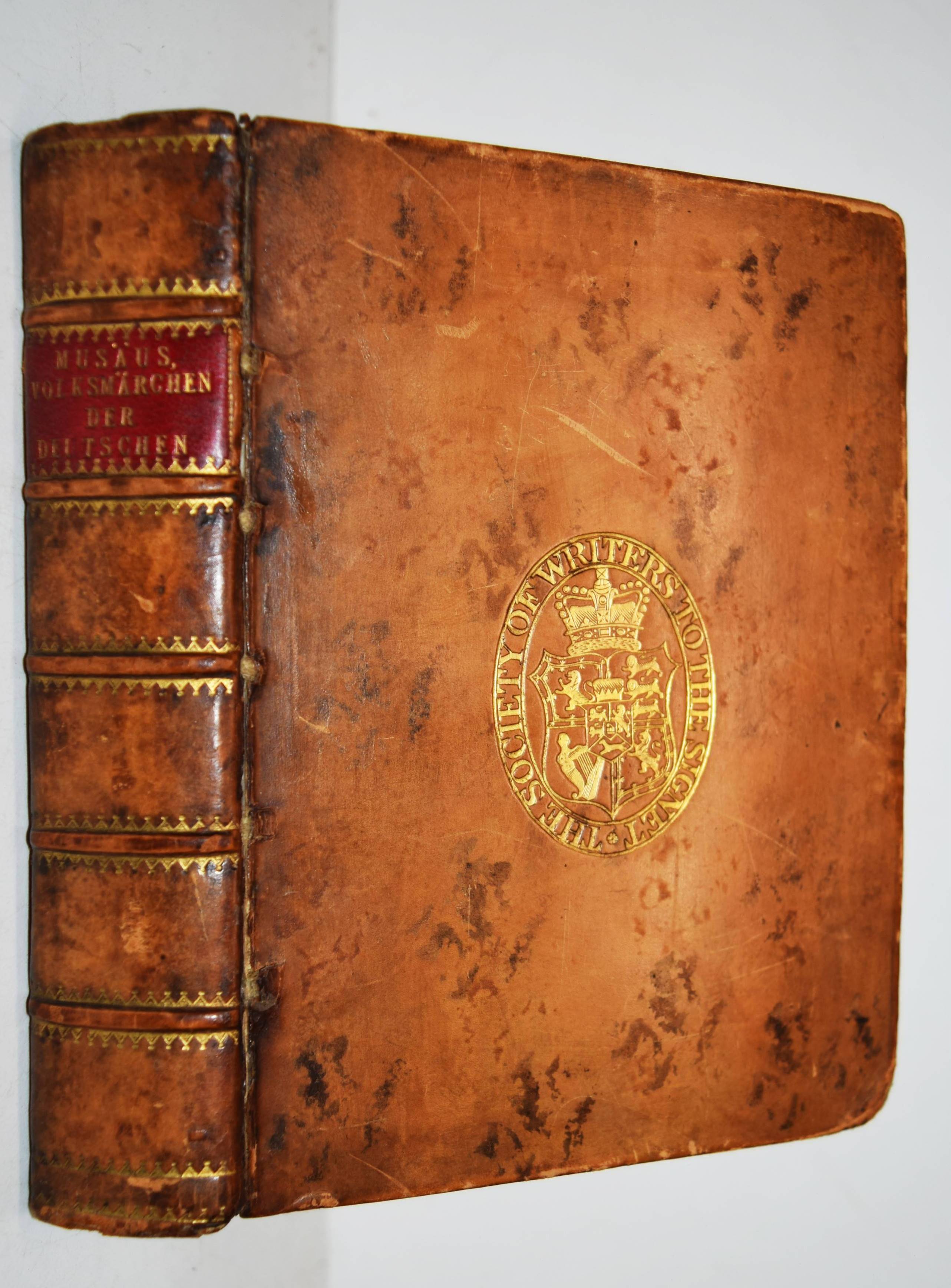 Musäus, J(ohann) (Karl) A(ugust). Volksmährchen der Deutschen. Mit einem Vorwort von Friedrich Jacobs. Neue Auflage. 5 Teile in 1 Band. Gotha, Ettingersche Buchhandlung 1838. Kl.-8° (14,5 x 11,5 cm.). Mit 5 gestoch. Titelvignetten. Kalbslederband der Zeit mit goldgepr. Rückenschild, Rückenvergoldung und goldgepr. Supralibros „The Society of Writers to the Signet“. Goedeke IV 1, 580, 5. LKJ II, 523 ff. – Dritte Auflage der zuerst 1782 bis 1786 erschienenen Kunstmärchen. Jeder Band mit gestoch. Titelblatt mit reizvollen Vignetten. – „M. hat in seiner Sammlung Märchen, Sagen der Geschichte und Lokalsagen, Legenden, Wunder- und Spukgeschichten nebeneinander gestellt und ihre Motive unbedenklich verknüpft. Er gewann die Stoffe aus mündlicher Überlieferung, aus alten Chroniken, altdeutschen Mythen und zeitgenössischen, vor allem aus Frankreich kommenden Feenmärchen und Sagen“ (M. Dierks in LKJ). – Gelenke etwas angeplatzt, Deckel und Kanten geringfügig berieben, gutes sauberes und dekorativ gebundenes Exemplar aus der Bibliothek der schottischen Juristen-Vereinigung The Society of Writers to His Majesty’s Signet (gegründet 1594 in Edinburgh).