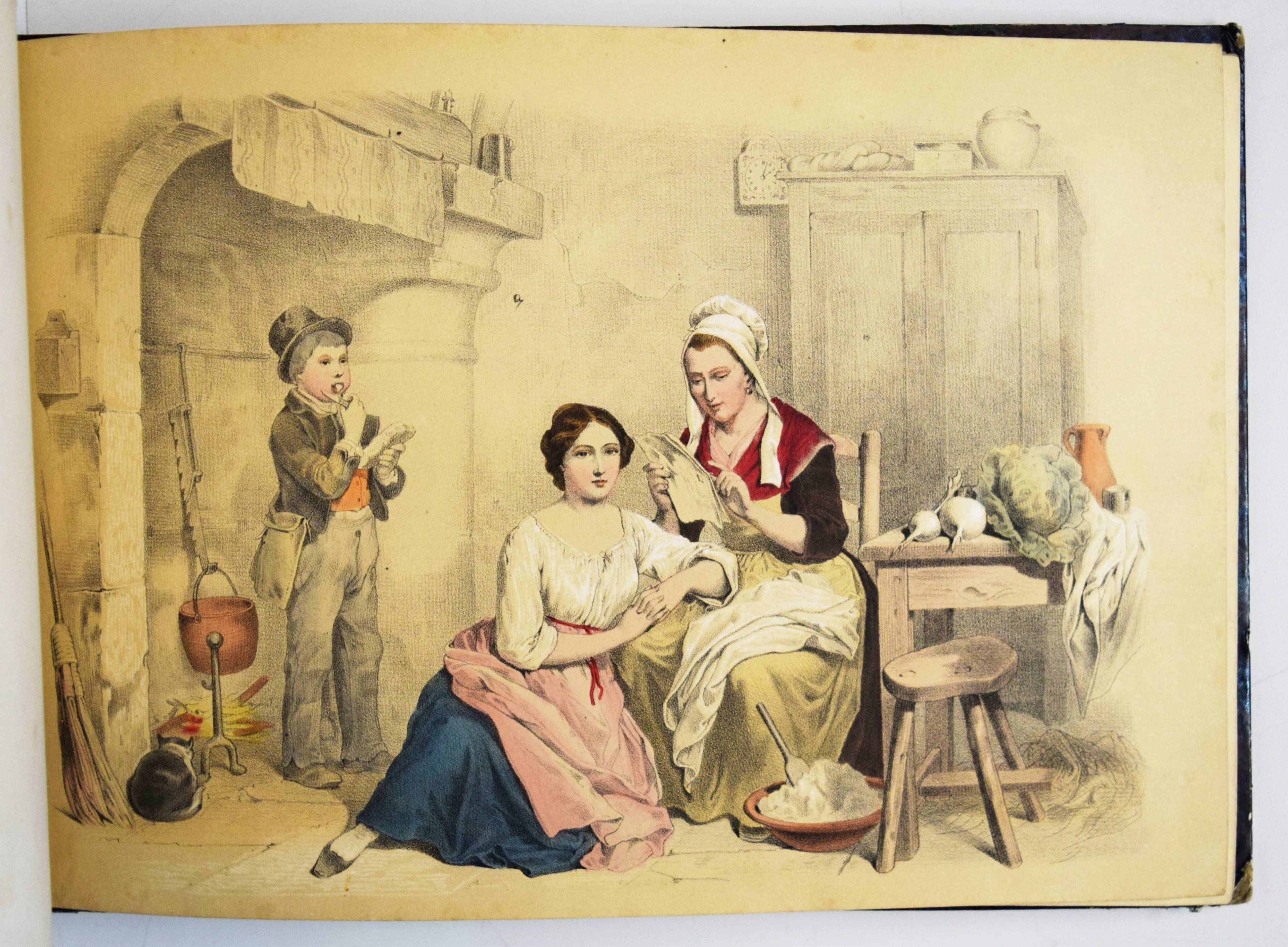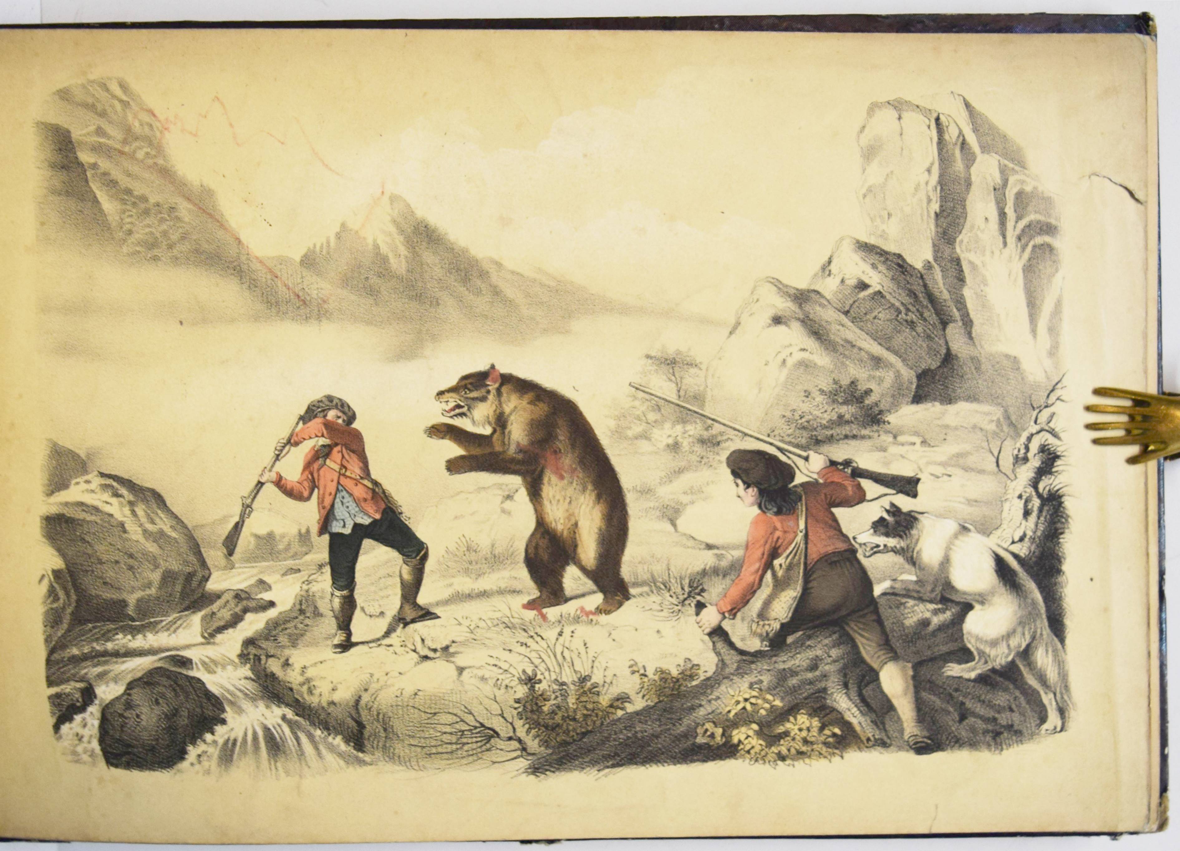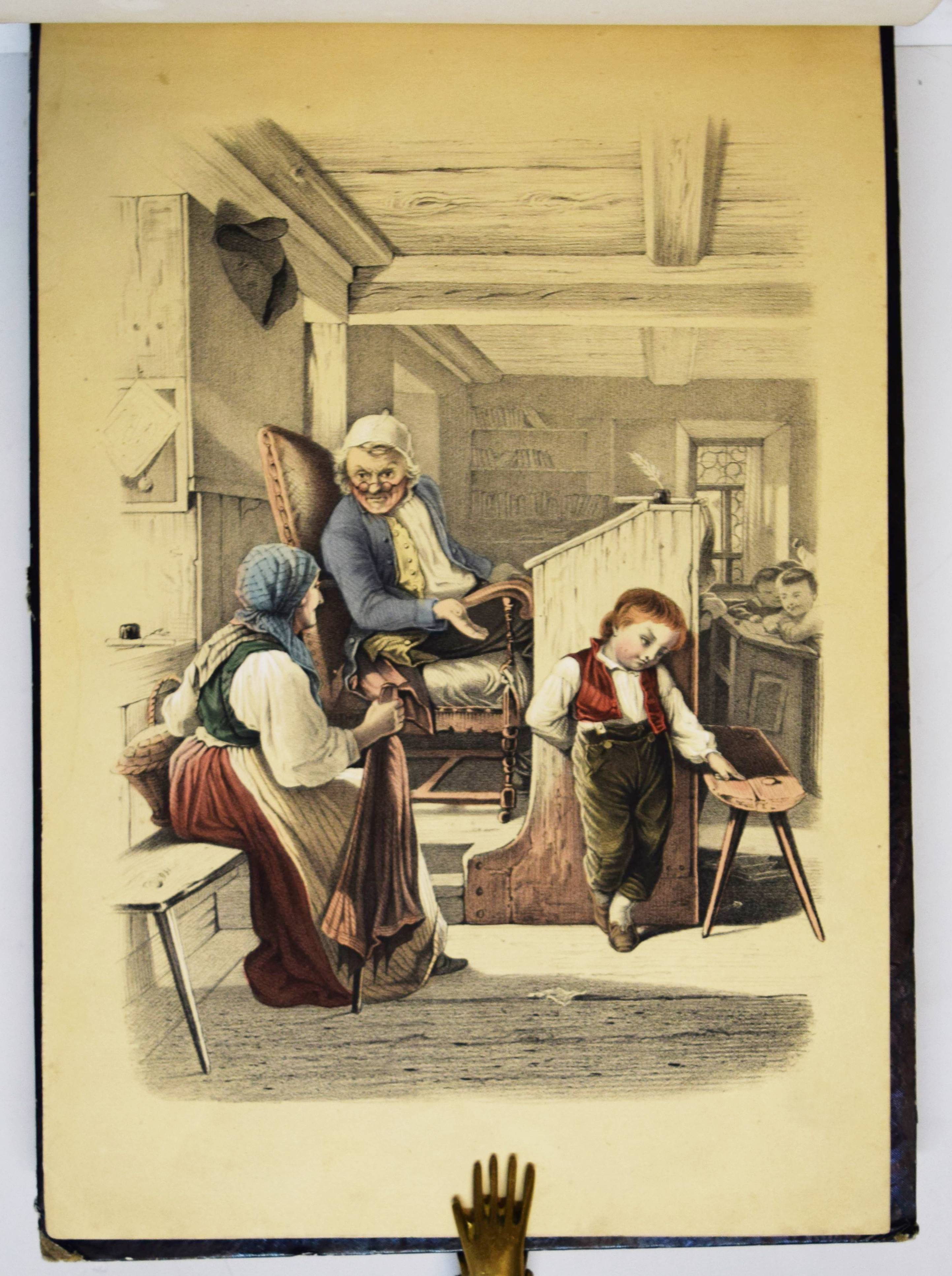 Album (Deckeltitel). Ohne Ort, Druck und Jahr (Mulhouse, Engelmann um 1860). Quer-4° (22 x 32 cm.). 20 handkol. lithogr. Tafeln. Orig.-Pappband mit goldgepr. Deckeltitel und Deckelvergoldung. Bilder-Album ohne Text mit 20 Genre- und Kinderszenen: Bärenjagd, raufende Jungen, kleiner Junge welcher einen schlafenden Wanderer bestehlen will, drei Schiffbrüchige, Kückenszene, Marktszene, Schulszene, Großmutter mit ABC-Buch etc. – Mit einem Etikett der Elsässer Lithographie-Anstalt Engelmann Père & Fils. Der Zeichner und Lithograph Godefroy Engelmann (1788-1839) erhielt am 31. August 1837 zusammen mit seinem Sohn Jean ein zehnjähriges Patent für „ein neues lithografisches Farbdruckverfahren“, das sie „lithocolore impression“ und bald darauf „chromolithographie“ nannten. – Rücken mit Fehlstellen, Kanten berieben, vorderes Innengelenk angeplatzt und unsachgemäss geklebt, sonst gut erhalten.
