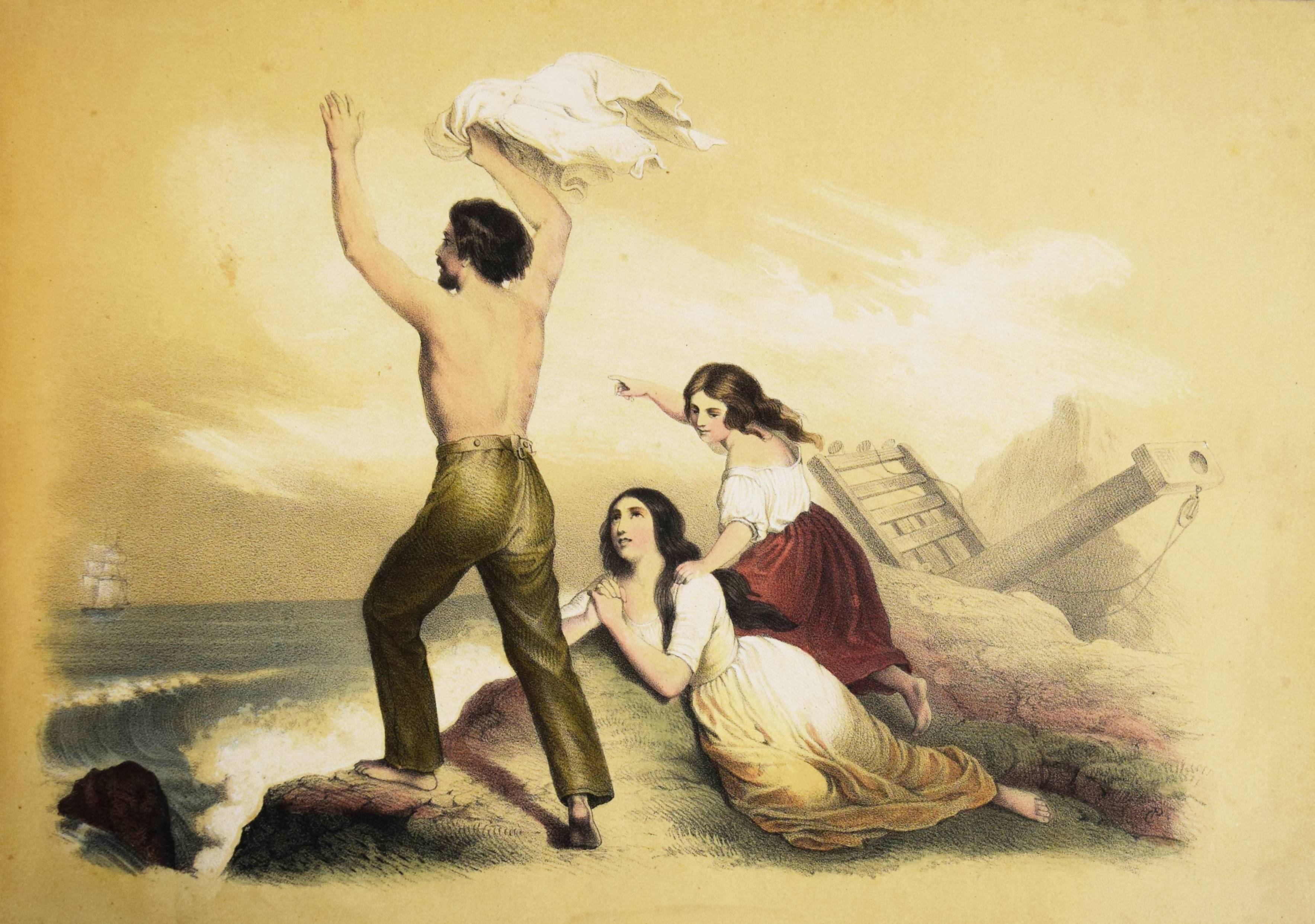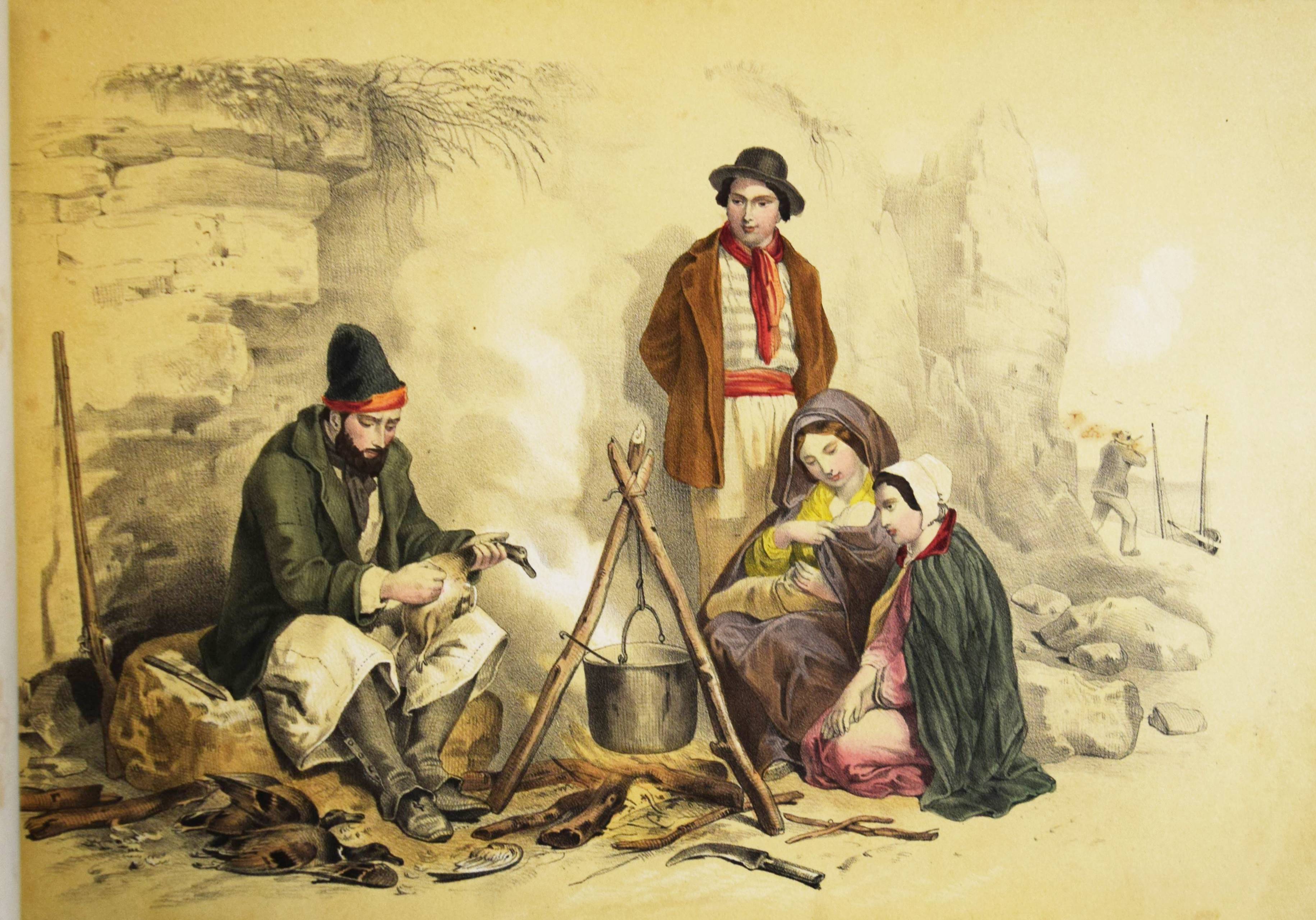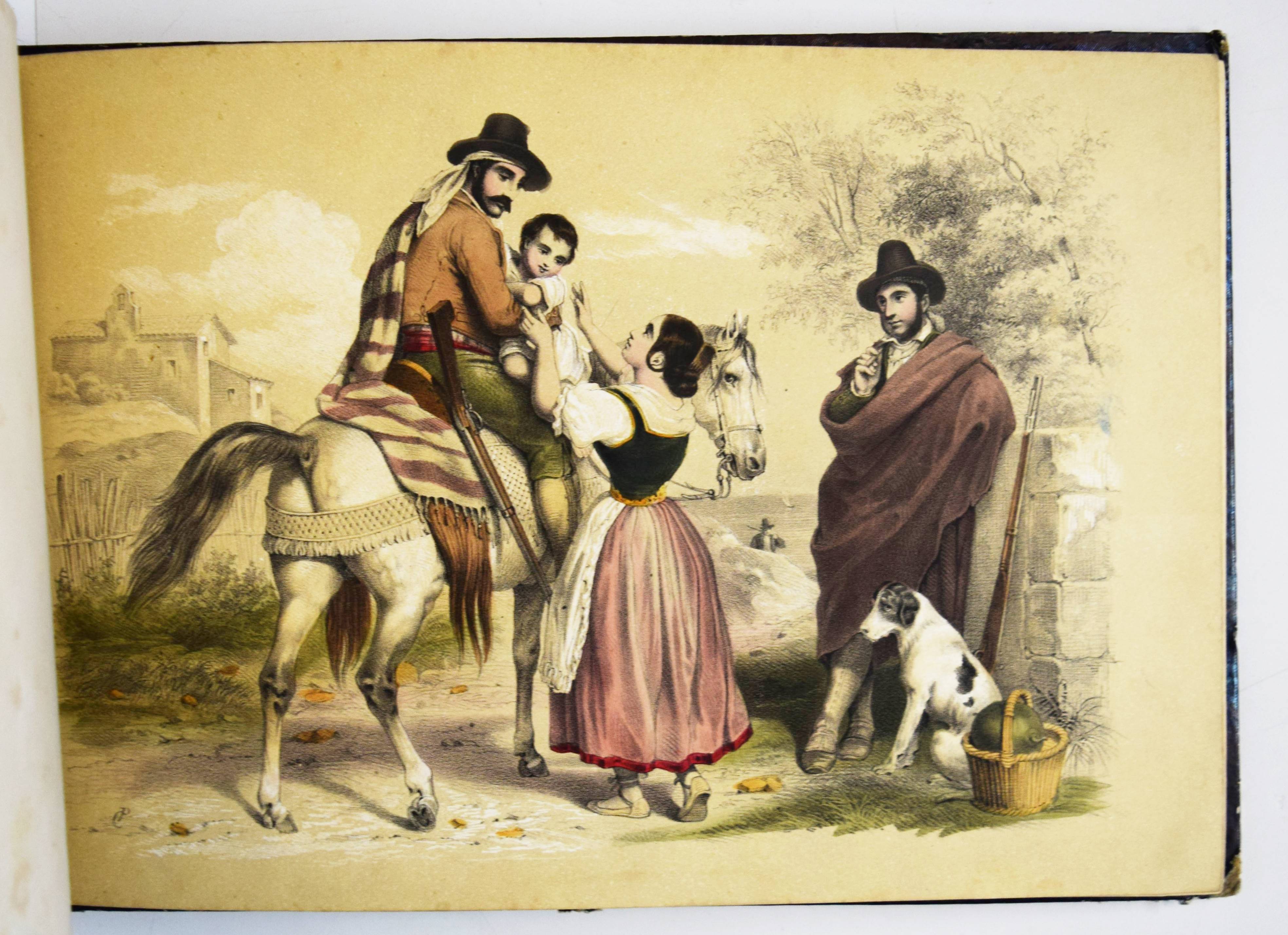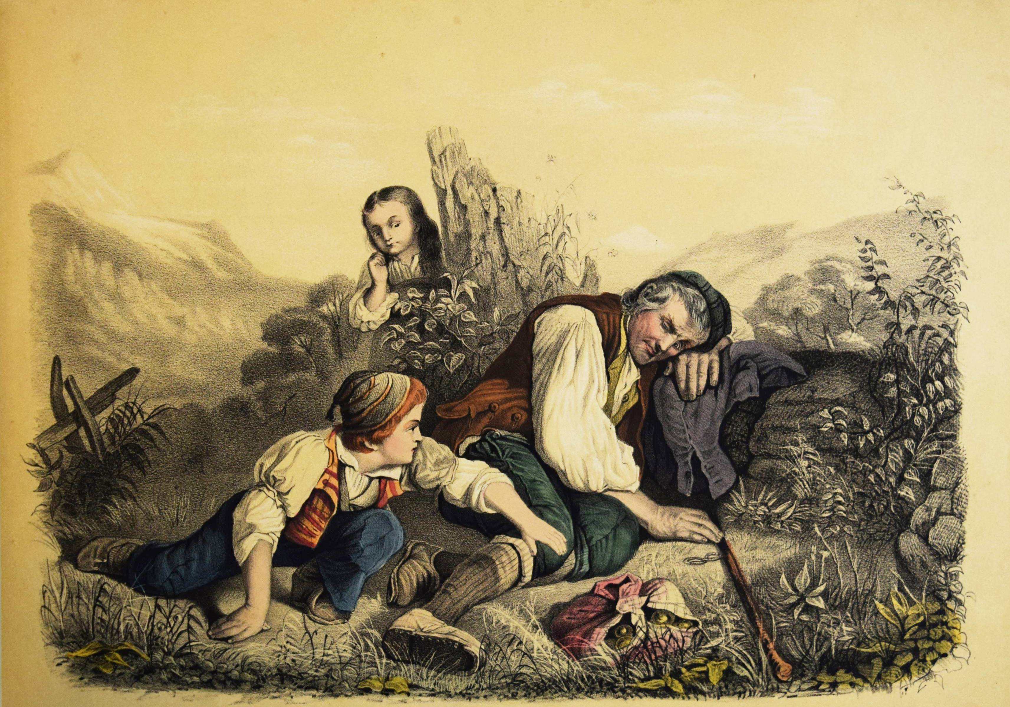 Album (Deckeltitel). Ohne Ort, Druck und Jahr (Mulhouse, Engelmann um 1860). Quer-4° (22 x 32 cm.). 20 handkol. lithogr. Tafeln. Orig.-Pappband mit goldgepr. Deckeltitel und Deckelvergoldung. Bilder-Album ohne Text mit 20 Genre- und Kinderszenen: Bärenjagd, raufende Jungen, kleiner Junge welcher einen schlafenden Wanderer bestehlen will, drei Schiffbrüchige, Kückenszene, Marktszene, Schulszene, Großmutter mit ABC-Buch etc. – Mit einem Etikett der Elsässer Lithographie-Anstalt Engelmann Père & Fils. Der Zeichner und Lithograph Godefroy Engelmann (1788-1839) erhielt am 31. August 1837 zusammen mit seinem Sohn Jean ein zehnjähriges Patent für „ein neues lithografisches Farbdruckverfahren“, das sie „lithocolore impression“ und bald darauf „chromolithographie“ nannten. – Rücken mit Fehlstellen, Kanten berieben, vorderes Innengelenk angeplatzt und unsachgemäss geklebt, sonst gut erhalten.