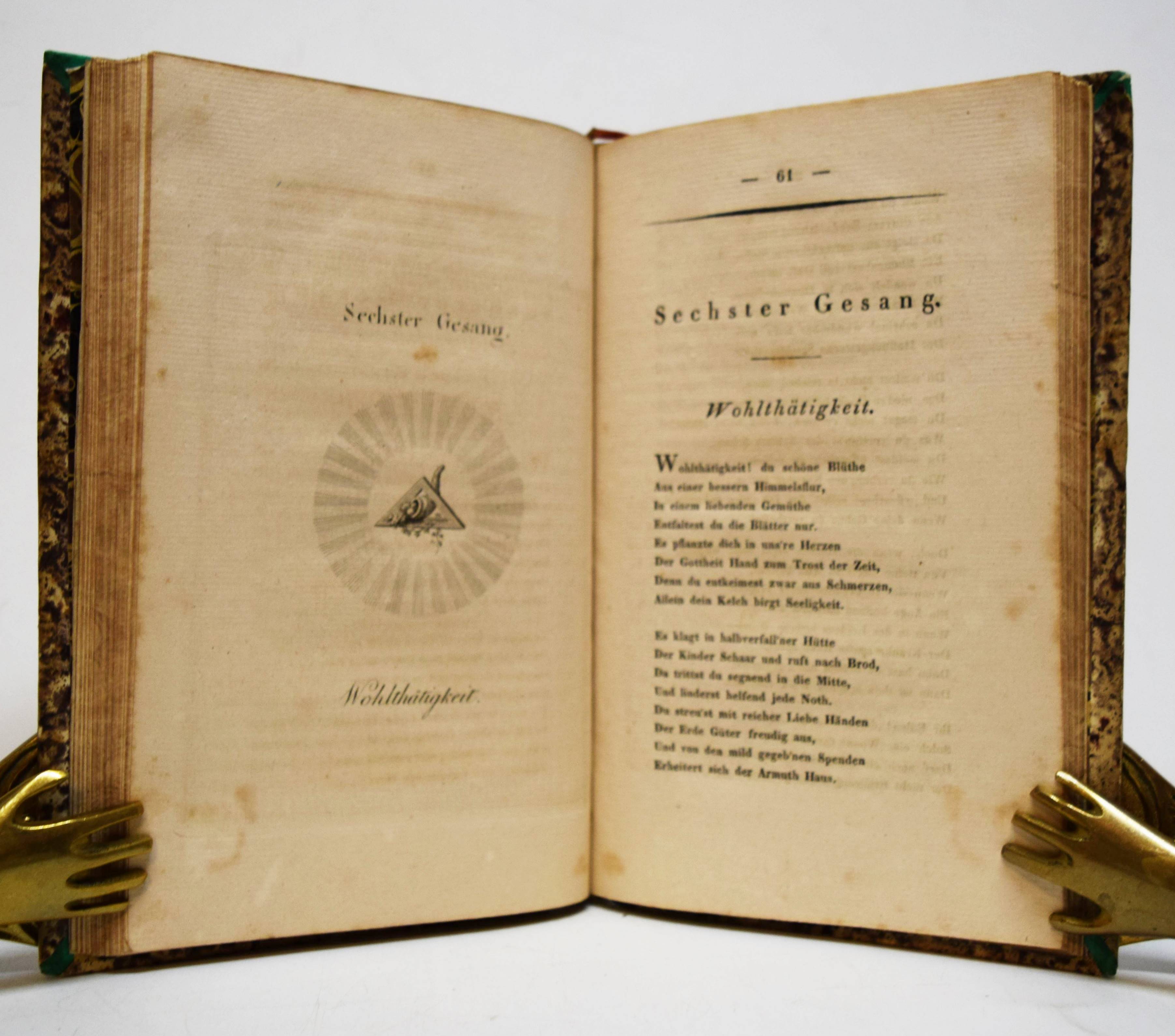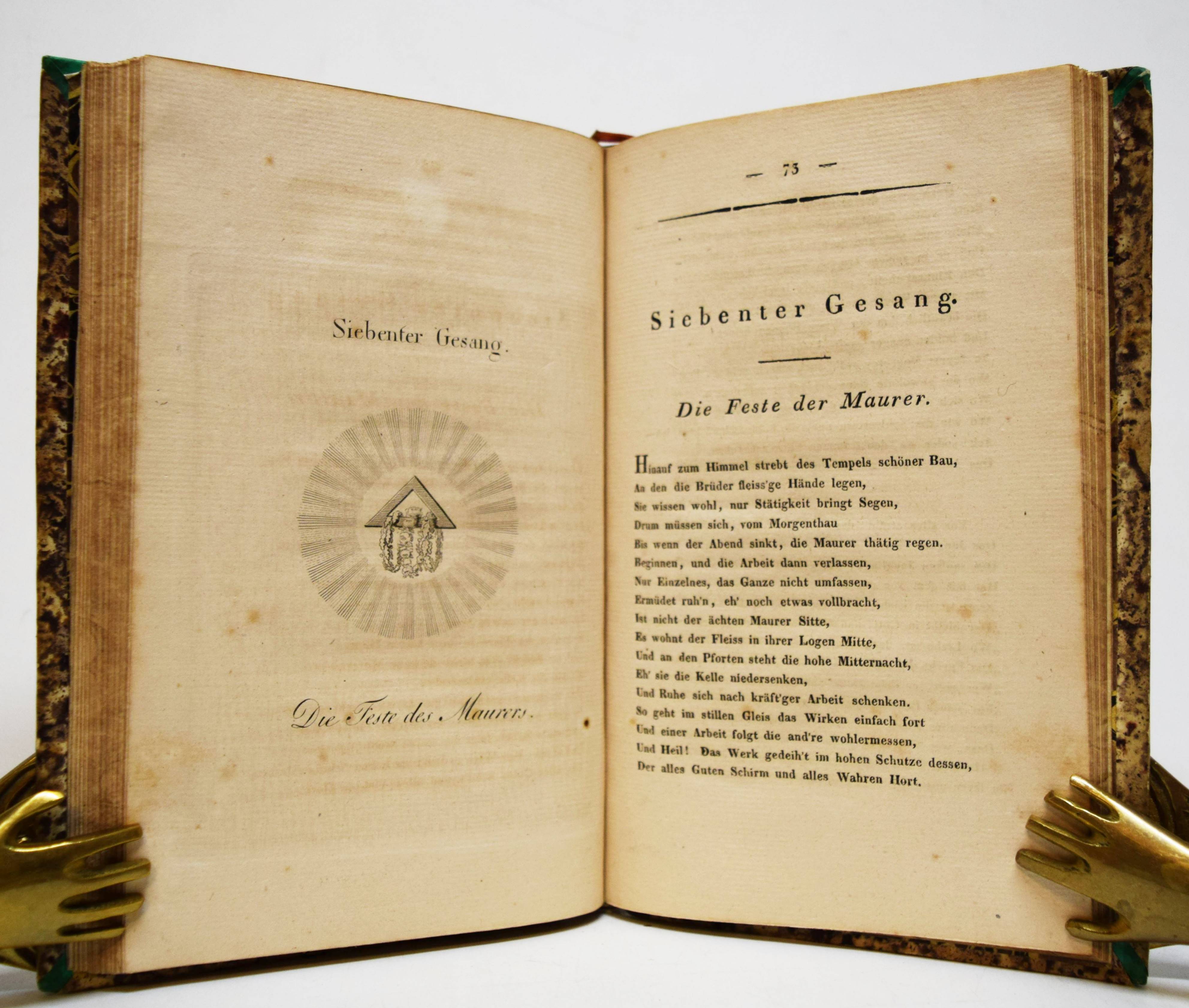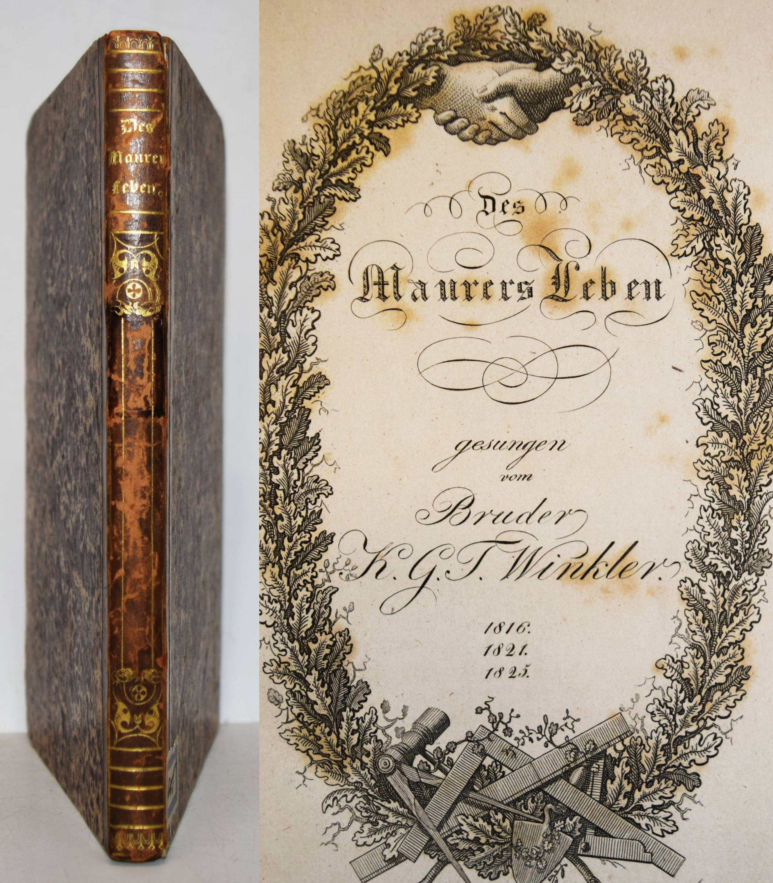 Winkler, K(arl) G(ottlieb) Th(eodor), (d. i. Theodor Hell). Des Maurers Leben. Dargestellt in 9 Gesängen. 3. Aufl. Dresden, Arnold 1825. 8°. XVI, 110 S. mit gestoch. Frontispiz und 9 gestoch. illustr. Zwischentiteln. Halblederband der Zeit mit goldgepr. Rückentitel und Rückenvergoldung. ADB XI, 693 f. Wolfstieg 26704. – Erschien zuerst 1816. – Gesänge über Religion, Vaterlandsliebe, Bruderliebe, die Liebe zu den Schwestern, die Hallen, die Weihe, den Maurer in der Fremde etc. – Der Dramatiker und Dichter T. Hell (1775-1856) war sächsischer Hofrat, Opern-Regisseur und Theater-Intendant in Dresden. – Einband etwas berieben, Exlibris, durchgehend braunfleckig, gutes Exemplar.