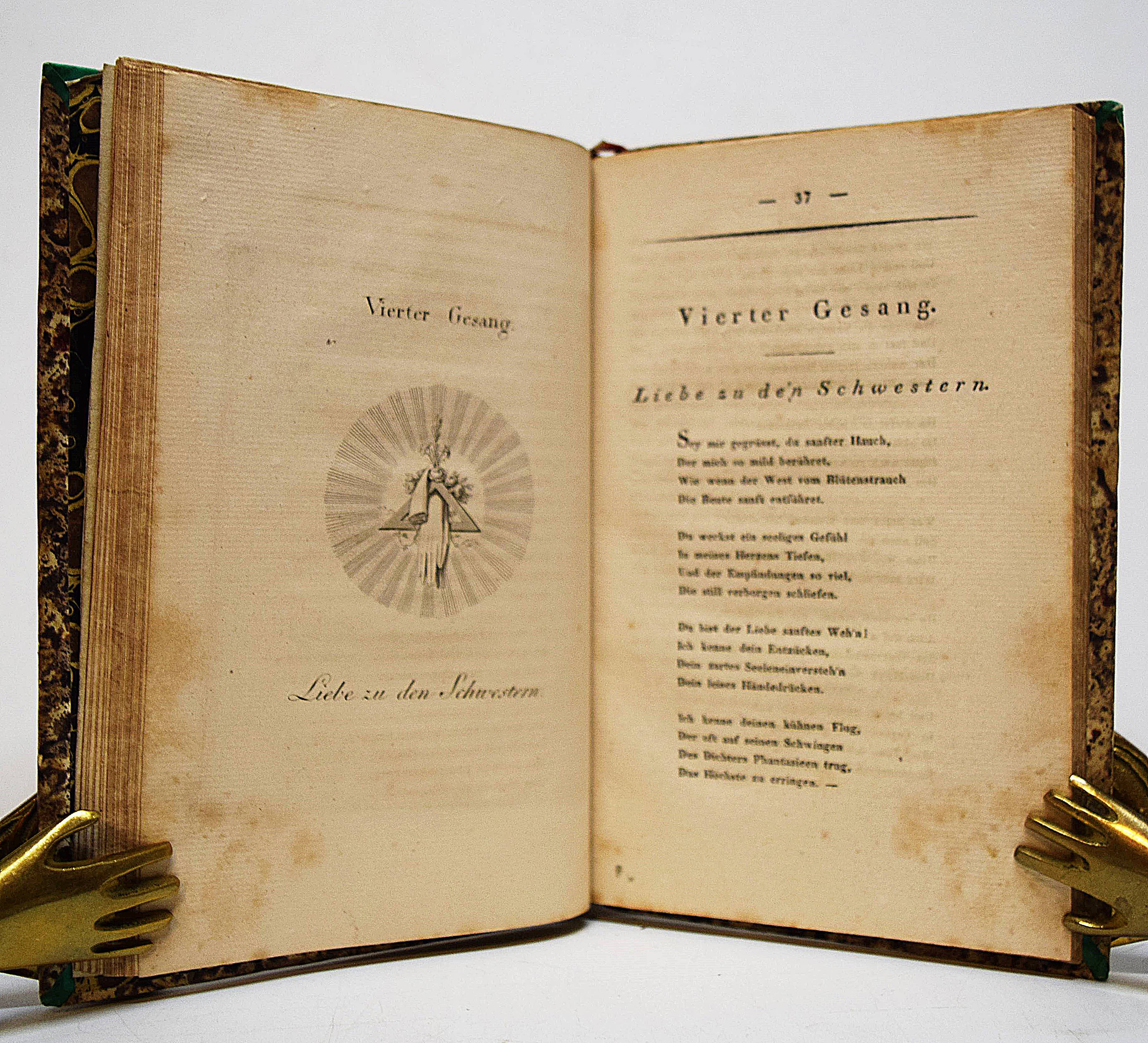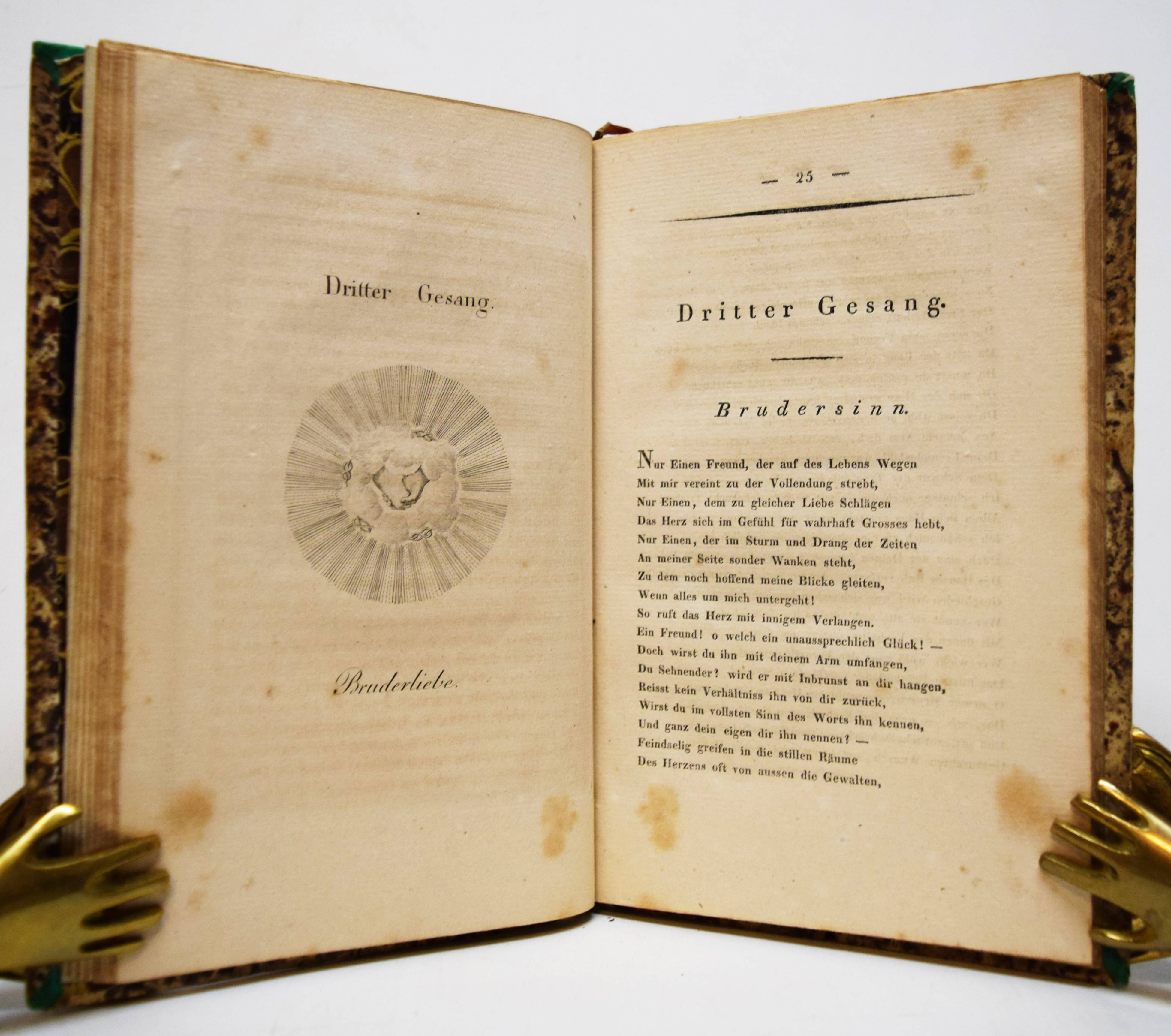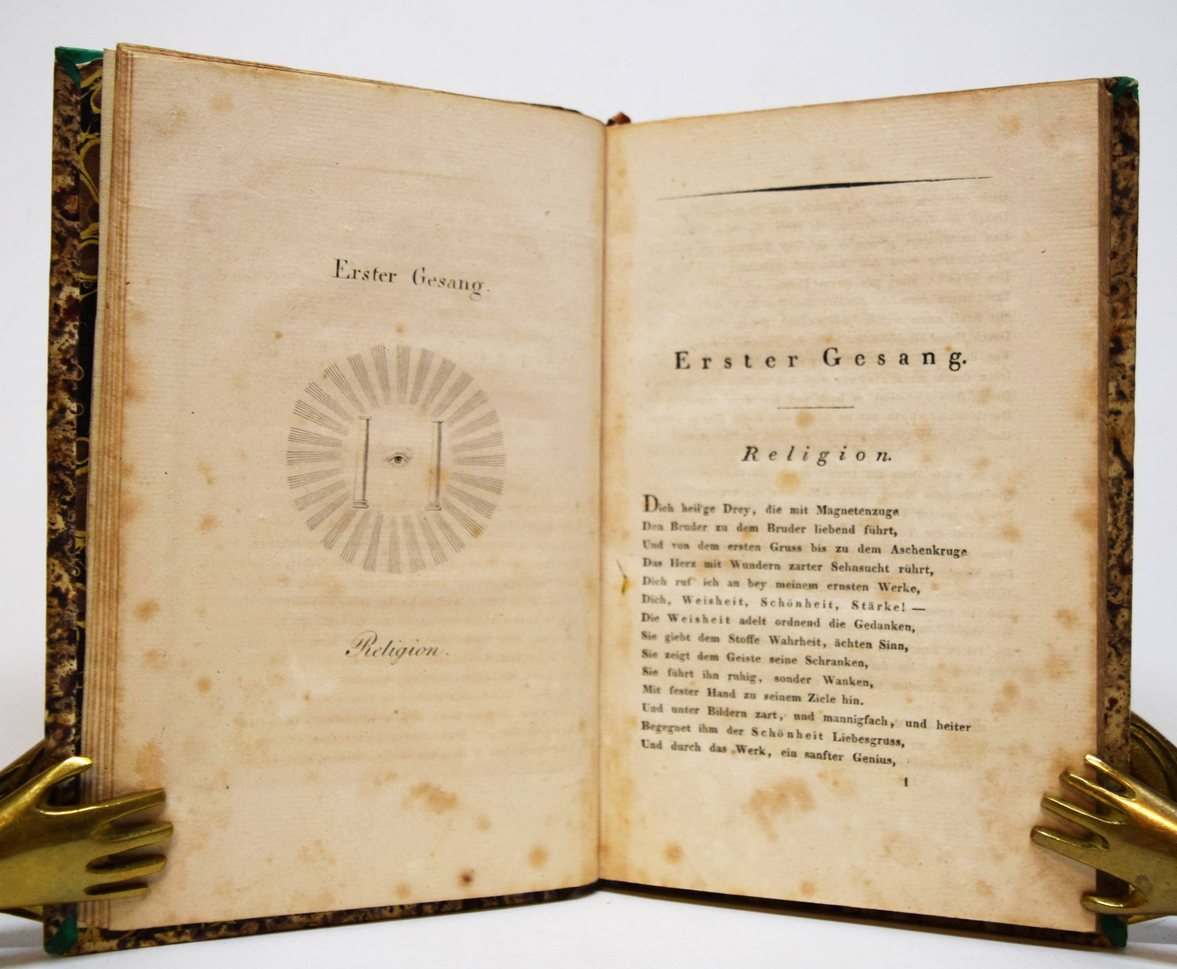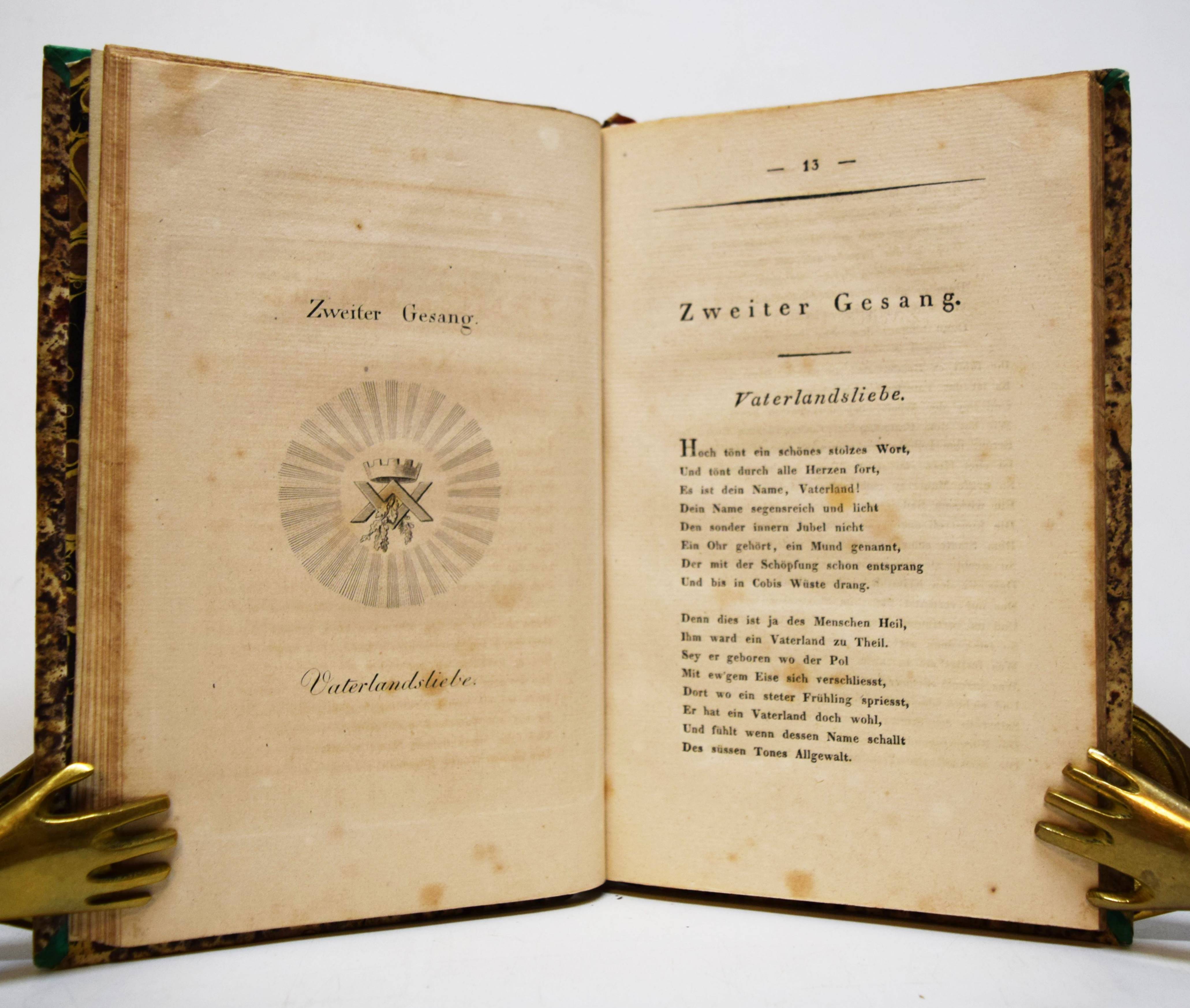 Winkler, K(arl) G(ottlieb) Th(eodor), (d. i. Theodor Hell). Des Maurers Leben. Dargestellt in 9 Gesängen. 3. Aufl. Dresden, Arnold 1825. 8°. XVI, 110 S. mit gestoch. Frontispiz und 9 gestoch. illustr. Zwischentiteln. Halblederband der Zeit mit goldgepr. Rückentitel und Rückenvergoldung. ADB XI, 693 f. Wolfstieg 26704. – Erschien zuerst 1816. – Gesänge über Religion, Vaterlandsliebe, Bruderliebe, die Liebe zu den Schwestern, die Hallen, die Weihe, den Maurer in der Fremde etc. – Der Dramatiker und Dichter T. Hell (1775-1856) war sächsischer Hofrat, Opern-Regisseur und Theater-Intendant in Dresden. – Einband etwas berieben, Exlibris, durchgehend braunfleckig, gutes Exemplar.