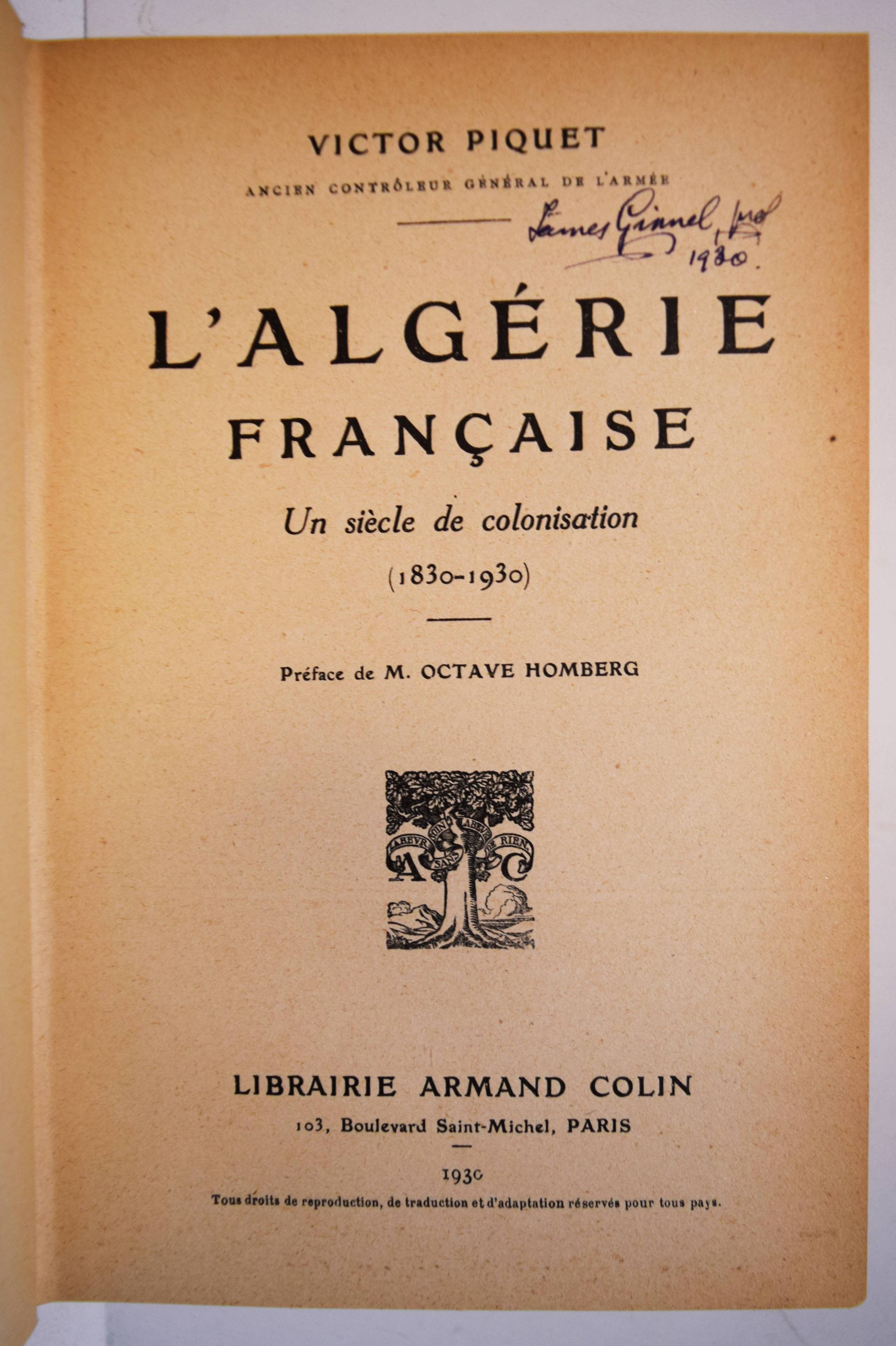 Piquet, Victor. L’Algérie Francaise. Un siècle de colonisation (1830-1930). Préface de M. Octave Homberg. Paris, Armand Colin 1930. 8°. XIV, 413 S. Halblederband der Zeit mit goldgepr. Rückentitel (Orig.-Umschlag beigebunden). Sehr gutes Exemplar.