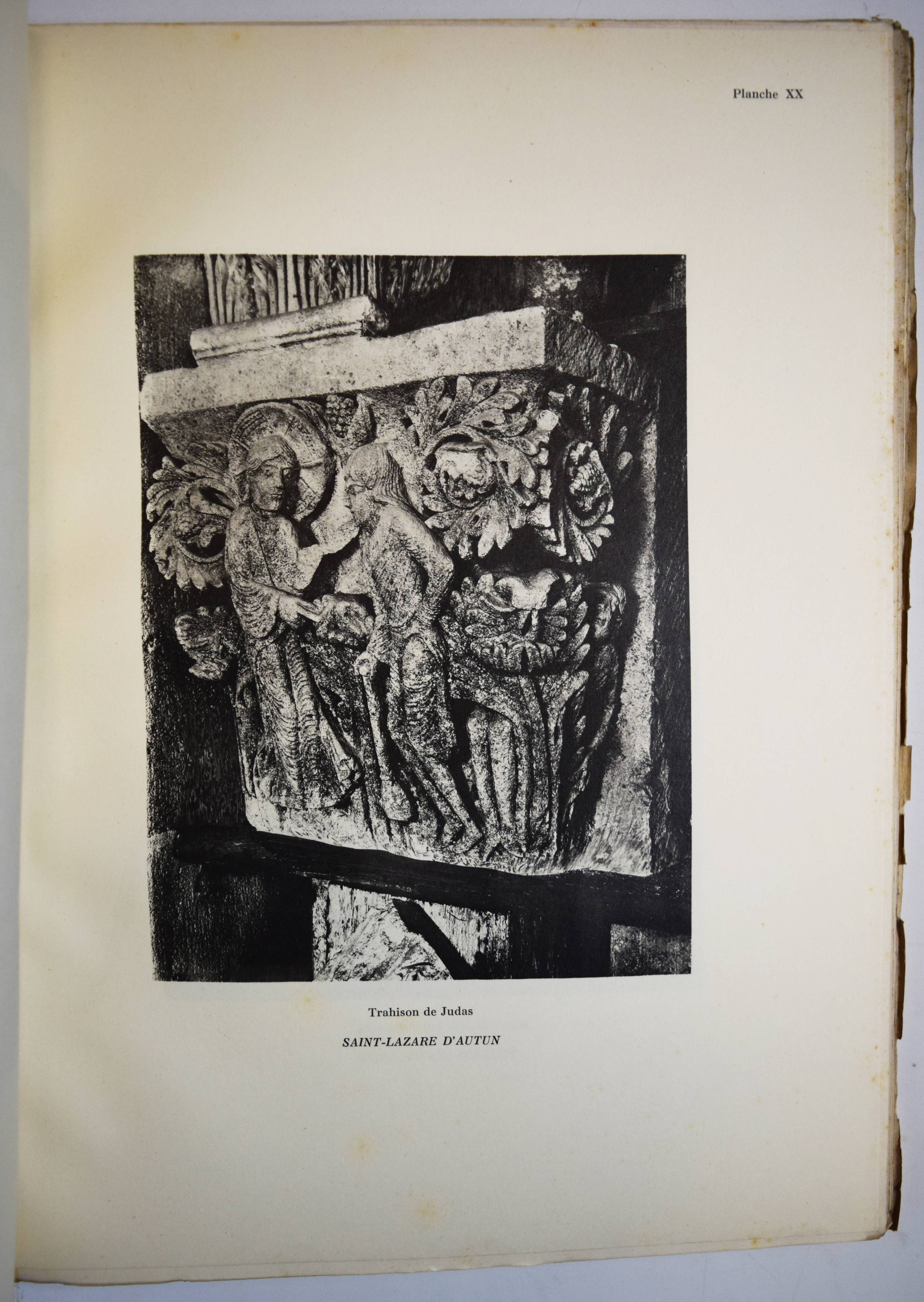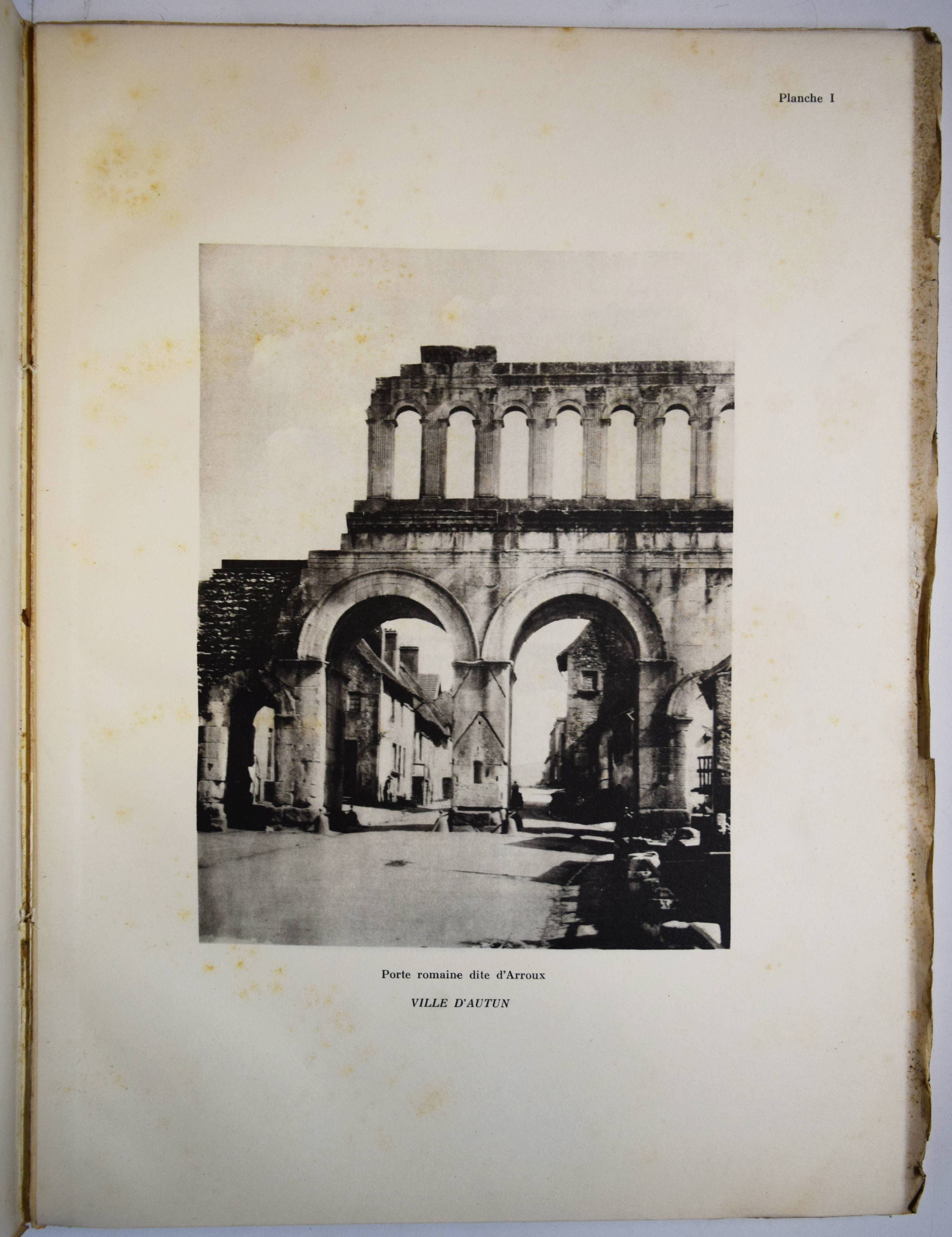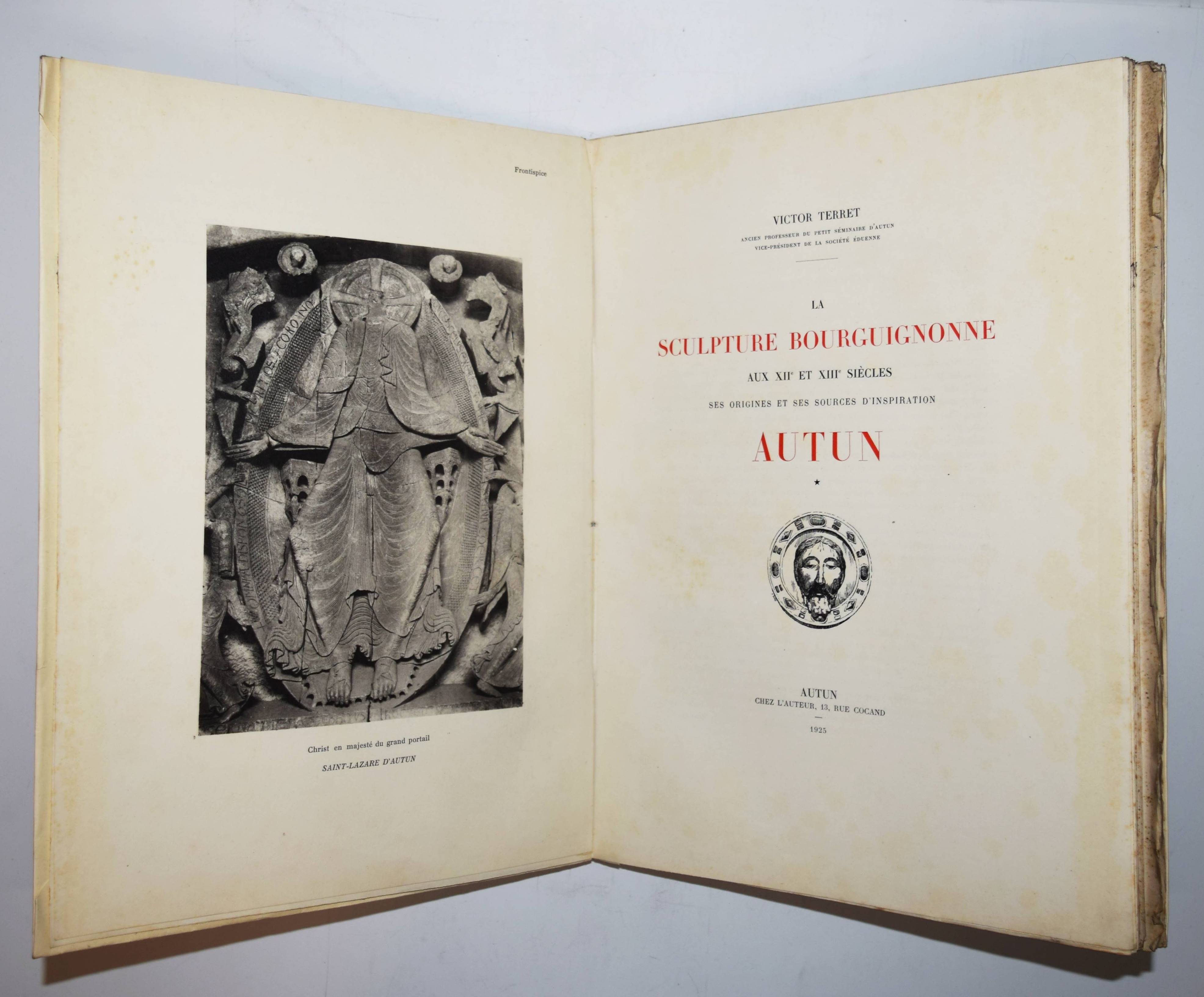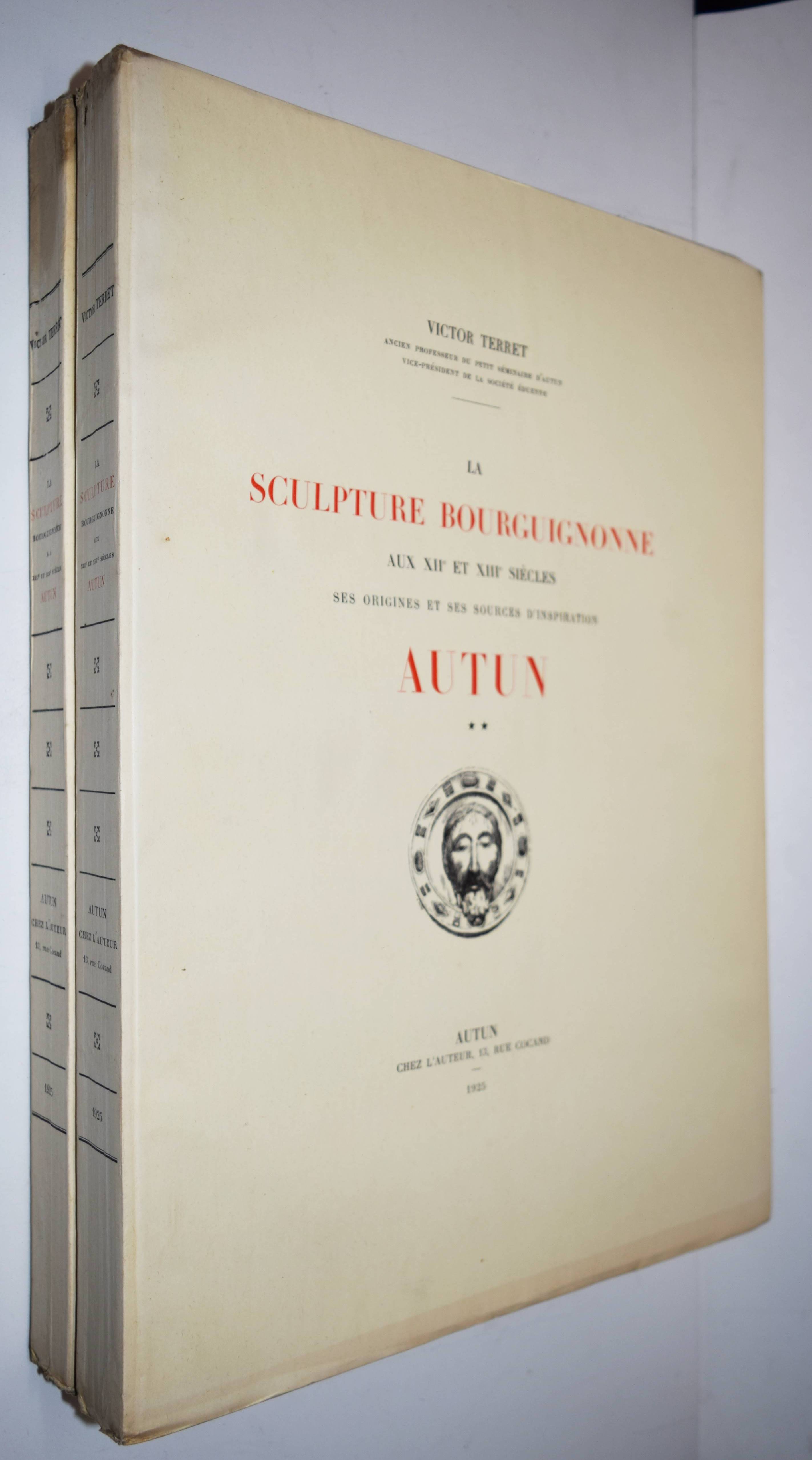 Terret, Victor. La sculpture bourguignonne aux XIIe et XIIIe siècles. Ses origines es ses sources d’inspiration. Autun. 2 volumes. Autun, chez l’autheur et Paris, Librairie de l’art catholique 1925. Folio (38,5 x 28,5 cm.). VIII, 129 p; 78 p. avec 2 frontispices et 61 et 87 planches en noir et blanc. Cartonage d’editeur. Bel exemplaire. – Ci-joint : gravure sur cuivre « Vue de la Ville d’Autun, en descendant du côté du Fauxbourg et de la Riviere d’Arroux. Dessiné d’apres nature par l’Allemand, et Dirigé par Née et Masquelier, 1780 » (39 x 27,5 cm.).