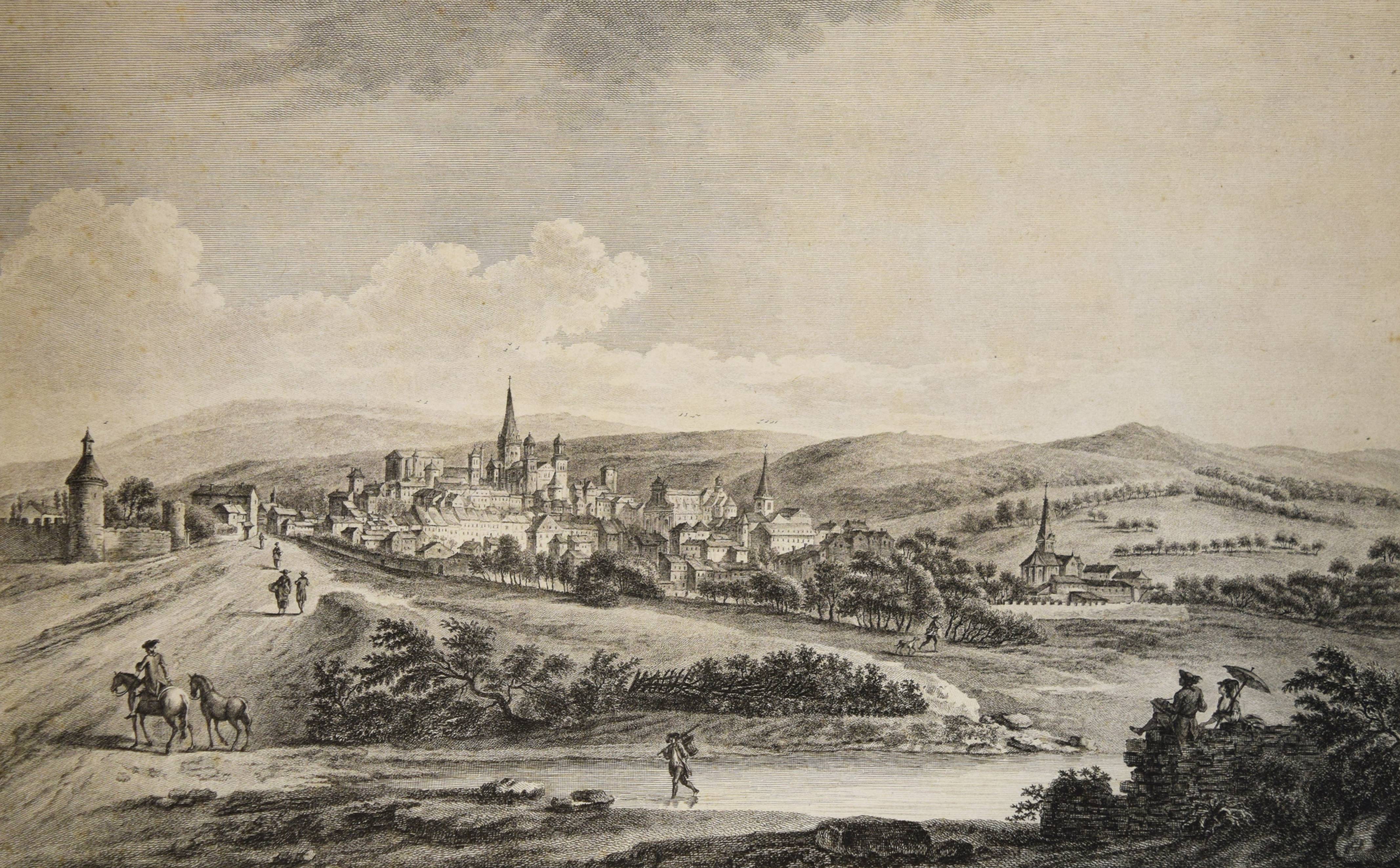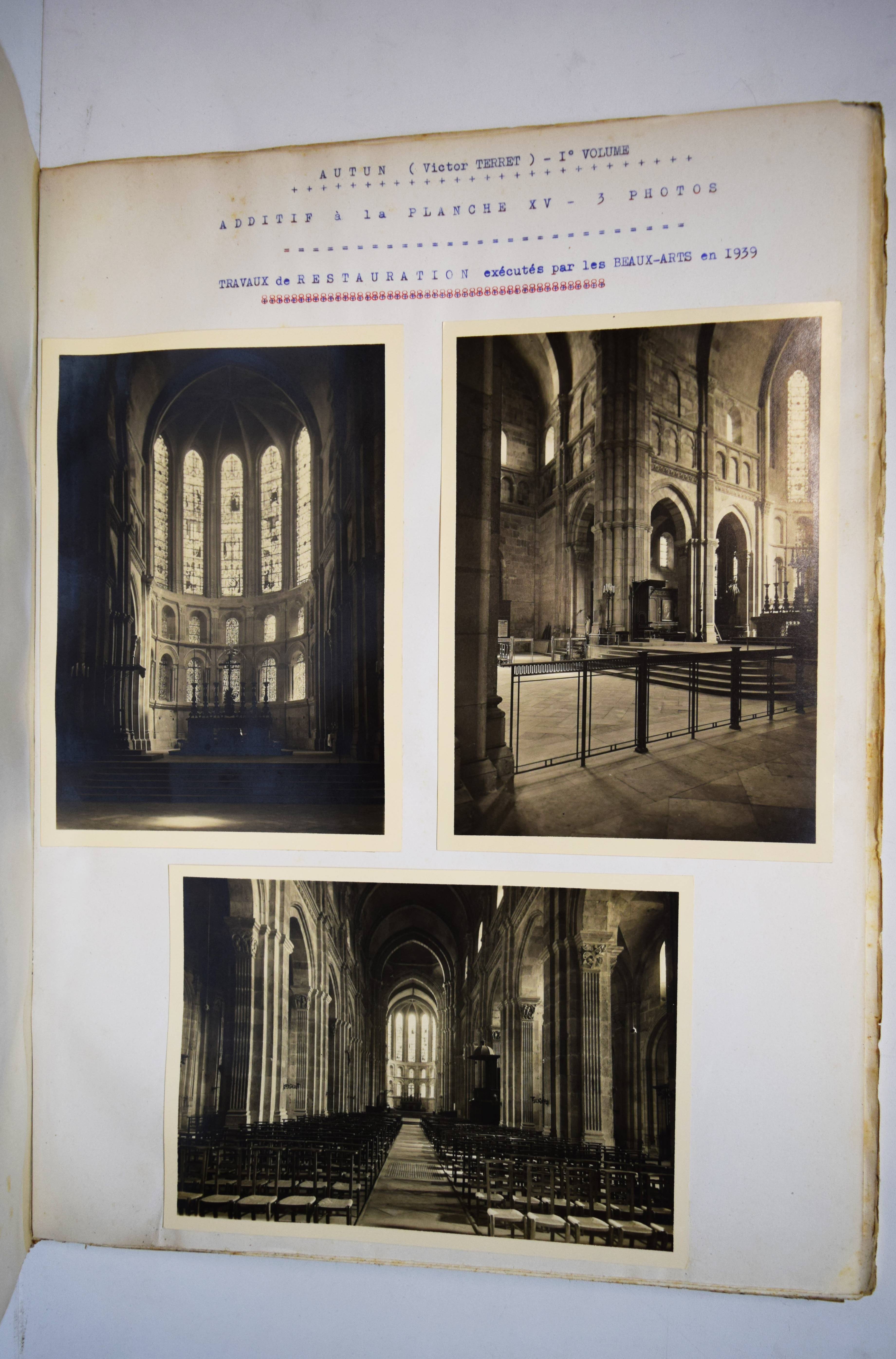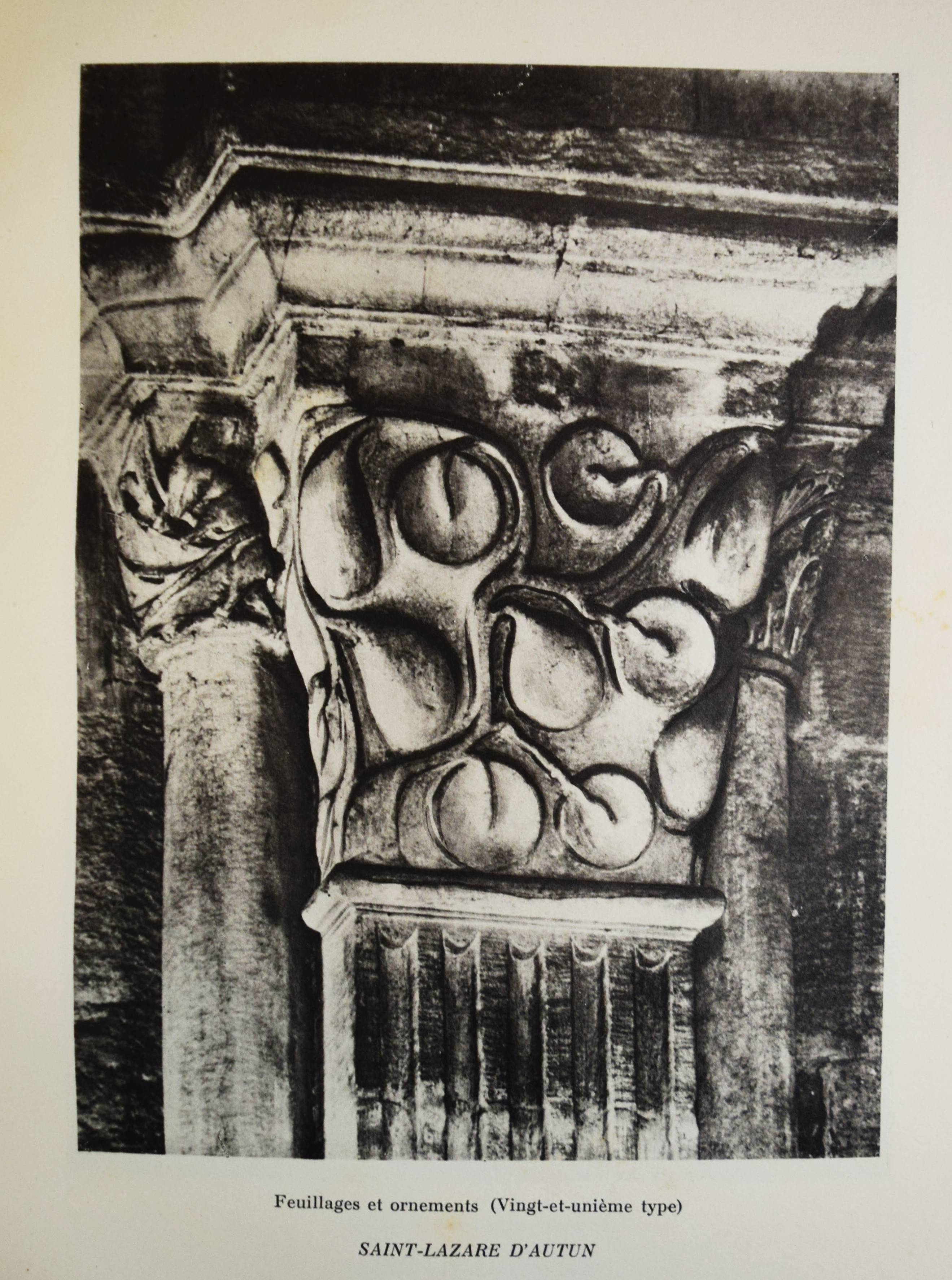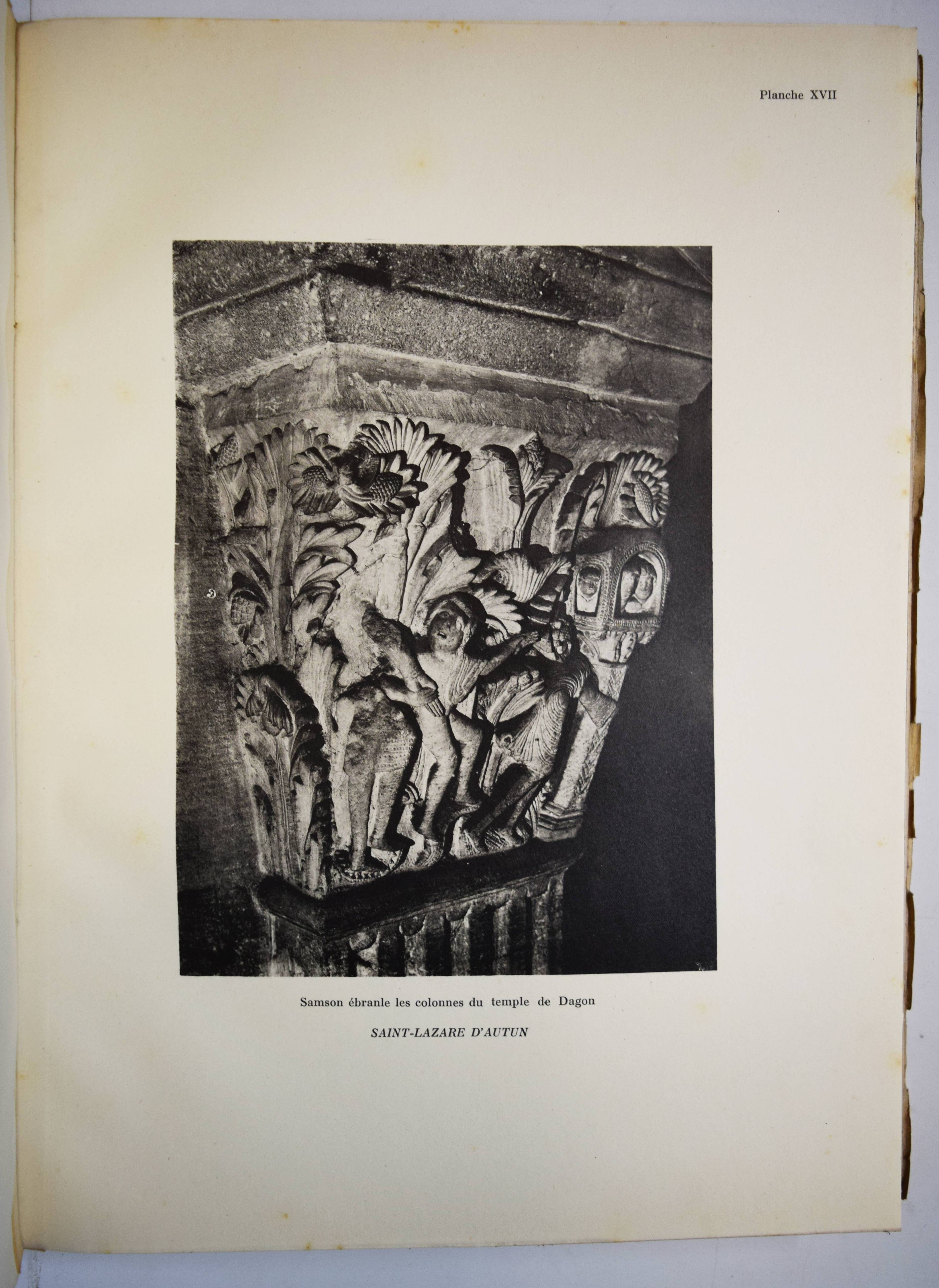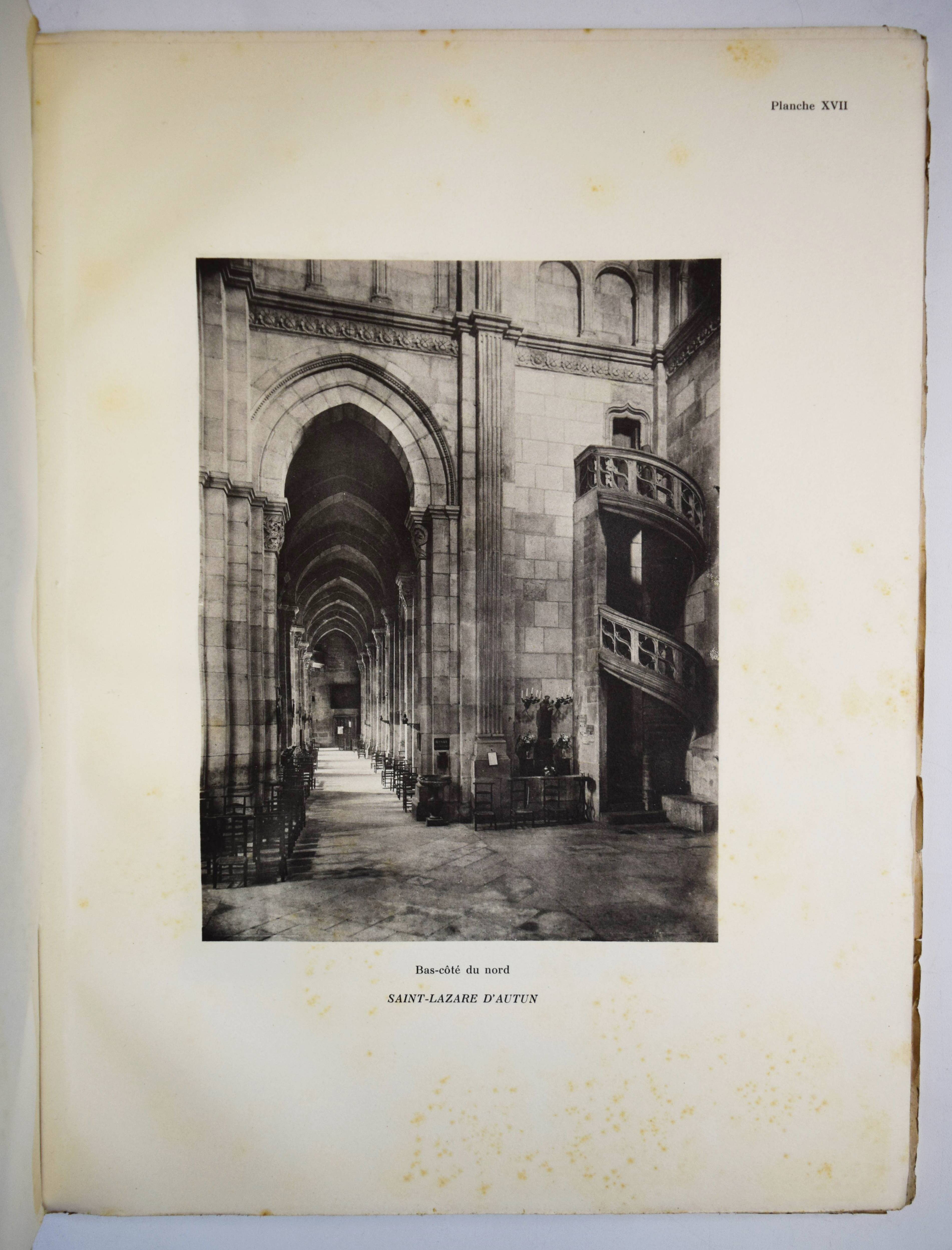 Terret, Victor. La sculpture bourguignonne aux XIIe et XIIIe siècles. Ses origines es ses sources d’inspiration. Autun. 2 volumes. Autun, chez l’autheur et Paris, Librairie de l’art catholique 1925. Folio (38,5 x 28,5 cm.). VIII, 129 p; 78 p. avec 2 frontispices et 61 et 87 planches en noir et blanc. Cartonage d’editeur. Bel exemplaire. – Ci-joint : gravure sur cuivre « Vue de la Ville d’Autun, en descendant du côté du Fauxbourg et de la Riviere d’Arroux. Dessiné d’apres nature par l’Allemand, et Dirigé par Née et Masquelier, 1780 » (39 x 27,5 cm.).