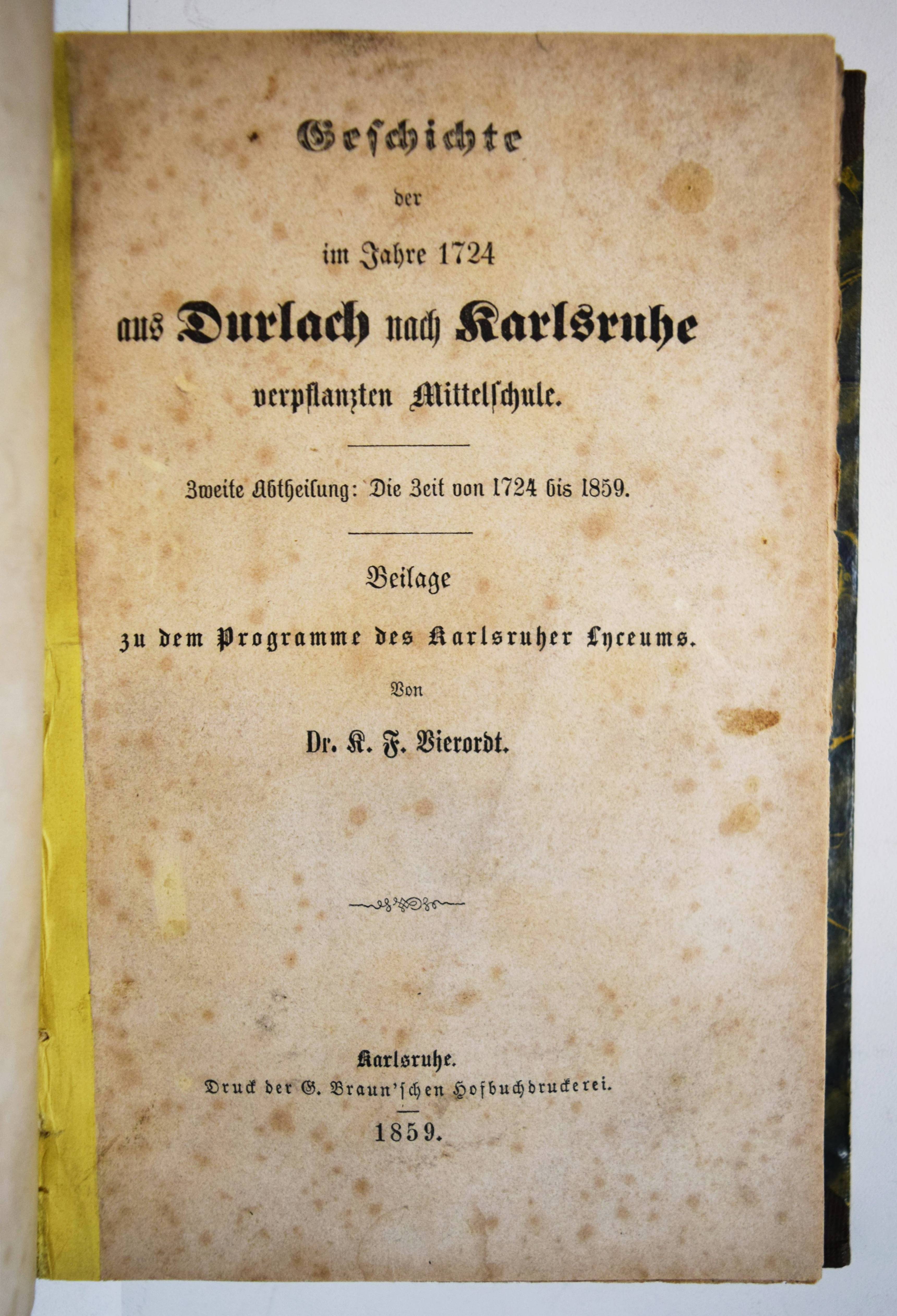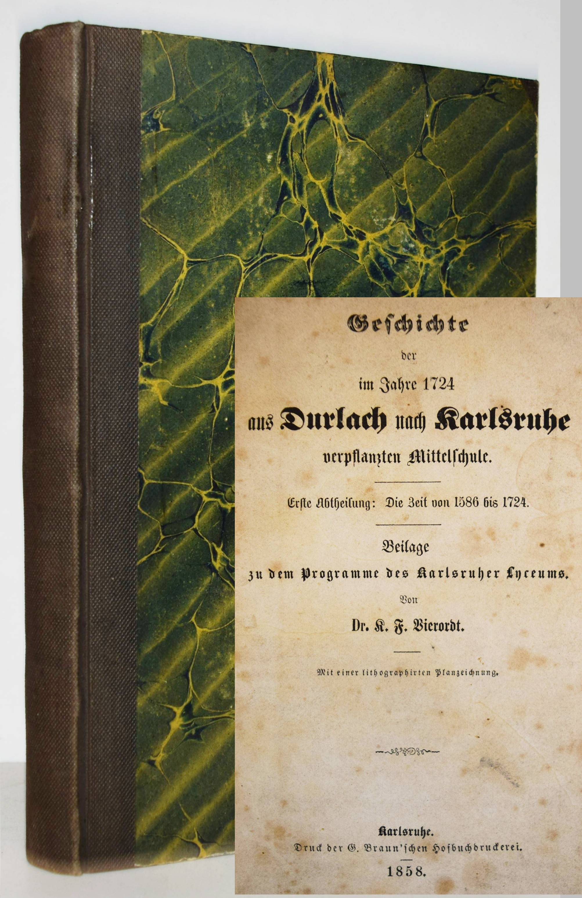 Vierordt, K(arl) F(riedrich). Geschichte der im Jahre 1586 zu Durlach eröffneten und 1724 nach Karlsruhe verpflanzten Mittelschule. Erste Abtheilung: Die Zeit von 1856 bis 1724. – Zweite Abtheilung: Die Zeit von 1724 bis 1859. 2 Teile in 1 Band. Karlsruhe, G. Braun 1859. 8°. 328 S. mit 1 lithogr. Plan. Halbleinenband der Zeit. (Beilage zum Programme des Karlsruher Lyceums). Vollständig sehr seltene Geschichte des Markgrafen Gymnasiums in Durlach. – Stellenweise, teils stärker braunfleckig, sonst gut erhalten.