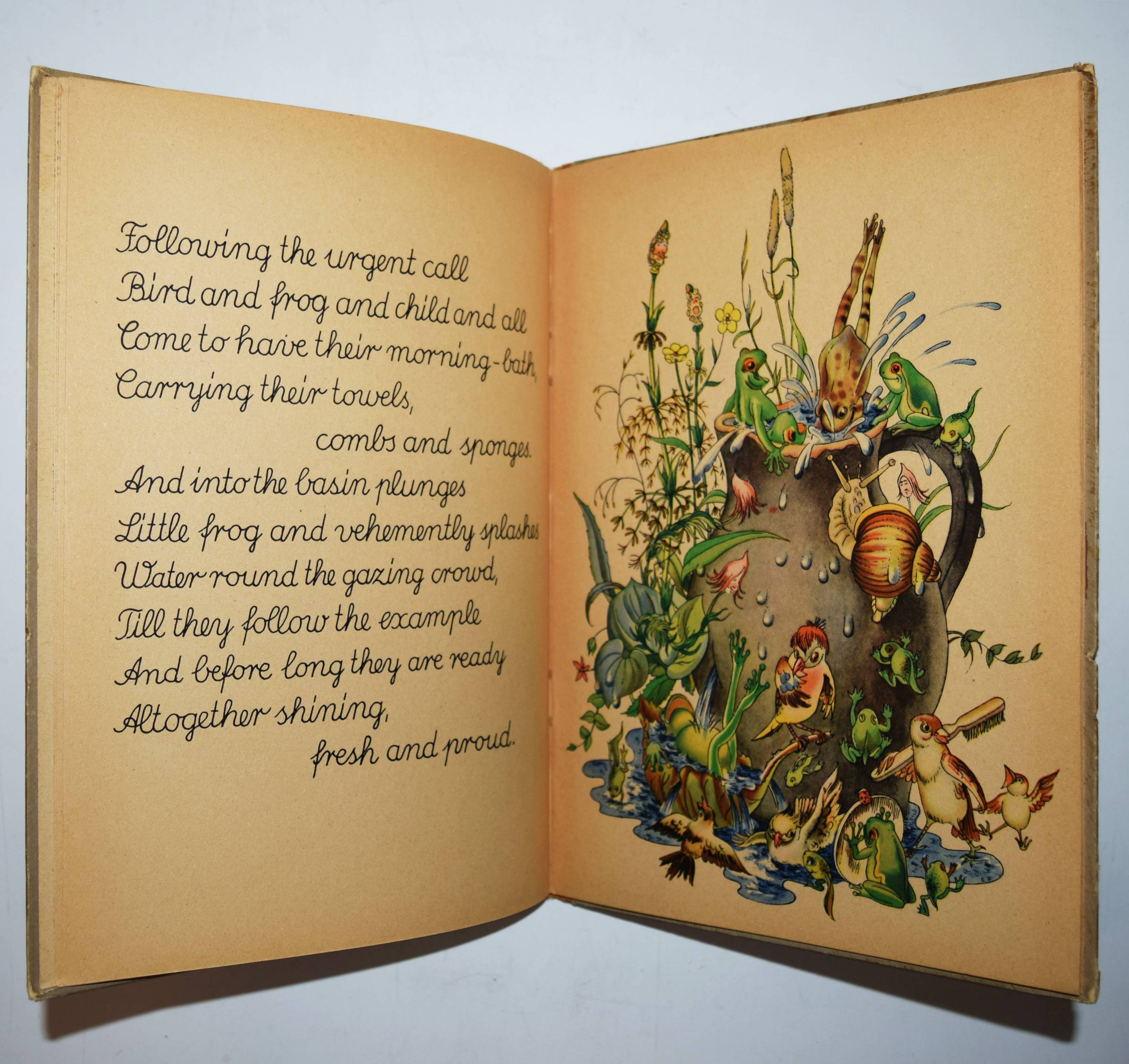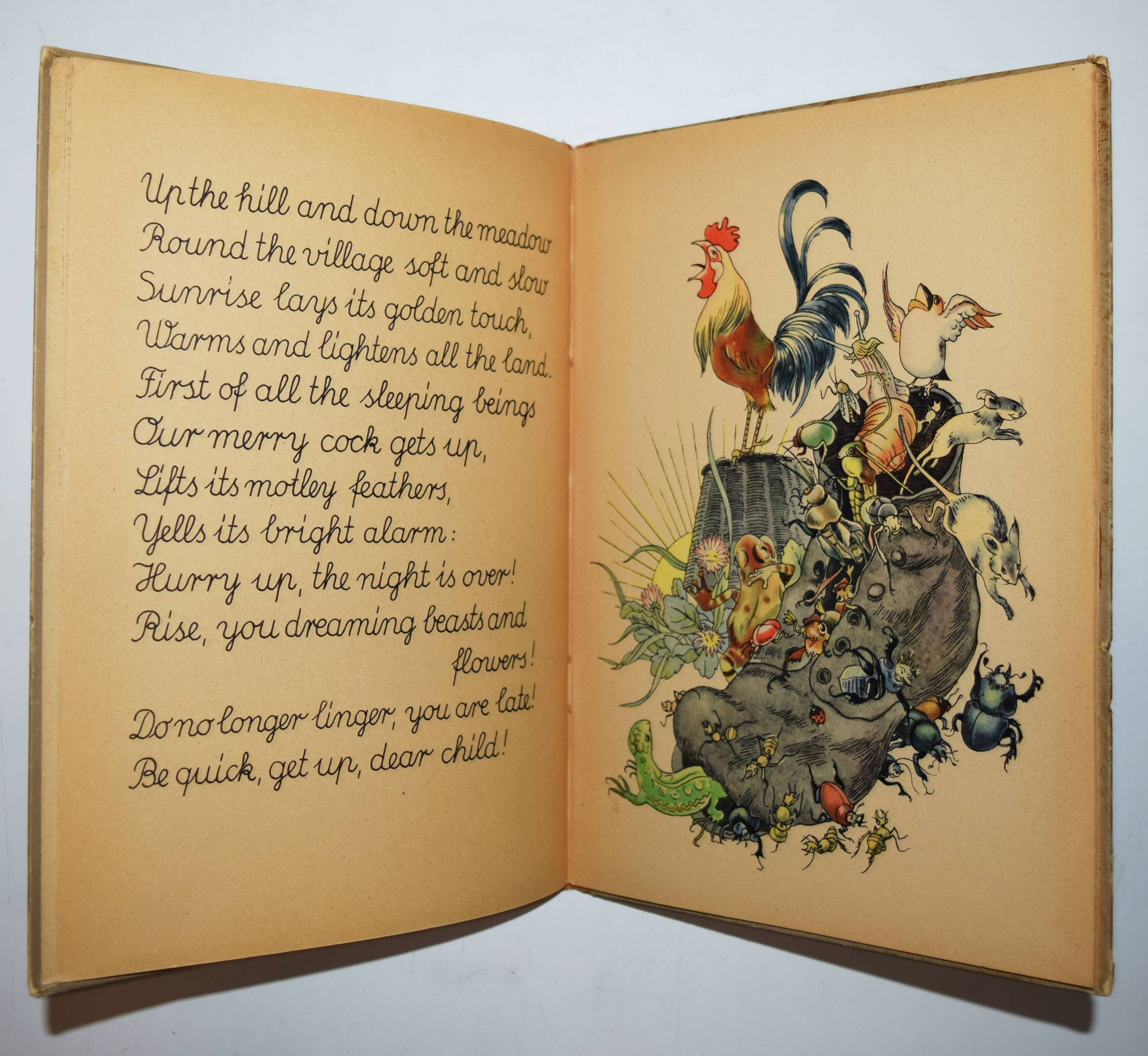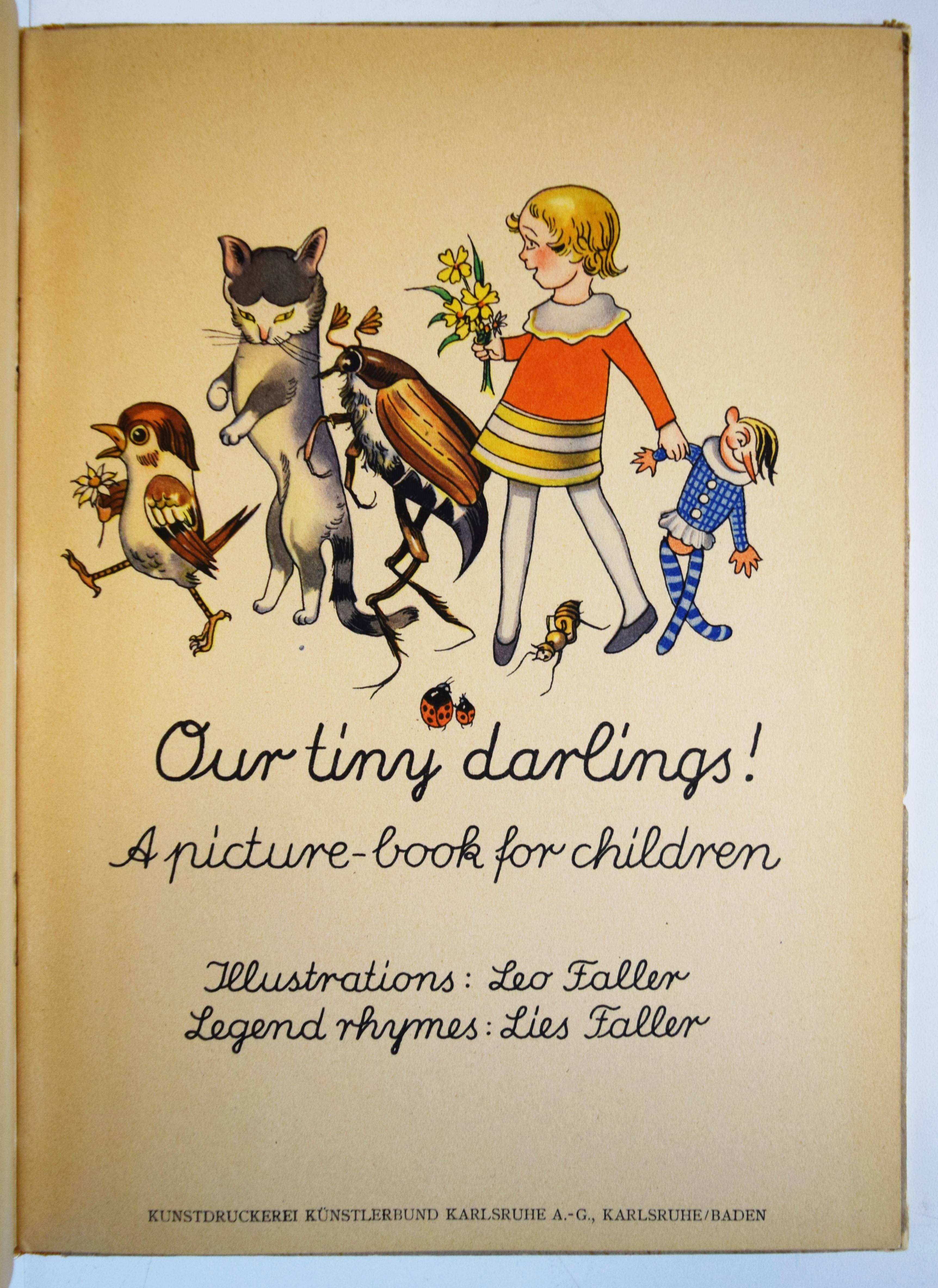 Faller, Lies. Our tiny darlings ! A picture-book for children. Karlsruhe, Kunstdruckerei Künstlerbund o. J. (1948). 4°. [14] Bl. mit farb. illustr. Titel und 11 ganzs. farb. Illustrationen von Leo Faller. Farbig illustr. Orig.-Halbleinenband. (Picture-Book Nr.1). Vgl. Muck II, 6662 und Slg. Kling 64 (beide deutsche Ausgabe mit dem Titel: „Vogel, Katze, Käfer, Kind!“). – Sehr seltene englische Ausgabe für die Kinder der US-Armee, die bis 1995 in fünf Kasernen in Karlsruhe und Ettlingen betrieb. – „Die Vermenschlichung der Tierwelt nimmt hier eine Zwischenstellung zwischen Jugendstil und Comic ein. Sie erinnert teilweise an „Lurchis Abenteuer“, die späteren Werbehefte der Schuh-Firma Salamander.“ (V. Haase in Slg. Kling). Text in Schreibschrift. – Kanten und Deckel etwas berieben, papierbedingt leicht gebräunt, gutes Exemplar.