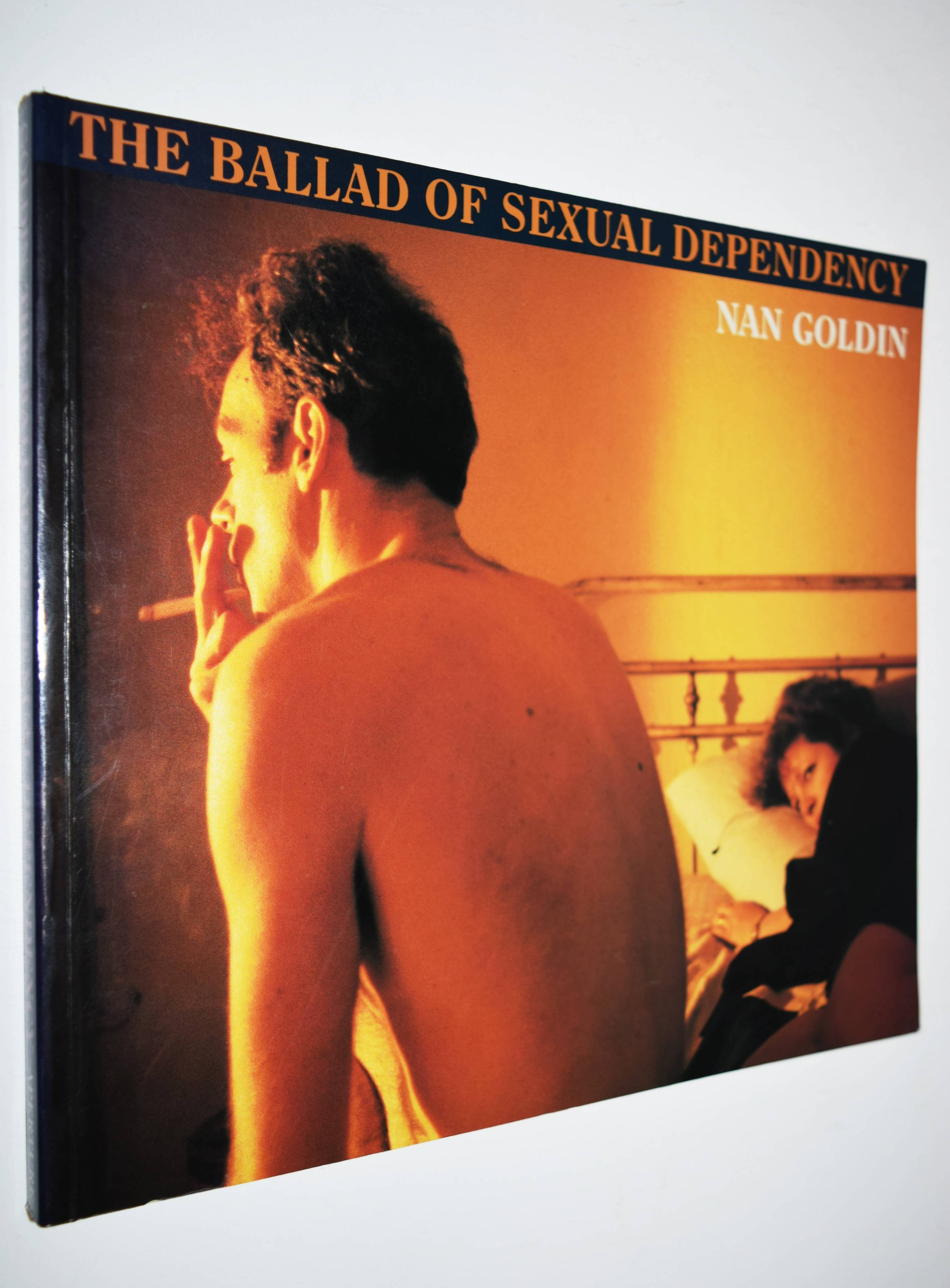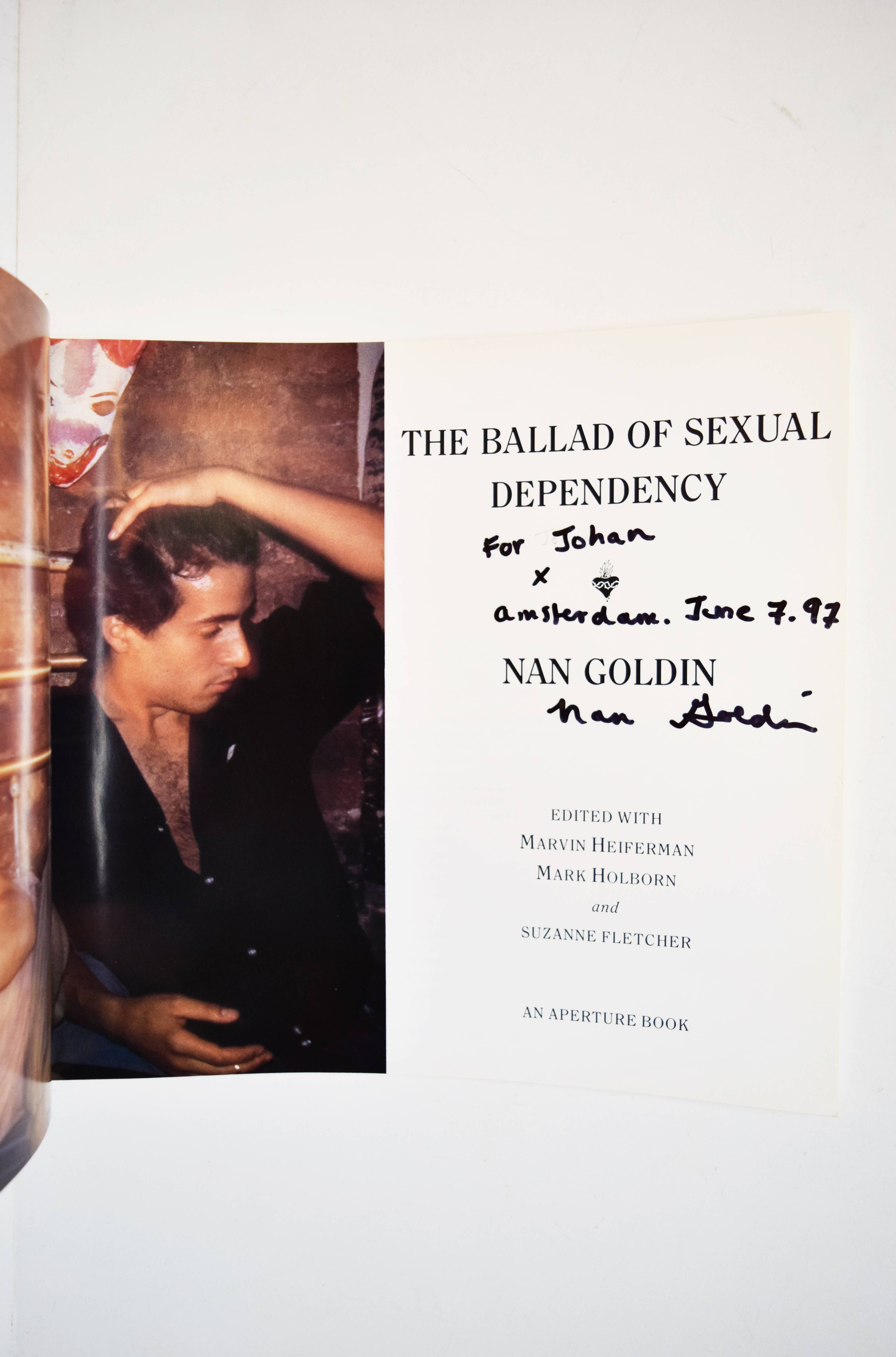 Goldin, Nan. The ballad of sexual dependency. Edited with Marvin Heiferman, Mark Holborn and Suzanne Fletcher. New York,, Aperture (1989). Quer-Gr.-8° (23 x 25,5 cm.).. 144 p. with 120 coloured plates. Colour illustrated Paperback. Auer 667. Koetzle 173 f. Roth, The Book of 101 Books 252 f. Roth, The Open Book 332 f. Parr/Badger II, 39. – First paperback edition. The first hardcover edition appeared 1986. – Inscribed and signed by N. Goldin „For Johan x amsterdam. June 7. 97 Nan Goldin″. – „Nan Goldin might be considered a female equivalent of Larry Clark, photography’s resident bohemian. Her book The Ballad of Sexual Dependency is comparable with Clark’s notorious Teenage Lust (19823), in that it is diaristic and hedonistic – a soap opera of sexual mores mediated through the colour-snapshot aesthetic developed by William Eggleston. But whereas Clark gleefully courts the sleazy and blatantly depicts the sexual act, Goldinm is concerned neither with the sleazy for its own sake nor primarily with sex. Her brief is more complex, and a good deal more ambitious than Clark’s. She examines the limitations of sanctioned gender roles and the conflicting, often violent nature of sexual relationships amongst her friends and lovers. Her view is profoundly pessimistic, yet she also admits the illogical pull of the biological imperative in her introduction to the book: „I often fear that men and women are irrevocably strangers to each other, irreconcilably unsuited, almost as if they were from different planets. But there is an intense need for coupling in spite of it all. Even if relationships are destructive, people cling together“.“ (Martin Parr). – Very good copy.