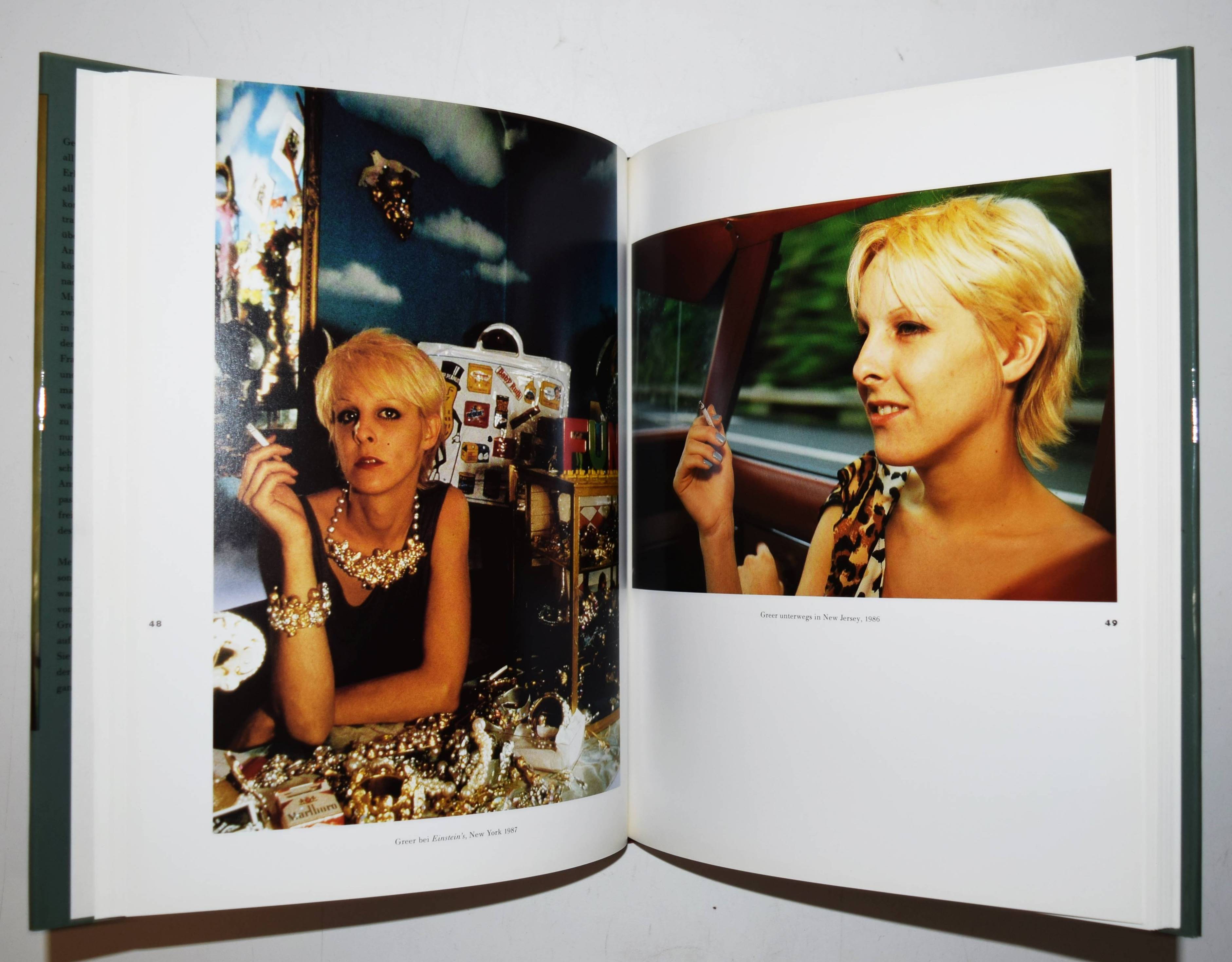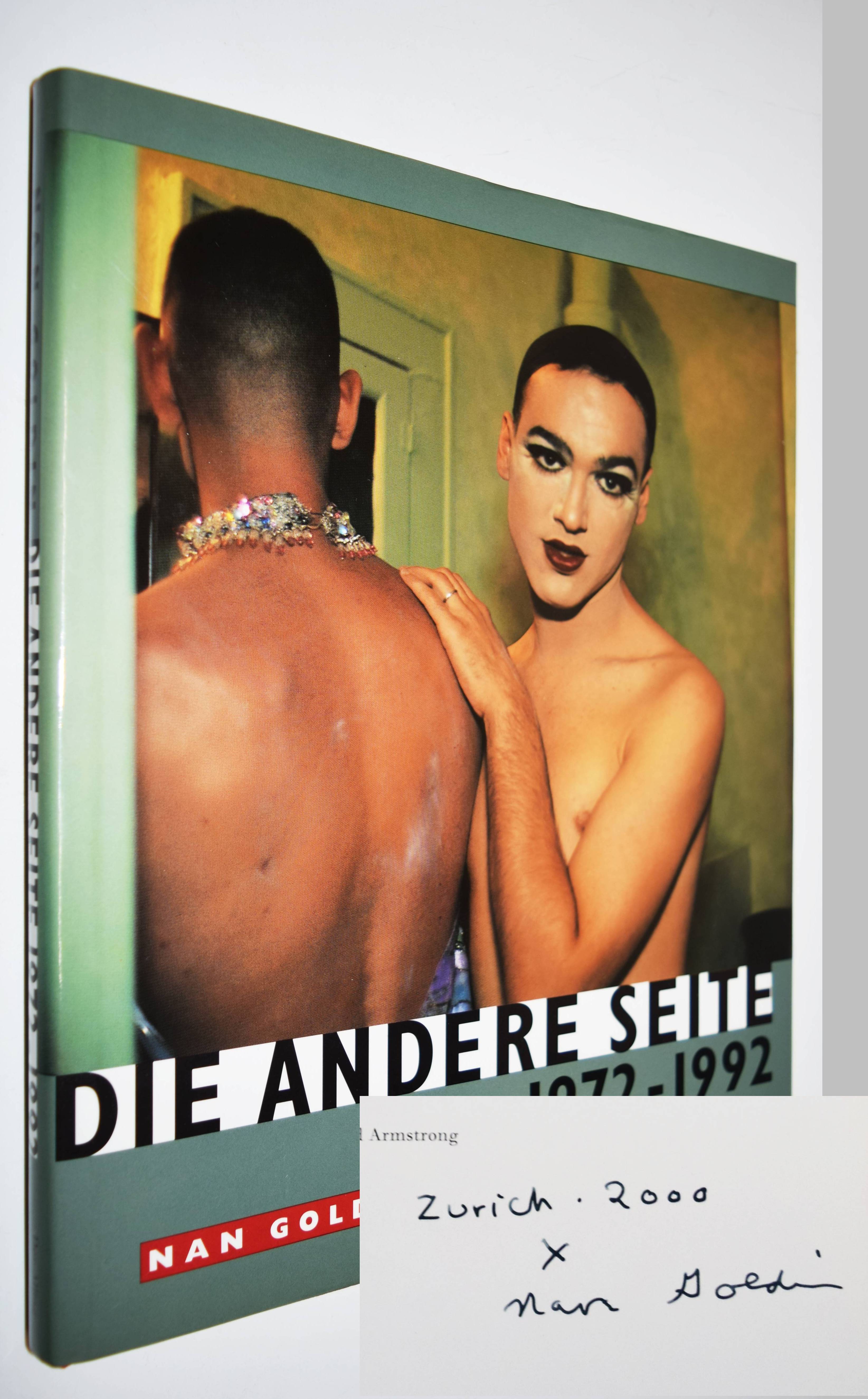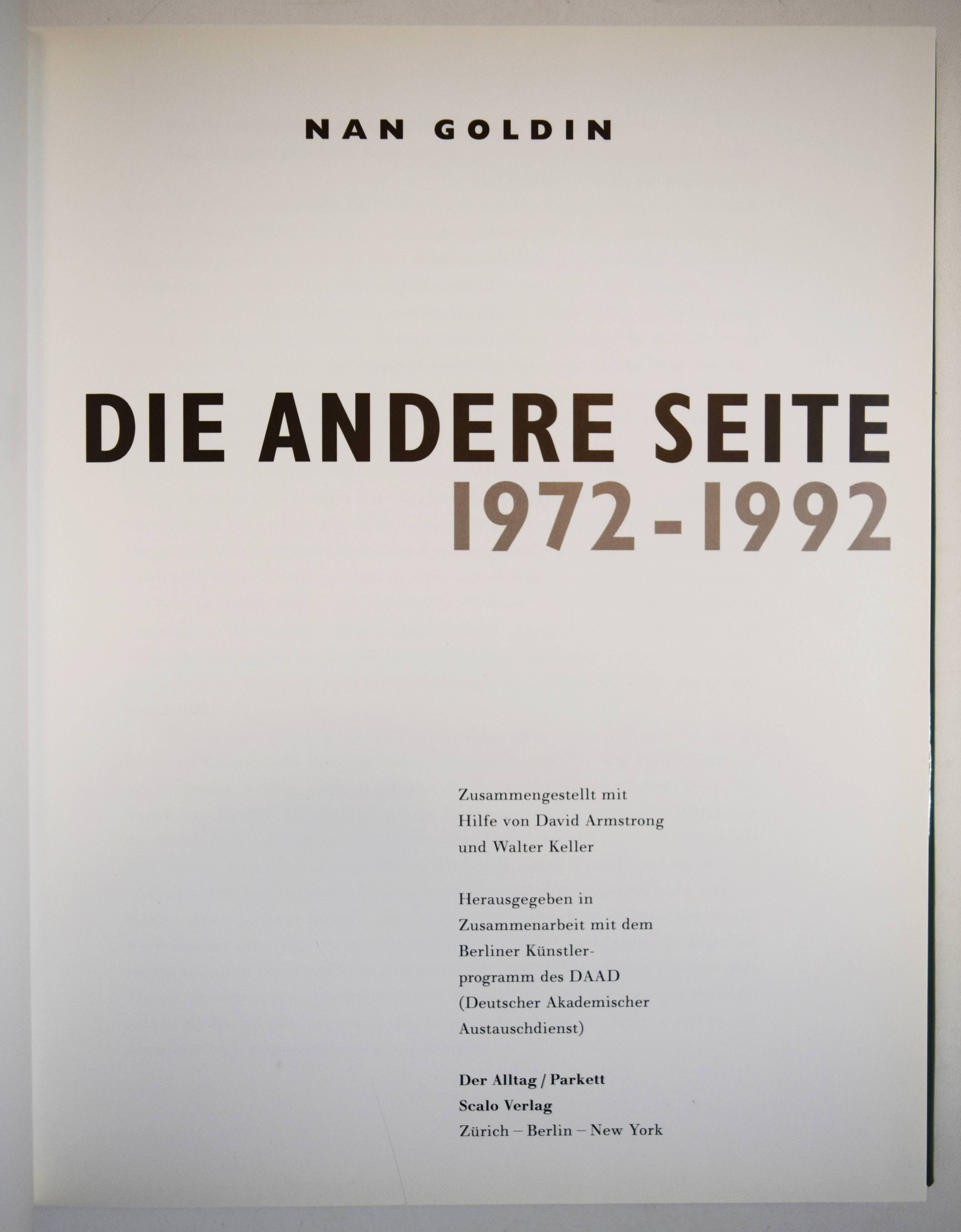 Goldin, Nan. Die andere Seite 1972 – 1992. Zusammengestellt mit Hilfe von David Armstrong und Walter Keller. Zürich, Der Alltag / Parkett bei Scalo-Verlag (1992). 4° 27,5 x 22,5 cm.). 143 S. mit 133 Abbildungen in Duotone und Farbe. Orig.-Pappband mit farbig illustr. Schutzumschlag. Koetzle, Fotografen A-Z 147. – Erste Ausgabe. – Von Nan Goldin signiert und datiert „Zürich 2000 x Nan Goldin“. – „Nan Goldin ist eine leidenschaftliche Chronistin der Liebe im Zeitalter von ungeklärter Geschlechtlichkeit, Glamour, Schönheit, Gewalt, Tod, Rausch und Maskierung. … Ihre Kamera hält das Auf und Ab der sozialen Erfahrungen fest, die mit dem Verlangen nach dem Anderen verknüpft sind: Liebe und Hass imintimen Beziehungen; Augenblicke der Einsamkeit, der Selbstenthüßllung und der Anbetung; eine Sexualität, die von den Zwängen der biologischen Festlegung befreit ist. Aber Goldins Geschichte ist nicht abstrakt. Sie wird durch das Leben der Menschen ezählt, die Teil ihres eigenen Lebens sind“ (E. Sussmann in Koetzle). – Sehr gutes Exemplar.