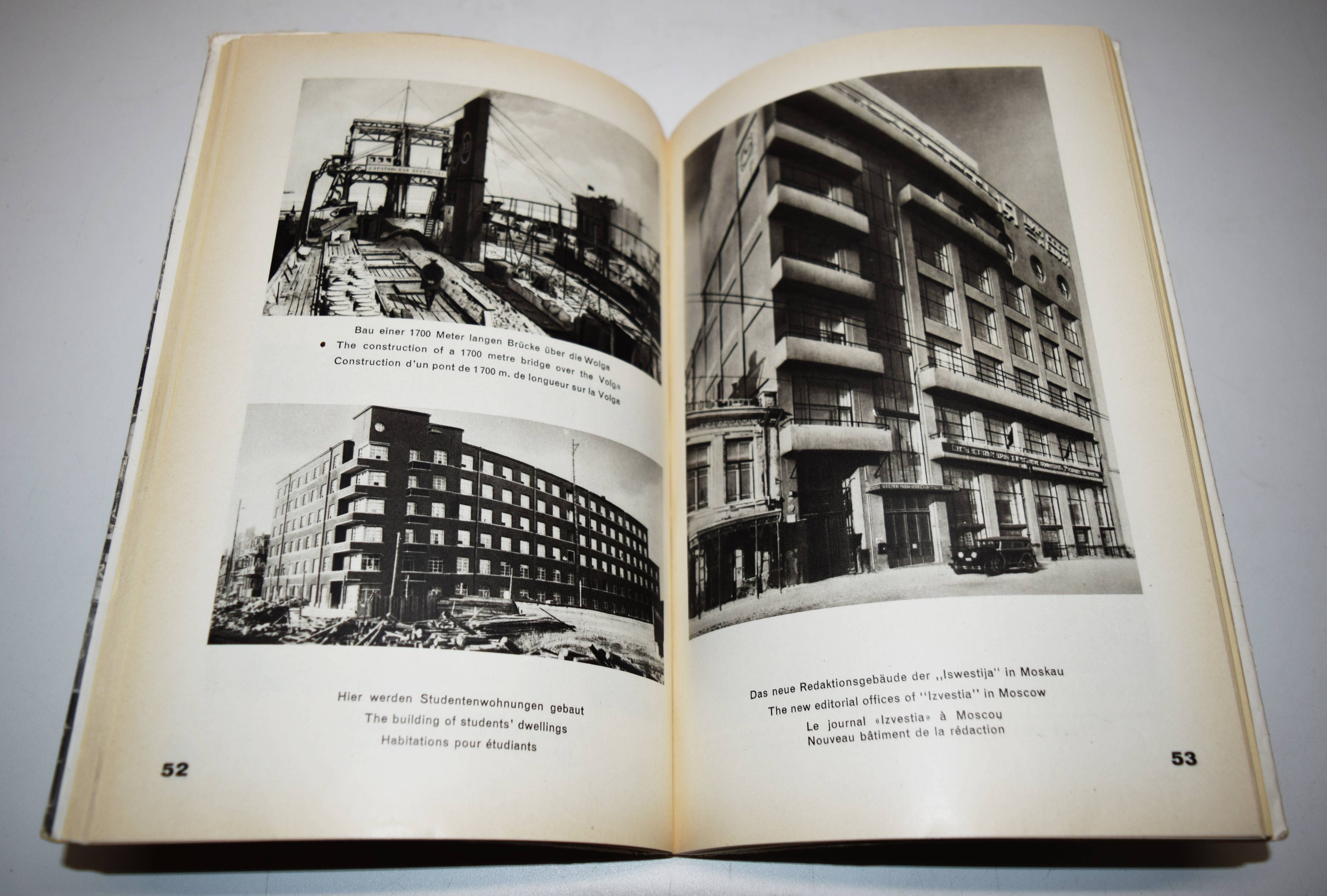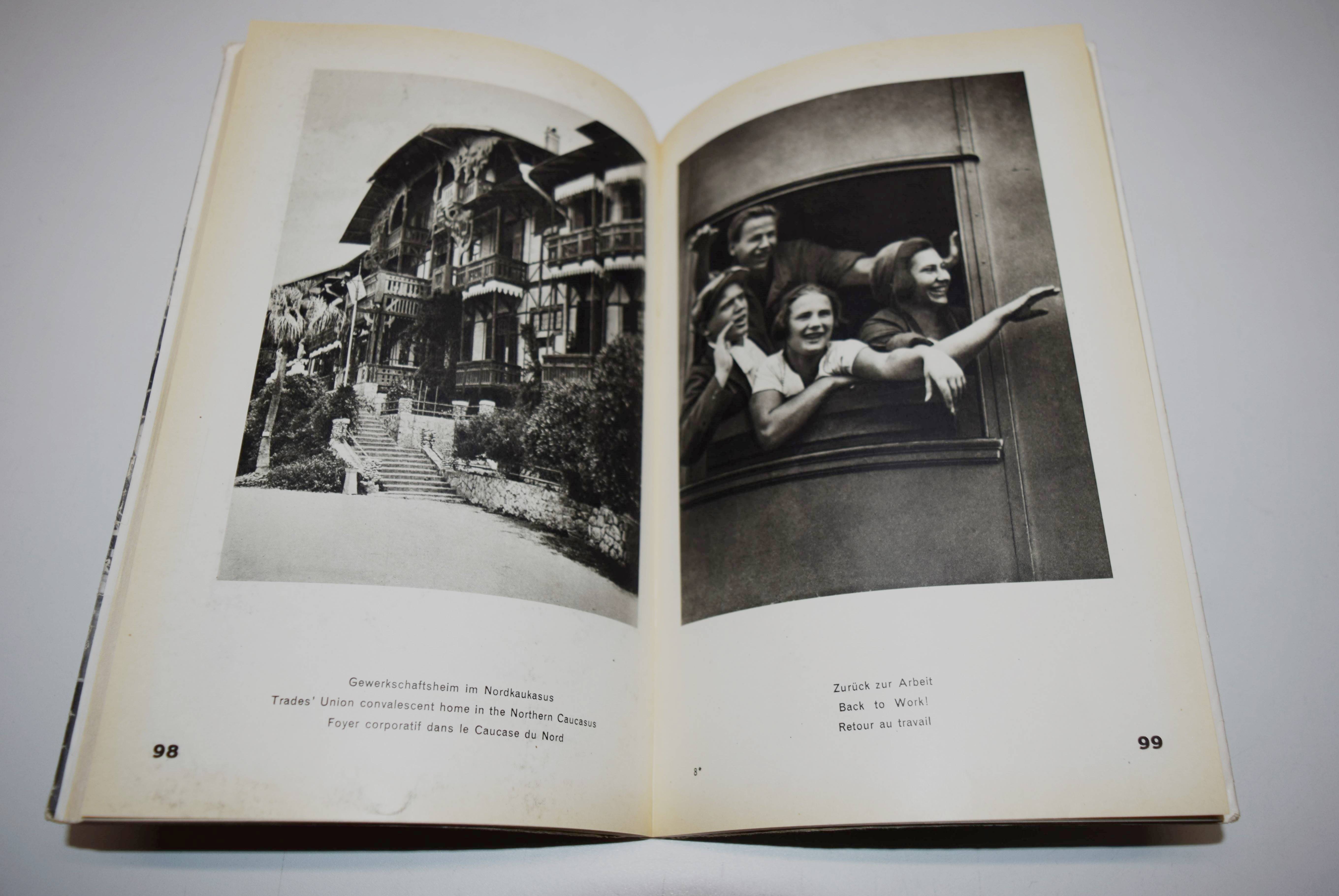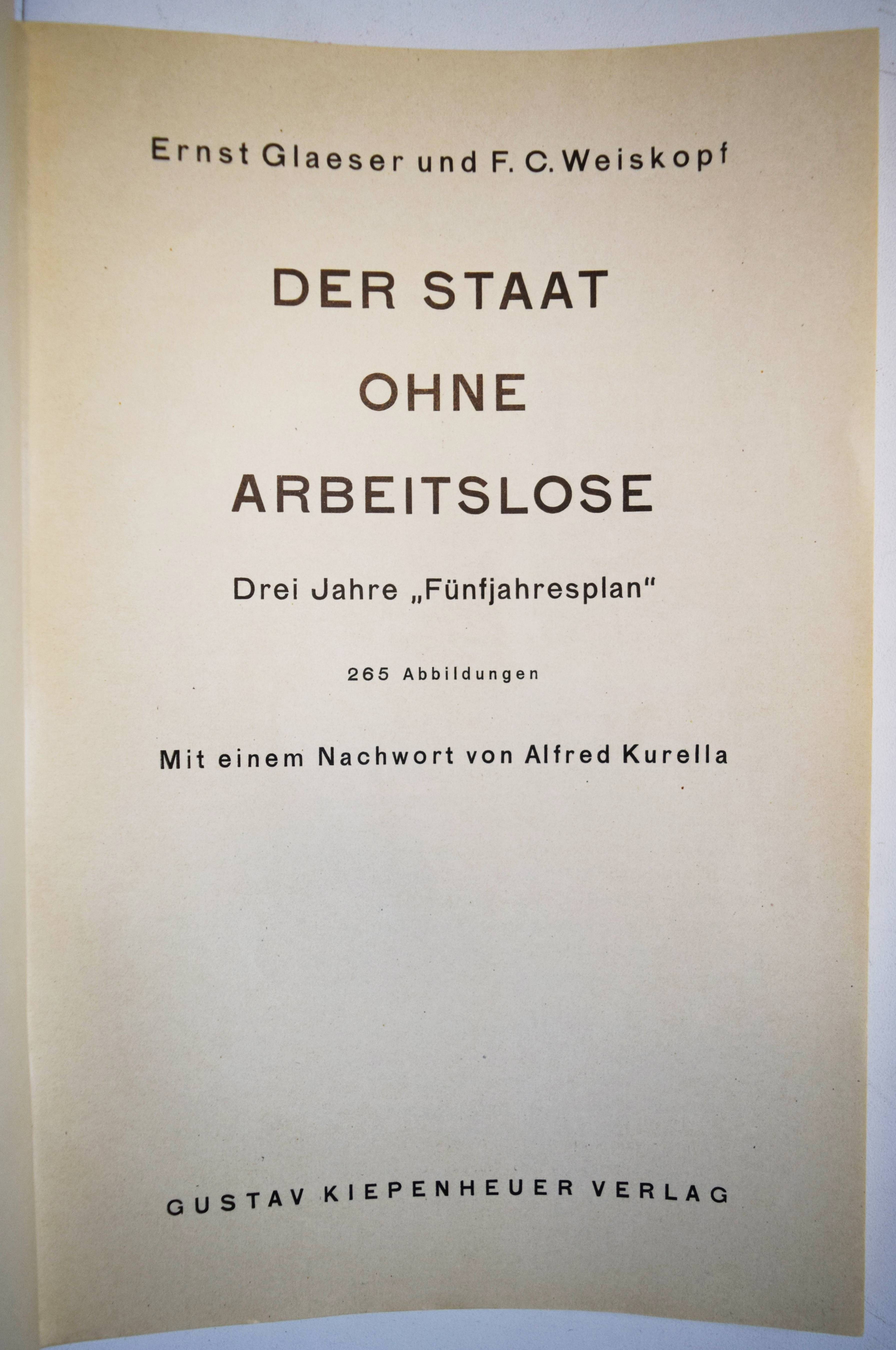 Glaeser, Ernst und F(ranz) C(arl) Weiskopf. Der Staat ohne Arbeitslose. Drei Jahre „Fünfjahresplan“. Mit einem Nachwort von Alfred Korella. Berlin, Gustav Kiepenheuer (1931). Gr.-8°. VIII, 198 S., [1] Bl. mit 265 Abbildungen nach Fotografien von Alexander Michailowitsch Rodtschenko u. a. und 2 Karten. Orig.-Kartonumschlag mit Schutzumschlag (Fotomontage von John Heartfield). Heiting/Jaeger I, 285 ff. Heidtmann 15387. Melzwig 744.1. W.-G.² 5. – Erste Ausgabe. – „Während Tucholskys Blick auf Deutschland von Kritik und beißendem Sarkasmus durchzogen war, warfen Ernst Glaeser und Franz Carl Weiskopf 1931, anlässlich von „Drei Jahren ‚Fünfjahresplan‘“, einen wohlwollend-bewundernden Blick auf die junge Sowjetunion, den vermeintlichen Staat ohne Arbeitslose. Schon 1927 hatte Weiskopf in seinem bei Malik erschienenen Reisebericht Umsteigen ins 21. Jahrhundert den Sowjetstaat als Vorbild für die Gesellschaftsordnung der Zukunft gefeiert. Für den Bildband im Berliner Verlag Gustav Kiepenheuer wurde ein 184-seitiger, lateinisch durchnummerierter Buchblock mit 265 Abbildungen zusammengestellt, die die Herausgeber laut Impressum aus über 5.000 Bildern der russischen Agentur Ogonjok und der Berliner Unionbild aus wählten. Dieser Bildteil, im Kupfertiefdruck bei Oscar Brandstetter in Leipzig produziert, enthält die Bildunterschriften in drei Sprachen (Deutsch / Englisch / Französisch) und wurde analog für die französische und englische Ausgabe des Buches verwendet. Lediglich das römisch nummerierte Vorwort der Herausgeber und das erklärende Nachwort zum Fünfjahresplan von Alfred Kureila wurden für die jeweiligen nationalen Ausgabennoch übersetzt. Die deutsche Variante erschien zunächst ohne Angabe einer Auflagenhöhe in einer kartonierten Ausgabe mit aufgeklebtem Schutzumschlag von John Heartfield, der sich zur selben Zeit auf einer mehrmonatigen Reise in die Sowjetunion befand.“ (P. Rössler in Heiting/Jaeger). – Schutzumschlag mit geringfügigen Randläsuren, sehr gutes Exemplar.