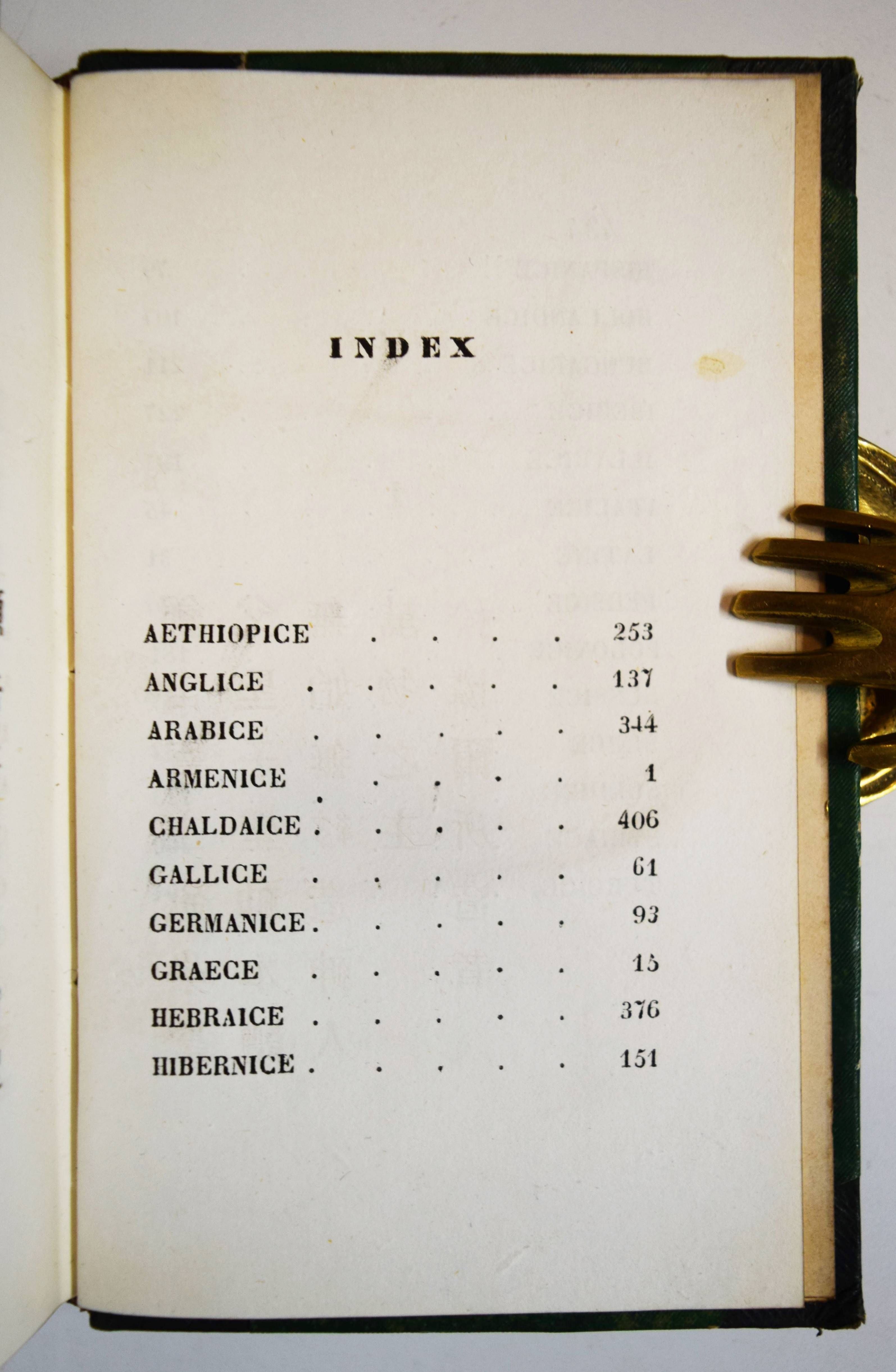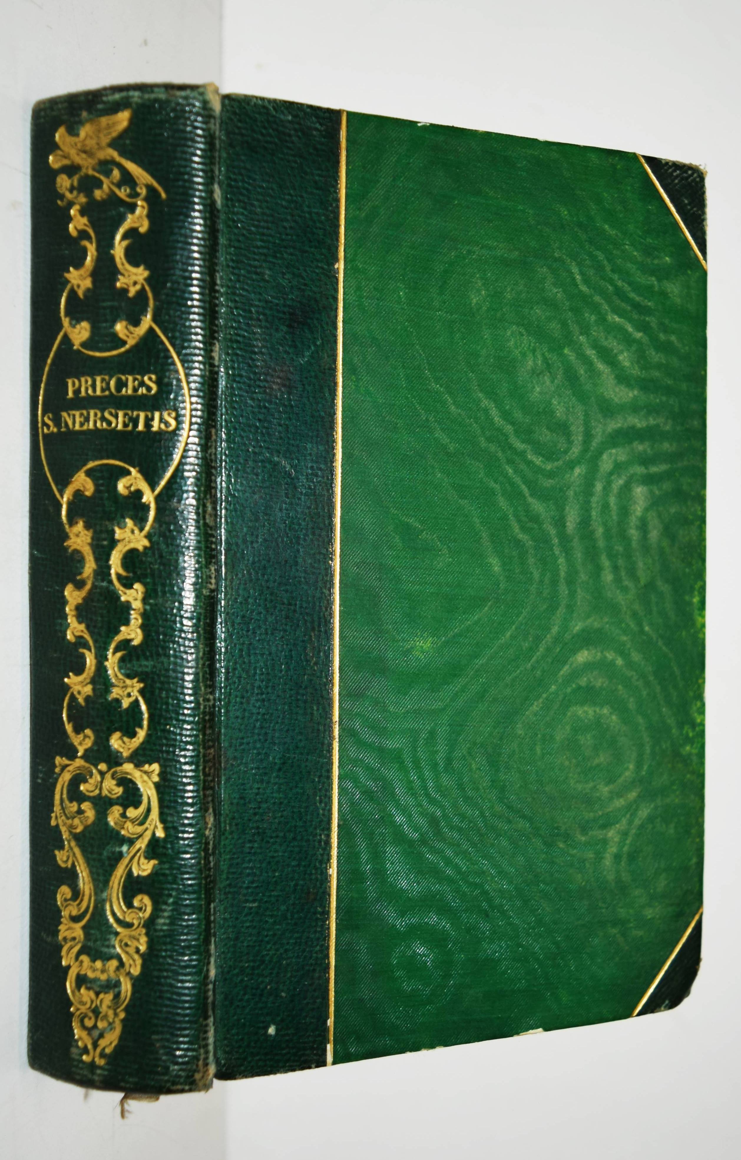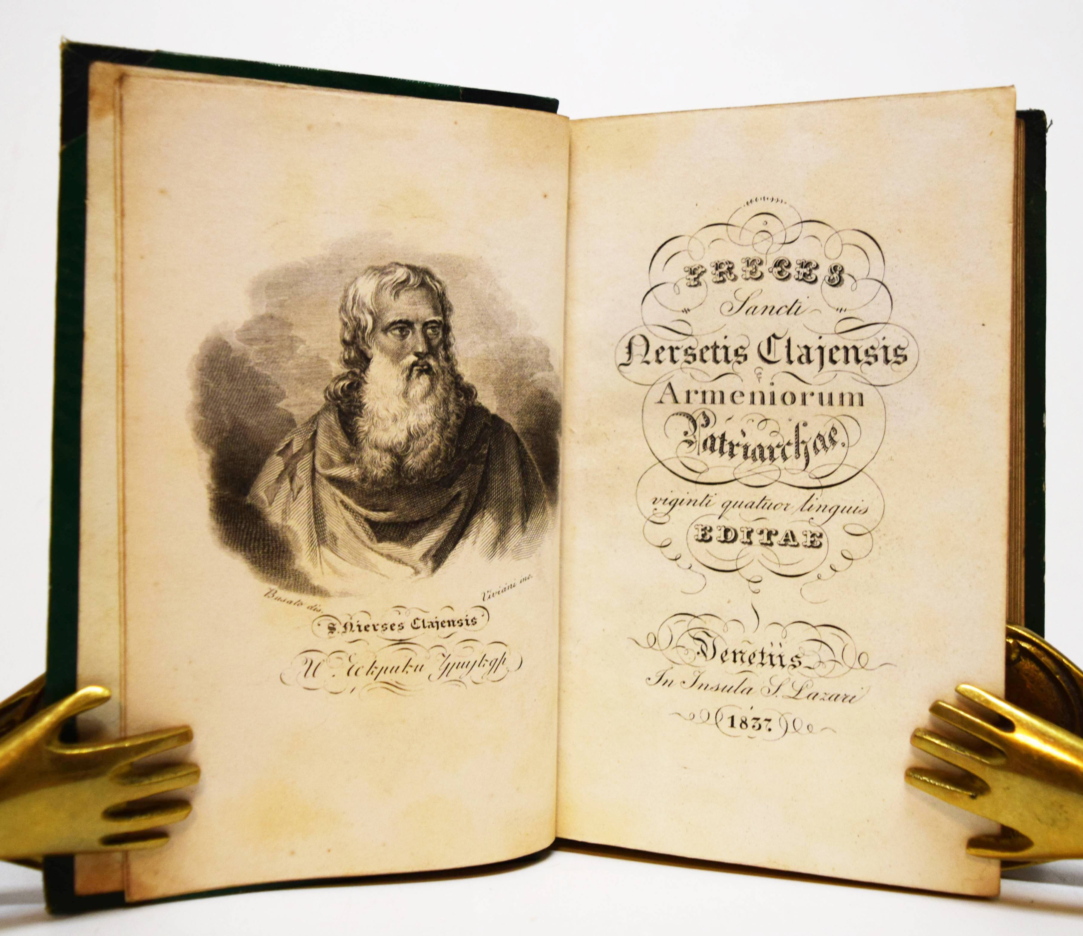 Preces S. Niersis Claiensis Aremeniorum Patriarchae. Viginti quatuor linguis coitae. Venetiis (Venedig), Insula S. Lazari 1837. Kl.-8°. [3], 434 S. mit gestoch. Frontispiz, gestoch. Titel und 1 Kupferstich (Medaille). Dunkelgrüner Halblederband der Zeit mit goldgepr. Rückentitel, Romantikervergoldung und Goldschnitt. Brunet IV, 859. Wetzer/Welke IX, 162. – Dritte Ausgabe des seltenen polyglotten Gebetbuchs. – Mit Gebeten des armenischen Patriarchen und Lyrikers St. Nierses IV (1098-1173, Nersês IV, Klayec`i, genannt Snorhali) in 24 Sprachen, u.a.: Armenisch, Syrisch, Persisch, Russisch, Griechisch, Latein, Italienisch, Französisch, Spanisch, Deutsch, Englisch, Ungarisch, Türkisch etc. – Die Mechitharistendruckerei auf St. Lazaro bei Venedig, war berühmt für ihre Editionen in orientalischen Sprachen. – Sehr gutes sauberes und dekorativ gebundenes Exemplar.
