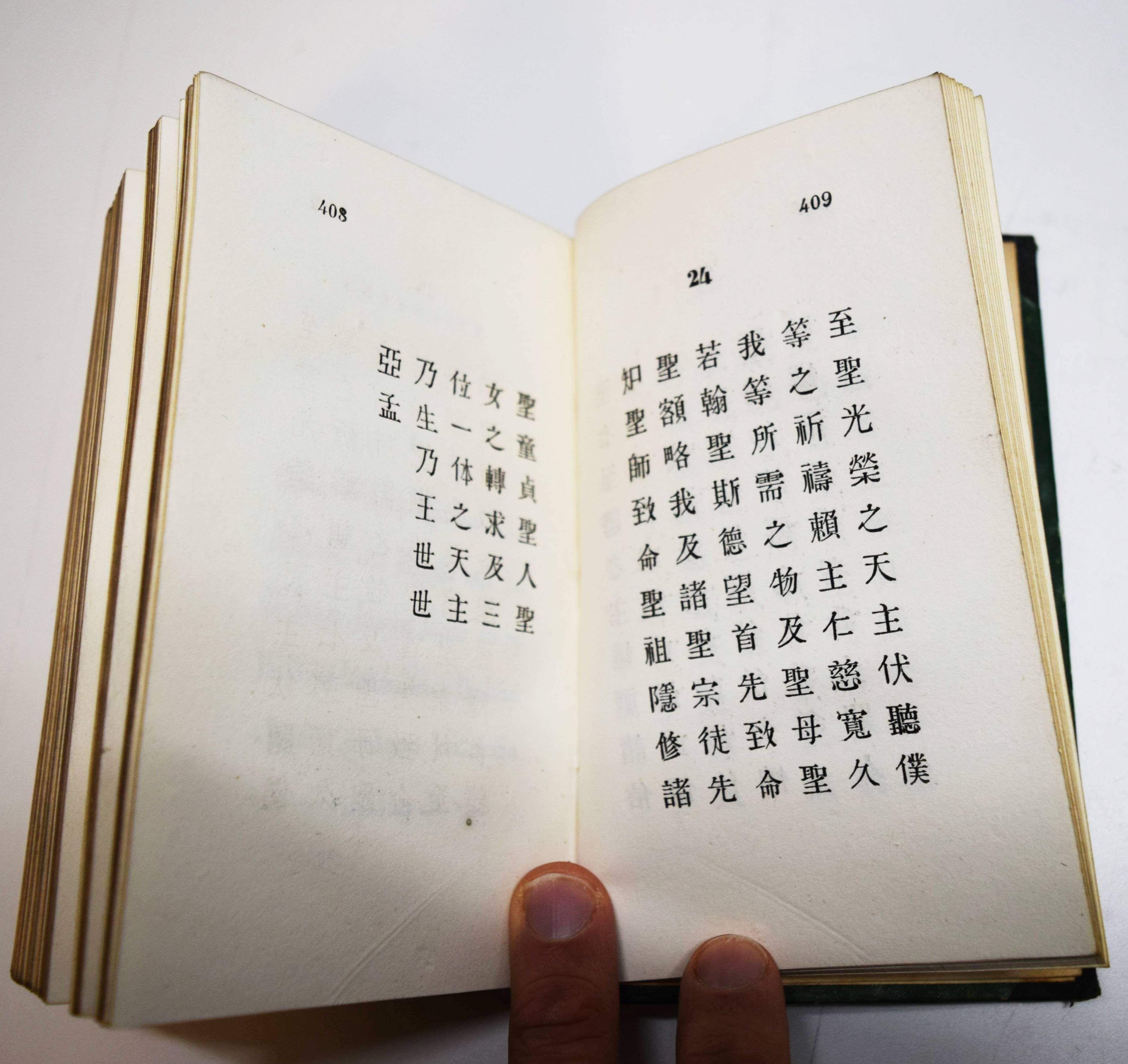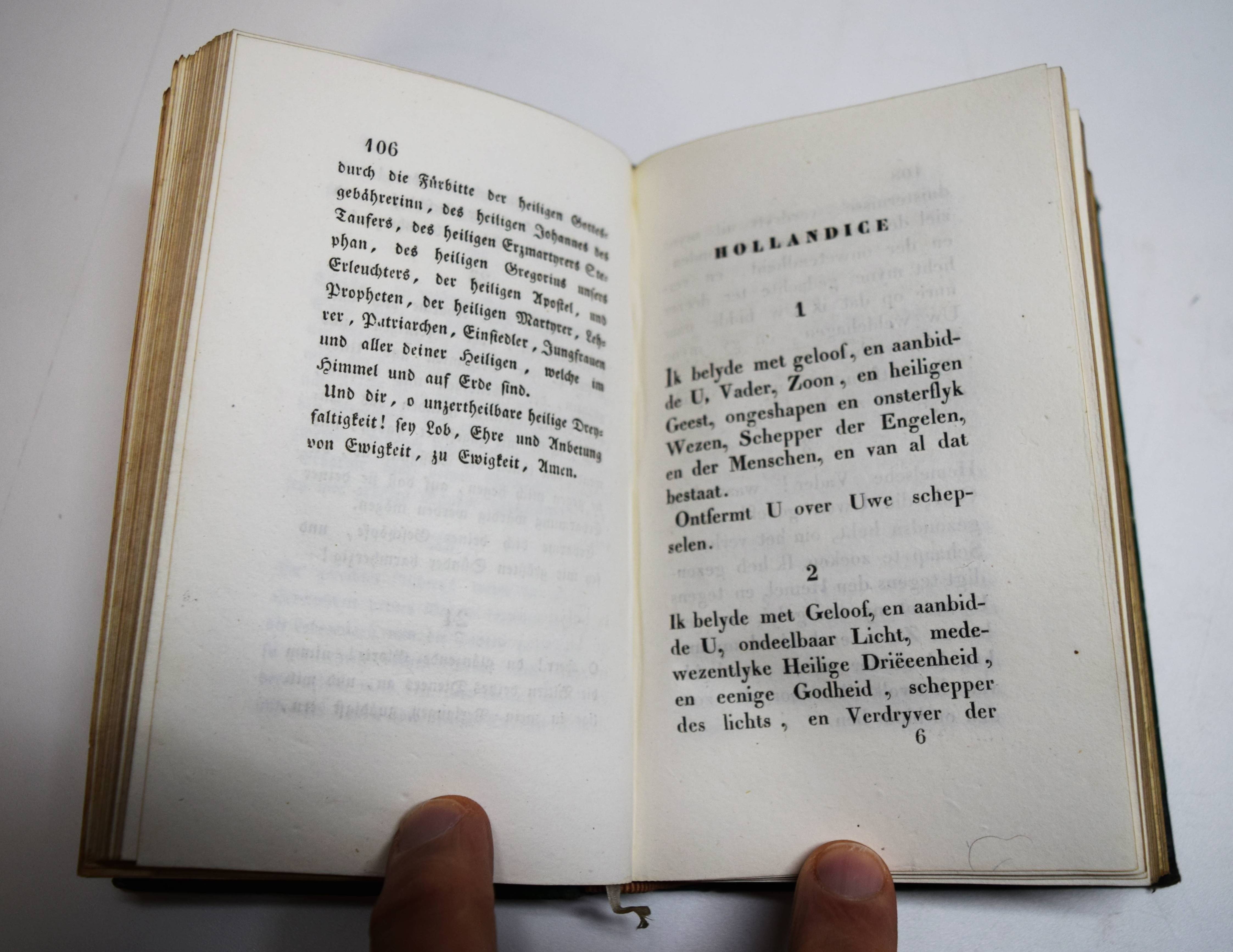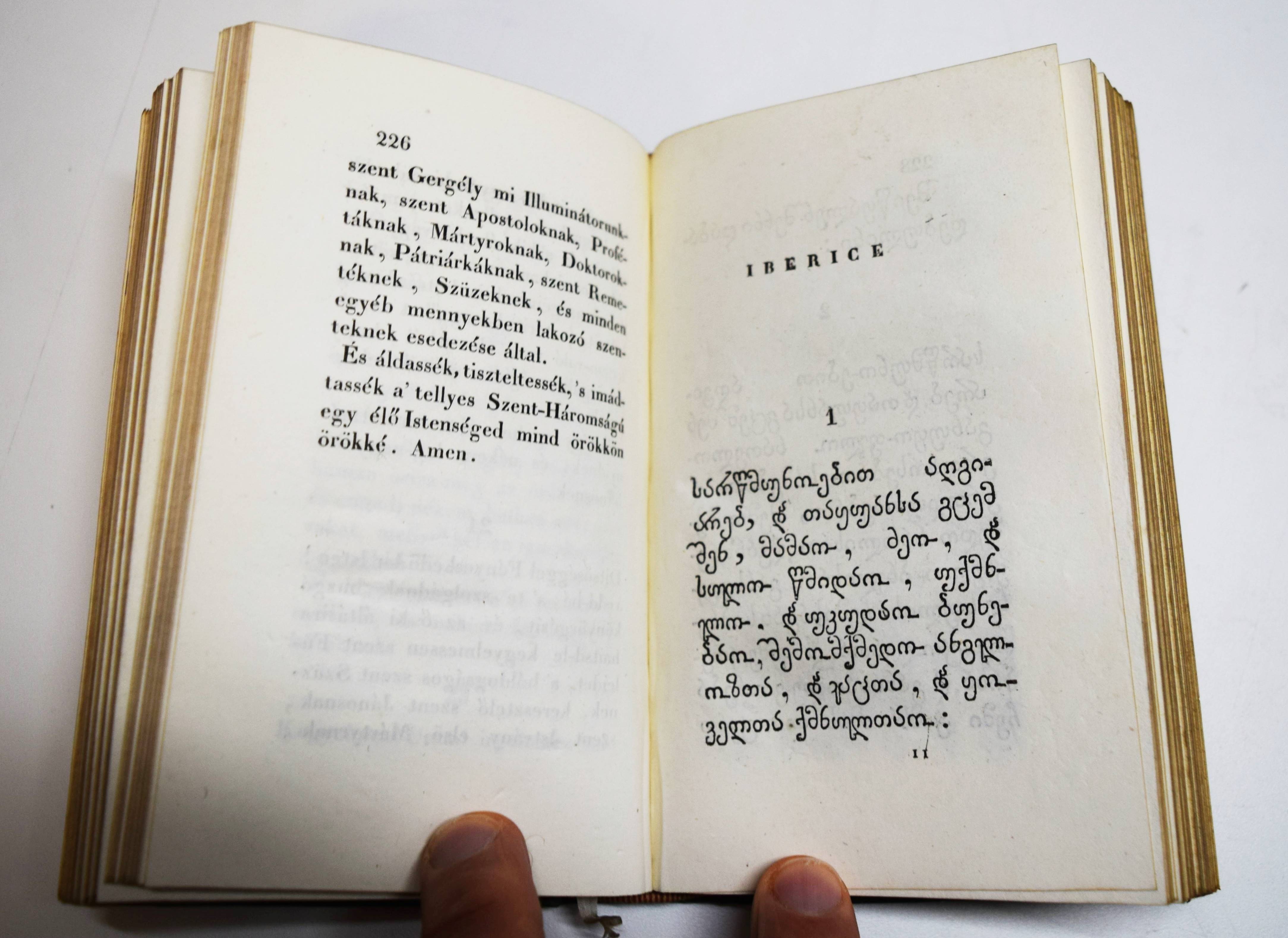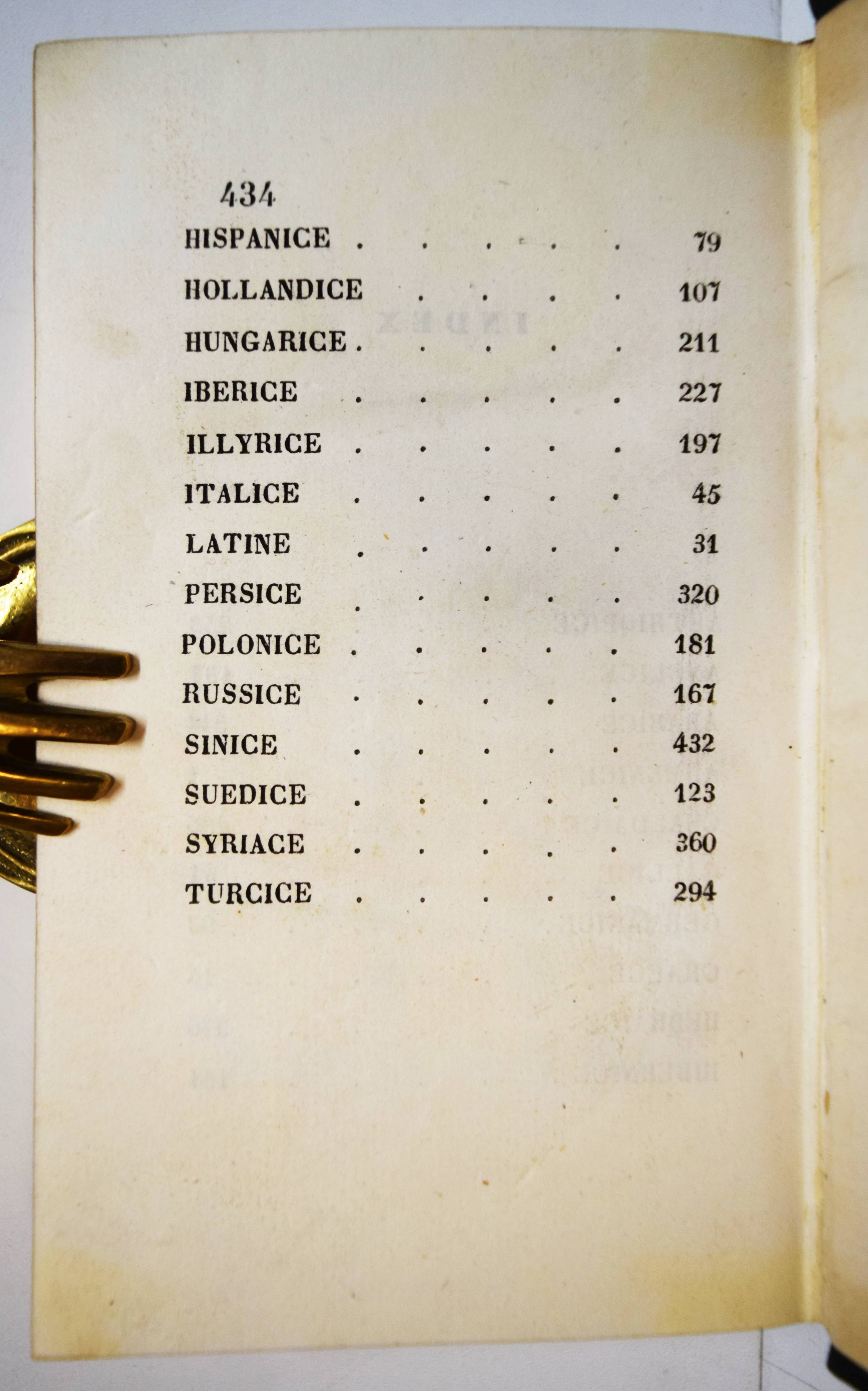 Preces S. Niersis Claiensis Aremeniorum Patriarchae. Viginti quatuor linguis coitae. Venetiis (Venedig), Insula S. Lazari 1837. Kl.-8°. [3], 434 S. mit gestoch. Frontispiz, gestoch. Titel und 1 Kupferstich (Medaille). Dunkelgrüner Halblederband der Zeit mit goldgepr. Rückentitel, Romantikervergoldung und Goldschnitt. Brunet IV, 859. Wetzer/Welke IX, 162. – Dritte Ausgabe des seltenen polyglotten Gebetbuchs. – Mit Gebeten des armenischen Patriarchen und Lyrikers St. Nierses IV (1098-1173, Nersês IV, Klayec`i, genannt Snorhali) in 24 Sprachen, u.a.: Armenisch, Syrisch, Persisch, Russisch, Griechisch, Latein, Italienisch, Französisch, Spanisch, Deutsch, Englisch, Ungarisch, Türkisch etc. – Die Mechitharistendruckerei auf St. Lazaro bei Venedig, war berühmt für ihre Editionen in orientalischen Sprachen. – Sehr gutes sauberes und dekorativ gebundenes Exemplar.