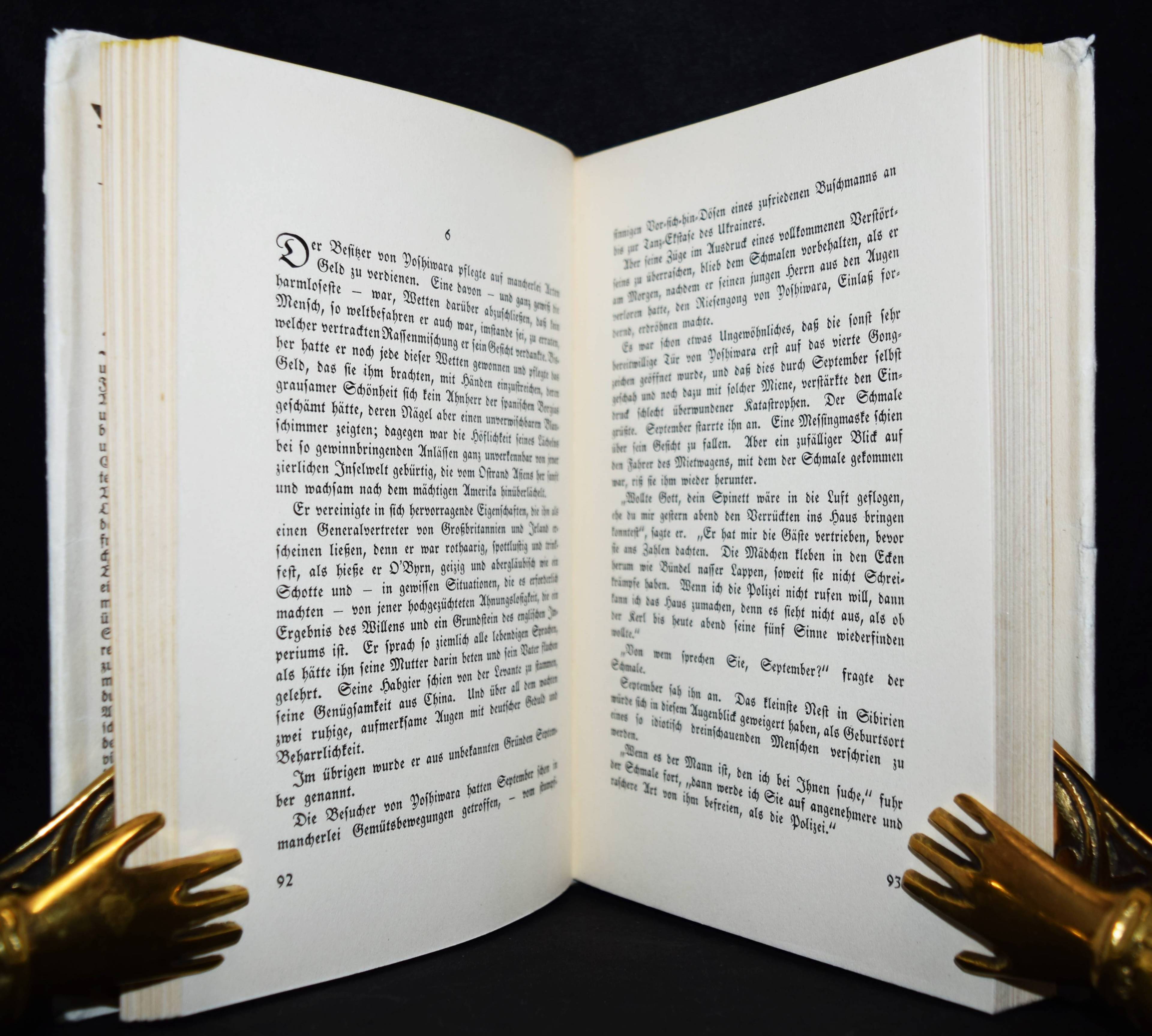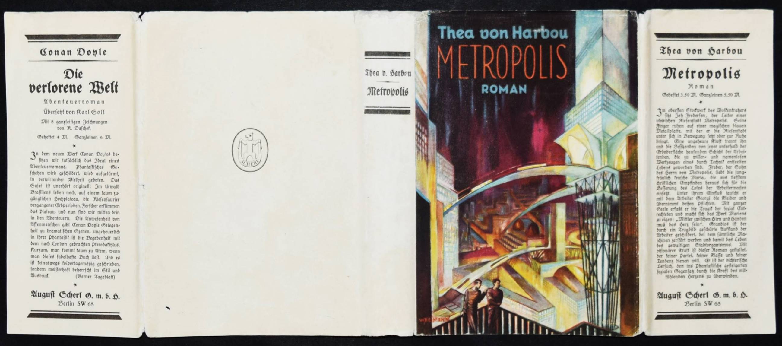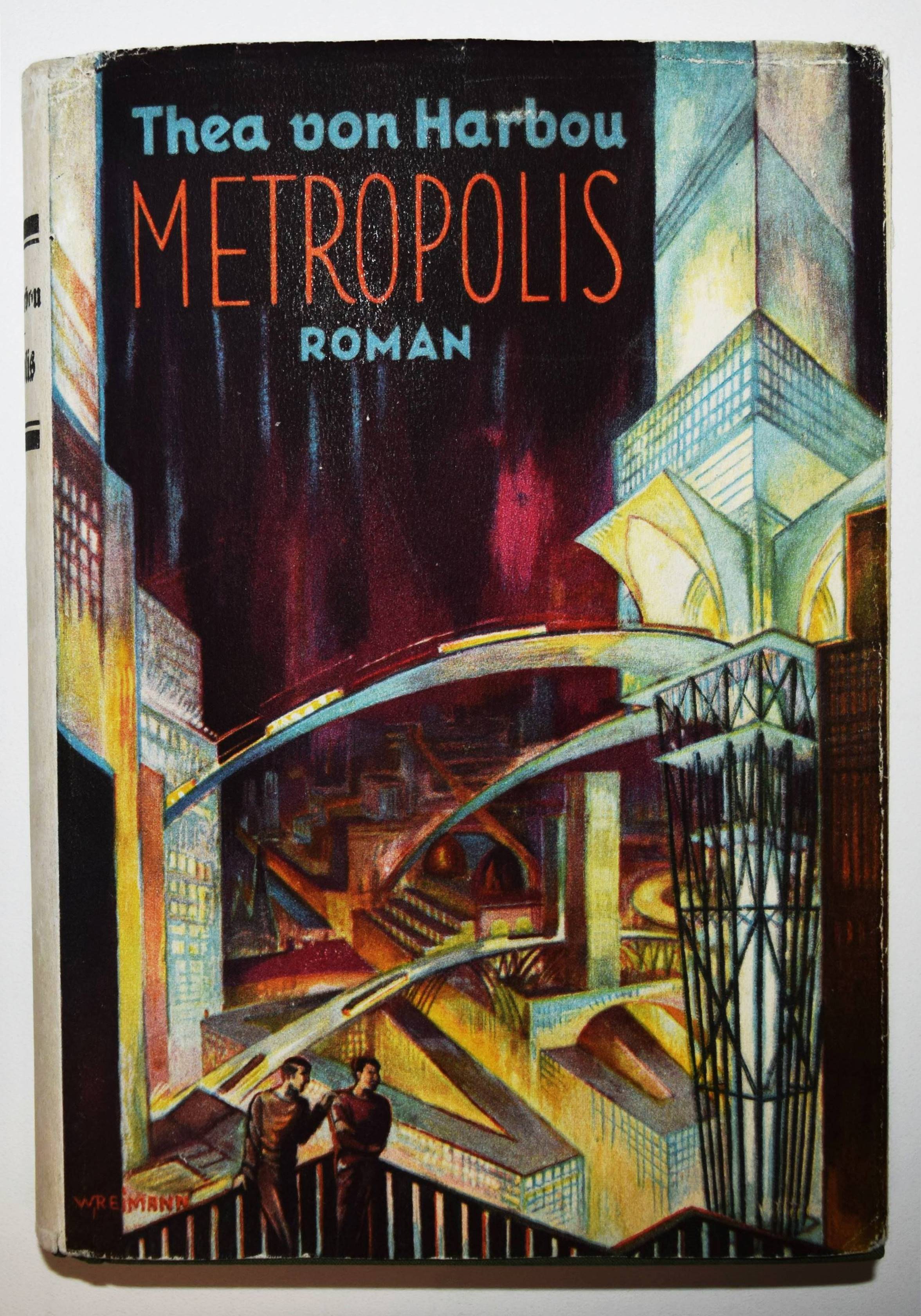 Harbou, Thea (Gabriele) v. Metropolis. Roman. Berlin, August Scherl (1926). 8°. 273, (1) S., [3] Bl. Orig.-Leinenband mit goldgepr. Rücken- und Deckeltitel, Rückenvergoldung und farbig illustr. Schutzumschlag von W(ilhelm Albert Walter) Reimann. Barron 3-23. Bleiler, Science-Fiction 1940. Holstein S. 211 (kart. Ausgabe). Kosch VII, 318 f. NDB VII, 645 f. Rössler, Filmfieber S. 116. – Erste Ausgabe. – T. G. v. Harbou (1888-1954) „verzichtete in ihren Romanen auf Psychologie und Charakterzeichnung zugunsten einer schwülstig pathetischen Seelenschilderung und eines packenden Handlungsablaufes. – Wesentlich ist ihre Arbeit als Drehbuchautorin. Der zum Monumentalen neigende, teils architektonisch strenge, teils phantastische und legendenhafte Stil der Stummfilme Fritz Langs ist von ihr entscheidend mitbestimmt worden. … Ihre hervorragende Begabung, eine Handlung in die Bildersprache des Films zu übersetzen, erweist sich besonders bei der Bearbeitung literarischer Werke. … H. hat einen wesentlichen Einfluß auf die Entwicklung des deutschen Films ausgeübt, sie ist keineswegs nur eine vielbeschäftigte Routineschreiberin“ (R. Burgmer in NDB). – Mit dem seltenen Schutzumschlag des Malers, Filmarchitekten und Drehbuchautors W. A. W. Reimann (1887-1936), der bereits 1919 die Kulissen und Kostüme für den expressionistischen Film-Klassiker „Das Cabinet des Dr. Caligari“ entworfen hat. – Der Schutzumschlag am Kapital unauffällig restauriert und an den Kanten geringf. berieben, außergewöhnlich schönes und sauberes Exemplar. – The dust jacket unobtrusively restored at the spine and slightly rubbed at the edges, an exceptionally nice and clean copy.