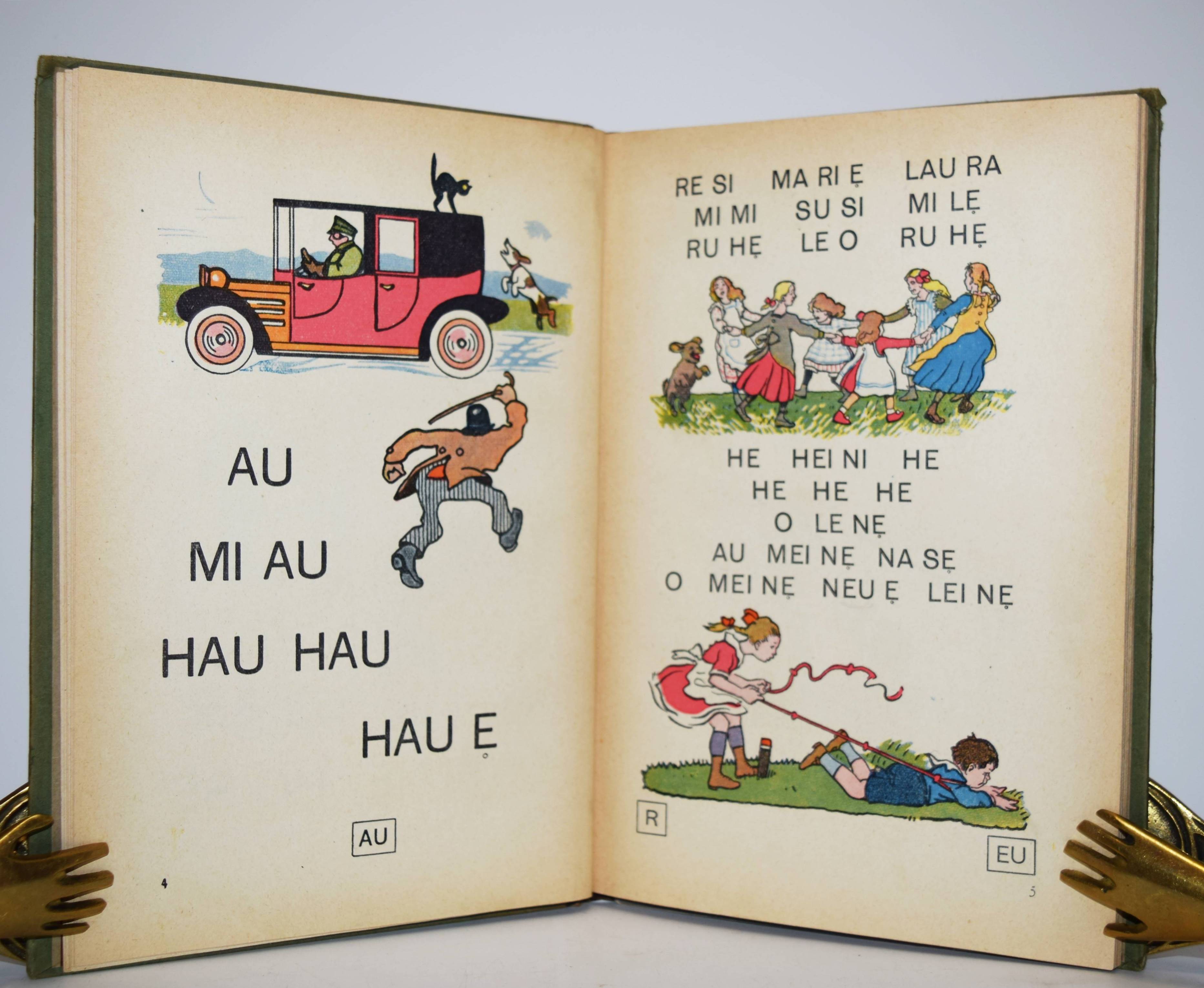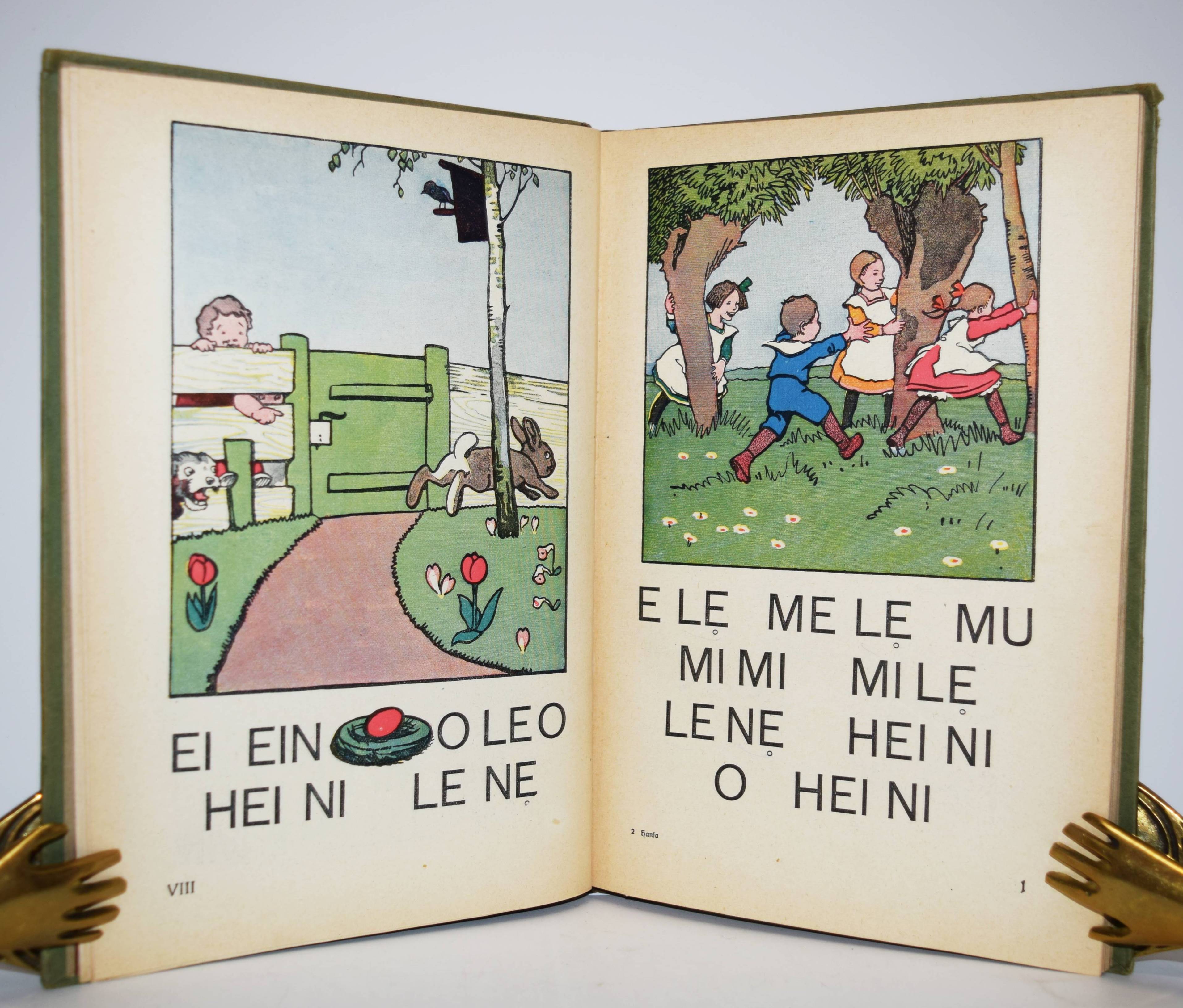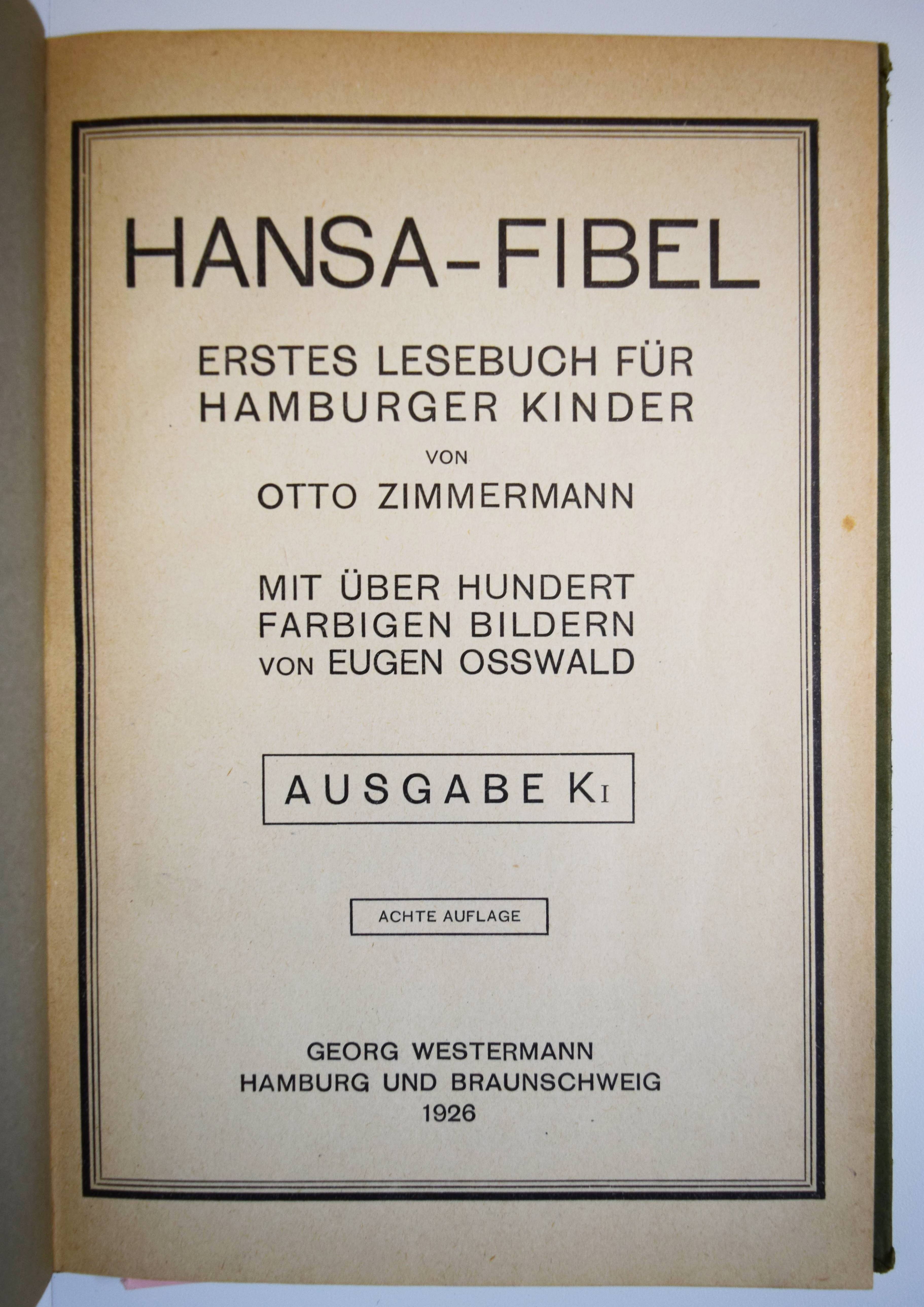 Fibel – Zimmermann, Otto. Hansa-Fibel. Erstes Lesebuch für Hamburger Kinder. Ausgabe K I. 8. Auflage. Braunschweig und Hamburg, Georg Westermann 1926. 8°. Titel, VIII, 104 S. mit farbigen Illustrationen von Eugen Osswald. Illustr. Orig.-Halbleinenband. Vgl. Bilderwelt 1962. May-Schweitzer 103 (mit 3 Abb.). Müller 82. Ries 762, 24. Waldschmidt 90 (mit Abb. S. 51). – „Die „Hansa-Fibel“ ist ein Meilenstein deutscher Fibelgeschichte. Sie ist Vorbild für eine Vielzahl anderer Fibeln geworden. Sie hat Figuren, Typen, Motive und Szenen geschaffen, die immer wieder aufgegriffen und variiert worden sind. Die Fibel spiegelt die aufgeklärte und psychologisch bewußte und geschulte Pädagogik der zwanziger Jahre wieder. Ursprünglich für die Hamburger Schulen konzipiert fand sie in ganz Deutschland Verbreitung und Nachahmung“ (May-Schweitzer). – „Nach Zimmermann soll die Fibel sowohl für den Synthetiker als auch den Analytiker zu gebrauchen sein. Der letzte möge die ersten Seiten überschlagen… Daß die Bilder nicht nur der Lautvermittlung dienen sollen, sondern auch den Kindern Spaß und Freude machen werden, sieht man ihnen an“ (Havekost-Klattenhoff C-22). – Sehr gutes Exemplar der berühmten Fibel.