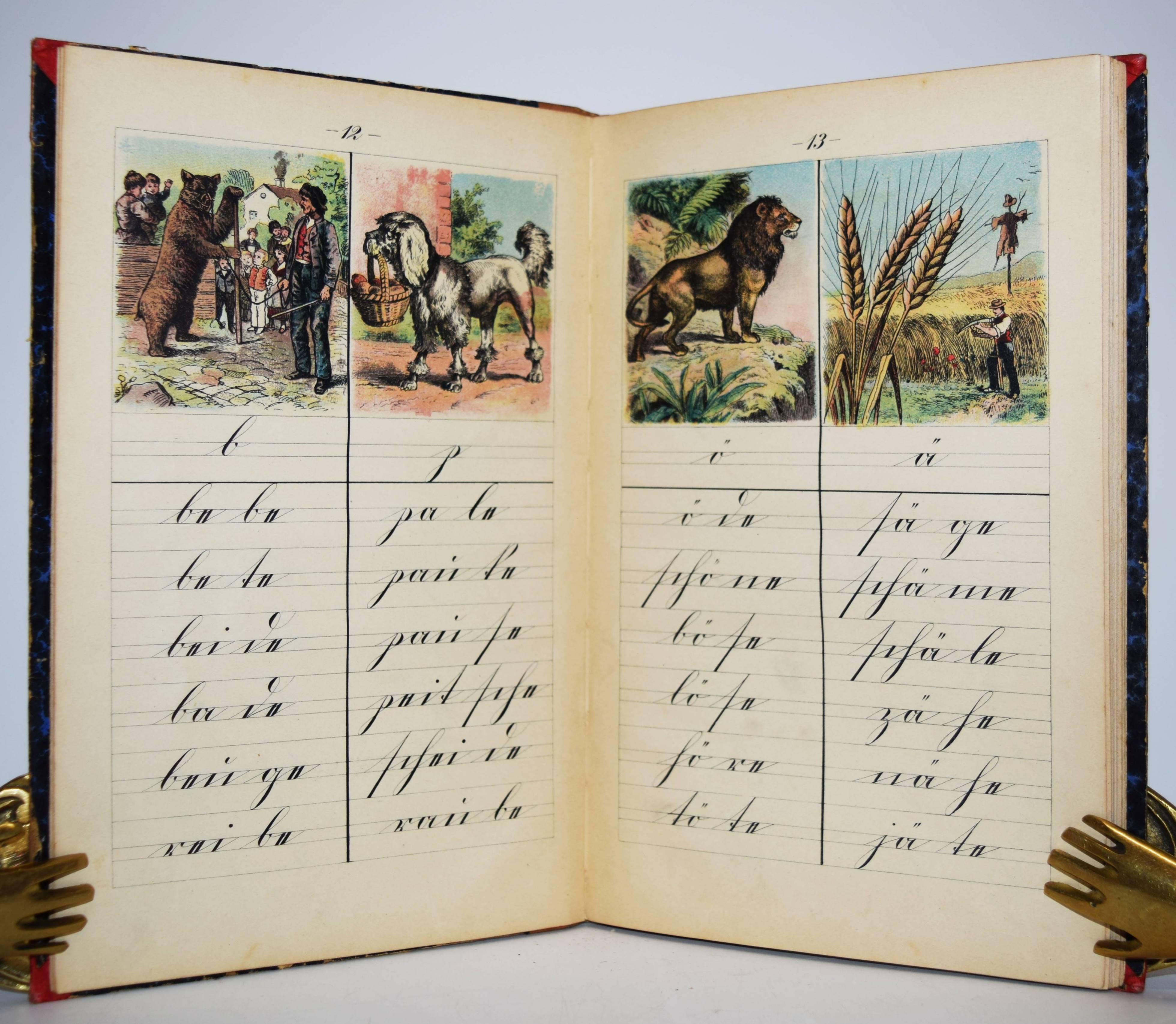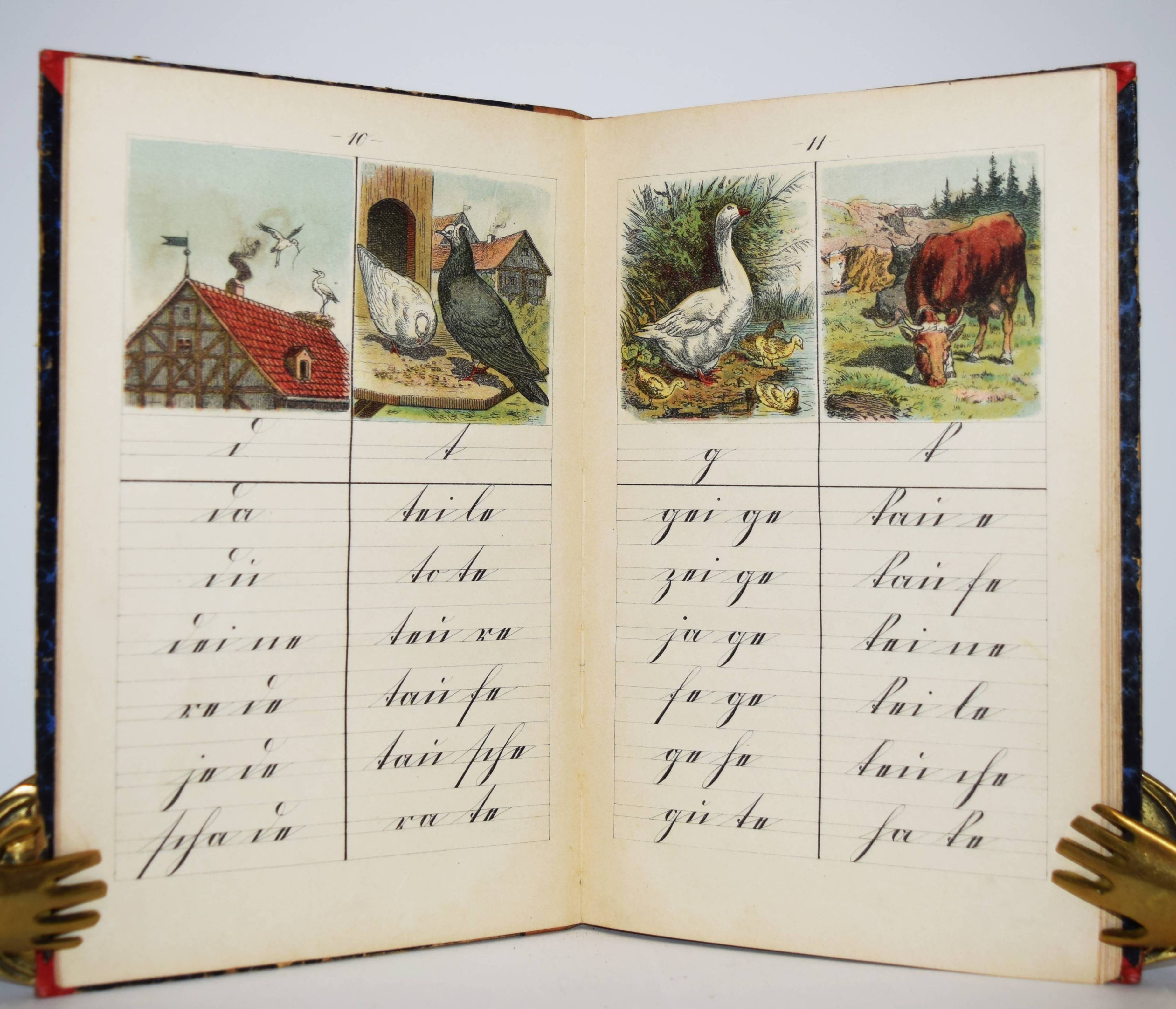 Fibel – Brinkmann, Wilhelm. Erste Fibel. Hilfsbüchlein beim Unterricht im Schreib-Lesen. Nach den Grundsätzen der Lautlehre und Rechtschreibung bearbeitet. Mit Bildern (von Joseph Correggio und Ludwig Richter). 3. Auflage. Gütersloh, C. Bertelsmann 1906. 8°. [2] Bl., 93, (1) S. mit 52, (30 chromolithogr.) Illustrationen. Halbleinenband der Zeit. Bilderwelt 1941. May/Schweitzer 109 (spätere Ausgabe mit dem Titel „Fibel für die Grundschule“). Ries 477, 2 (9. Aufl. von 1913). – „Erlebnisunterricht und Lautlehre sind die didaktischen Leitlinien dieser Fibel. Lesenlernen heißt Verbinden von Lauten zu sinnvollen Worten und Sätzen. Diese abstrakte Denkleistung bettet die Fibel in dramatische Szenen ein, in der die Laute nicht nur Zeichen, sondern Aktanten sind und so für das Kind anschaulich sichtbar werden. „‚I‘‚ ruft das Kind, wenn es sich schmutzig gemacht hat; ‘’I“ kräht der Hahn und die Hühner picken und die Stacheln des Igels sehen so aus wie der Buchstabe selber“ (May/Schweitzer). _ Der Frankfurter Maler J. Correggio (1870-1962) hat 1910 auch eine Frankfurter Fibel ausgestattet. – Einband etwas berieben und fleckig, sonst gut erhalten.