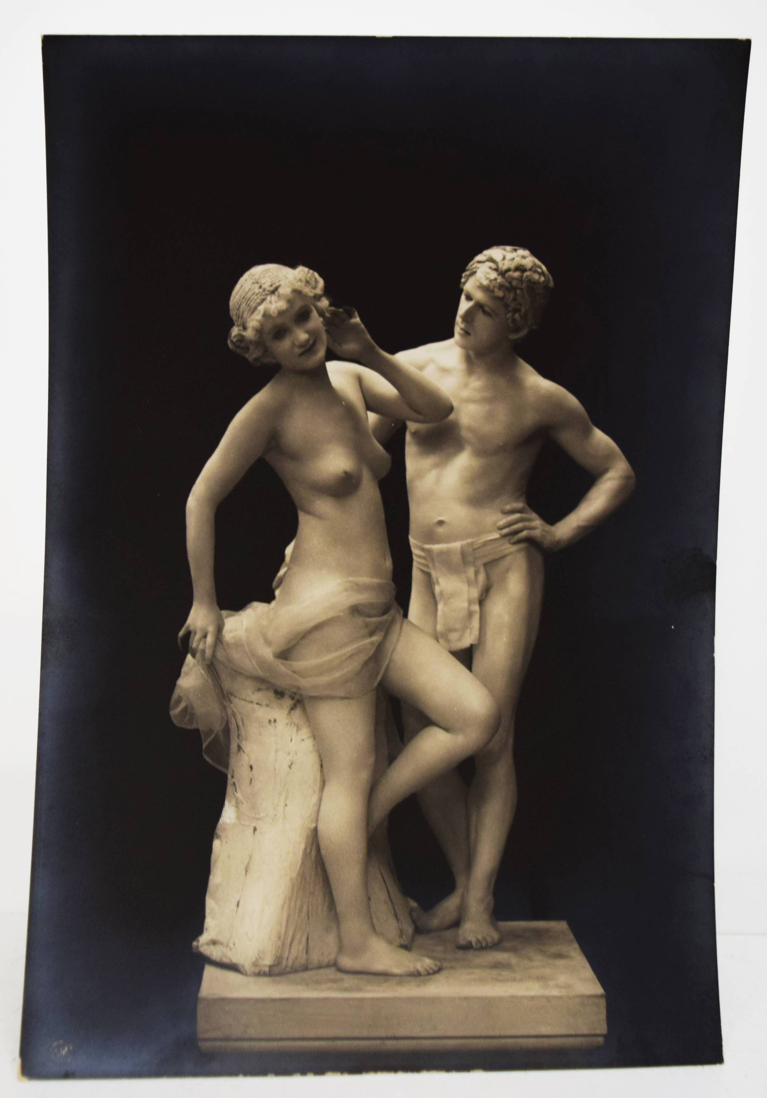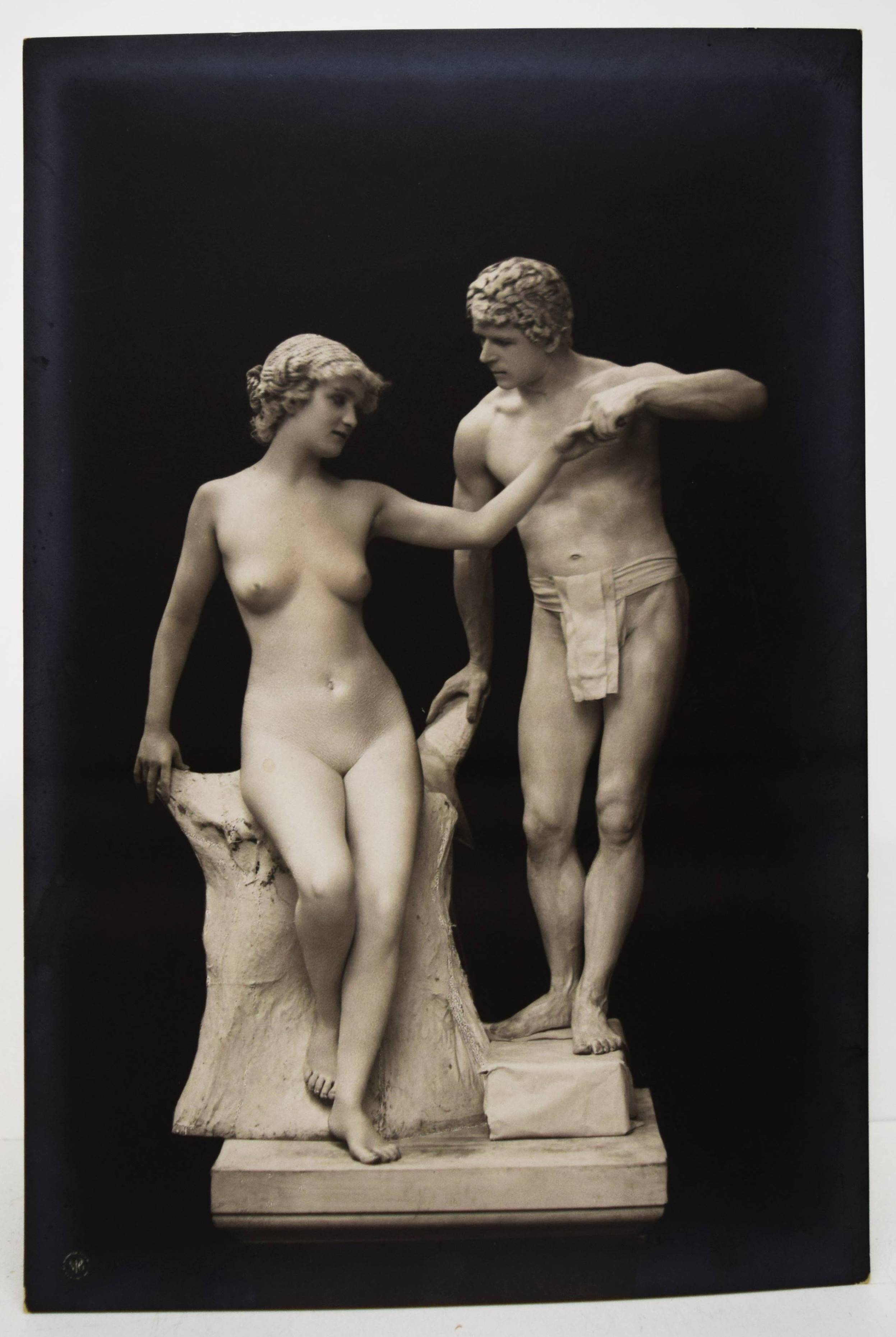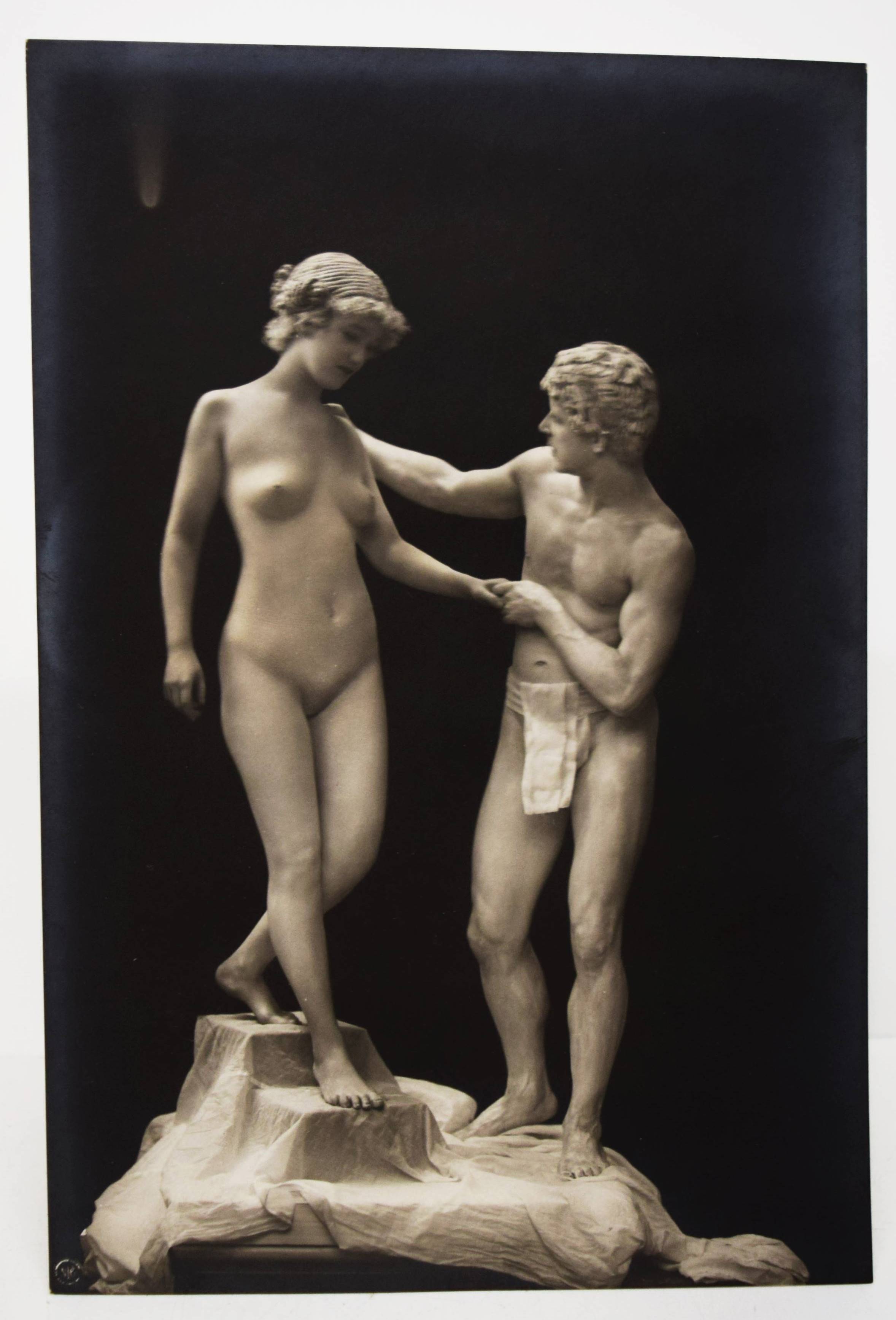 Skowraneck – (Thielert, Max, Vorwort). Lebende Marmorgruppen (Lebende Marmor-Bildwerke). (Dargestellt an den Schönheit-Abenden in Berlin von Olga Desmond und Adolf Salge). (Steglitz-Berlin, Neue Photographische Gesellschaft A.G.) o. J. (1908). Gr.-8° (23 x 15,5 cm.). Portfolio, 10 (statt 11) Orig.-Photographien (Bromsilber-Abzüge, 22 x 14,5 cm.) von Otto Skowraneck (auch Skowranek). Orig.-Halbleinen-Flügelmappe mit Deckeltitel und Deckelvignette. Heidtmann 18739. Vgl. Derra de Moroda 164 (Schwertertanz). – Im selben Jahr wie das berühmte Portfolio „Schwertertanz“ erschienen. Mit Aktaufnahmen der Tänzerin Olga Desmond und des Athleten Adolf Salge, mit weiß gepuderter Haut als „Marmor-Skulpturen“, wie den „Raub der Sabinerinnen“, „Das Weib oder die Vase“ oder „Die badende Psyche“. – Die Tänzerin Olga Desmond (1890-1964), „Preußens nackte Venus“ (J. E. Runge), „in einer Reihe mit Adorée Villani und der berüchtigten Mata Hari, begeisterte das Berliner Publikum mit „gewagten“ Nackttänzen“ (Müller/Stöckmann: „… jeder Mensch ist ein Tänzer“ S. 26 f.). 1907 begründete sie mit Karl Vanselow die sogenannten „Schönheit-Abende zur Förderung der Nacktkultur“ und trat erstmals in Berlin vor 1400 Zuschauern auf, später auch in Dresden, Leipzig, Breslau und St. Petersburg. Die Tanz- und Pantomime-Vorführungen verursachten Stürme der Entrüstung. 1909 wurden ihre Auftritte im Berliner Wintergarten polizeilich verboten und sorgten für einen Skandal, der sogar den Preußischen Landtag beschäftigte. Nach dem Ersten Weltkrieg machte O. Desmond als Fim- und Theaterschauspielerin Karriere. Olga Desmond trat mit ihrem Partner Adolf Salge von „The Seldoms“ u. a. in London, St. Petersburg, Warschau, Wien, Budapest und Paris auf. – „1894 begann die Neue Photographische Gesellschaft (N.P.G.) in Berlin-Schöneberg mit der Verarbeitung von Bromsilbergelatine-Entwicklungspapieren. Das Fotopapier war seit 1880 auf dem Markt und damit längst bekannt, aber erst die N.P.G. entwickelte unter der Bezeichnung „Kilometer-Photographie“ ein Verfahren, es für die Massenanfertigung zu nutzen. Dies hatte inerhalb kürzester Zeit immense Folgen für das gesamte Fotografiegewerbe“ (Karin Walter, Aktuelle Bilder vom laufenden Band, Die Postkartenproduktion der N.P.G., S. 56 ff. in Gütgemann-Holtz, Neue Photographische Gesellschaft Steglitz). – Vorderdeckel etwas braunfleckig, ohne das Textheft, außerdem fehlt eine Aufnahme der bekleideten O. Desmond, sonst gut erhalten.