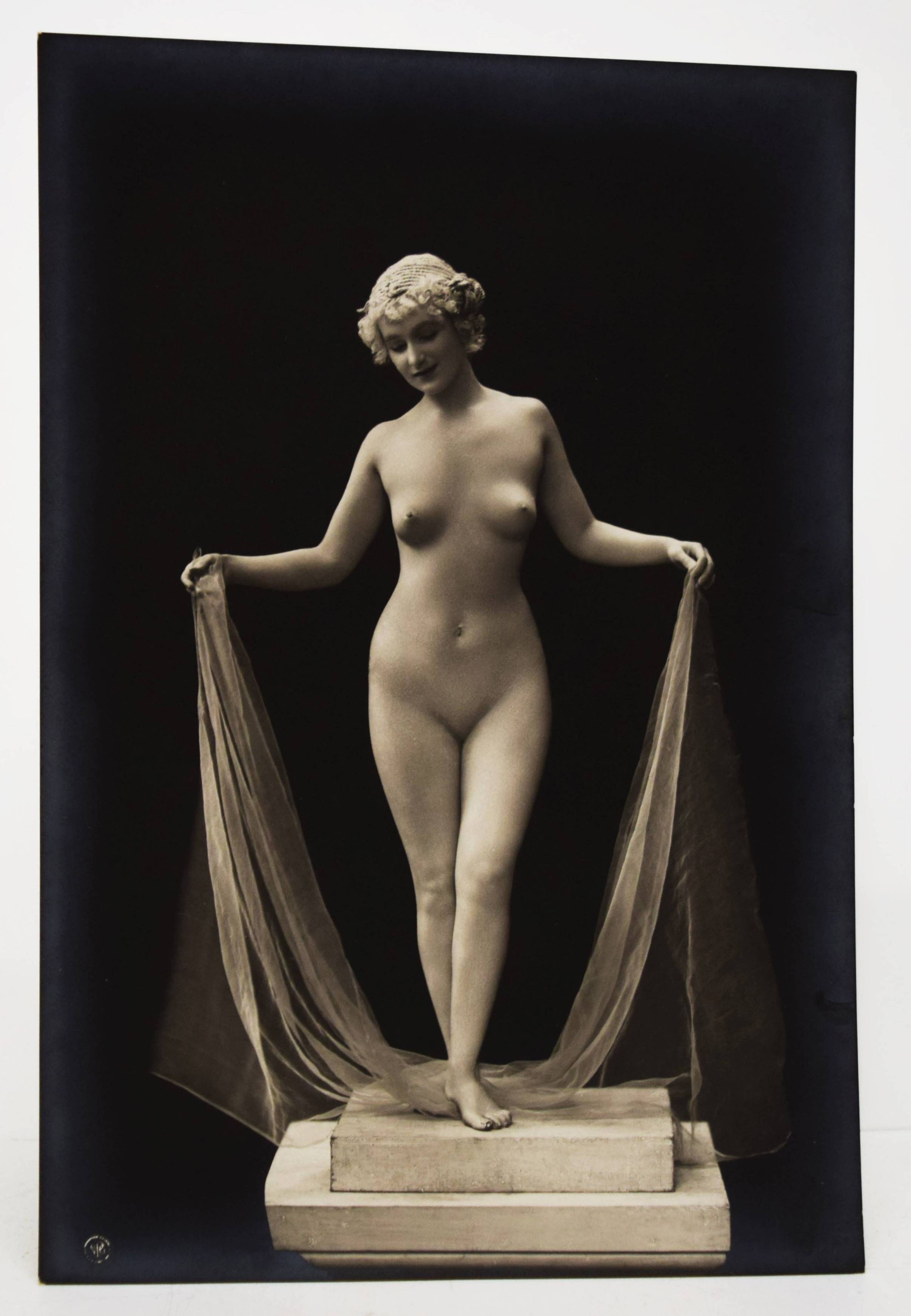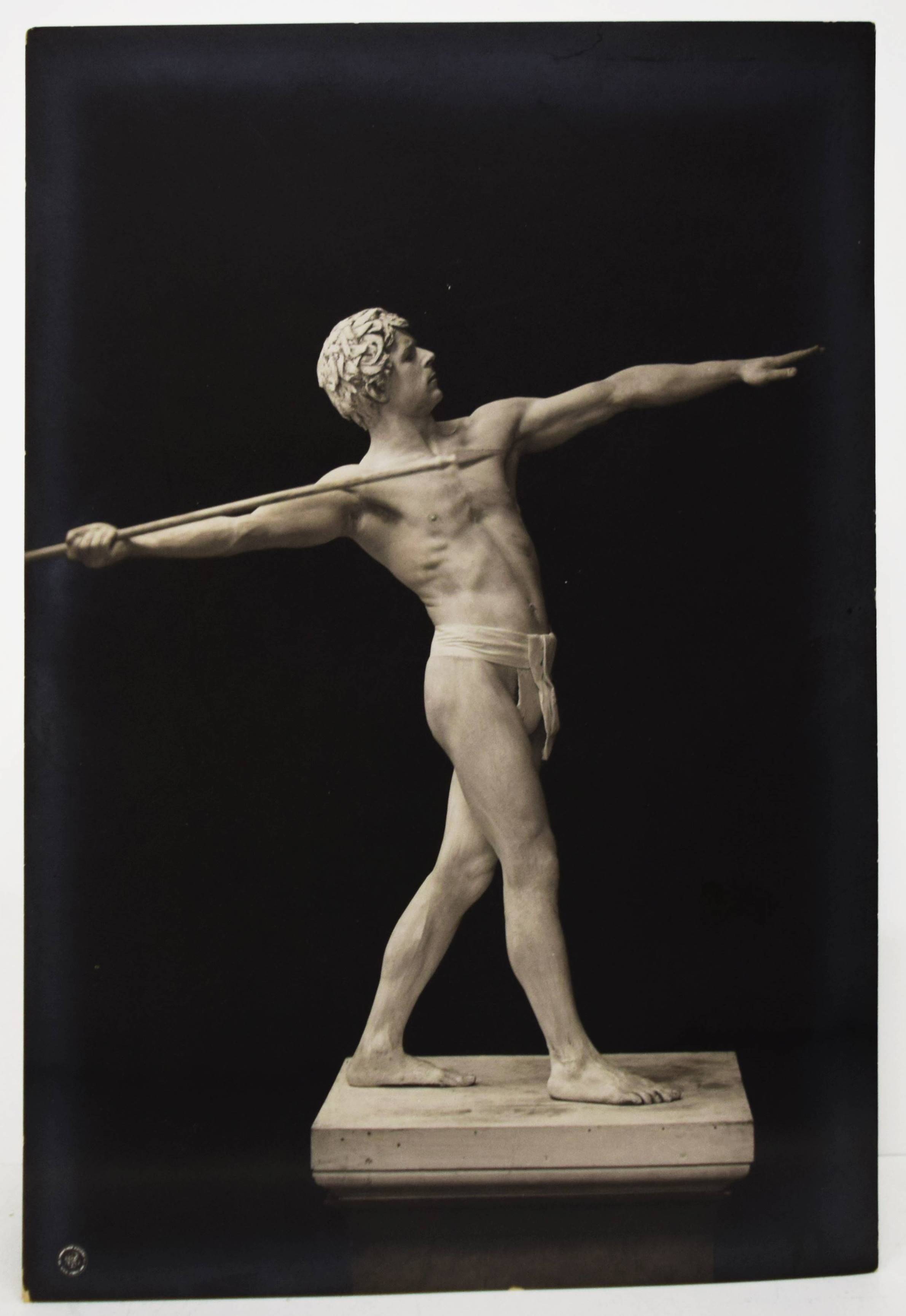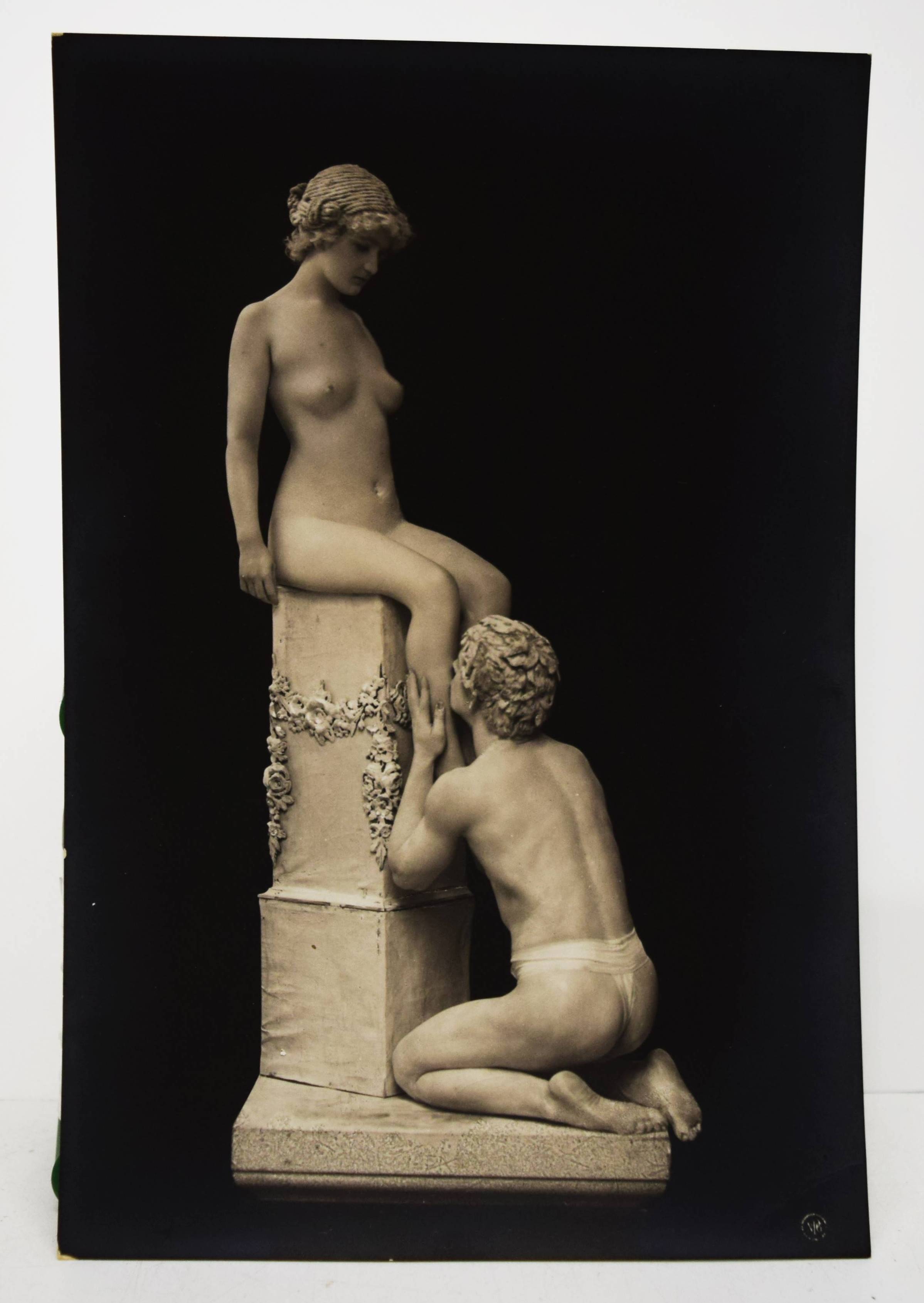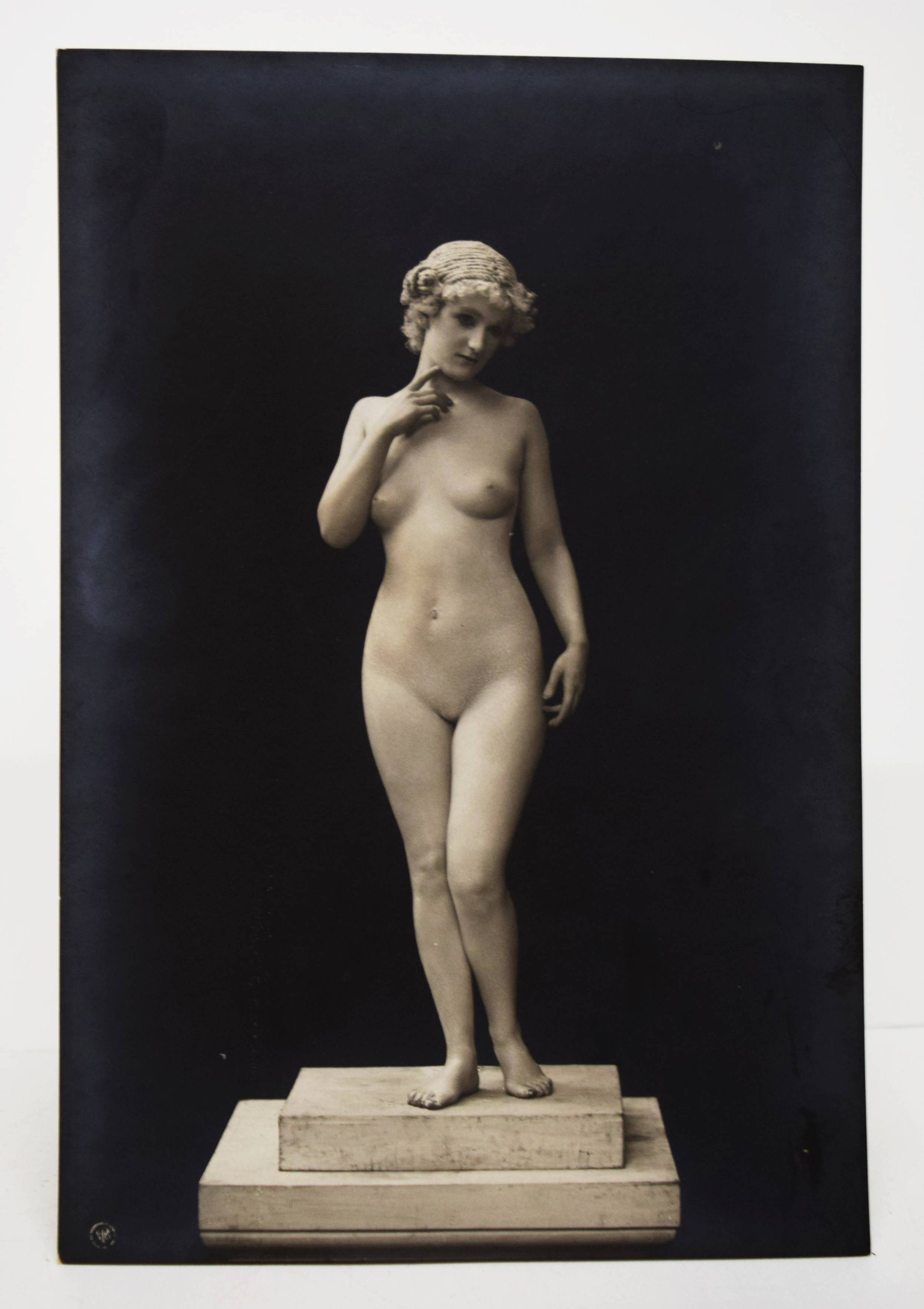 Skowraneck – (Thielert, Max, Vorwort). Lebende Marmorgruppen (Lebende Marmor-Bildwerke). (Dargestellt an den Schönheit-Abenden in Berlin von Olga Desmond und Adolf Salge). (Steglitz-Berlin, Neue Photographische Gesellschaft A.G.) o. J. (1908). Gr.-8° (23 x 15,5 cm.). Portfolio, 10 (statt 11) Orig.-Photographien (Bromsilber-Abzüge, 22 x 14,5 cm.) von Otto Skowraneck (auch Skowranek). Orig.-Halbleinen-Flügelmappe mit Deckeltitel und Deckelvignette. Heidtmann 18739. Vgl. Derra de Moroda 164 (Schwertertanz). – Im selben Jahr wie das berühmte Portfolio „Schwertertanz“ erschienen. Mit Aktaufnahmen der Tänzerin Olga Desmond und des Athleten Adolf Salge, mit weiß gepuderter Haut als „Marmor-Skulpturen“, wie den „Raub der Sabinerinnen“, „Das Weib oder die Vase“ oder „Die badende Psyche“. – Die Tänzerin Olga Desmond (1890-1964), „Preußens nackte Venus“ (J. E. Runge), „in einer Reihe mit Adorée Villani und der berüchtigten Mata Hari, begeisterte das Berliner Publikum mit „gewagten“ Nackttänzen“ (Müller/Stöckmann: „… jeder Mensch ist ein Tänzer“ S. 26 f.). 1907 begründete sie mit Karl Vanselow die sogenannten „Schönheit-Abende zur Förderung der Nacktkultur“ und trat erstmals in Berlin vor 1400 Zuschauern auf, später auch in Dresden, Leipzig, Breslau und St. Petersburg. Die Tanz- und Pantomime-Vorführungen verursachten Stürme der Entrüstung. 1909 wurden ihre Auftritte im Berliner Wintergarten polizeilich verboten und sorgten für einen Skandal, der sogar den Preußischen Landtag beschäftigte. Nach dem Ersten Weltkrieg machte O. Desmond als Fim- und Theaterschauspielerin Karriere. Olga Desmond trat mit ihrem Partner Adolf Salge von „The Seldoms“ u. a. in London, St. Petersburg, Warschau, Wien, Budapest und Paris auf. – „1894 begann die Neue Photographische Gesellschaft (N.P.G.) in Berlin-Schöneberg mit der Verarbeitung von Bromsilbergelatine-Entwicklungspapieren. Das Fotopapier war seit 1880 auf dem Markt und damit längst bekannt, aber erst die N.P.G. entwickelte unter der Bezeichnung „Kilometer-Photographie“ ein Verfahren, es für die Massenanfertigung zu nutzen. Dies hatte inerhalb kürzester Zeit immense Folgen für das gesamte Fotografiegewerbe“ (Karin Walter, Aktuelle Bilder vom laufenden Band, Die Postkartenproduktion der N.P.G., S. 56 ff. in Gütgemann-Holtz, Neue Photographische Gesellschaft Steglitz). – Vorderdeckel etwas braunfleckig, ohne das Textheft, außerdem fehlt eine Aufnahme der bekleideten O. Desmond, sonst gut erhalten.
