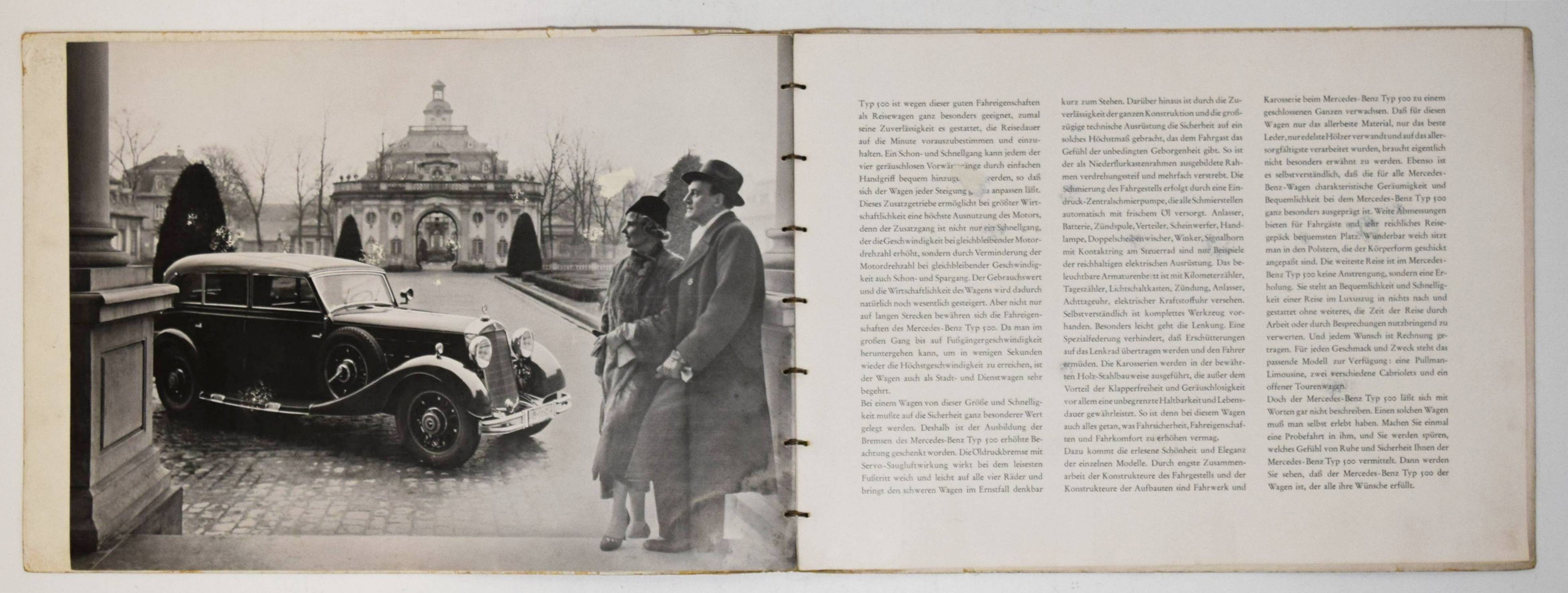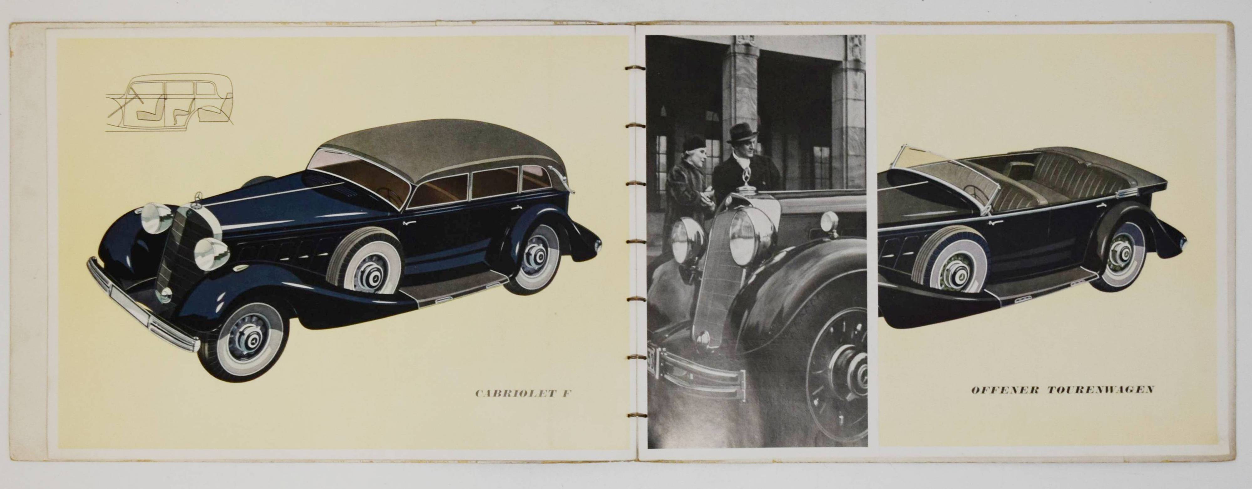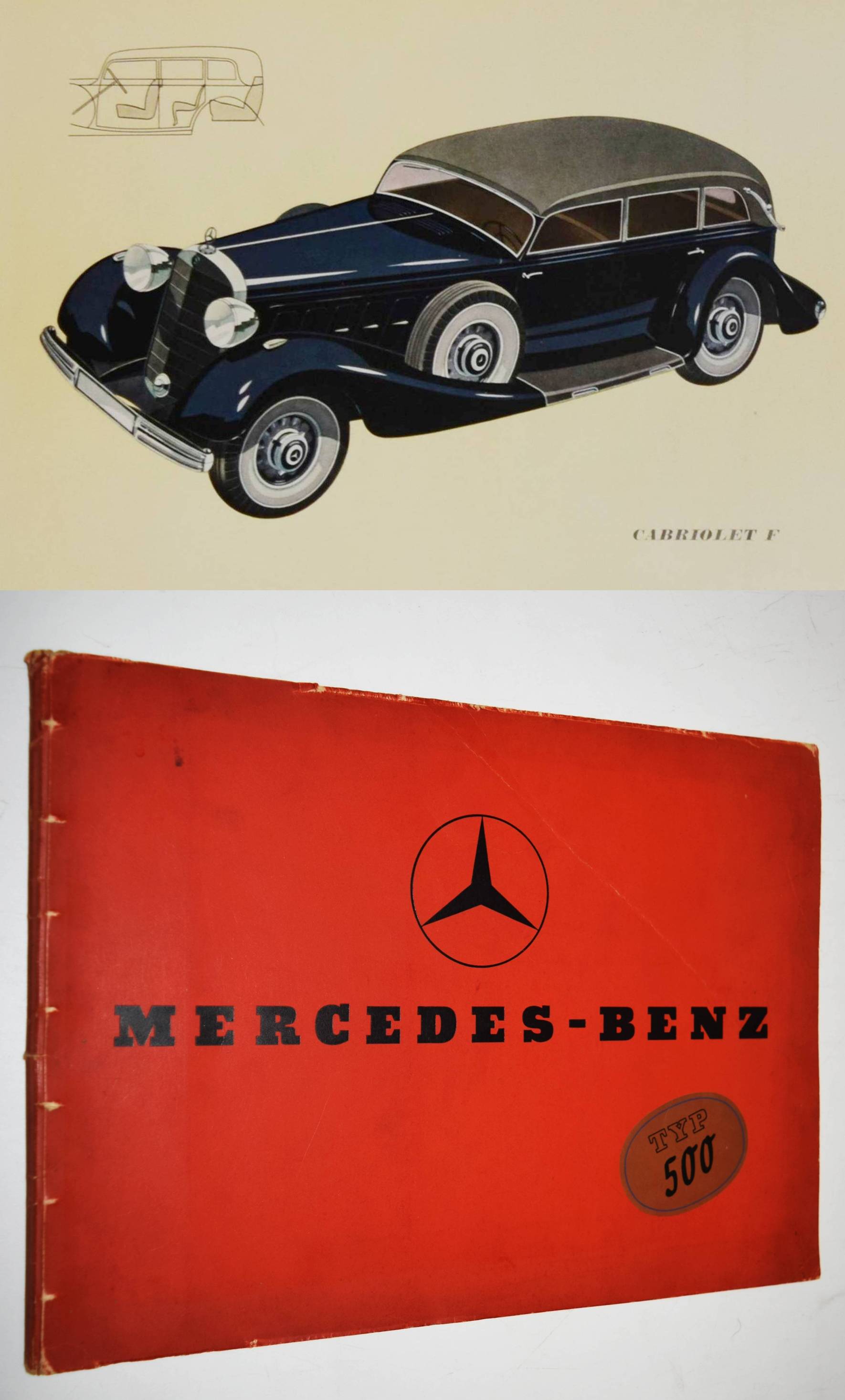 Mercedes Benz. Typ 500 (Nürburg, W 08). (Verkaufsprospekt). Stuttgart-Untertürkheim, Daimler-Benz Aktiengesellschaft (1937). Quer-4° (23 x 32 cm.). [5] Bl. mit 10 teils farbigen und ganzseitigen Abbildungen. Orangeroter Orig.-Kartonumschlag mit Metallring-Heftung. (Verlags-Nr. 6842. II. 837. W.). Seltener Originalprospekt für die große Mercedes-Limousine (Pullman), das Cabriolet „D“ und „F“ sowie den offenen Tourenwagen. – Mit 1 Fotografie des Tourenwagens und ganzs. farbigen Illustrationen der anderen Modelle. – „Der Mercedes-Benz W 08 war ein Pkw der Marke Mercedes-Benz und Nachfolger des Mercedes-Benz Typ 400. Er wurde unter dem Namen Mercedes-Benz 18/80 PS Typ Nürburg 460 im Herbst 1928 auf der Pariser Automobilausstellung als erstes Daimler-Benz-Fahrzeug mit Achtzylindermotor vorgestellt. … Auf dem langen Fahrgestell wurde ab 1931 zusätzlich ein Modell mit stärkerem Motor angeboten. Dieser hat 4918 cm³ Hubraum und leistet 100 PS (74 kW). Die Höchstgeschwindigkeit liegt bei 110 km/h. … 1936 erhielt der Wagen nochmals einen stärkeren Motor. Aus gleich gebliebenem Hubraum schöpft er 110 PS (81 kW) und beschleunigt das Fahrzeug bis auf 123 km/h. Kühlergrill und Windschutzscheibe wurden noch weiter nach hinten geneigt, der Querbügel zur Befestigung der Scheinwerfer fiel weg. 1939 wurde die Modellreihe nach insgesamt 3842 produzierten Fahrzeugen ohne Nachfolger eingestellt“ (Wikipedia). – Deckel angestaubt, sonst von leichten Gebrauchsspuren abgesehen sehr gut erhalten.