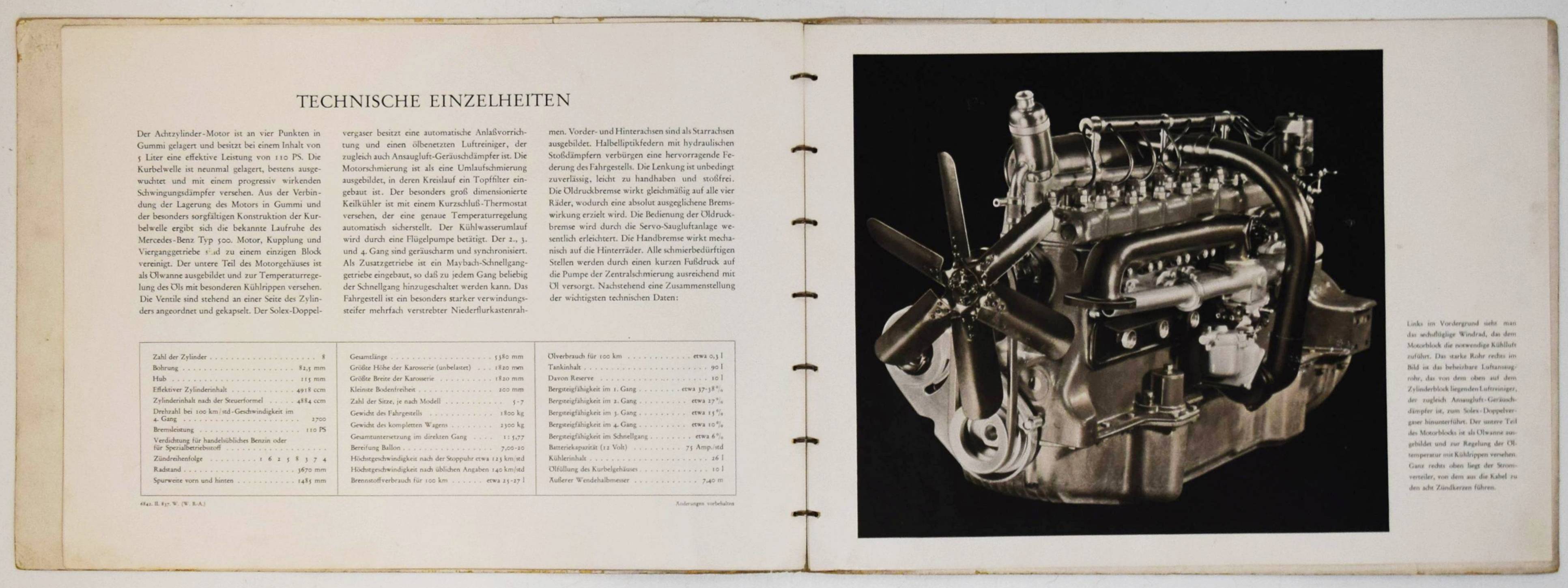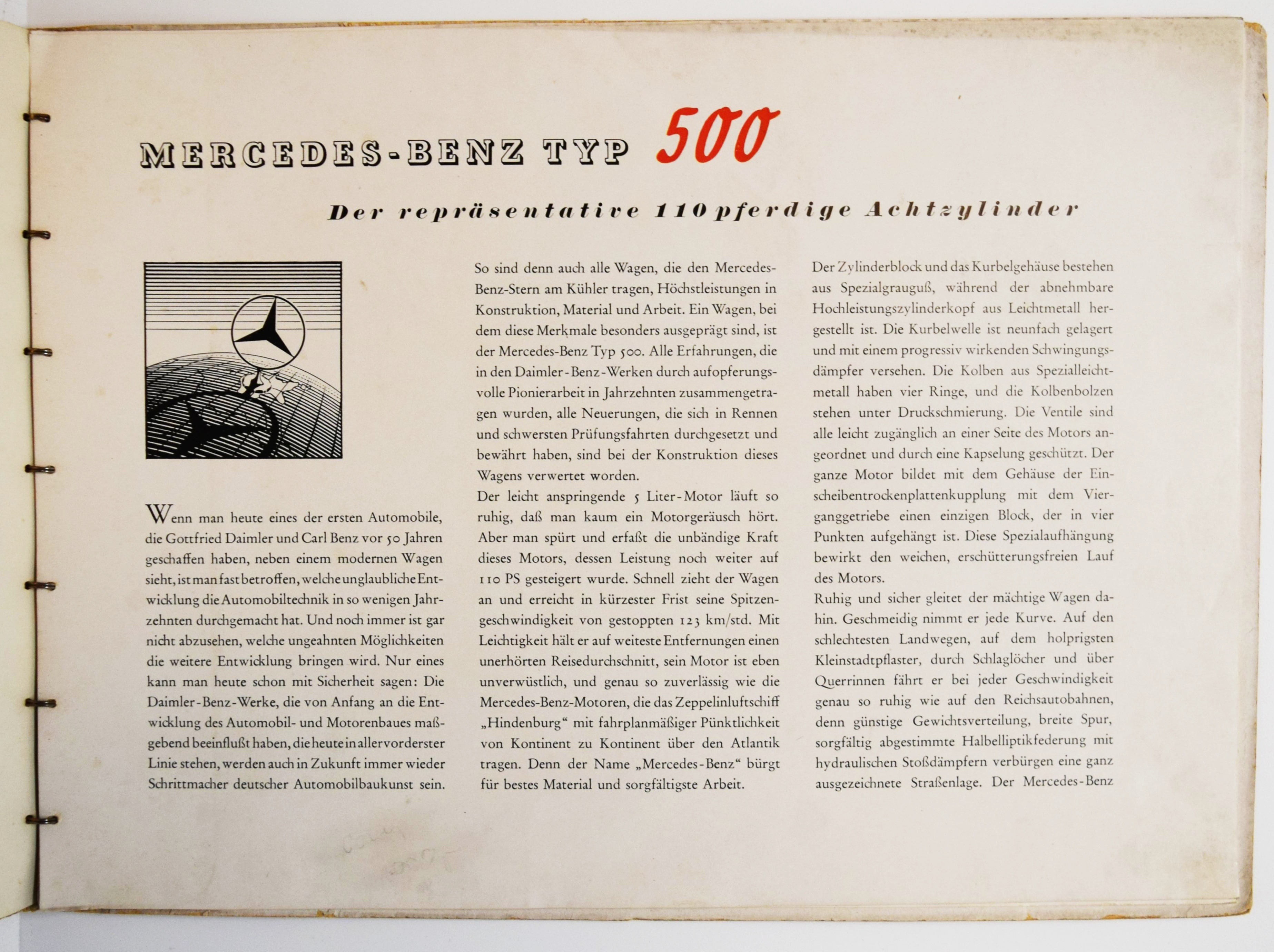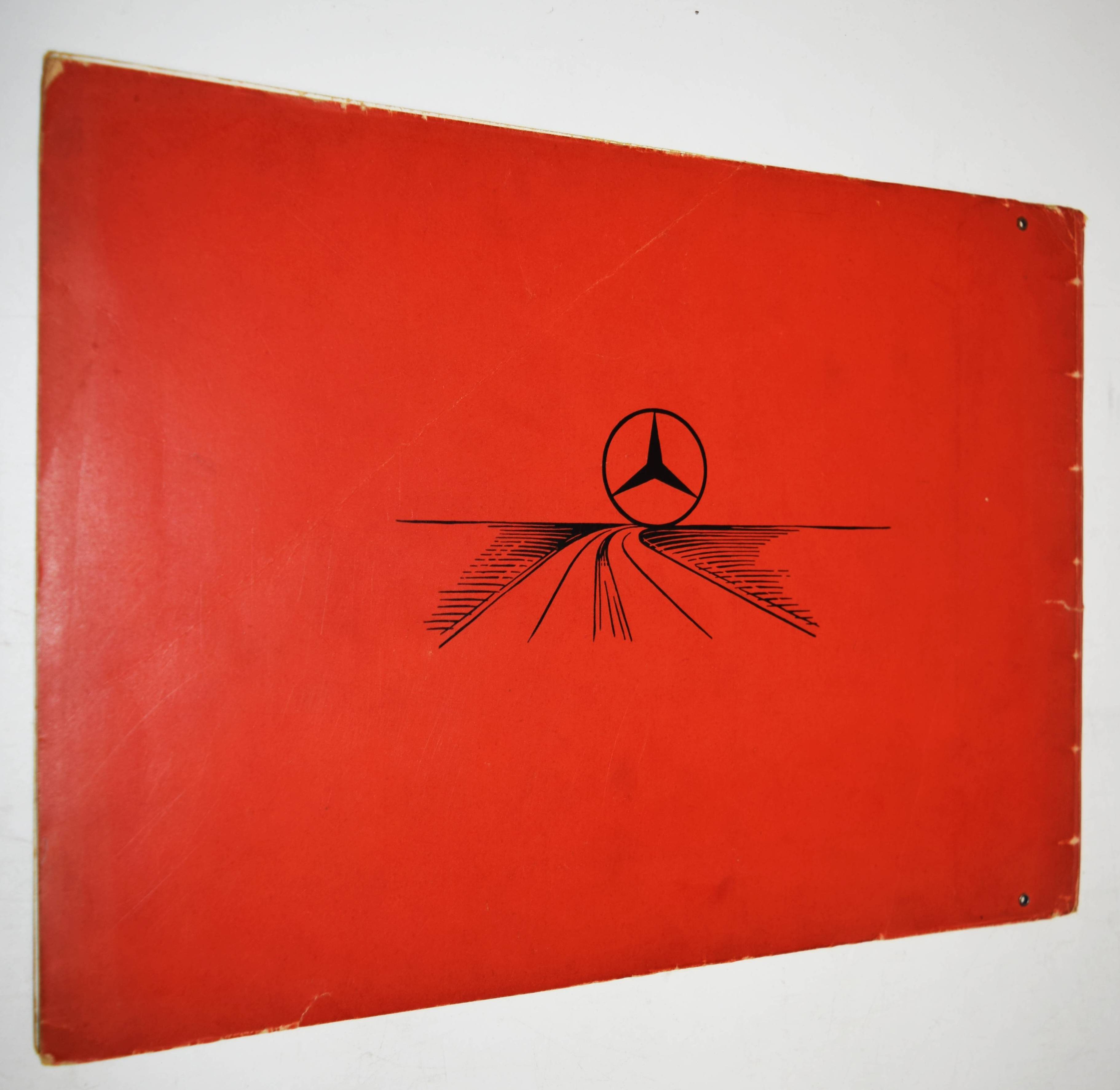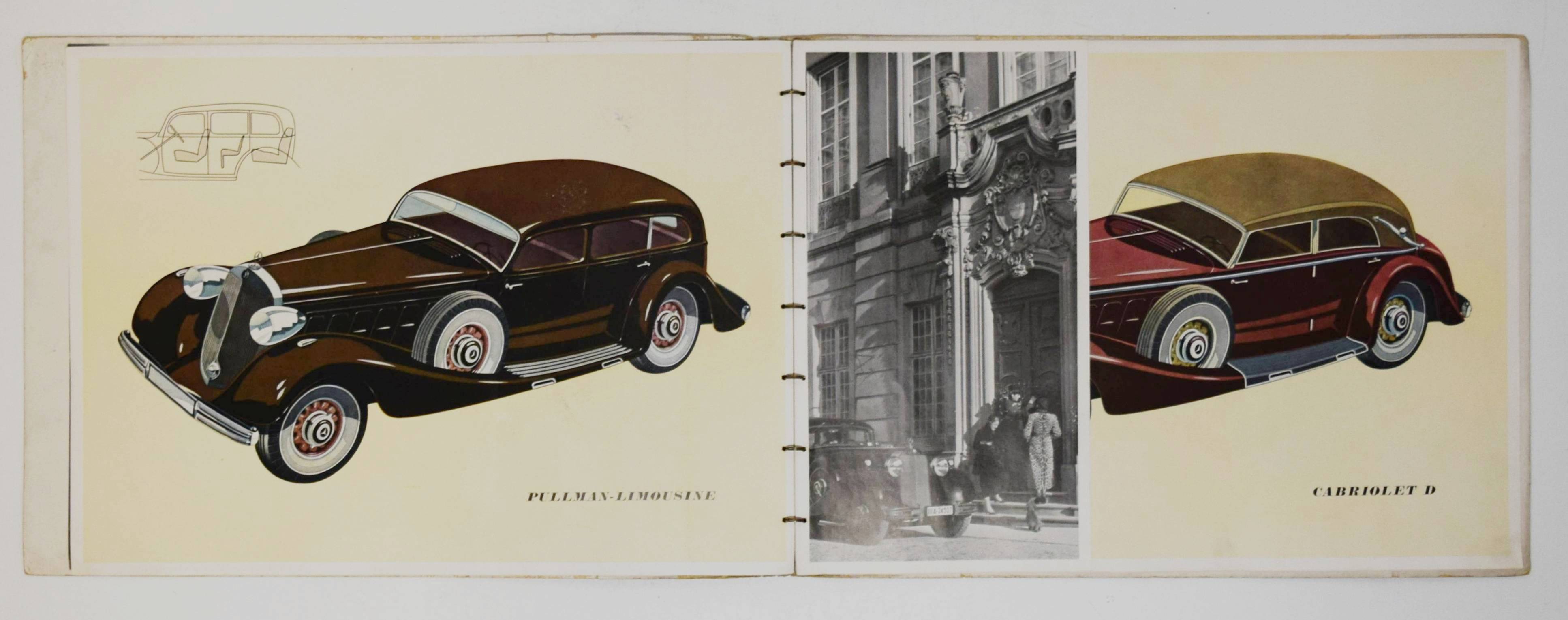 Mercedes Benz. Typ 500 (Nürburg, W 08). (Verkaufsprospekt). Stuttgart-Untertürkheim, Daimler-Benz Aktiengesellschaft (1937). Quer-4° (23 x 32 cm.). [5] Bl. mit 10 teils farbigen und ganzseitigen Abbildungen. Orangeroter Orig.-Kartonumschlag mit Metallring-Heftung. (Verlags-Nr. 6842. II. 837. W.). Seltener Originalprospekt für die große Mercedes-Limousine (Pullman), das Cabriolet „D“ und „F“ sowie den offenen Tourenwagen. – Mit 1 Fotografie des Tourenwagens und ganzs. farbigen Illustrationen der anderen Modelle. – „Der Mercedes-Benz W 08 war ein Pkw der Marke Mercedes-Benz und Nachfolger des Mercedes-Benz Typ 400. Er wurde unter dem Namen Mercedes-Benz 18/80 PS Typ Nürburg 460 im Herbst 1928 auf der Pariser Automobilausstellung als erstes Daimler-Benz-Fahrzeug mit Achtzylindermotor vorgestellt. … Auf dem langen Fahrgestell wurde ab 1931 zusätzlich ein Modell mit stärkerem Motor angeboten. Dieser hat 4918 cm³ Hubraum und leistet 100 PS (74 kW). Die Höchstgeschwindigkeit liegt bei 110 km/h. … 1936 erhielt der Wagen nochmals einen stärkeren Motor. Aus gleich gebliebenem Hubraum schöpft er 110 PS (81 kW) und beschleunigt das Fahrzeug bis auf 123 km/h. Kühlergrill und Windschutzscheibe wurden noch weiter nach hinten geneigt, der Querbügel zur Befestigung der Scheinwerfer fiel weg. 1939 wurde die Modellreihe nach insgesamt 3842 produzierten Fahrzeugen ohne Nachfolger eingestellt“ (Wikipedia). – Deckel angestaubt, sonst von leichten Gebrauchsspuren abgesehen sehr gut erhalten.