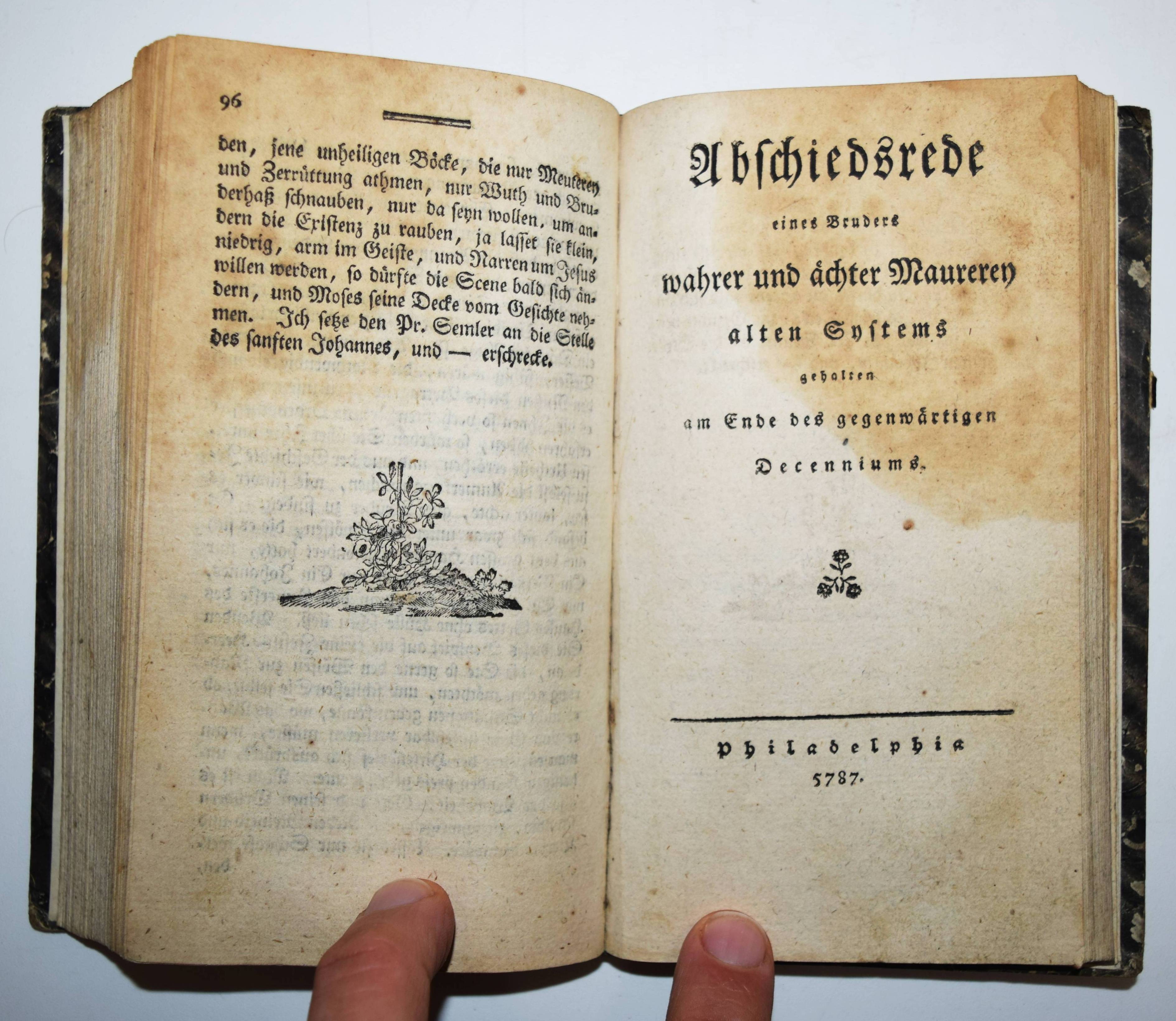 (Haugwitz, Christian Heinrich Curt v.). Hirten-Brief an die wahren und ächten Freymäurer alten Systems. Beigebunden: Schneider, Johannes Alois. Etwas über den Hirten-Brief an die wahren und ächten Freymäurer alten Systems. Hrn. J. S. Semler gewidmet. – Beigebunden: Abschiedsrede eines Bruders wahrer und ächter Maurerey alten Systems, gehalten am Ende des gegenwärtigen Decenniums. 3 Werke in 1 Band. Germanien und Philadelphia (d. i. Leipzig, Adam Friedrich Böhme) 5785, 5786 und 5787 (i. e. 1785, 1786 und 1787). 8°. VI S., [1] Bl., 248 S.; [10] Bl., 96 S.; [2] Bl., 93 S. Pappband der Zeit. I. Ackermann V, 149. Beyer 2932. Caillet 5000. NDB VIII, 94 f. VD18 11518839. Wolfstieg 33631. – Einzige Ausgabe. – C. H. C. v. Haugwitz (1752-1832) teilte, von Friedrich Wilhelm II. hoch geschätzt, mit dem König einen Hang zum Okkulten. Diese Neigung wurde in der Begegnung mit Matthias Claudius und Berührung mit dem Pietismus der Brüder Stolberg sowie der Herrnhuter Brüdergemeinde religiös vertieft. Er gründete die mystische Bruderschaft der „Kreuzfrommen“, für die er u. a. Herzog Ferdinand von Braunschweig gewann. Ab 1792 Staats- und Kabinettsminister, bestimmte er auch noch unter Friedrich Wilhelm III. maßgeblich die Außenpolitik Preußens. – II. Wolfstieg 33633. – Einzige Ausgabe. – Schneider verteidigt den im Vorjahr erschienenen „Hirtenbrief“ des Grafen C. H. C. von Haugwitz, gegen den sich Johann Salomo Semler gewandt hatte. – III. VD18 11411147. – Seltene Gelegenheitsschrift. – Vorderes freies Vorsatzblatt fehlt, durchgehend im oberen Drittel etwas fleckig, sonst gut erhaltener Sammelband mit drei sehr seltenen Werken zur Freimaurerei.