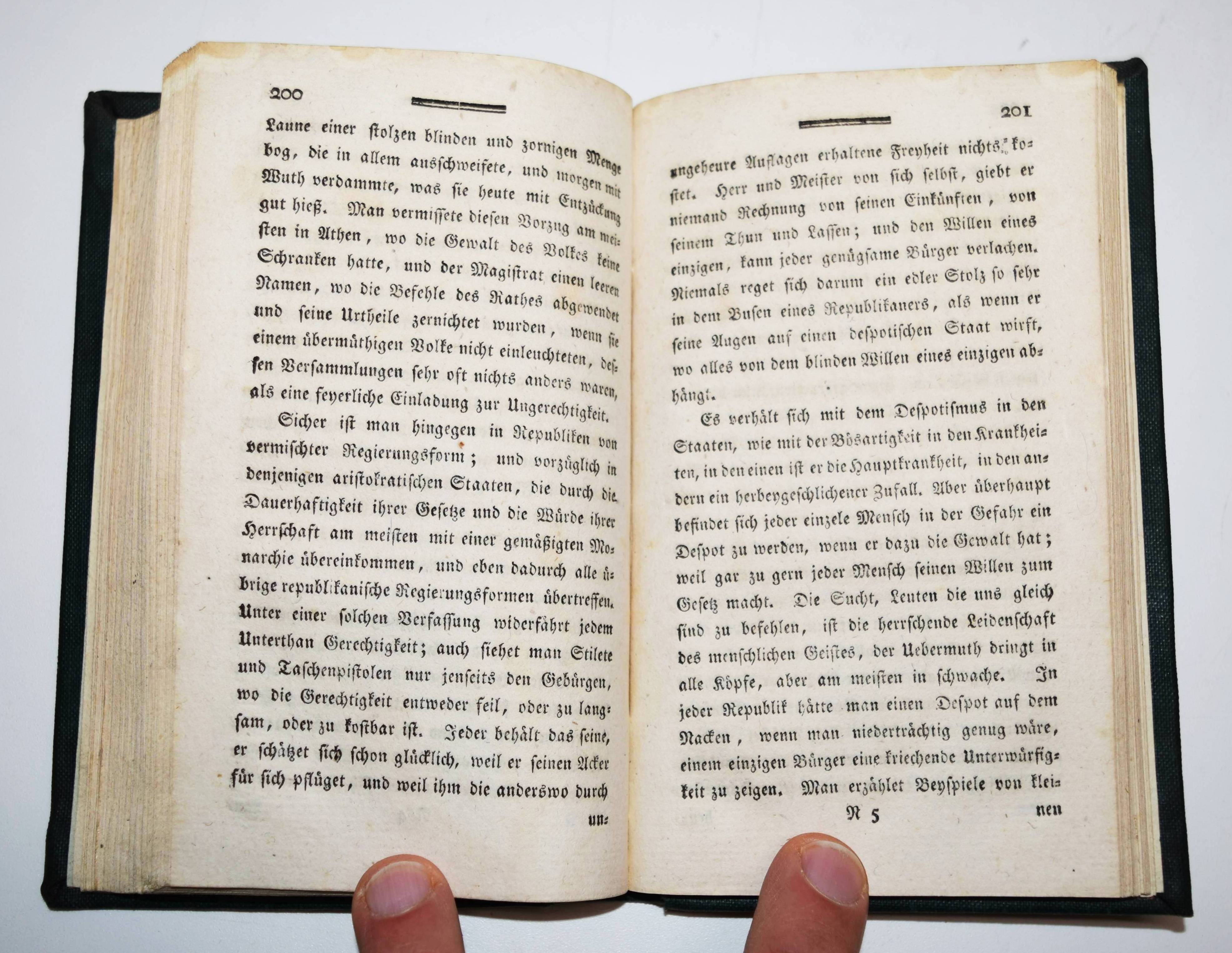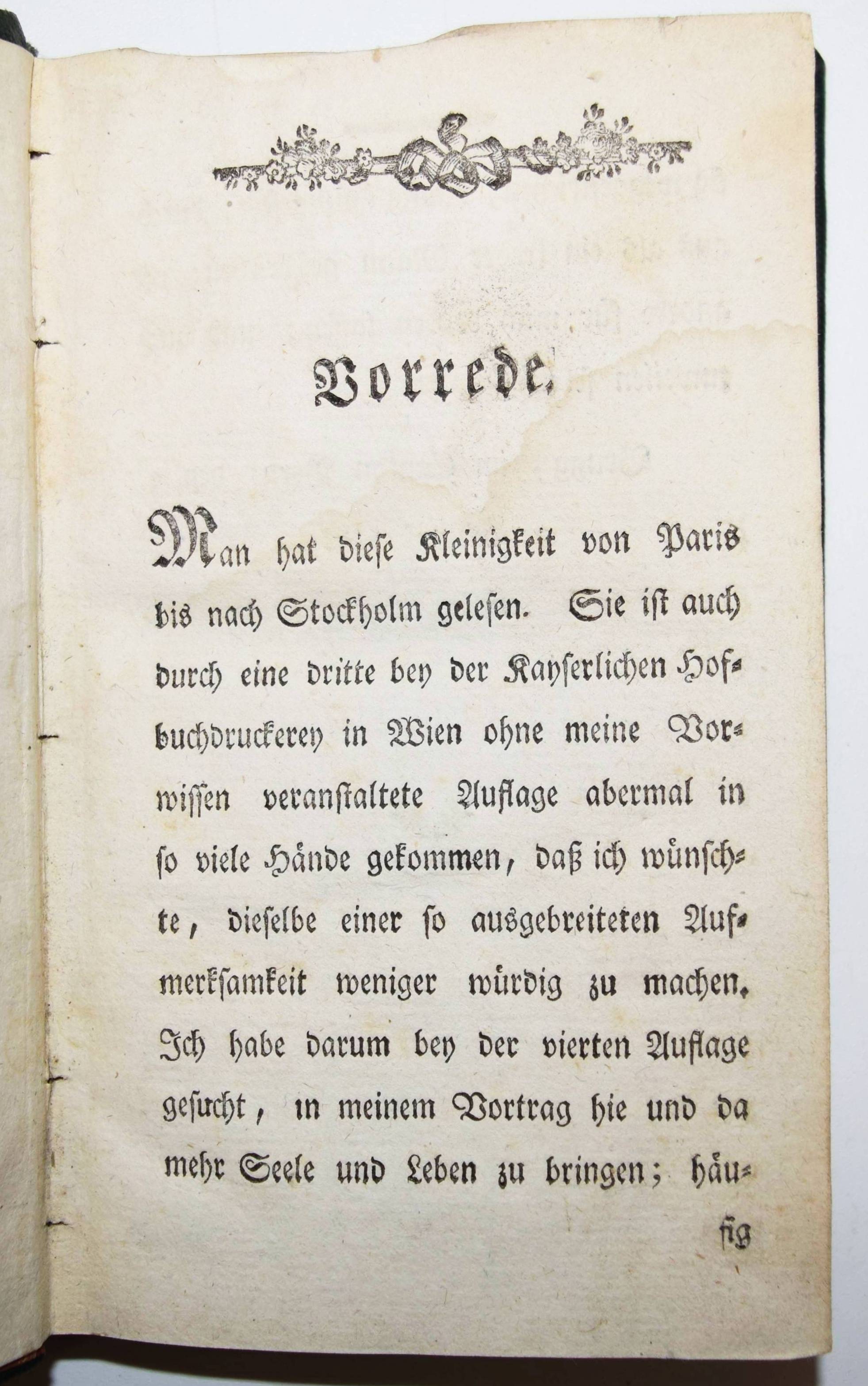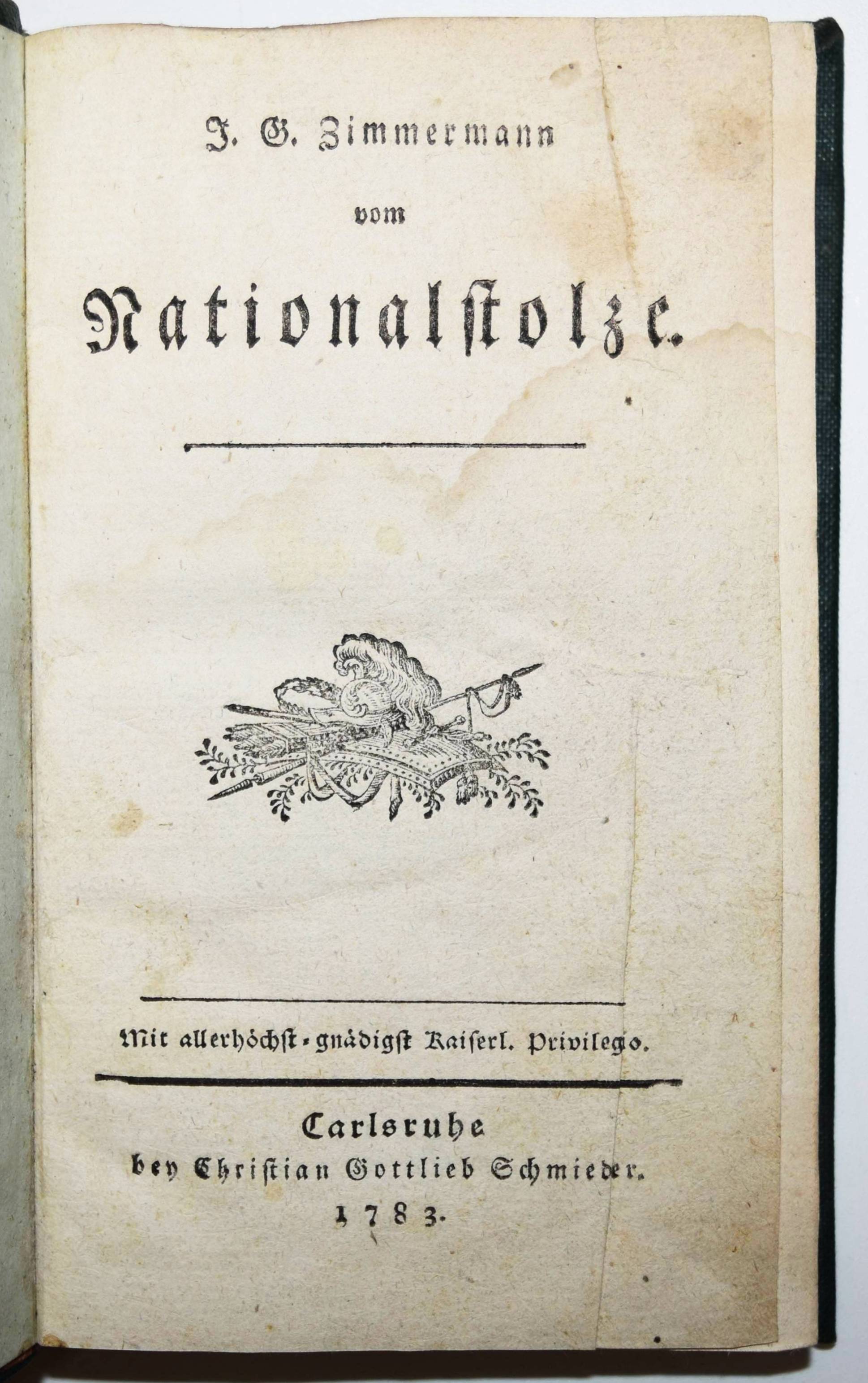 Zimmermann, J(ohann) G(eorg). Vom Nationalstolze. Karlsruhe, Christian Gottlieb Schmieder 1783. [2] Bl., 272 S. mit Titelvignette in Holzschnitt. Leinenband des 20. Jahrhunderts mit goldgepr. Rückenschild. (Sammlung der besten deutschen prosaischen Schriftsteller und Dichter, Band 130). VD18 10611584. – Karlsruher Nachdruck des bedeutenden Werks des Schweizer Aufklärers und Philosophen J. G. v. Zimmermann (1728-1795). – Ohne den Reihentitel, vereinzelt leicht stockfl., gutes Exemplar.
