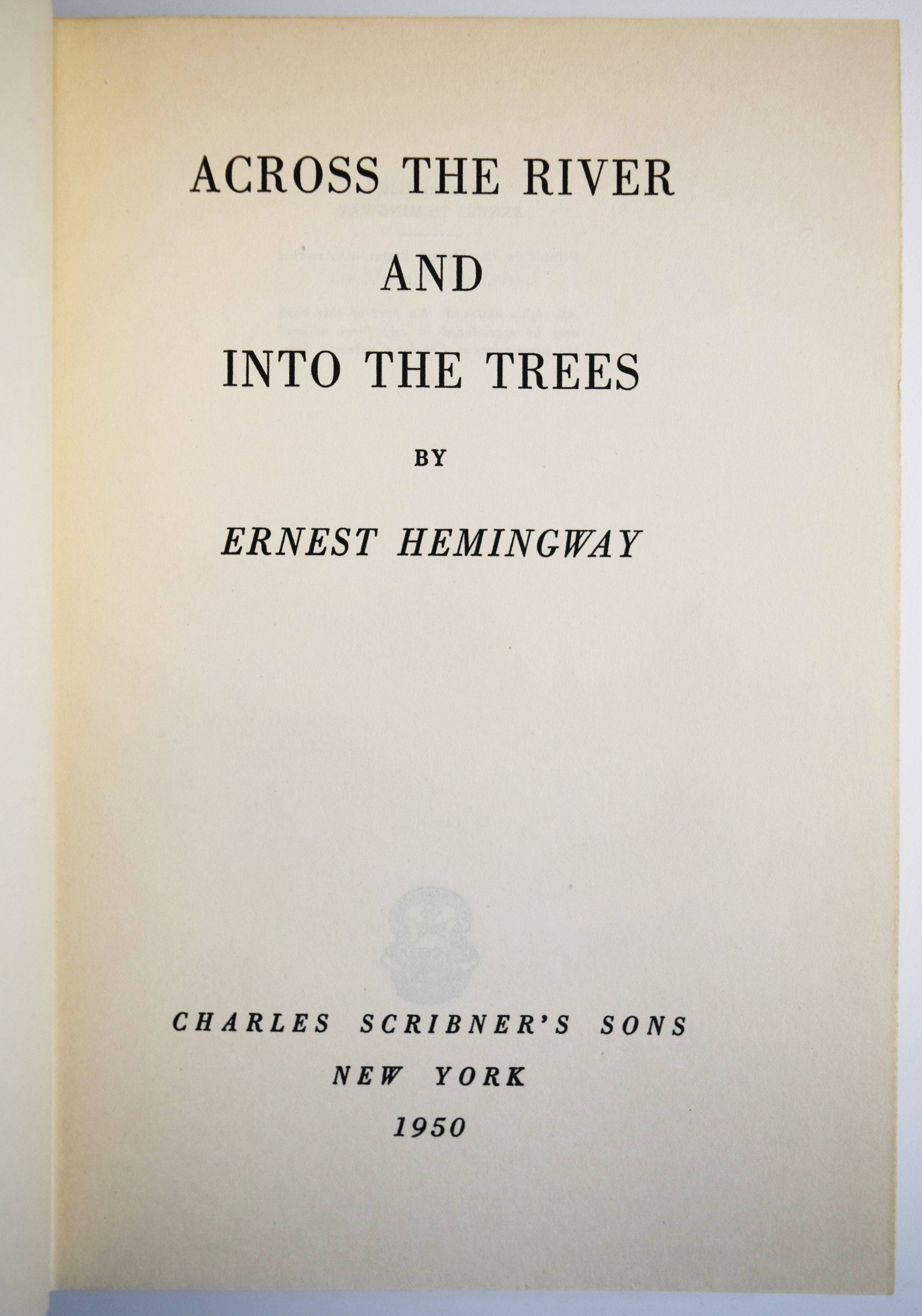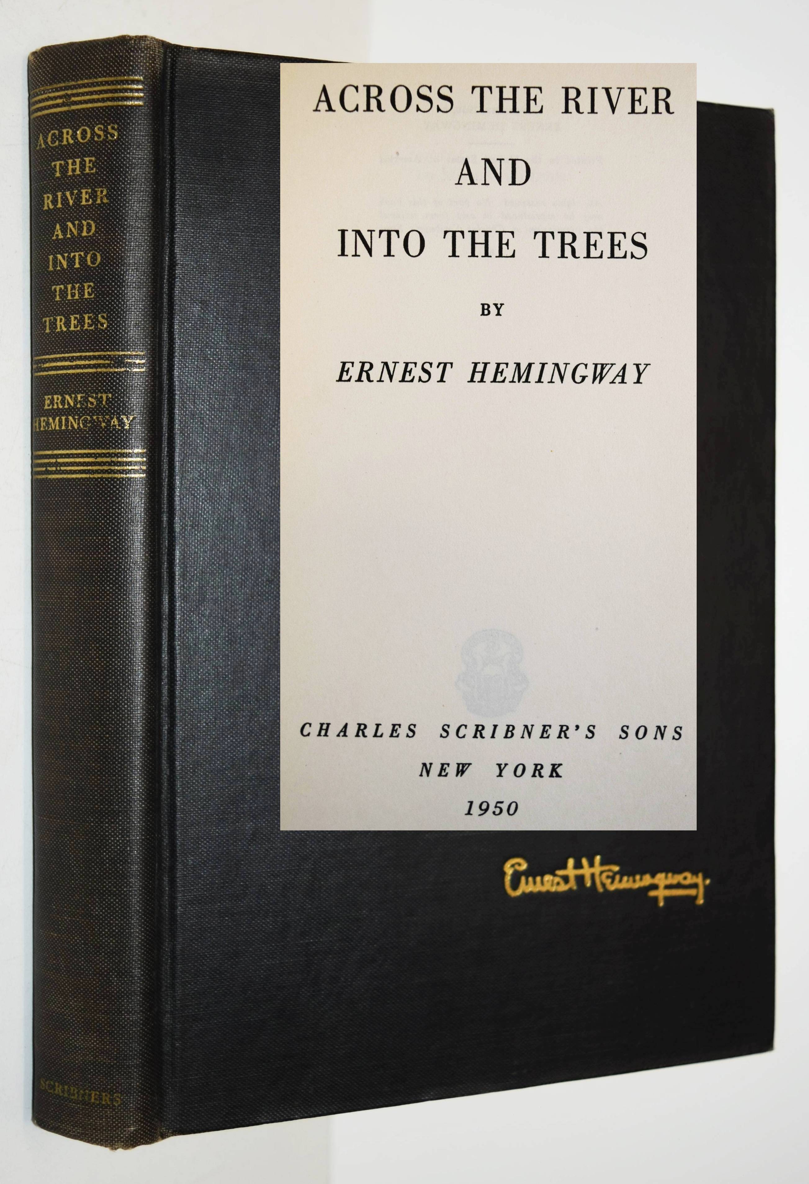 Hemingway, Ernest. Across the river and into the trees. New York, Charles Scribner’s Sons 1950. 8°. [6] Bl., 308 S. Orig.-Leinenband mit goldgepr. Rückentitel und Deckel-Signatur. First edition, first printing with Scribner’s „A“ on the copyright page. – „I could not go to Venice, now, without hearing the haunted cadences of Hemingway’s new novel. It is the saddest novel in the world about the saddest city, and. I say I think it is the best and most honest work that Hemingway has done“ (Tennessee Williams, „A Writer’s Quest For a Parnassus“, New York Times, 13 August 1950). – Spine slightly rubbed, very good copy.