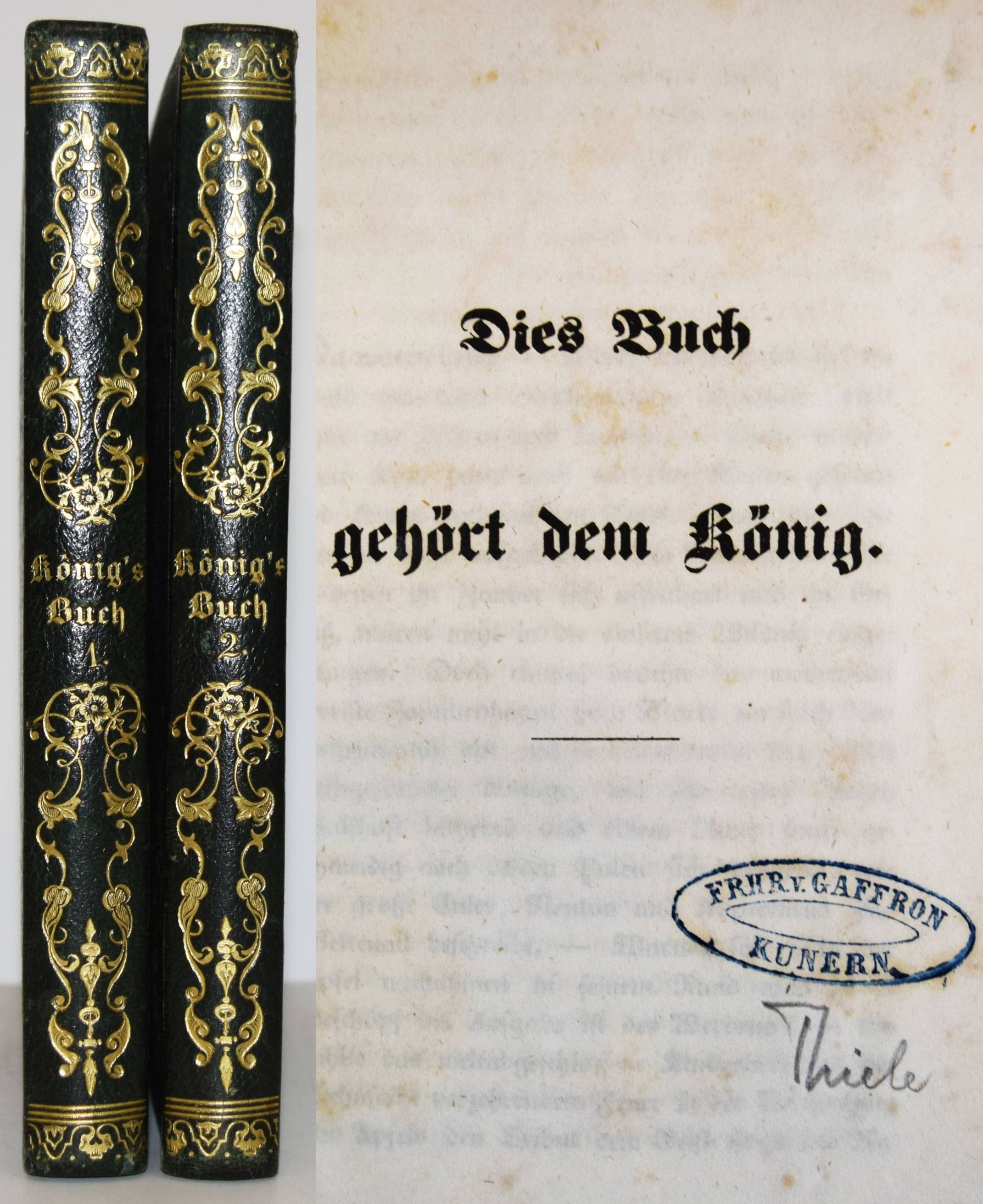 (Arnim, Bettina v.). Dies Buch gehört dem König. 2 Bände. (Berlin, Eduard Heinrich Schroeder 1843). Kl.-8° (17,5 x 11 cm.). VIII, 307, (1) S.; [1] Bl., S. 308-598. Dunkelgrüne Halblederbände der Zeit mit goldgepr. Rückentiteln, Romantikervergoldung und blindgepr. Deckel-Ornamentik.. Slg. Borst 2055. Goedeke VI, 85, 7. Houben, Verbotene Bücher I, 33 ff. Mallon 149, 48. Pataky I, 18. – Erste Ausgabe der ersten „Sozialreportage der deutschen Literatur“. Bettine von Arnim fordert dem Zeitgeist entsprechende gesellschaftliche Freiheiten. – „Das 1843 erschienene fiktive Gespräch mit der Mutter Goethes soll angeblich 1807 stattgefunden haben. Die Autorin schildert zwei Besuche der „Frau Rat“ bei der Königin Luise im Darmstädter Schloss in den Jahren 1799 und 1803, die sie zu einer Begegnung zusammenfasst, um die Erzählung lebendiger zu gestalten. In die Schilderungen kleinbürgerlichen und höfischen Lebens – etwa der Beschreibung eines Hofballs – lässt sie ihre politischen, sozialen und philosophischen Vorstellungen und Ideen einfließen. Ihre Theorien über den Begriff der Freiheit, die sich gegen eine verhärtete Moral, gegen Pädagogen und Pietisten sowie gegen das konfessionell gebundene – und ausgeartete – Christentum wenden, sind von der Aufklärung geprägt. Bettina wehrt sich jedoch dagegen, als Anhängerin des Atheismus zu gelten, und bekennt sich zu einem etwas unbestimmten Deismus. Wahre Unsterblichkeit billigt sie nur den Hervorbringungen der menschlichen Intelligenz zu, die an nichts Irdisches gebunden ist“ (KLL). – „Der Geist der Schönheit in der Form wird im Menschengeist zum Propheten. Der Geist in dem die reine Form der Individualität liegt der ist gesund. Freiheit allein bringt Geist, Geist allein bringt Freiheit.“ (Aussprüche der Frau Rat, S. 3). – Stellenweise etwas braunfleckig, wie meist ohne die beiden Haupttitel mit der Verlagsangabe, sehr gutes dekorativ gebundenes Exemplar aus der Schloß-Bibliothek des preussischen Generals und Politikers Ernst Maximilian Hermann von Gaffron-Oberstradam (seit 1840 Freiherr von Gaffron-Kunern, 1797-1870) mit dessen Exlibris-Stempel auf den Nebentiteln.