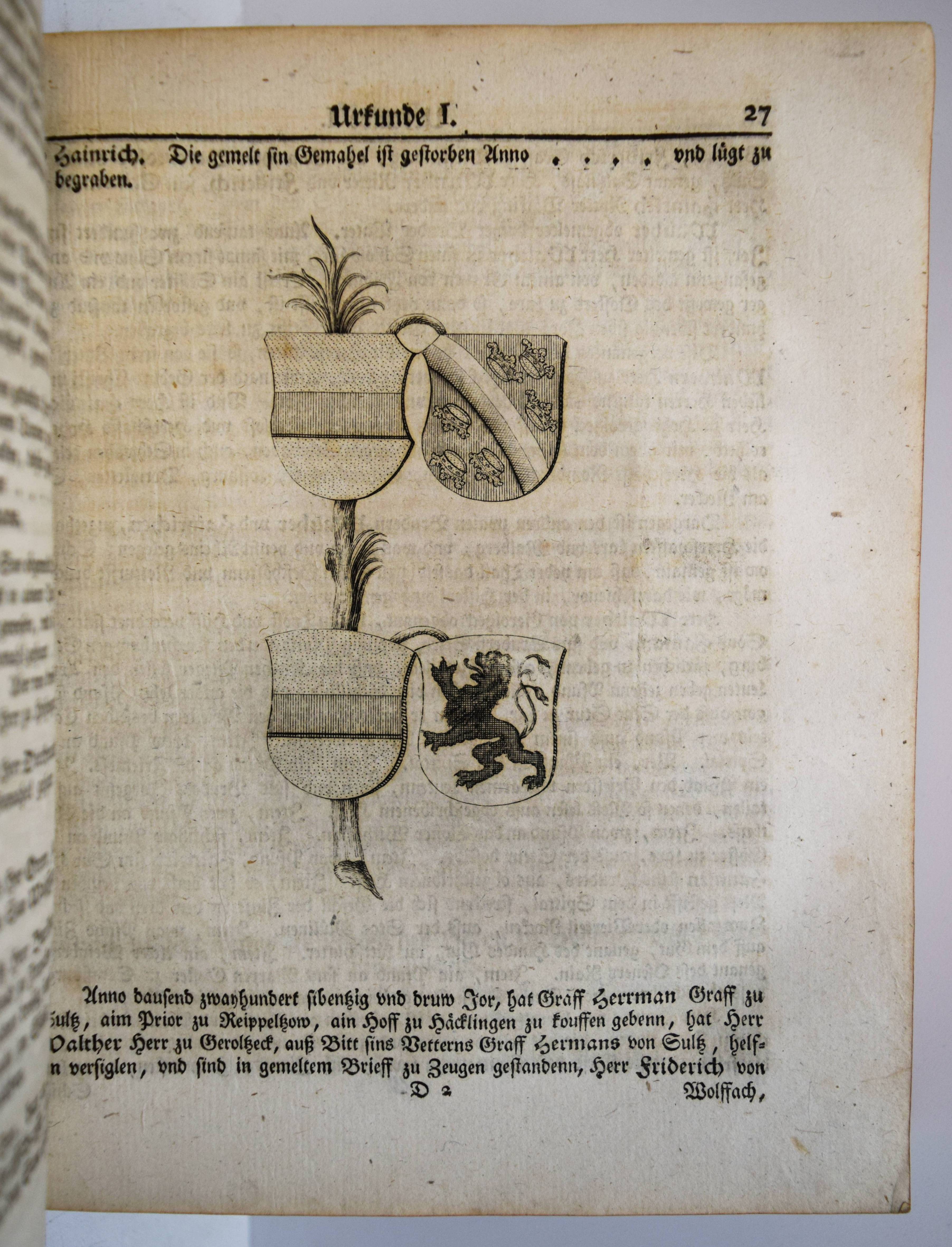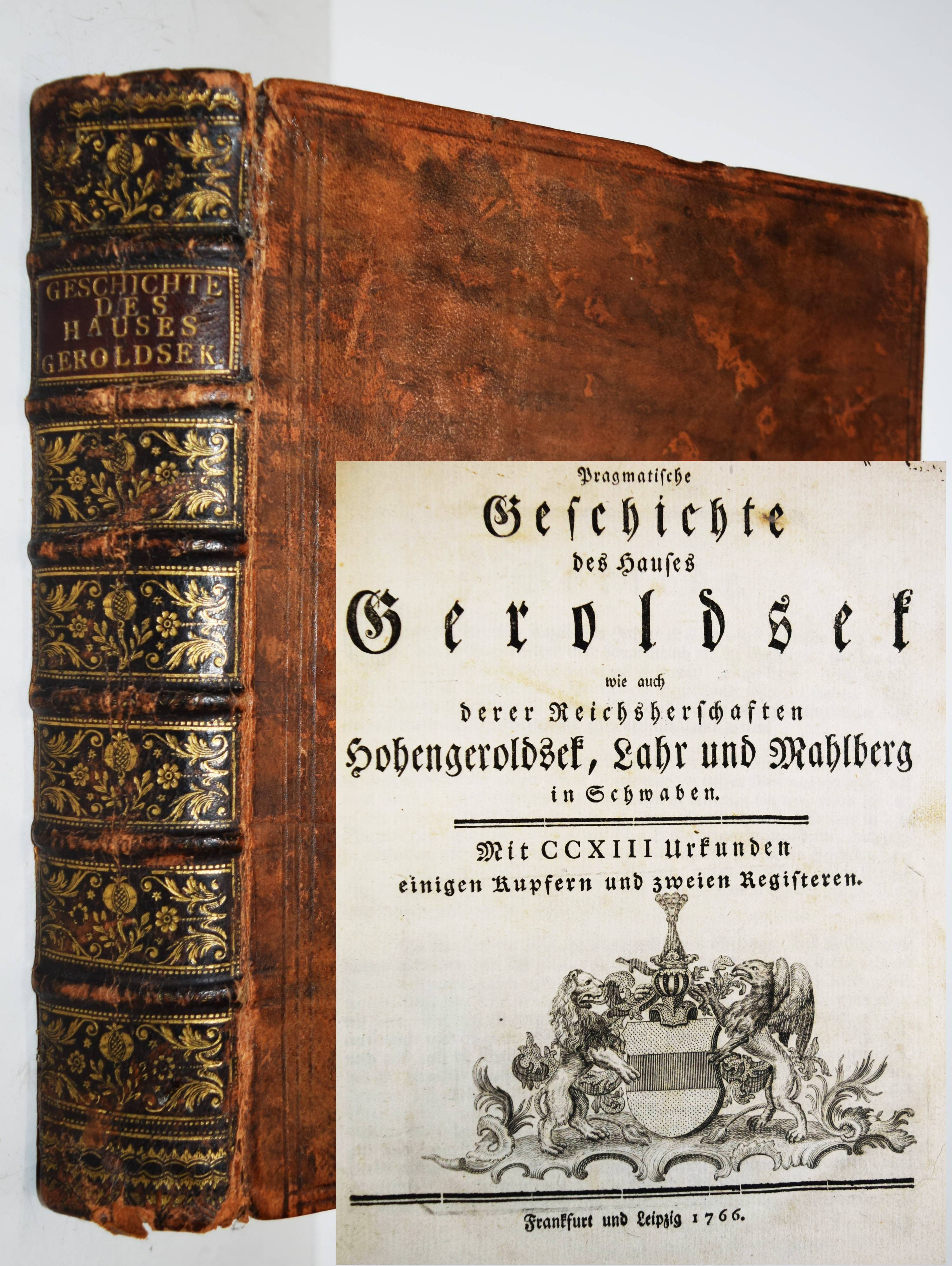 Geroldseck – (Reinhard, Johann Jakob oder Christof Jakob Kremer). Pragmatische Geschichte des Hauses Geroldsek wie auch derer Reichsherschaften Hohengeroldsek, Lahr und Mahlberg in Schwaben. Mit CCXIII Urkunden, einigen Kupfern und zweien Registeren. Frankfurt, Leipzig, o. Dr. 1766. 4°. [4] Bl., 175, 472 S. mit 213 Urkunden, 7 gestoch. Wappen und 2 gefalt. Stammtafeln. Kalbslederband der Zeit mit goldgepr. Rückenschild und reicher floraler Rückenvergoldung. ADB IX, 43. Holzmann-Bohatta II, 7032 (nennt als möglichen Verfasser auch Christof Jakob Kremer; vgl. Jöcher-A. III, 857 u. NDB XIII, 6). Lautenschlager 6630. NDB VI, 317. VD18 10528156. – Erste und einzige Ausgabe. – „Das uralte Haus G. (Hohengeroldseck), welches die Kastenvogtei über die Klöster Schuttern und Ettenheimmünster ausübte und 1259 das Augustinerkloster in Lahr gründete, war das mächtigste der Ortenau, sein Gebiet erstreckte sich vom Rhein über den Schwarzwald bis Schwaben“ (A. Kleinschmidt in ADB). – Gelenke und Kanten etwas berieben, hinteres freies Vorsatzblatt fehlt, stellenweise leicht braunfleckig, sehr schönes dekorativ gebundenes Exemplar.