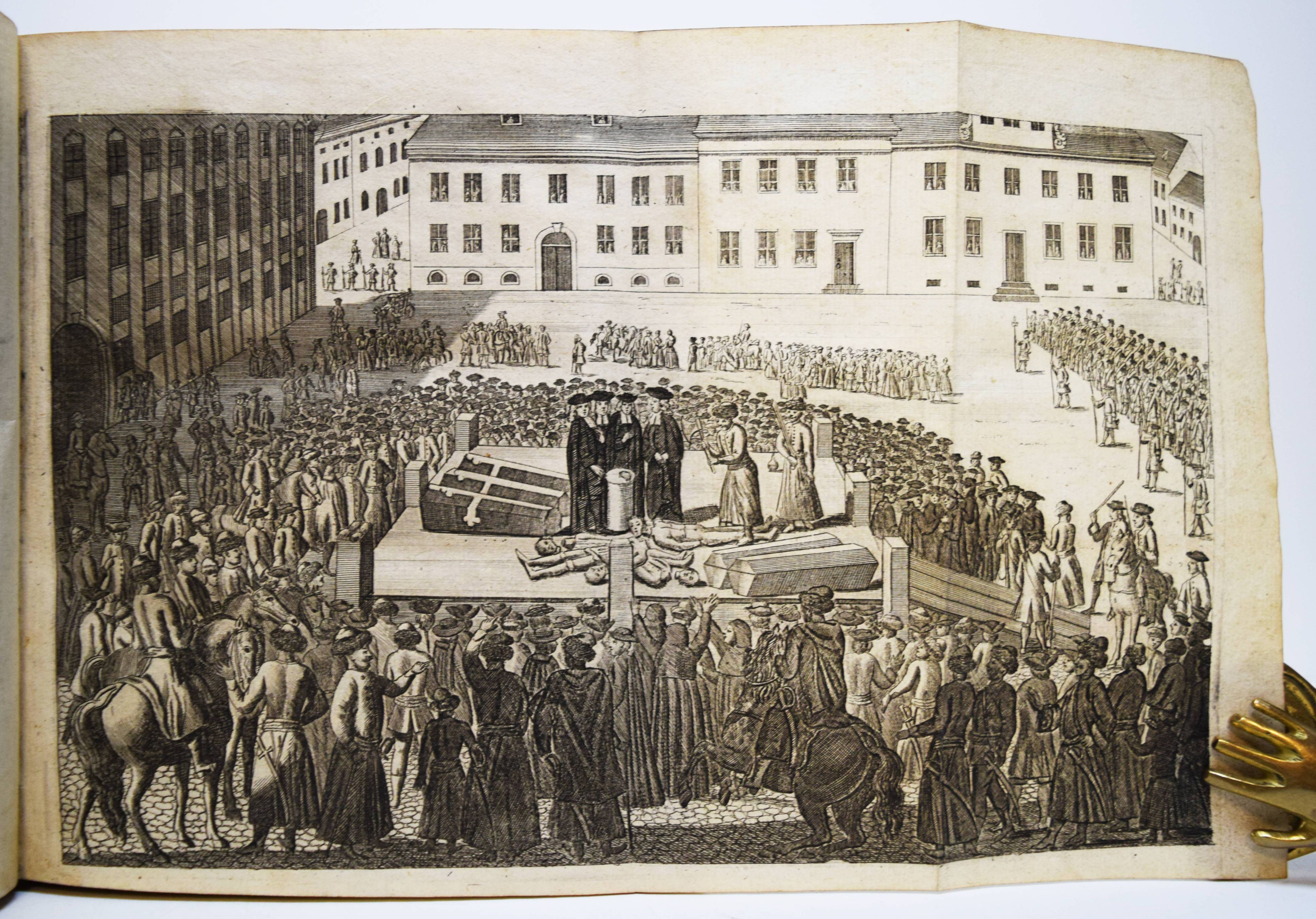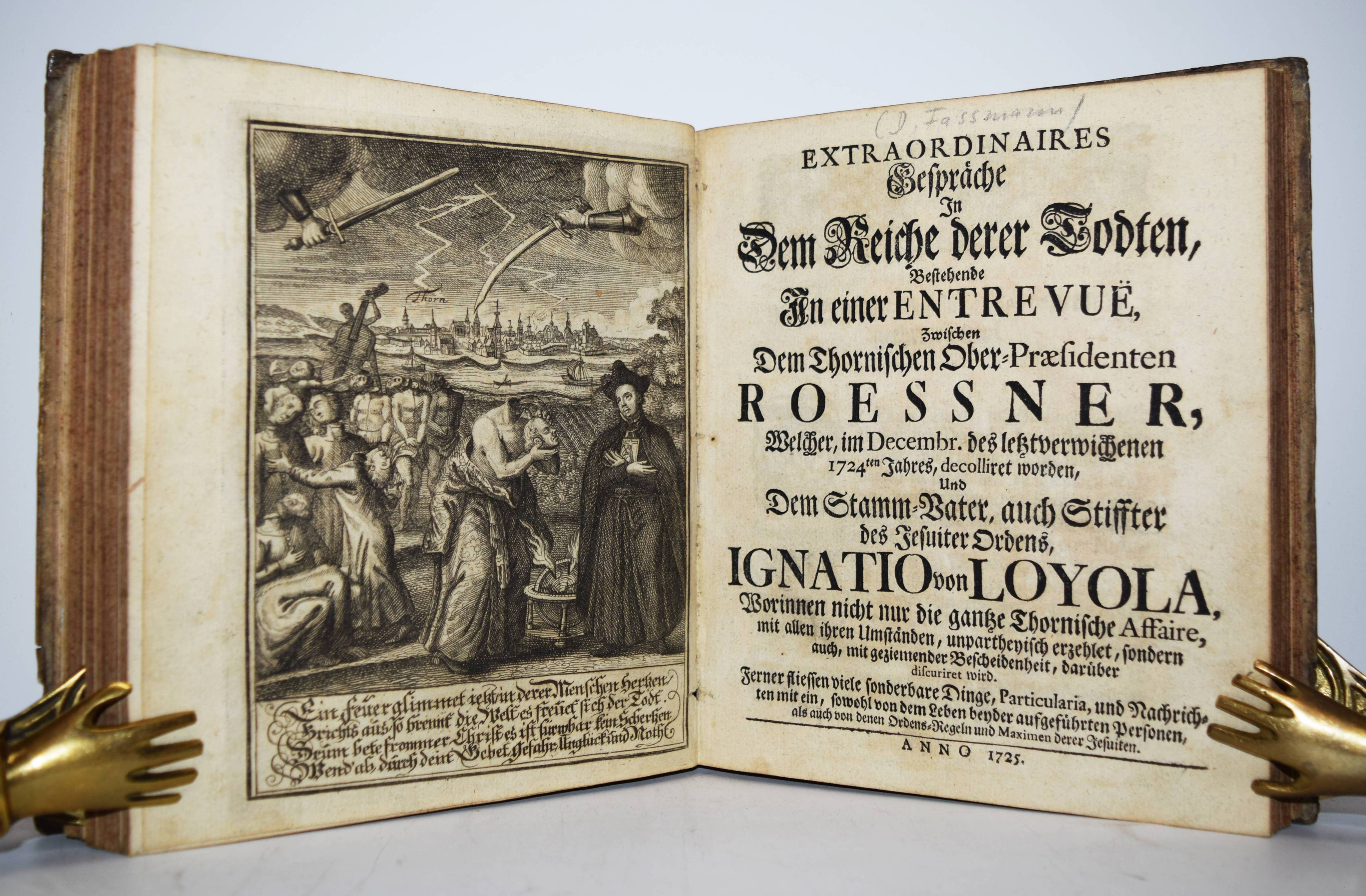 (Jablonski, Daniel Ernst). Das Betrübte Thorn, Oder die Geschichte so sich zu Thorn Von Dem II. Jul. 1724. biß auf gegenwärtige Zeit zugetragen. Aus zuverläßigen Nachrichten Unverfänglich zusammen getragen, und der Recht- und Wahrheit-liebenden Welt zur Beurtheilung mitgetheilet. – Beigebunden. Schmeizel, Martin. Wahrhafftige Historische Nachricht von dem am 16. Jul. 1724. zu Thorn in Preussen paßirten Tumult des gemeinen Volcks, wider das Jesuiter-Collegium, Und der hierauf am 7. Dec. erfolgten sehr scharffen Execution einiger zum Todt verurtheilten Personen. – Beigebunden: Fassmann, David. Extraordinaires Gespräche In Dem Reiche derer Todten: Bestehende In einer Entrevuë Zwischen Dem Thornischen Ober-Praesidenten Roessner, Welcher, im Decembr. des letztverwichenen 1724ten Jahres, decolliret worden, Und Dem Stamm-Vater, auch Stiffter des Jesuiter Ordens, Ignatio von Loyola, Worinnen nicht nur die gantze Thornische Affaire …. unpartheyisch erzehlet, sondern auch, … discuriret wird … – Beigebunden: Boccavera, Gabriele (Pseud.). Jesuitischer-Pilgrim, Welcher Als abgeordneter Clerisey-Bothe, Von denen Pohlnischen Magnaten Mit wichtigen Depechen wegen des zu Thoren vorgegangenen Tumults 1724. nach Rom reiset, Und unter wegens mit einen aus der Sclaverey kommenden Protestanten einen merckwürdigen Disput bekömmt. Nach dem in der Schweiz gedruckten Exemplar. 4 Werke in 1 Band. Berlin, Ambrosius Haude (I.) und Jena, Joh. Volckmar Marggraf (II.) 1725. Gr.-8° (20 x 17 cm.). [3] Bl., 112, 64 S. mit gestoch. Portrait und 2 (1 gefaltete) Kupfertafeln; 120 S.; gestoch. Frontispiz, [3] Bl., 215 S.; [18] Bl. mit 2 Kupferstichen auf dem Titelblatt. Pappband der Zeit. I. VD18 14740710. – II. VD18 1086539X. – III. VD18 11499605. – IV. VD18 14525127. – Interessanter Sammelband mit vier sehr seltenen Schriften über religiöse Ausschreitungen und die Hinrichtung des Bürgermeisters in der polnischen Stadt Torun (dt. Thorn) 1724. – „Bei der Fronleichnamsprozession am 16. Juli 1724, die einen nicht genehmigten Weg nahm, um einen Protest zu provozieren, kam es wie erwartet zu Streitigkeiten zwischen den Jesuitenzöglingen und den Schülern des protestantischen Gymnasiums. Aus diesem Tumult heraus wurde das Jesuitenkloster gestürmt und verwüstet. Die Regierung des polnischen Königs August des Starken führte daraufhin ein Verfahren gegen die Stadt, ließ den Bürgermeister Johann Gottfried Rösner und neun weitere Bürger am 7. Dezember 1724 enthaupten (Thorner Blutgericht) und bestimmte, dass der Magistrat künftig zur Hälfte aus Katholiken bestehen müsse und die Marienkirche den Katholiken zu übergeben sei“ (Wikipedia). – Johann Gottfried Rösner (1658-1724) wurde 1703 einer von vier Bürgermeistern der Stadt. „Er war zeitweise turnusmäßig Präsident (vorsitzender Bürgermeister) oder Burggraf (offizieller Vertreter des polnischen Königs), seit 1706 auch Kurator des Gymnasiums. In seine Amtszeit fielen der Nordische Krieg und eine Pestepidemie, die die Stadt schwer beeinträchtigten. Rösner war Kaufmann und betrieb eine private Branntweinbrennerei, die in Konkurrenz zur städtischen stand, weswegen es heftige Zwistigkeiten zwischen einigen Ratsherren und ihm gab. 1724 kam es zum Thorner Blutgericht zwischen protestantischen und katholischen Gymnasiasten in der Stadt, in deren Folge das Jesuitenkloster schwer verwüstet wurde. Rösner schritt nicht ausreichend resolut dagegen ein und wurde daraufhin von den Jesuiten angeklagt und vom Hofgericht in Warschau zum Tode verurteilt. Einen Übertritt zum katholischen Glauben, womit er sein Leben hätte retten können, lehnte er vehement ab. Petitionen und Proteste auch vom preußischen König Friedrich Wilhelm konnten die Hinrichtung mit neun weiteren Bürgern nicht verhindern“ (Wikipedia). – Einband teils stärker berieben und angestaubt, stellenweise leicht fleckig und gebräunt, sonst sehr gut erhalten.