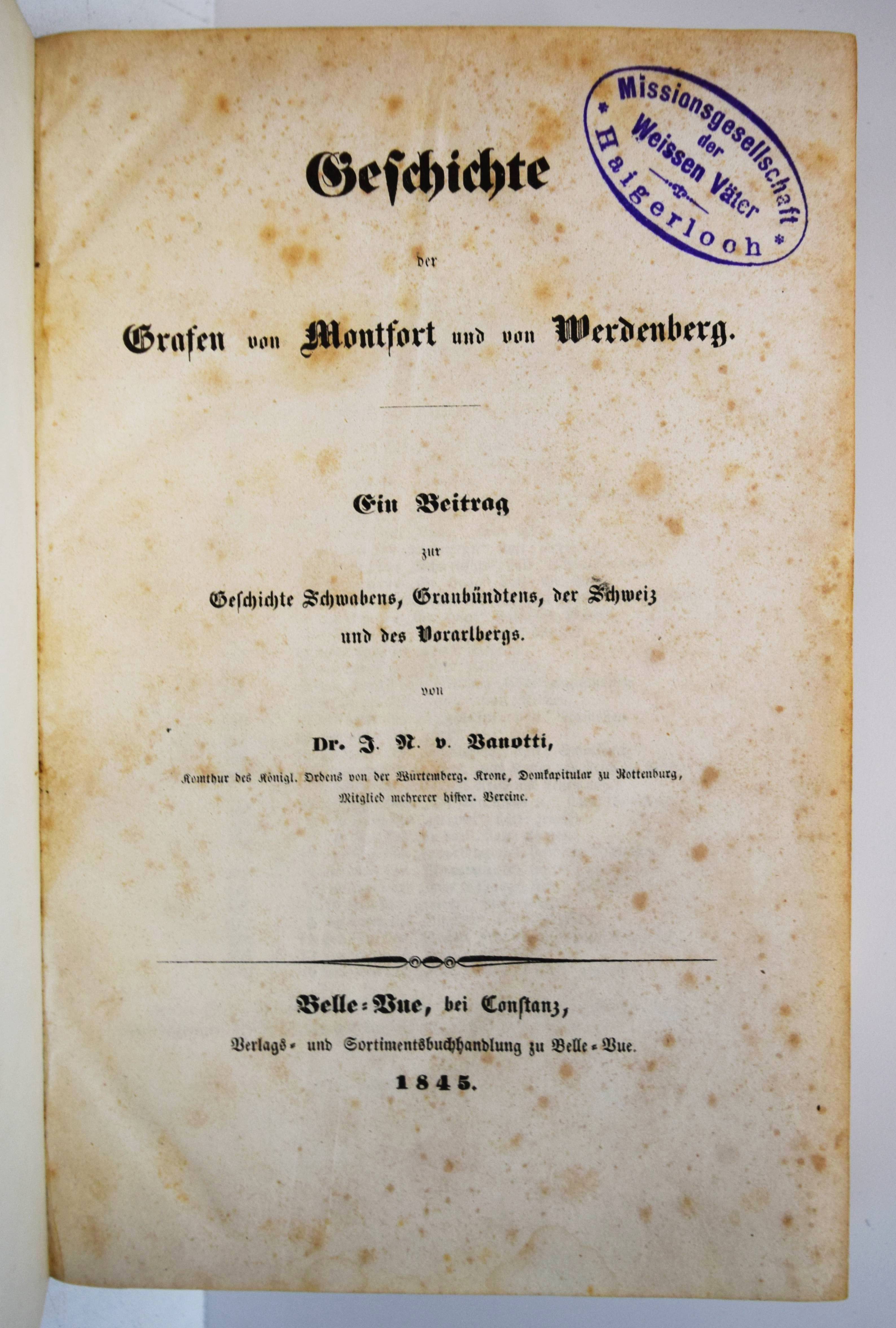 Vanotti, J(ohann) N(epomuk) v. Geschichte der Grafen von Montfort und von Werdenberg. Ein Beitrag zur Geschichte Schwabens, Graubündtens, der Schweiz und des Vorarlbergs. Belle-Vue, bei Constanz, Verlags- und Sortimentsbuchhandlung zu Belle-Vue 1845. Gr.-8° (23 x 15,5 cm.). XXII, 658, (2) S. Halblederband der Zeit mit 2 goldgepr. Rückenschildern. Seltene erste Ausgabe. – Ohne die 2 heraldischen und 8 genealogischen Tafeln, Stempel auf dem Titelblatt, durchgehend braunfleckig, gutes dekorativ gebundenes Exemplar.