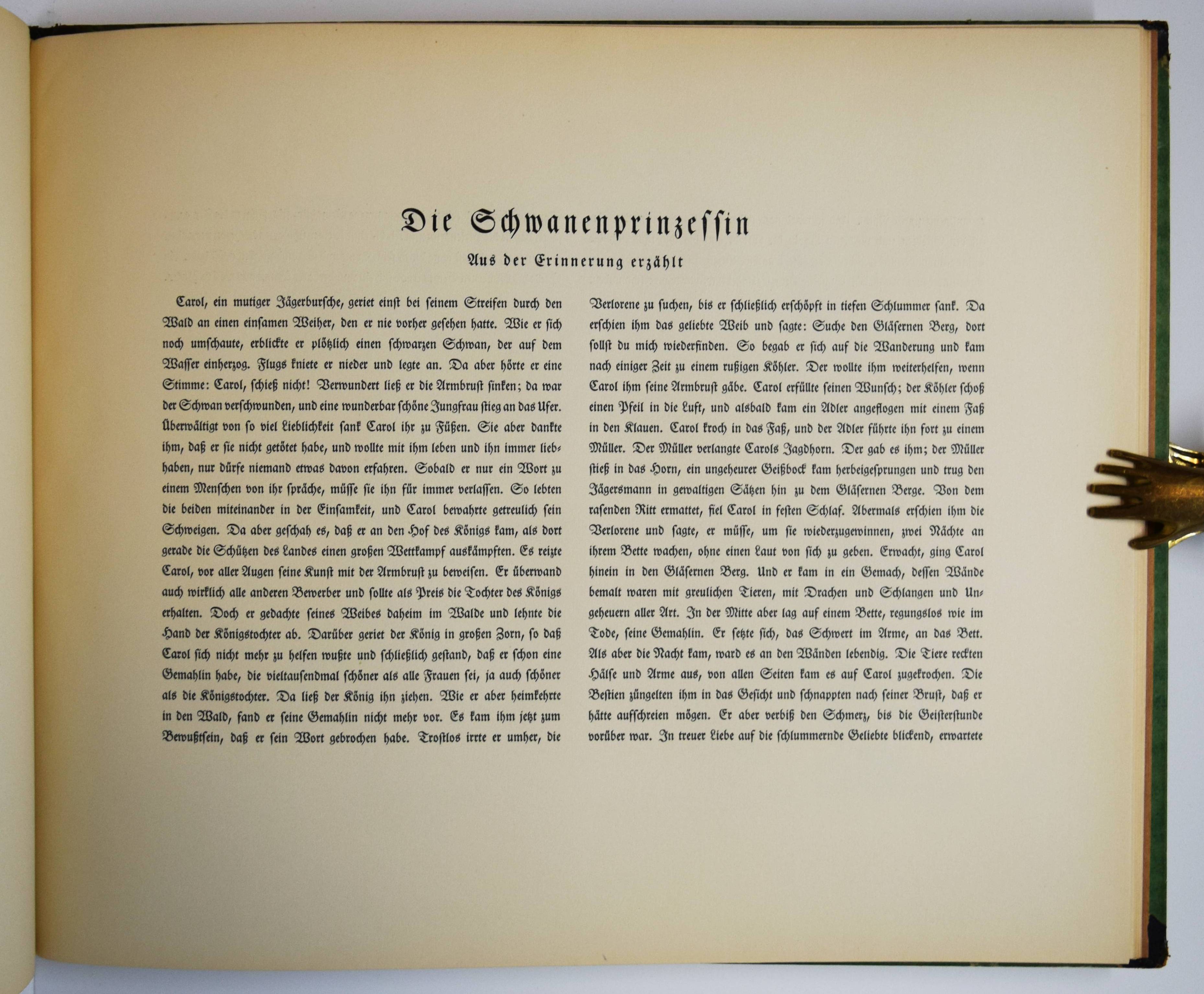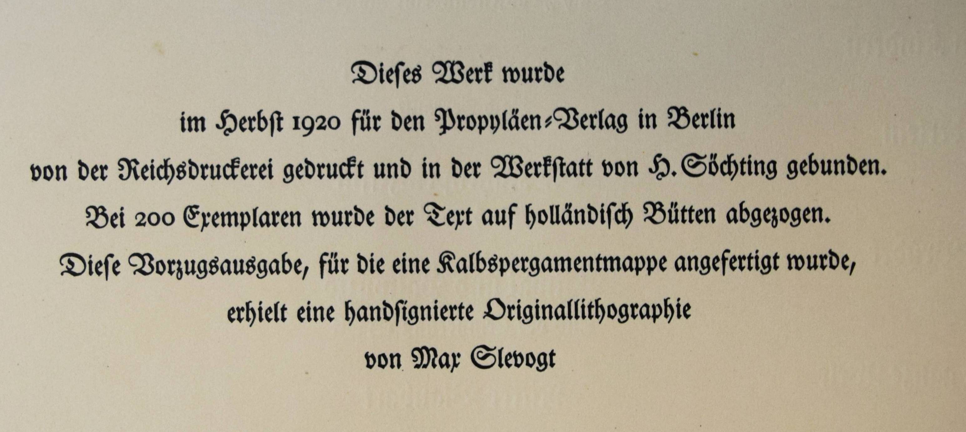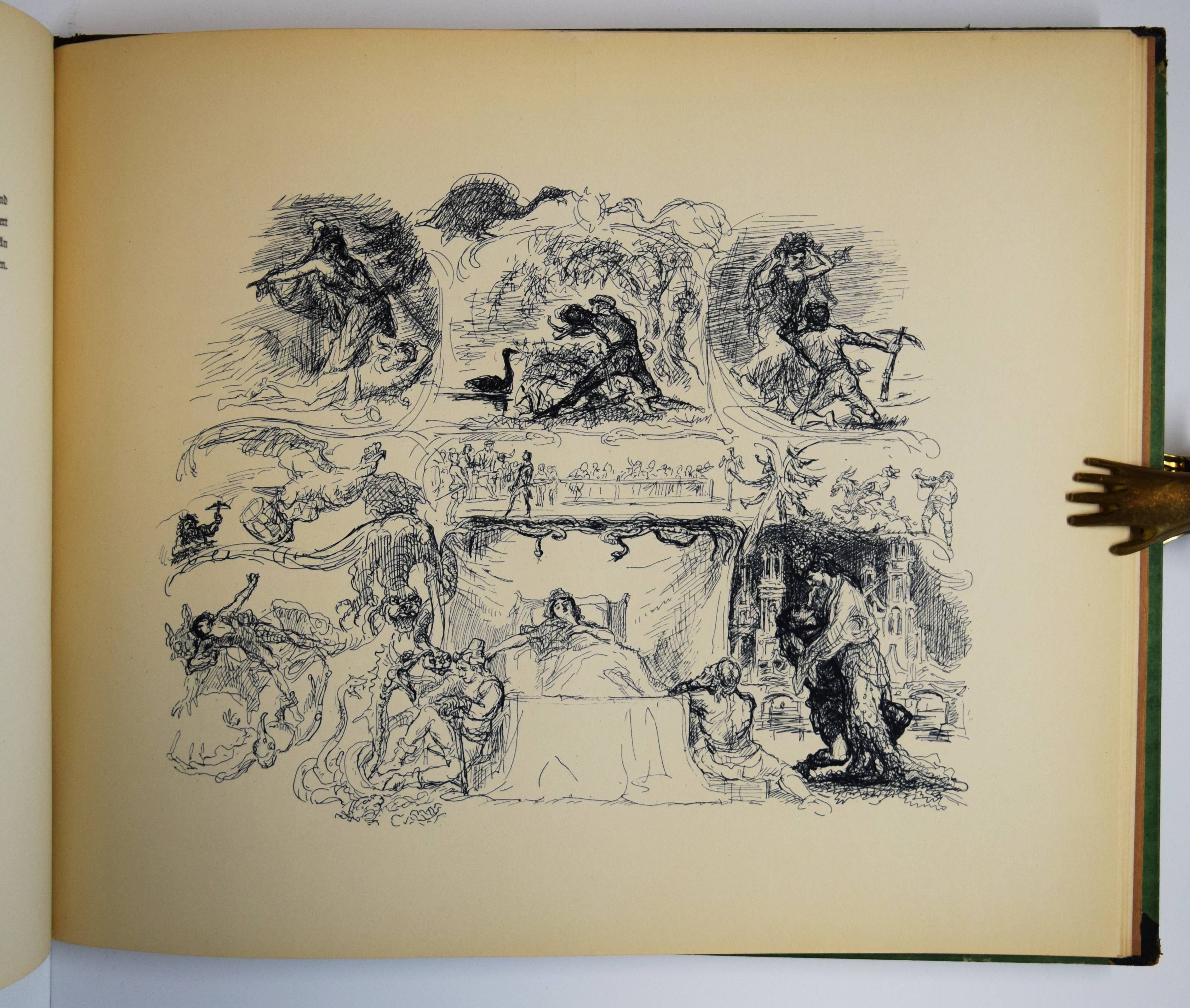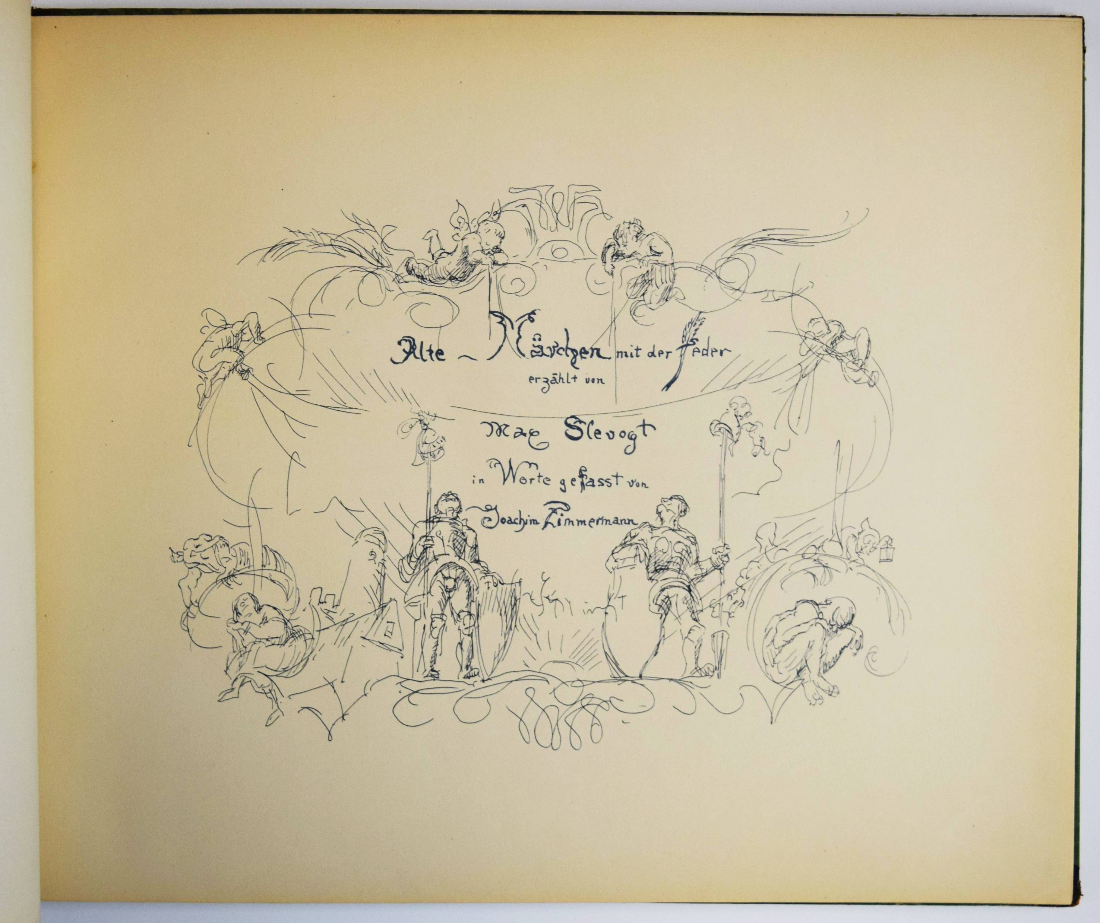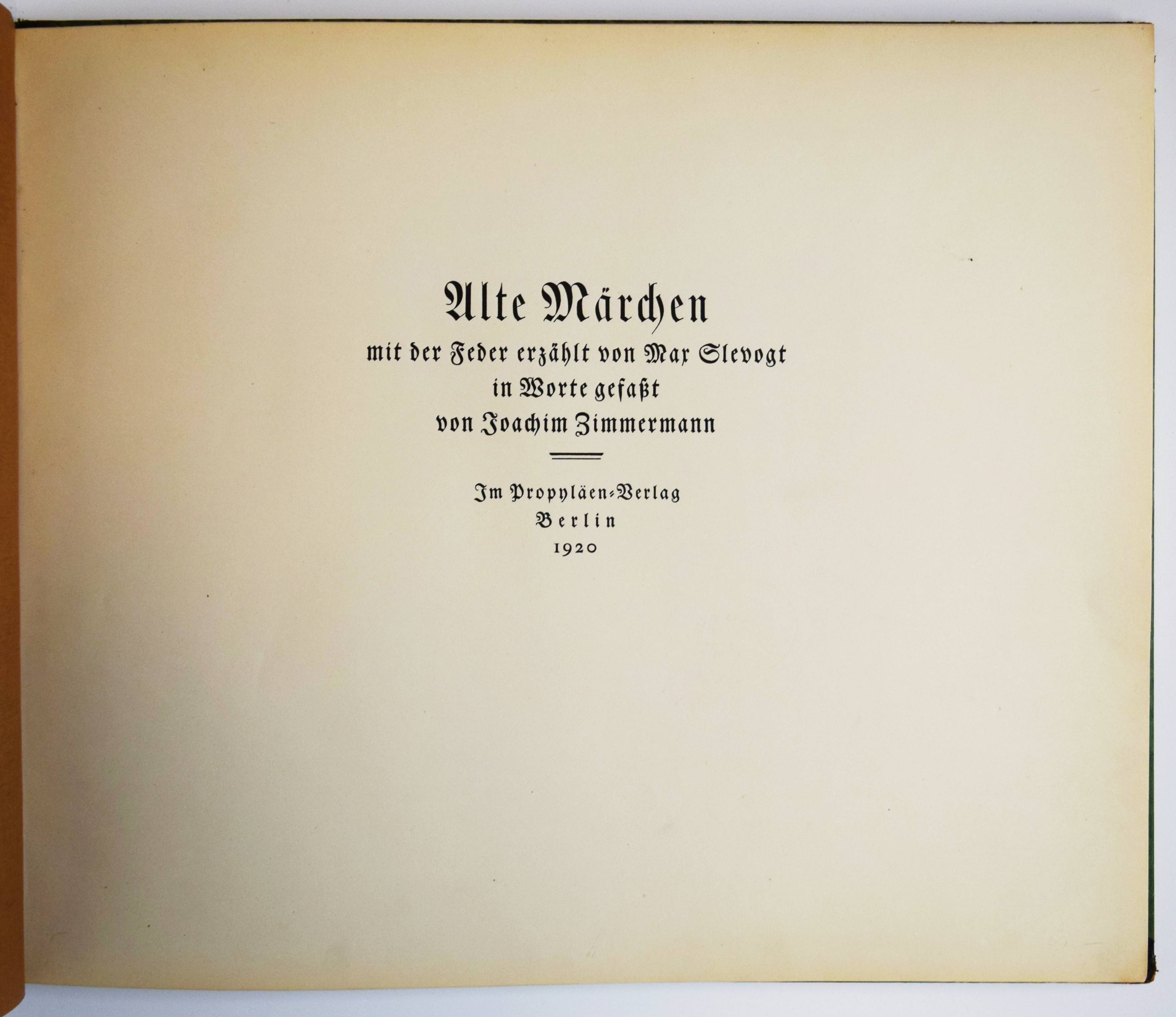 Zimmermann, Joachim. Alte Märchen. Mit der Feder erzählt von Max Slevogt, in Worte gefaßt von Joachim Zimmermann. Berlin, Propyläen-Verlag (1920). Quer-Folio (32 x 39 cm.). [42] Bl. mit illustr. Titel und 19 Tafeln. Orig.-Halblederband mit goldgepr. Deckeltitel. Mit den Märchen: Das tapfere Schneiderlein, Das kalte Herz, Aladdin, Der gestiefelte Kater, Kalif Storch, Zwerg Nase u. a. – Gelenke berieben, Vorderdeckel im oberen Rand fleckig, sonst gut erhalten.