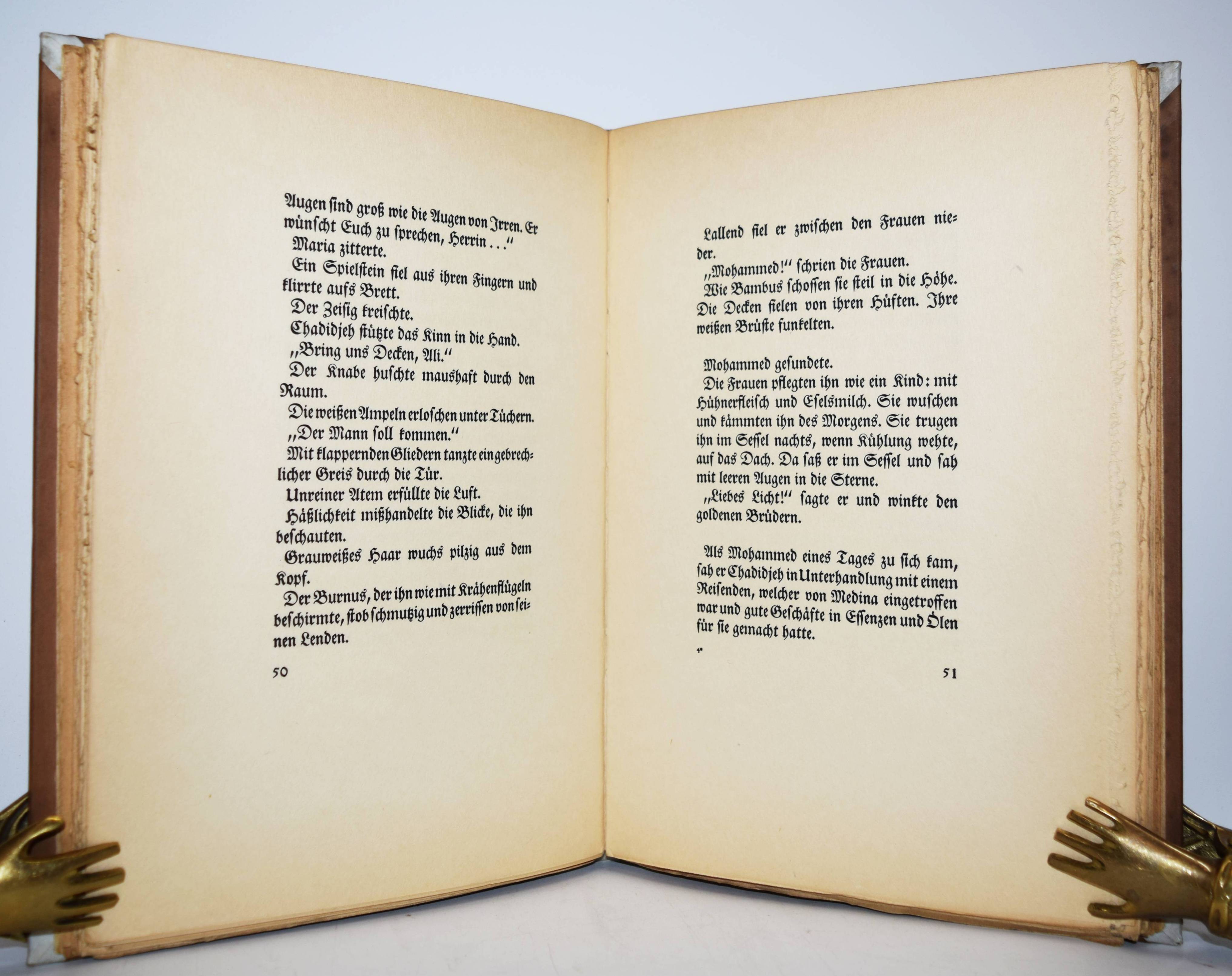 Klabund (d. i. Alfred Georg Hermann „Fredi“ Henschke). Mohammed. Der Roman eines Propheten. Berlin, Erich Reiß 1917. 115 S., [1] Bl. mit 1 Orig.-Lithographie von Max Slevogt und 1 Orig.-Radierung von Hans Meid. Orig.-Halbpergamentband mit goldgepr. Rückentitel. (Prospero-Druck, Band 2). Badorrek-Hoguth 3.12 und Jentsch 261 (Meid). Raabe/Hannich-Bode 158, 11. Rümann 53 und Söhn 36 (Slevogt). W.-G.² 19. – Erste Ausgabe. – Eines von 530 num. Exemplaren (Gesamtauflage 600 Exemplare). – Deckel etwas angestaubt, gutes Exemplar.