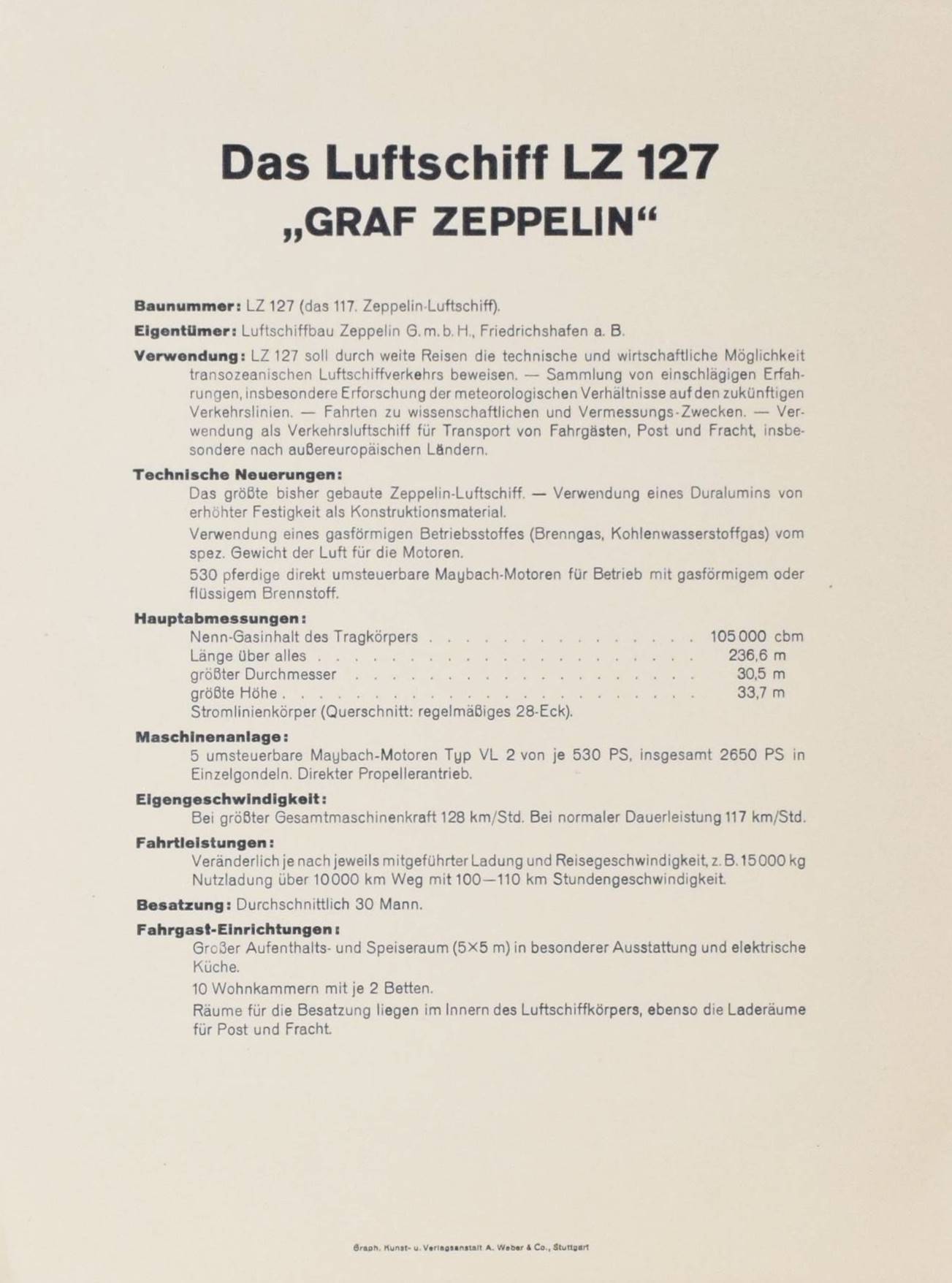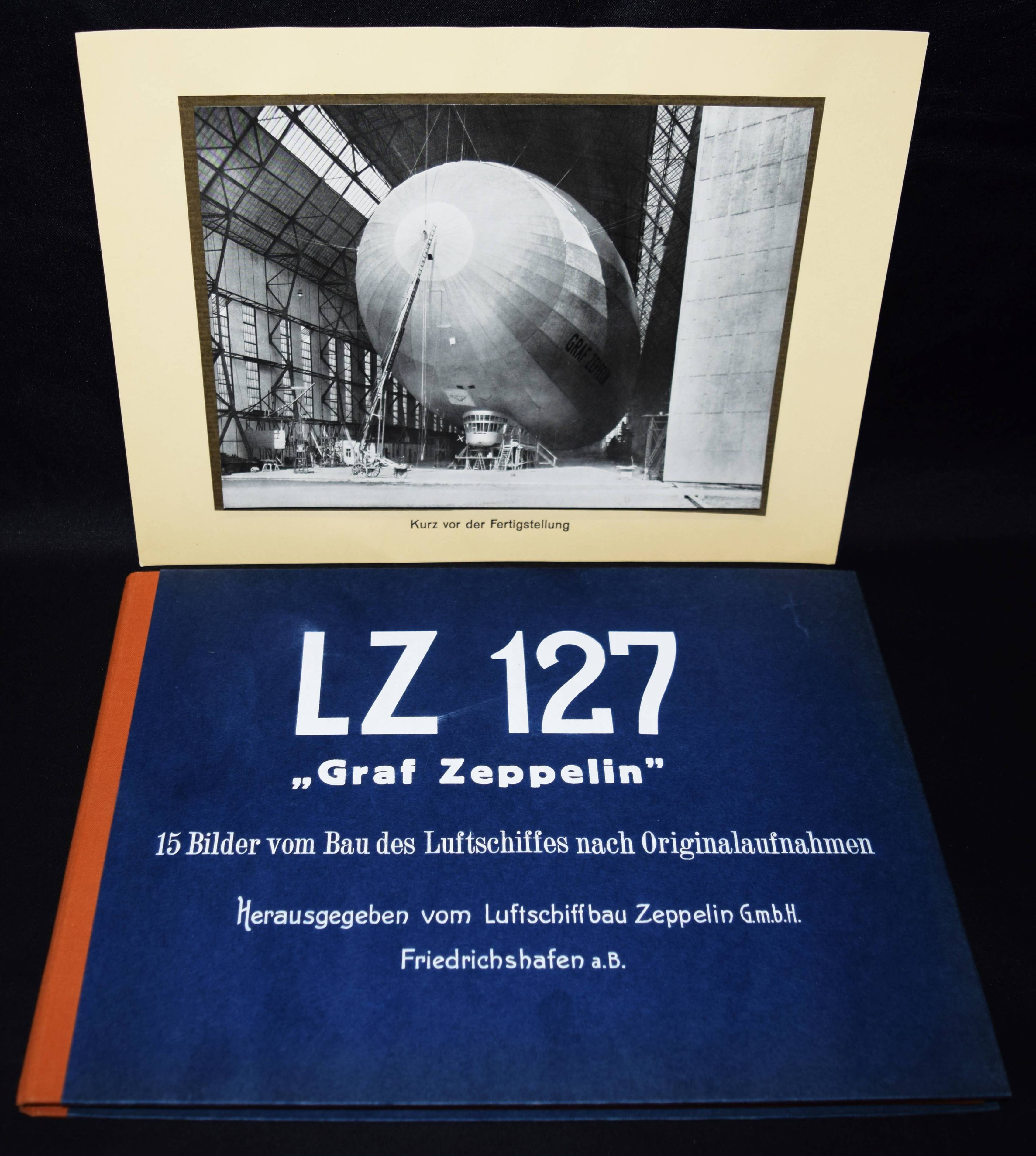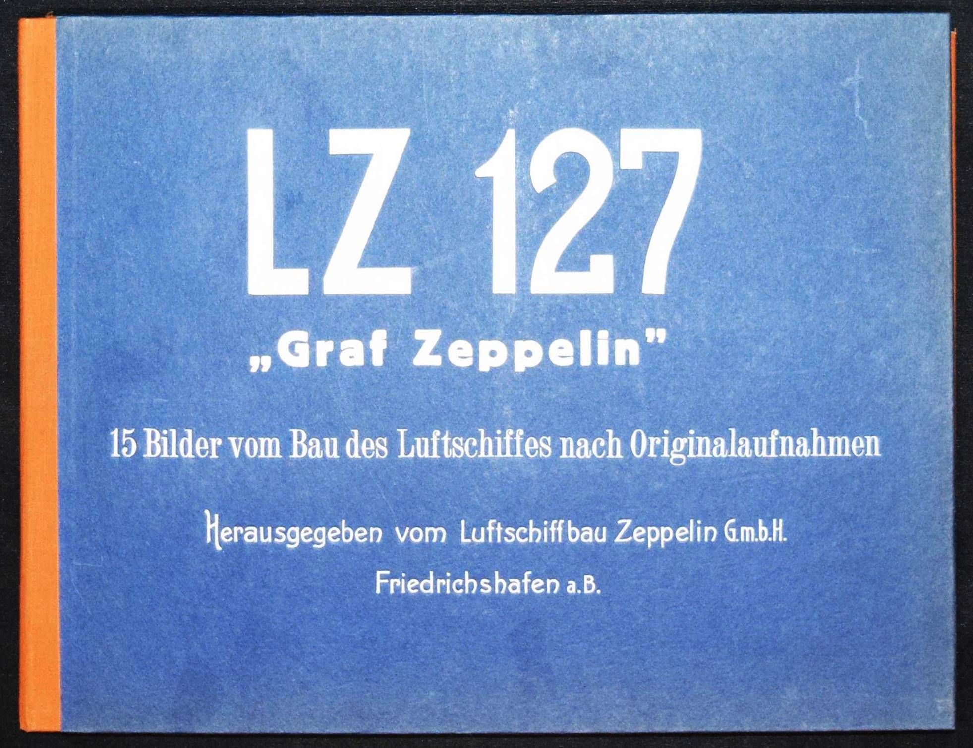 Zeppelin – Das Luftschiff LZ 127 „Graf Zeppelin“. 15 Bilder vom Bau des Luftschiffes nach Originalaufnahmen. Friedrichshafen, Luftschiffbau Zeppelin G.m.b.H. o. J. (1928). Quer-4° (25 x 33 cm.). Portfolio, [1] Bl. (techn. Daten) und 15 mont. Tafeln. Orig.-Halbleinen-Fügelmappe mit Deckeltitel. Nicht bei Heidtmann 12415 ff. – Einzige Ausgabe, selten. – „LZ 127 „Graf Zeppelin“ (Kennzeichen D-LZ127) war ein Starrluftschiff aus der Reihe der Zeppeline und gilt als das erfolgreichste Verkehrsluftschiff seiner Zeit. Es wurde am 18. September 1928 nach 21-monatiger Bauzeit in Dienst gestellt. Ursprünglich als Versuchsschiff gebaut, erwies sich LZ 127 als so zuverlässig, dass es bald durch zahlreiche spektakuläre Fahrten, wie die 20-tägige „Weltfahrt“ und die „Polarfahrt“, berühmt wurde und über mehrere Jahre einen regelmäßigen Transatlantikverkehr aufrechterhielt. Unmittelbar nach der Hindenburg-Katastrophe wurde der Zeppelin im Mai 1937 außer Dienst gestellt und 1940 verschrottet“ (Wikipedia).– Sehr schönes sauberes Exemplar.