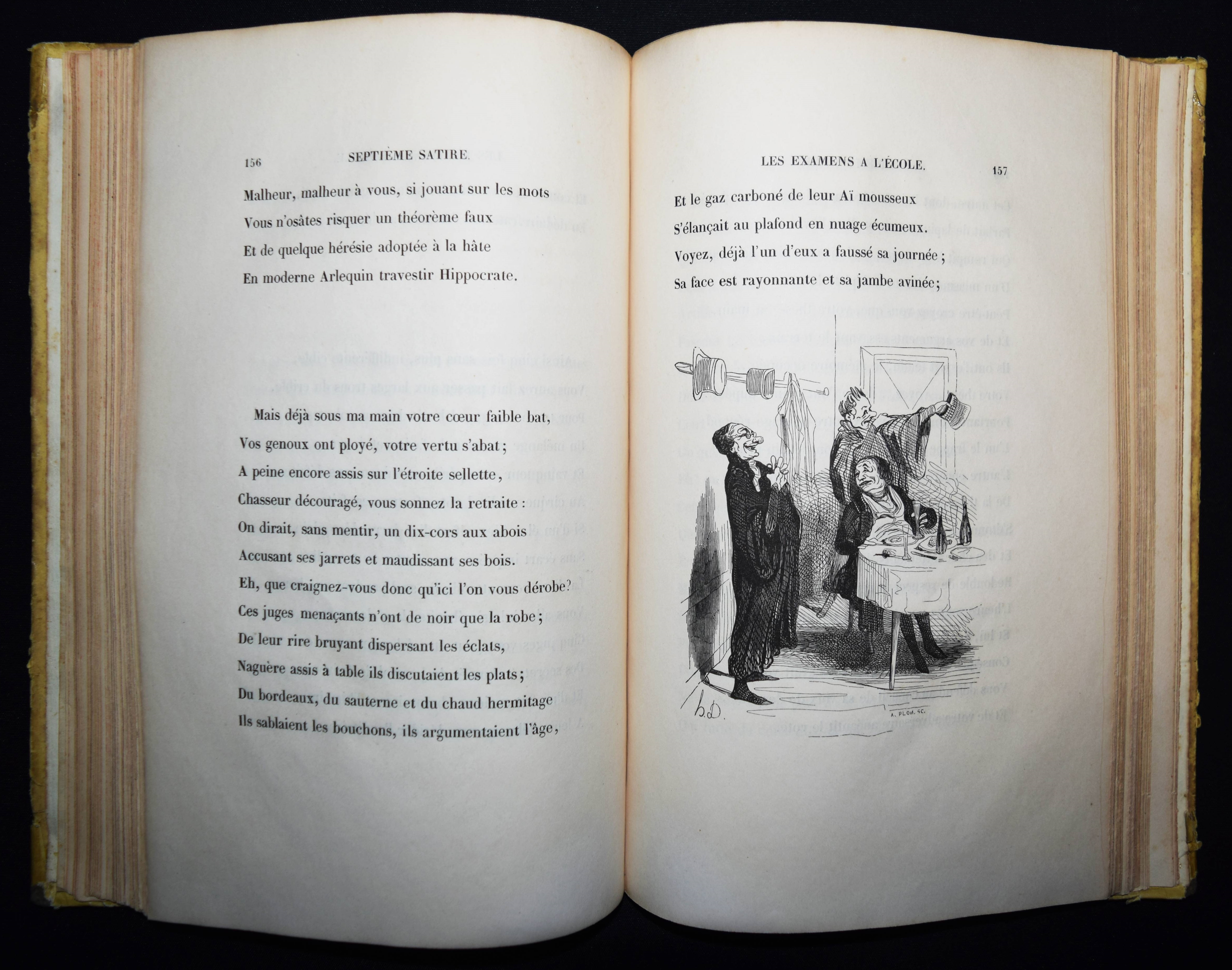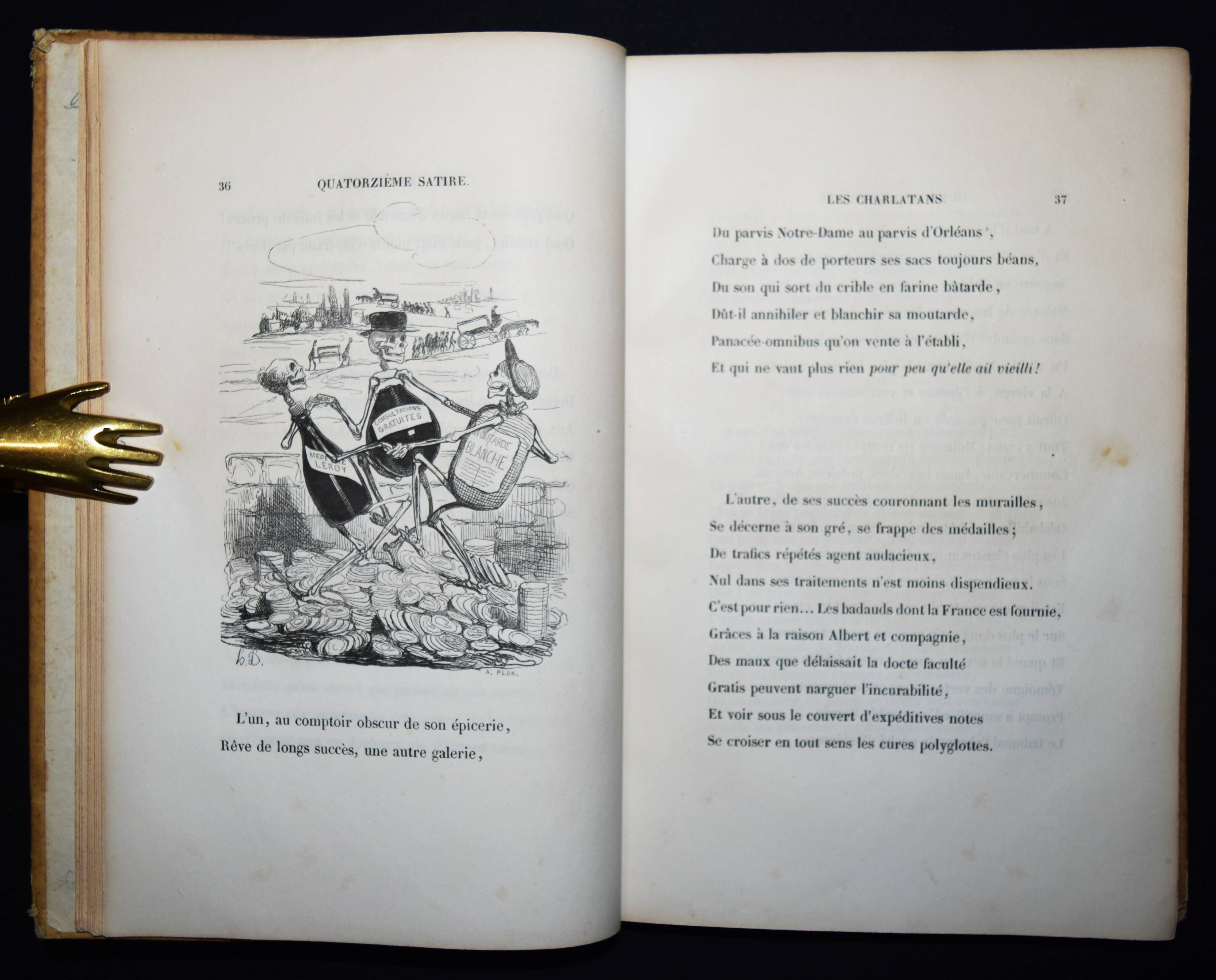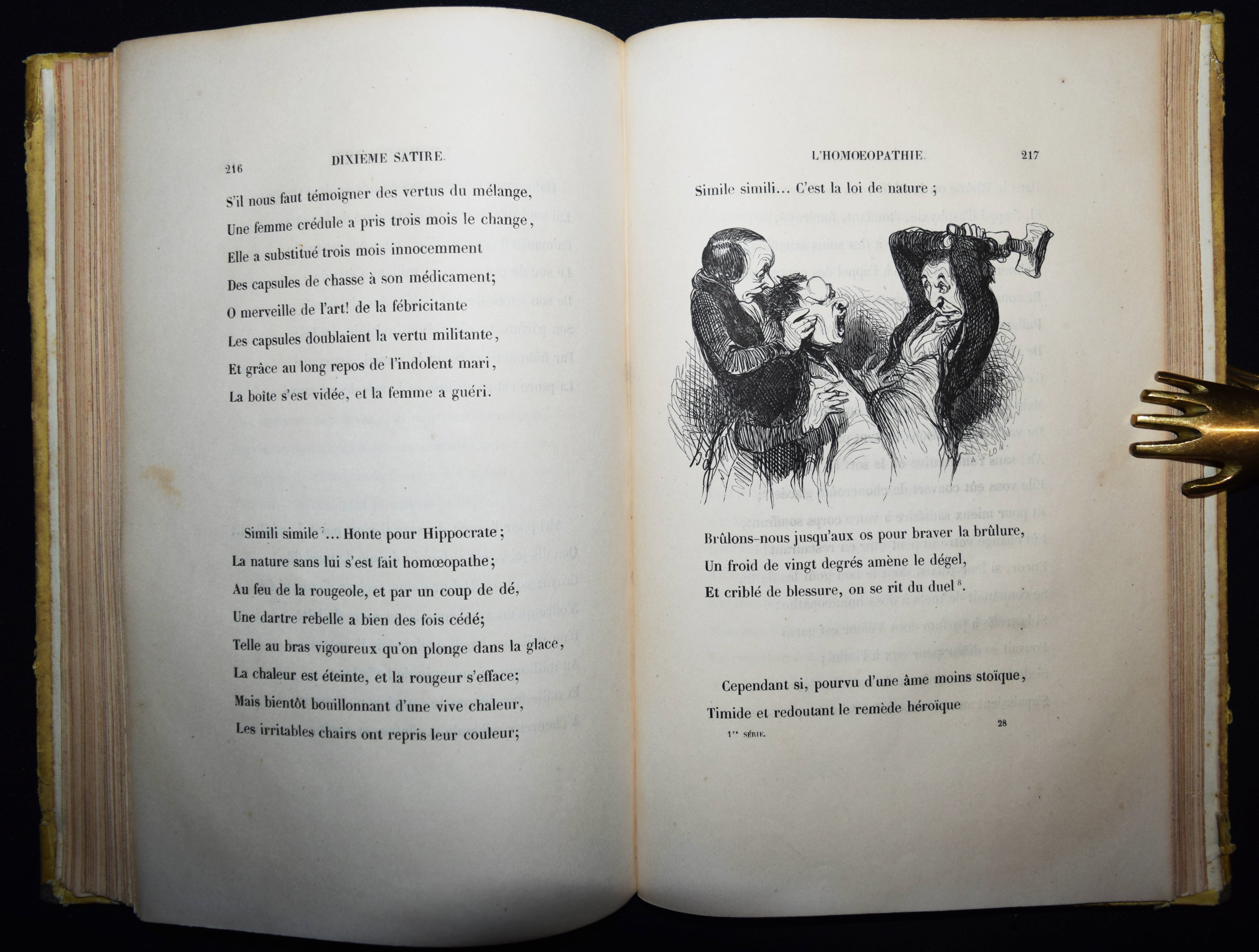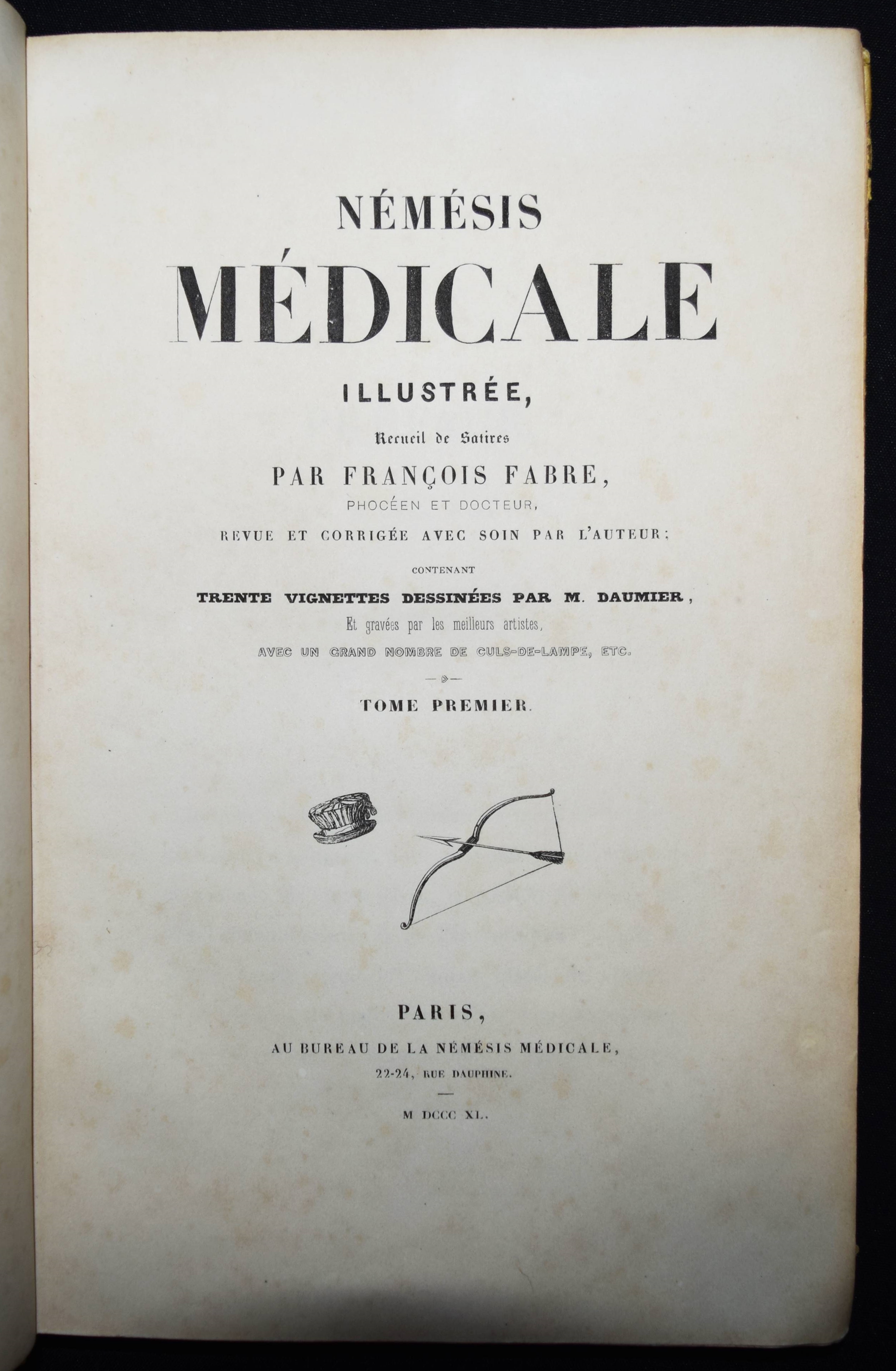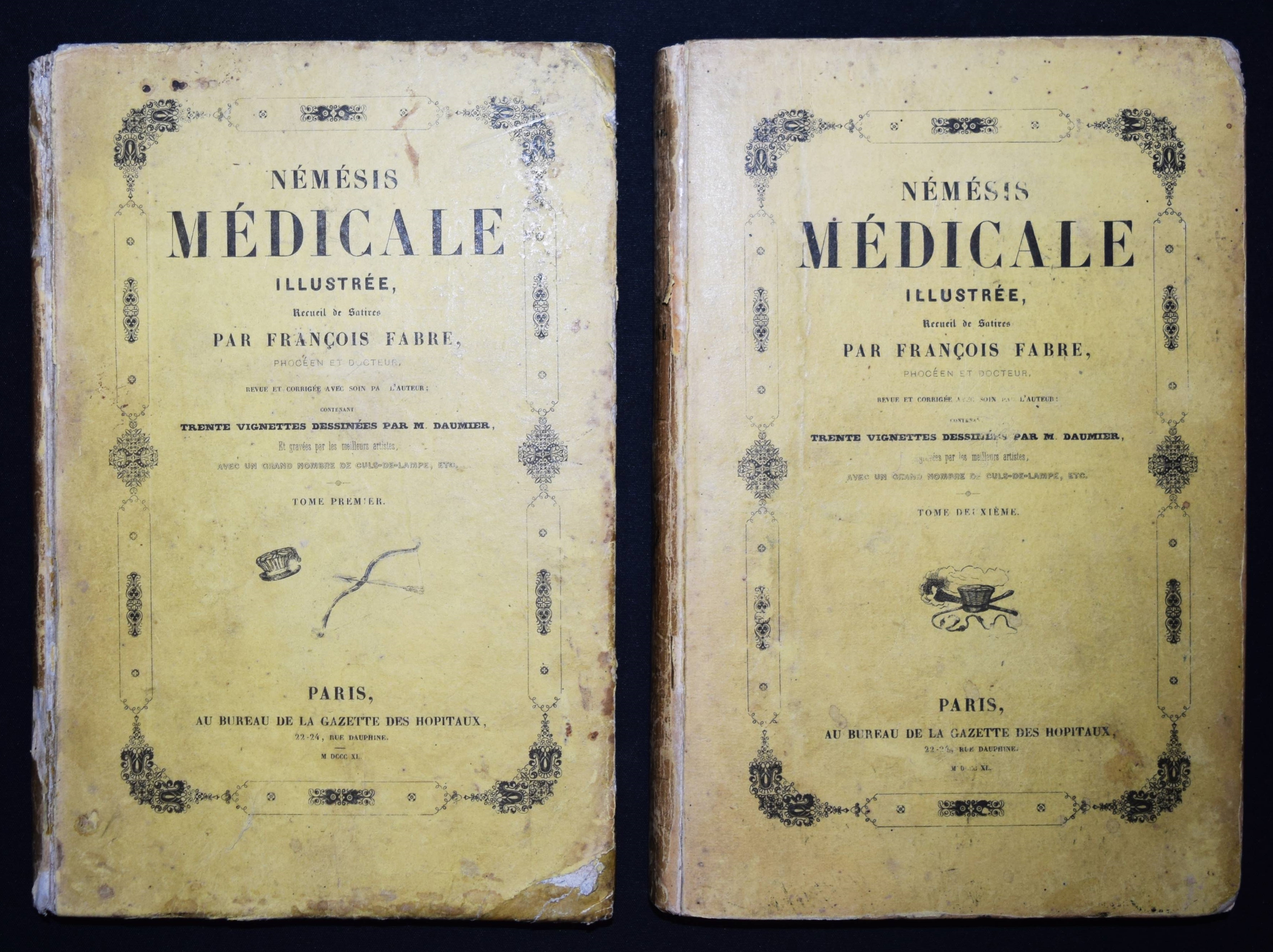 Fabre, Francois. Némésis médicale illustrée. Recueil de satires. Revue et corrigée avec soin par l’auteur. Contenant trente vignettes dessinées par (Honore) Daumier, et gravées par les meilleurs artistes. Avec un grande nombre de culs-de-lampe, etc. 2 volumes. Paris, Au Bureau de la Némésis médicale 1840. Gr.-8° (24 x 16 cm.). XXXII, 278 p.; 360 p. avec 30 gravures sur bois et de nombreuses vignettes d’après H. Daumier. Reliure typographique en carton original. Garrison & Morton 6604.94. Heirs of Hippocrates 1575. Norman 747. Wellcome III, 2. – Première édition illustrée de ce classique de la littérature médicale en 24 satires et en vers. Docteur en médecine et poète, François Fabre (1797-1854) fut fondateur et directeur de la „Gazette des hôpitaux civils et militaires“ (1828-1854). – „The illustrations for Fabre’s text are considered Daumier’s most powerful contribution in the medium of wood-engraving“ (Norman). – „Some of Daumier’s best designs. There are only 30 of substance, but these suffice to make Nemesis medicale one of the ranking illustrated books of the period“ (Ray, The Art of the French Illustrated Book 217). – Reliures poussiéreuses, frottées et abîmées, quelques rousseurs éparses, très bon exemplaire dans les rares reliures de l’éditeur.