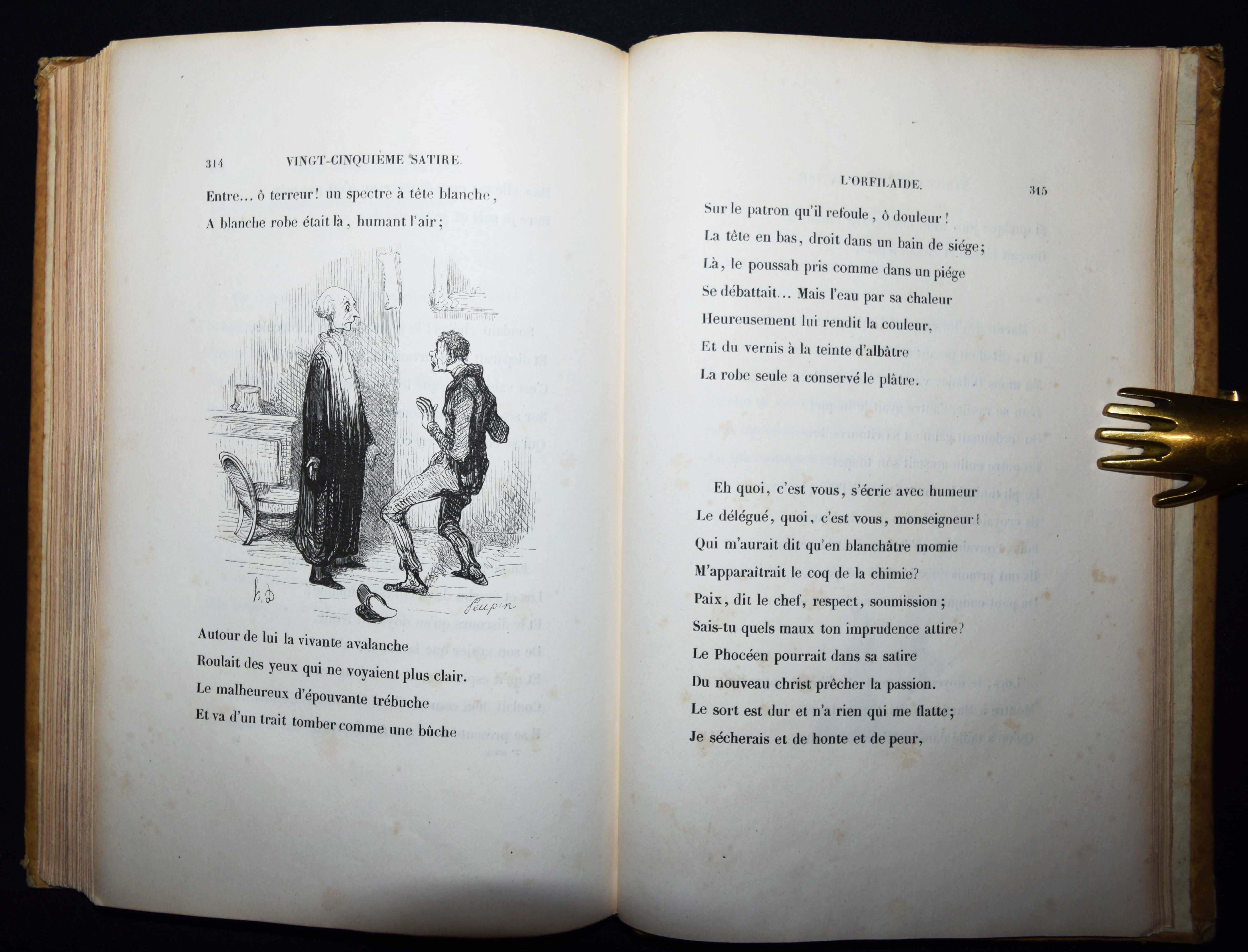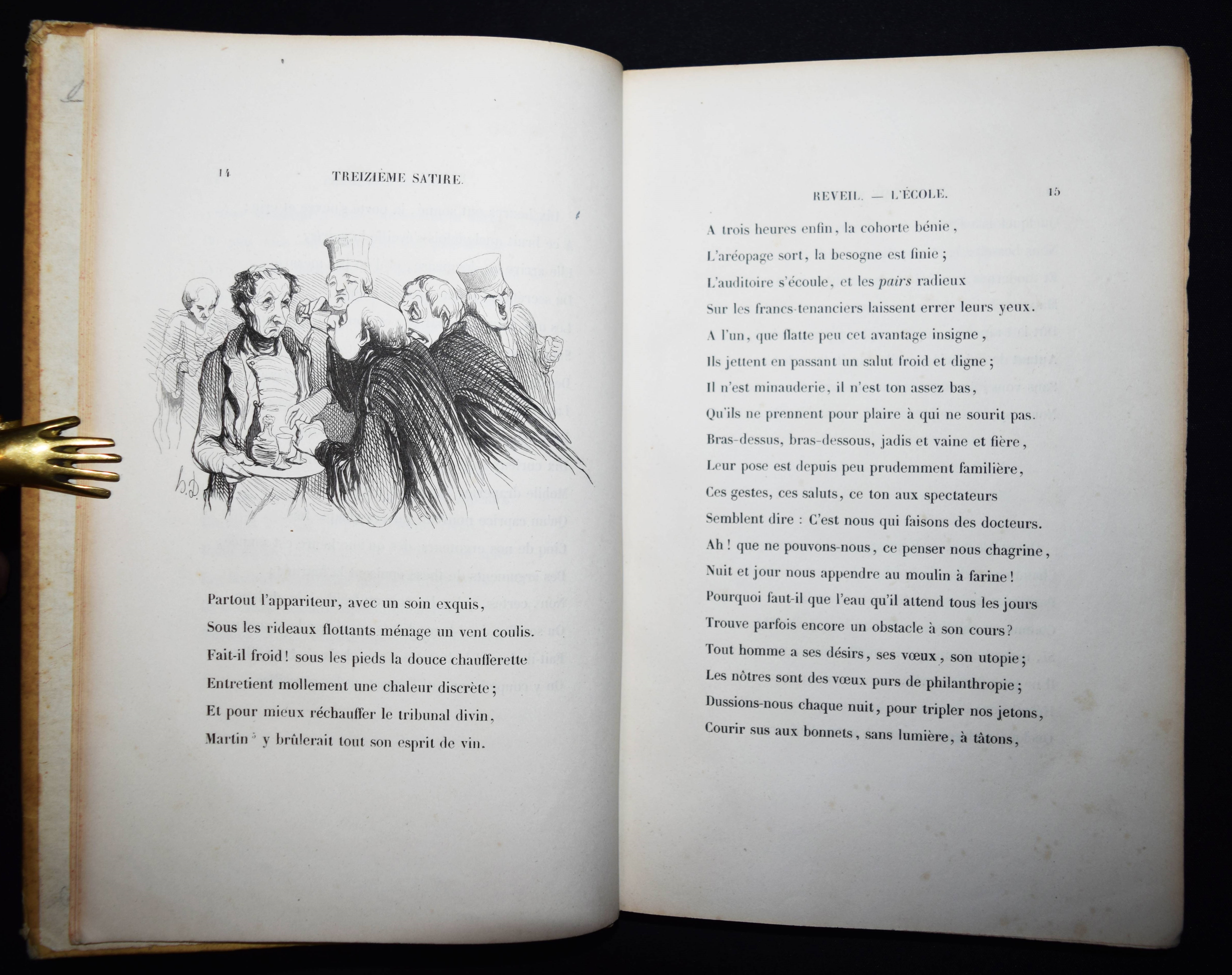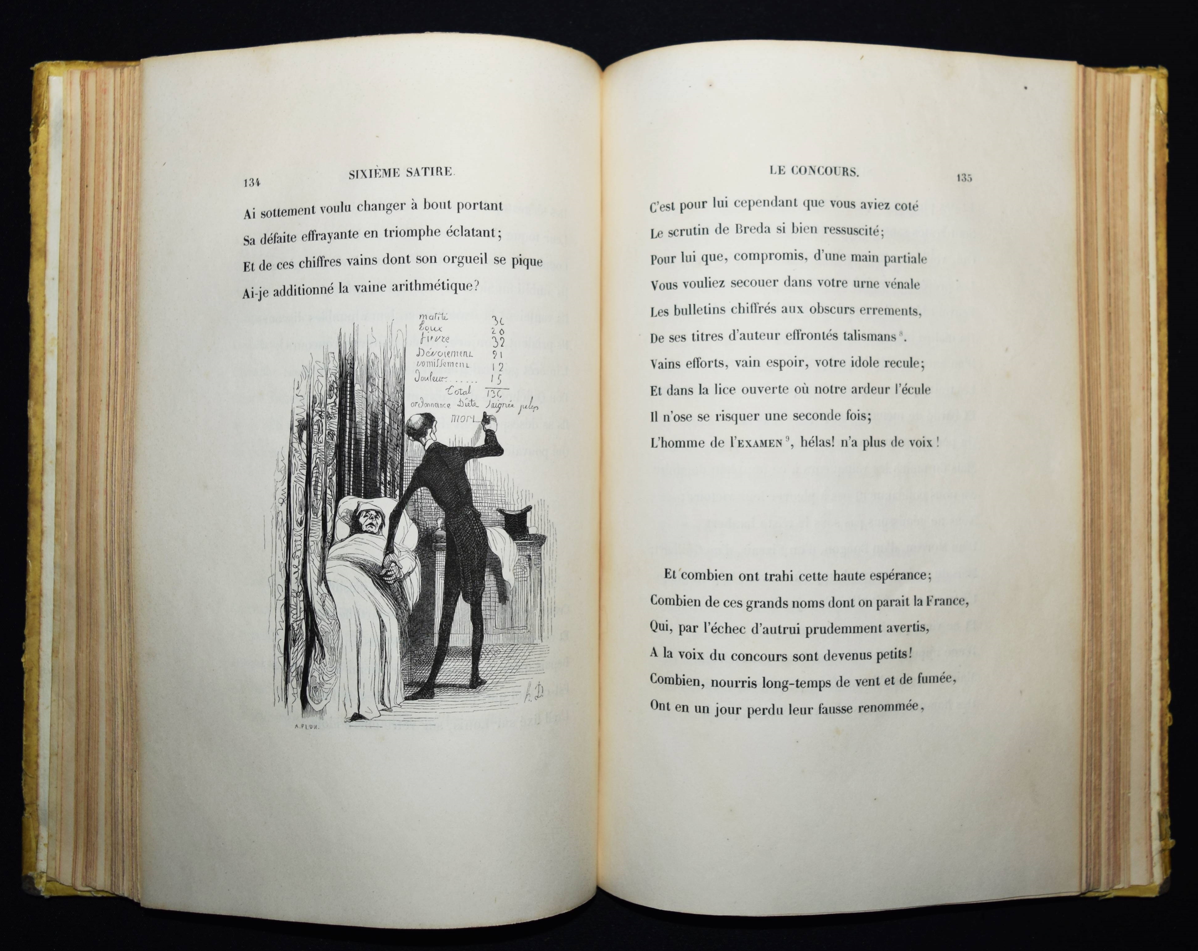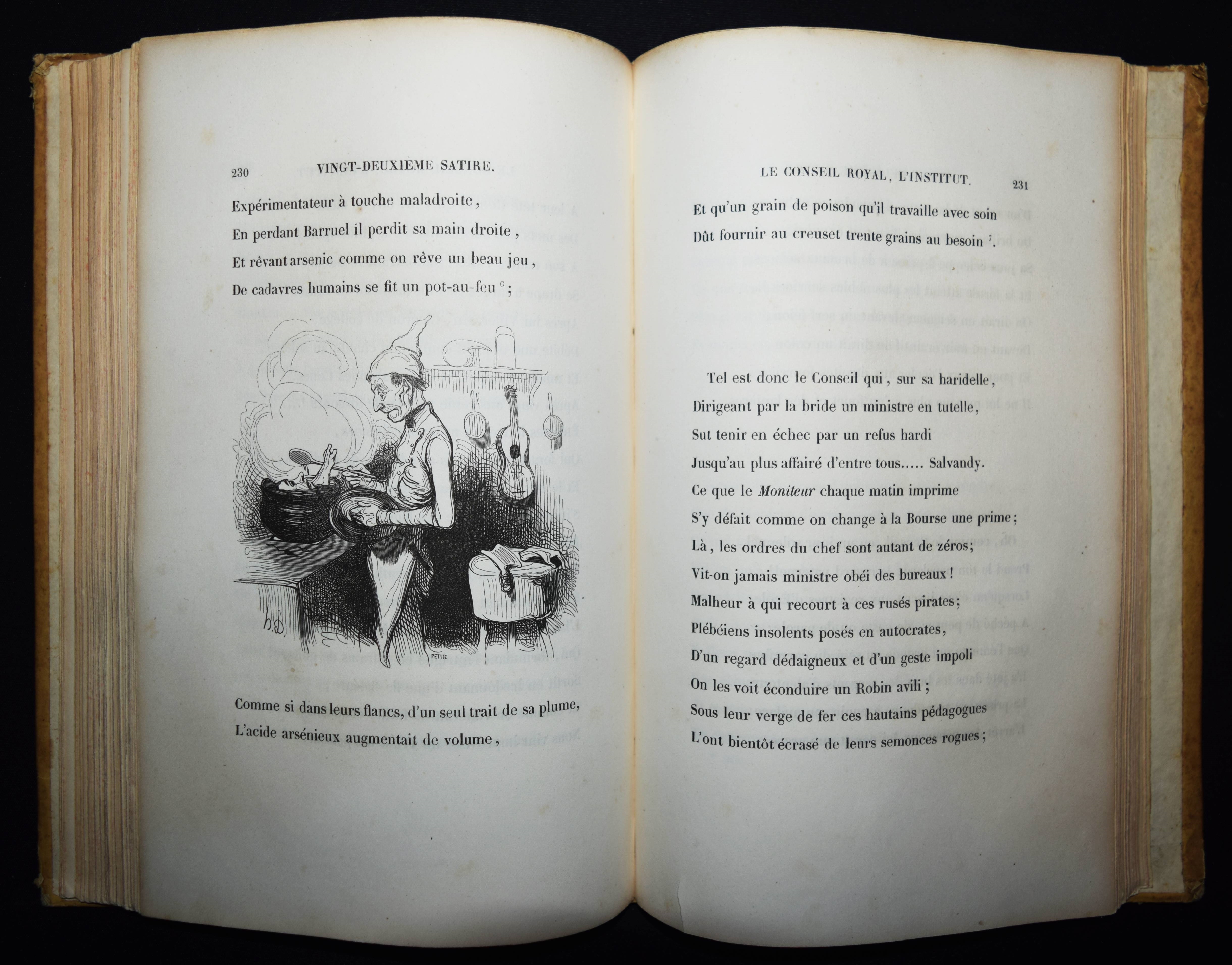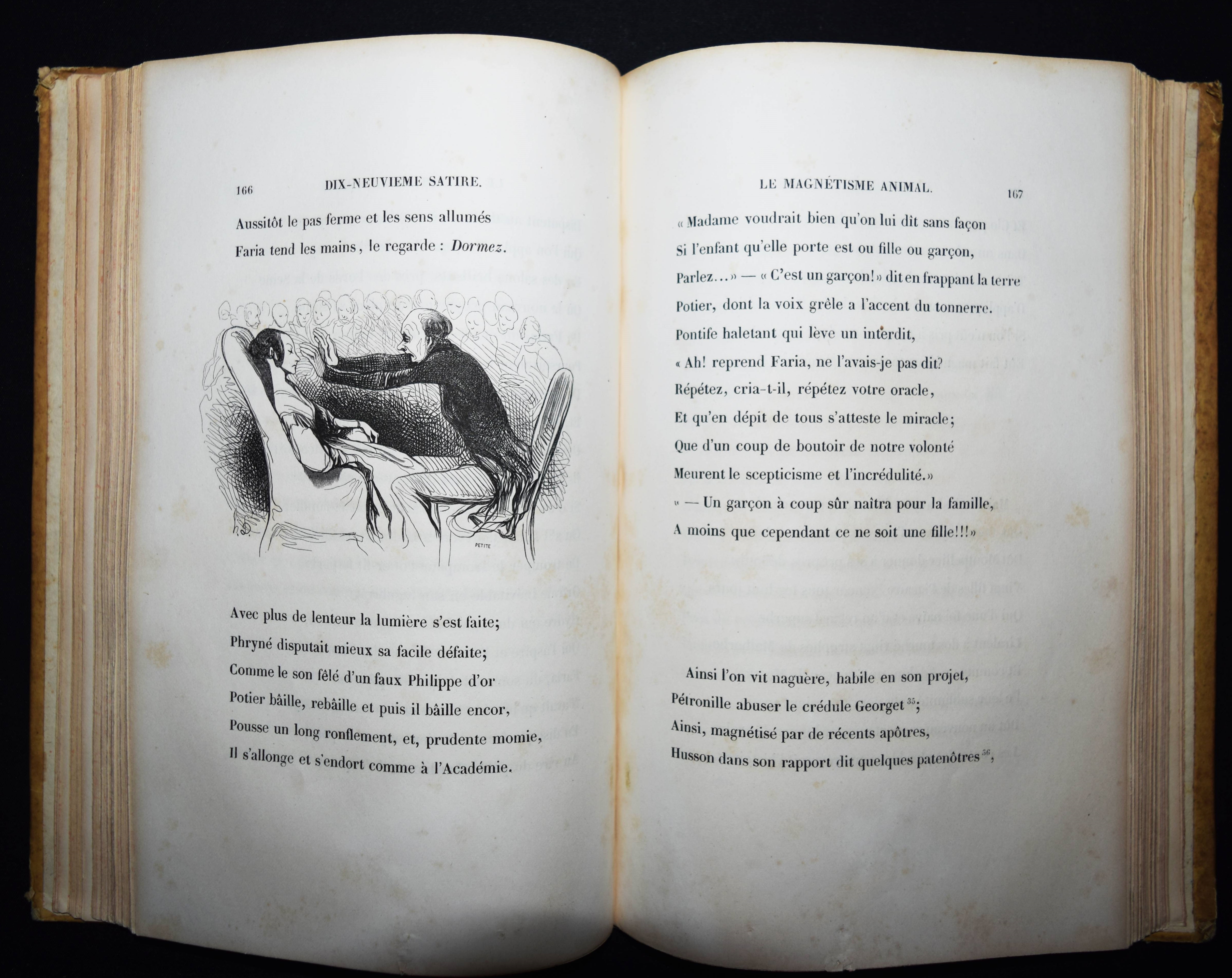 Fabre, Francois. Némésis médicale illustrée. Recueil de satires. Revue et corrigée avec soin par l’auteur. Contenant trente vignettes dessinées par (Honore) Daumier, et gravées par les meilleurs artistes. Avec un grande nombre de culs-de-lampe, etc. 2 volumes. Paris, Au Bureau de la Némésis médicale 1840. Gr.-8° (24 x 16 cm.). XXXII, 278 p.; 360 p. avec 30 gravures sur bois et de nombreuses vignettes d’après H. Daumier. Reliure typographique en carton original. Garrison & Morton 6604.94. Heirs of Hippocrates 1575. Norman 747. Wellcome III, 2. – Première édition illustrée de ce classique de la littérature médicale en 24 satires et en vers. Docteur en médecine et poète, François Fabre (1797-1854) fut fondateur et directeur de la „Gazette des hôpitaux civils et militaires“ (1828-1854). – „The illustrations for Fabre’s text are considered Daumier’s most powerful contribution in the medium of wood-engraving“ (Norman). – „Some of Daumier’s best designs. There are only 30 of substance, but these suffice to make Nemesis medicale one of the ranking illustrated books of the period“ (Ray, The Art of the French Illustrated Book 217). – Reliures poussiéreuses, frottées et abîmées, quelques rousseurs éparses, très bon exemplaire dans les rares reliures de l’éditeur.