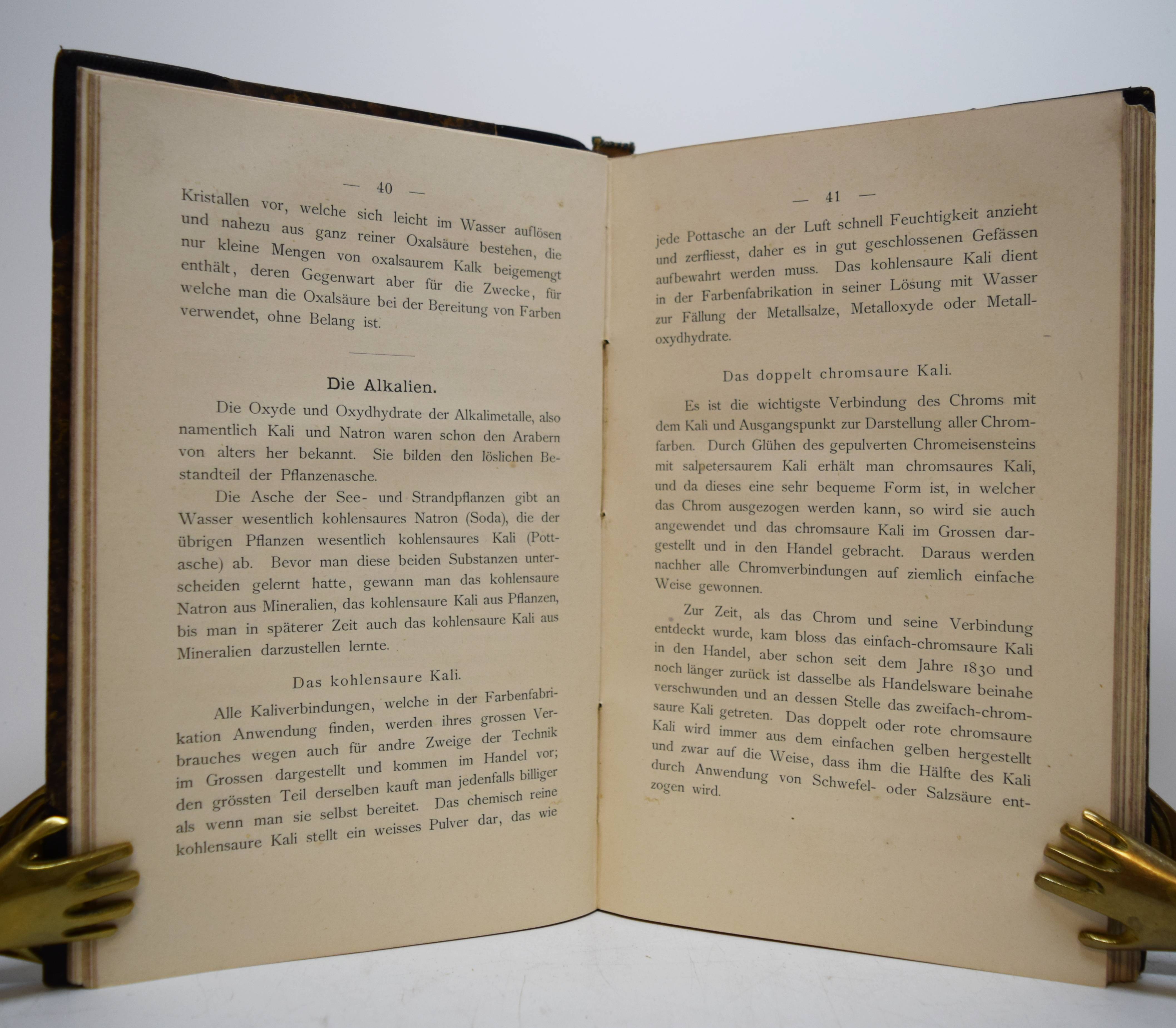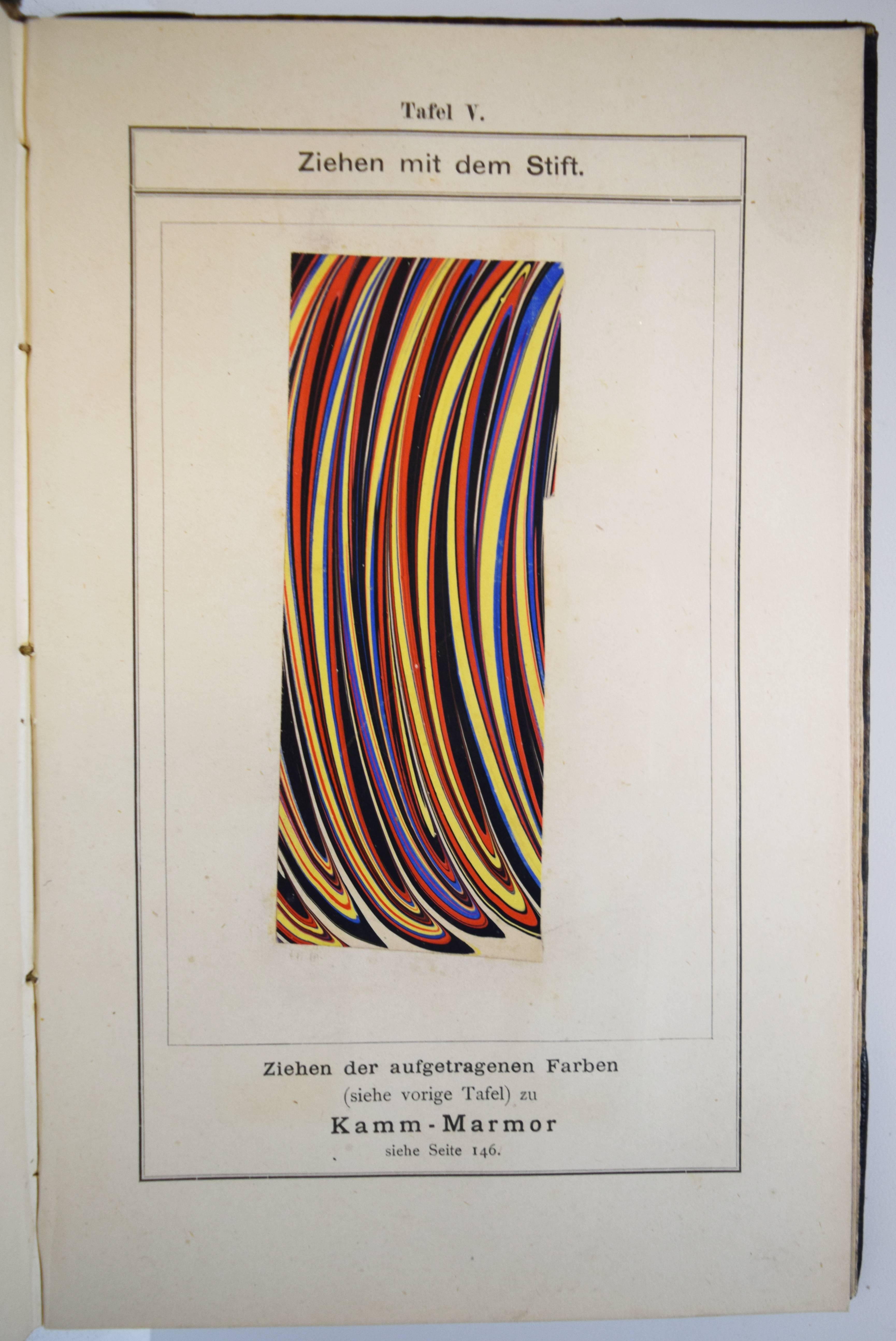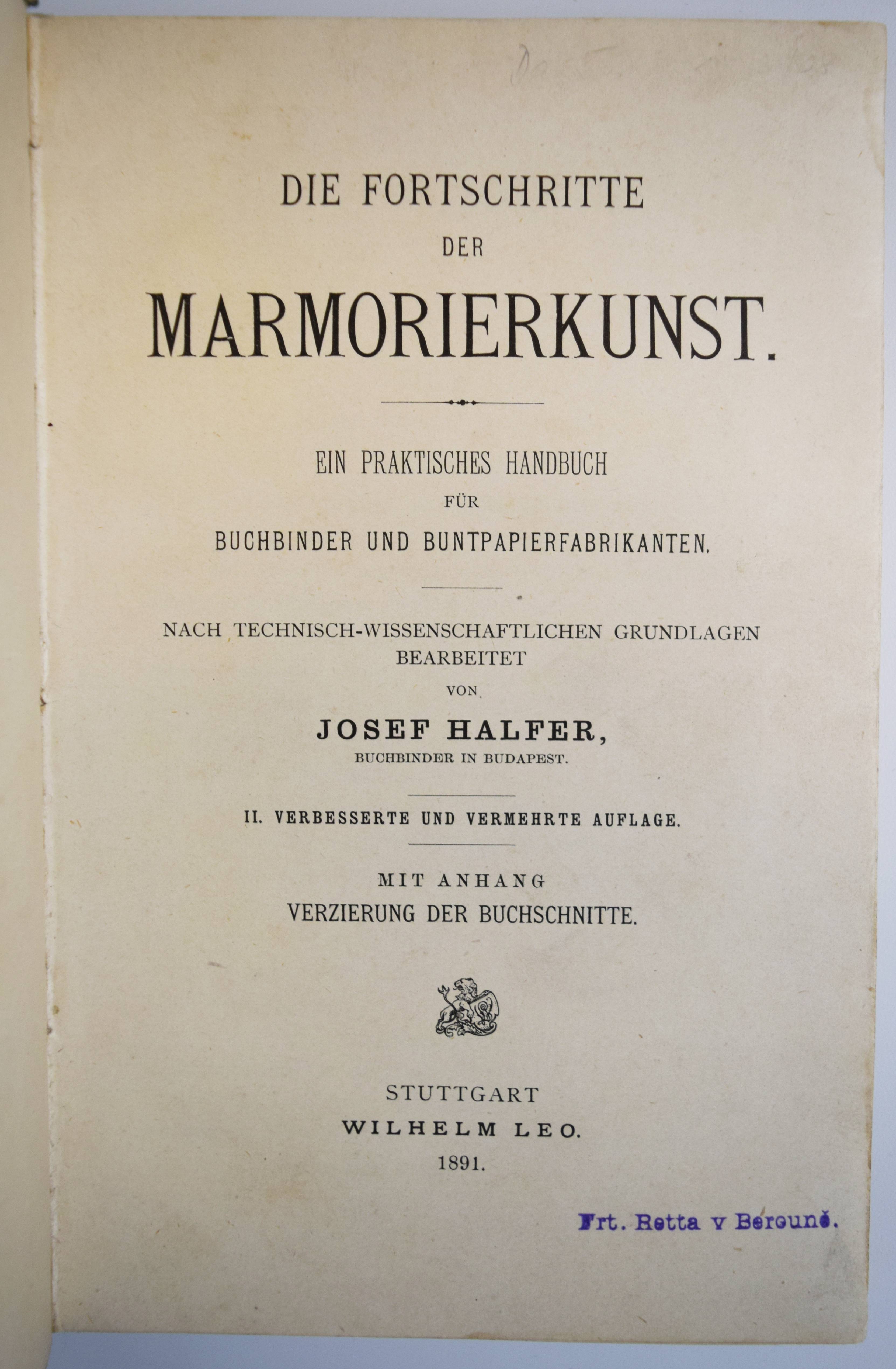 Halfer, Josef (József). Die Fortschritte der Marmorierkunst. Ein praktisches Handbuch für Buchbinder und Buntpapierfabrikanten. Nach technisch-wissenschaftlichen Grundlagen bearbeitet. 2., verbesserte und vermehrte Auflage. Mit Anhang: Verzierung der Buchschnitte. Stuttgart, Wilhelm Leo 1891. 8°. 224 S. und 8 S. (Anzeigen) mit 3 Holzschnitten im Text und 10 Tafeln mit 35 montierten farbigen Marmorpapieren, davon 5 größere (ca. 12 x 4,5 cm.). Halblederband der Zeit mit goldgepr. Rückentitel und Linienvergoldung. Mejer 1814. – Maßgebliche Ausgabe des wohl wichtigsten Handbuchs zur Herstellung von Marmorpapieren. – „The Halfer system is so important that marbling history is broken at this point, and referred to as pre-Halferian and post-Halferian marbling. The advantages of the Halfer system were two-fold: freed of the laborious preparation of colors, and with standardized colors, marblers could produce more work; and secondly, the use of carragheen size allowed finer details in marbling“ (Easton, Marbling a history, p. 79 f.). – Der ungarische Buchbinder J. Halfer (1846-1916) fasste „in diesem grundlegenden Werk seine jahrelangen Experimente und neu gewonnenen Erkenntnisse … zusammen, das maßgeblich für die Rennaissance der Marmorierkunst in Deutschland und Europa verantwortlich war. Es wurde in zahlreiche Sprachen übersetzt und bildete jahrelang, eigentlich bis in die heutige Zeit, die Grundlage zahlreicher weiterer Publikationen (Boeck, Adam, Kersten, Hauptmann, Weisse etc.). Halfer beschreibt genauestens den Herstellungsprozess klassischer Marmorpapiermuster, wie dem Kamm-, Pfauen-, Boukett-, Schnecken-, Haarader-, oder dem Steinadermarmor. Umfangreich sind seine Experimente mit verschiedensten Marmoriergründen, aus denen sein noch heute gültiger Universalgrund mit Charageenmoos entstand und hier beschrieben wird. Der besondere Wert dieser Abhandlung liegt im ersten Teil. Hier beschreibt Halfer die Rezepte zur Herstellung seiner brillanten Marmorierfarben, die er in alle Welt exportiert hat. Von den Materialien, den Gerätschaften, der genauen Zusammensetzung, dem Reibegrad der benutzten Pigmente bis hin zu den benötigten Zusatzstoffen, gibt Halfer alle Geheimnisse seiner weltberühmten Farben bekannt Die beigefügten Originalmuster sind von einer noch heute bestechenden Brillianz und Farbfrische, die moderne Farben nicht erreichen. Zum Schluss liefert Halfer auch noch Anleitungen für das Anfertigen der unterschiedlichsten Marmorschnitte, sowie die Anfertigung von Goldschnitten bis hin zu ziselierten Goldschnitten. Das wichtigste Buch zum Thema“ (Buchatelier Bischoff, Lehrte-Arpke zu einer Faksimile-Ausgabe). – Kleiner Namenstempel auf dem Titelblatt, sehr schönes sauberes Exemplar.
